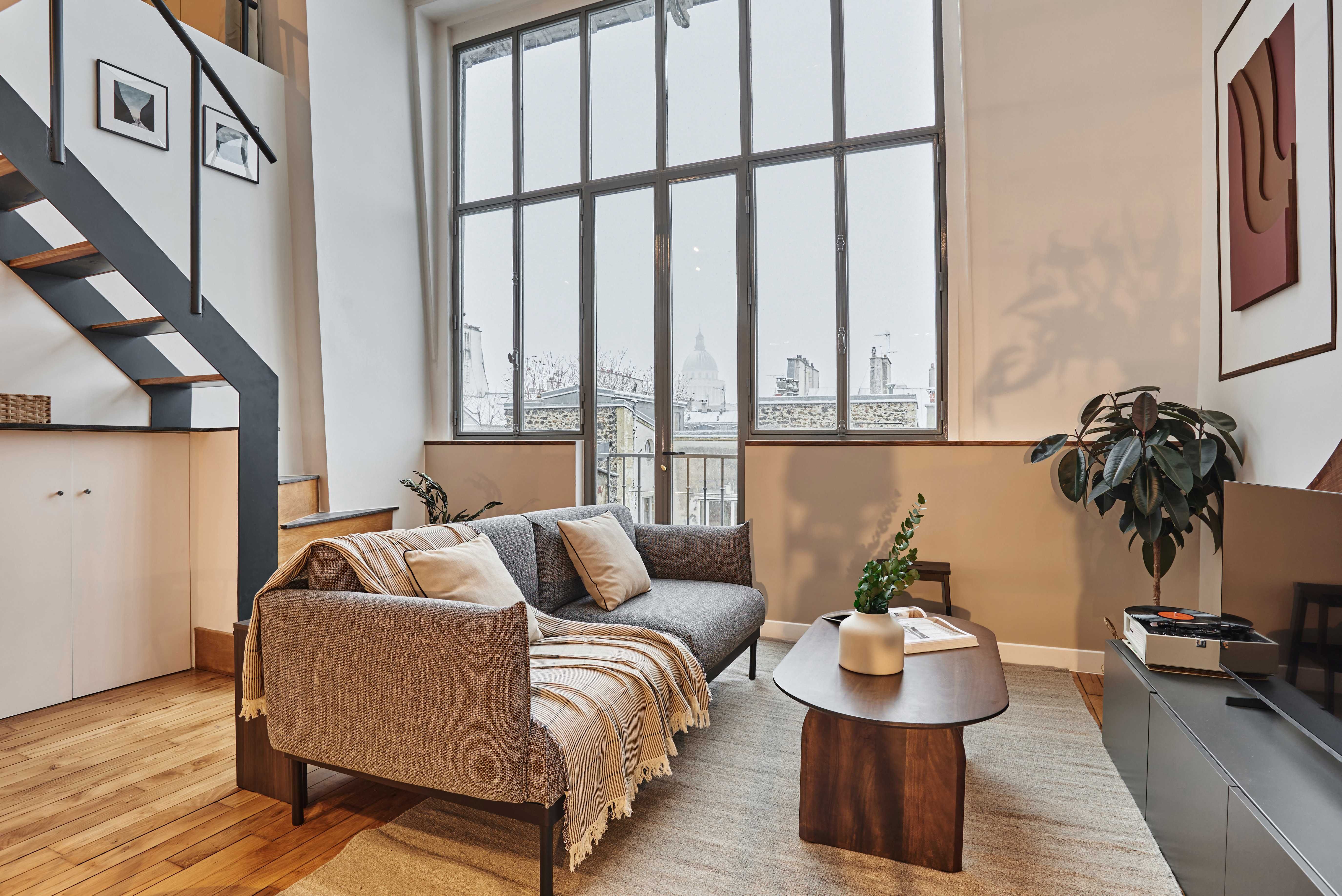 Hidden away in the 5th arrondissement, this apartment comes with a view of the Panthéon – now that's how you make a statement. Floor-to-ceiling windows frame the Parisian rooftops, while the living space has plenty of room to kick back and relax. In town for business? There are two desks on the mezzanine that are ideal for remote working. Location-wise, you'll be based in the Val de Grâce neighbourhood, just ten minutes from the Jardin des Plantes and within easy reach of the Latin Quarter's buzzing bistros, bars, and boutiques.