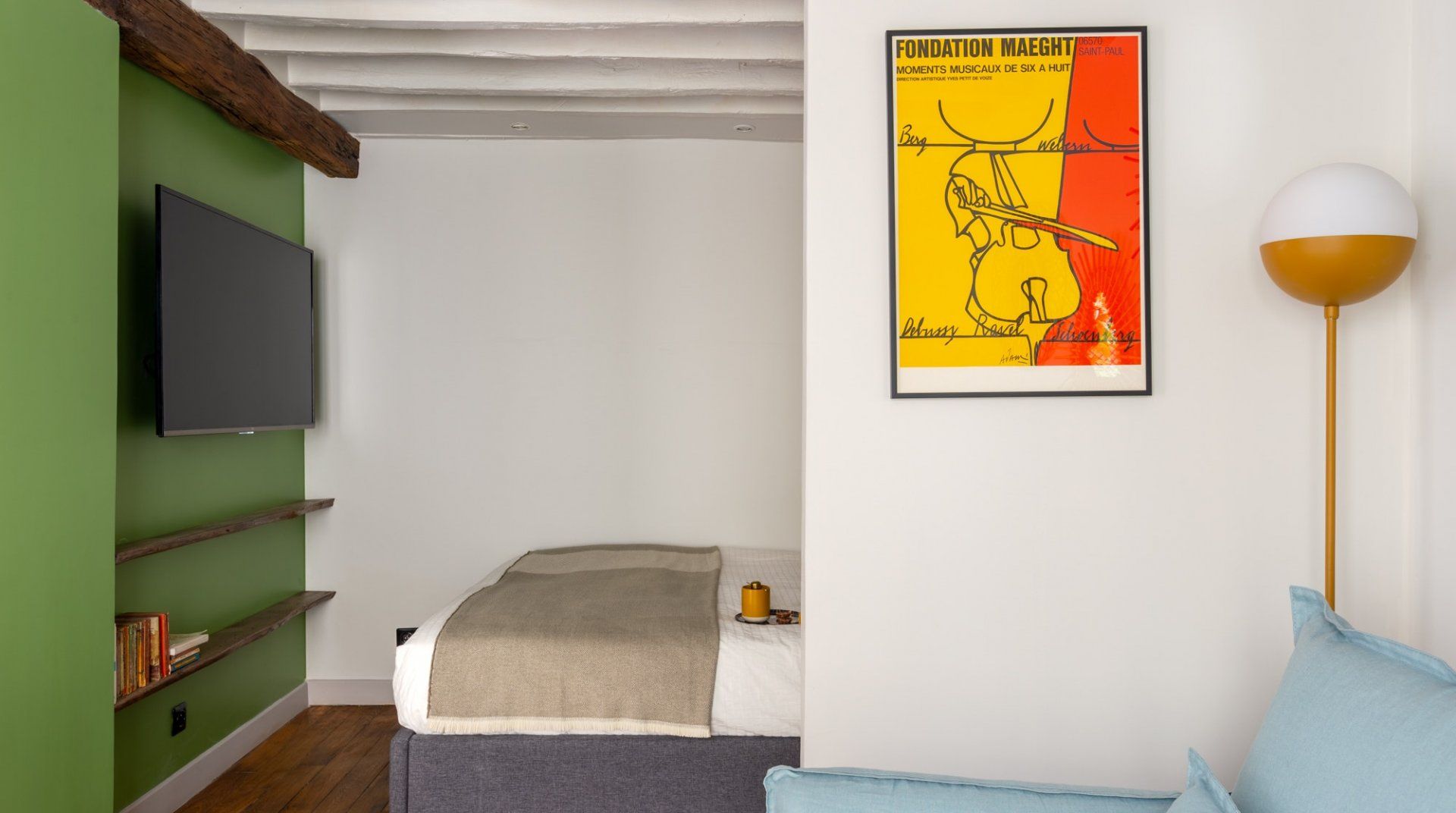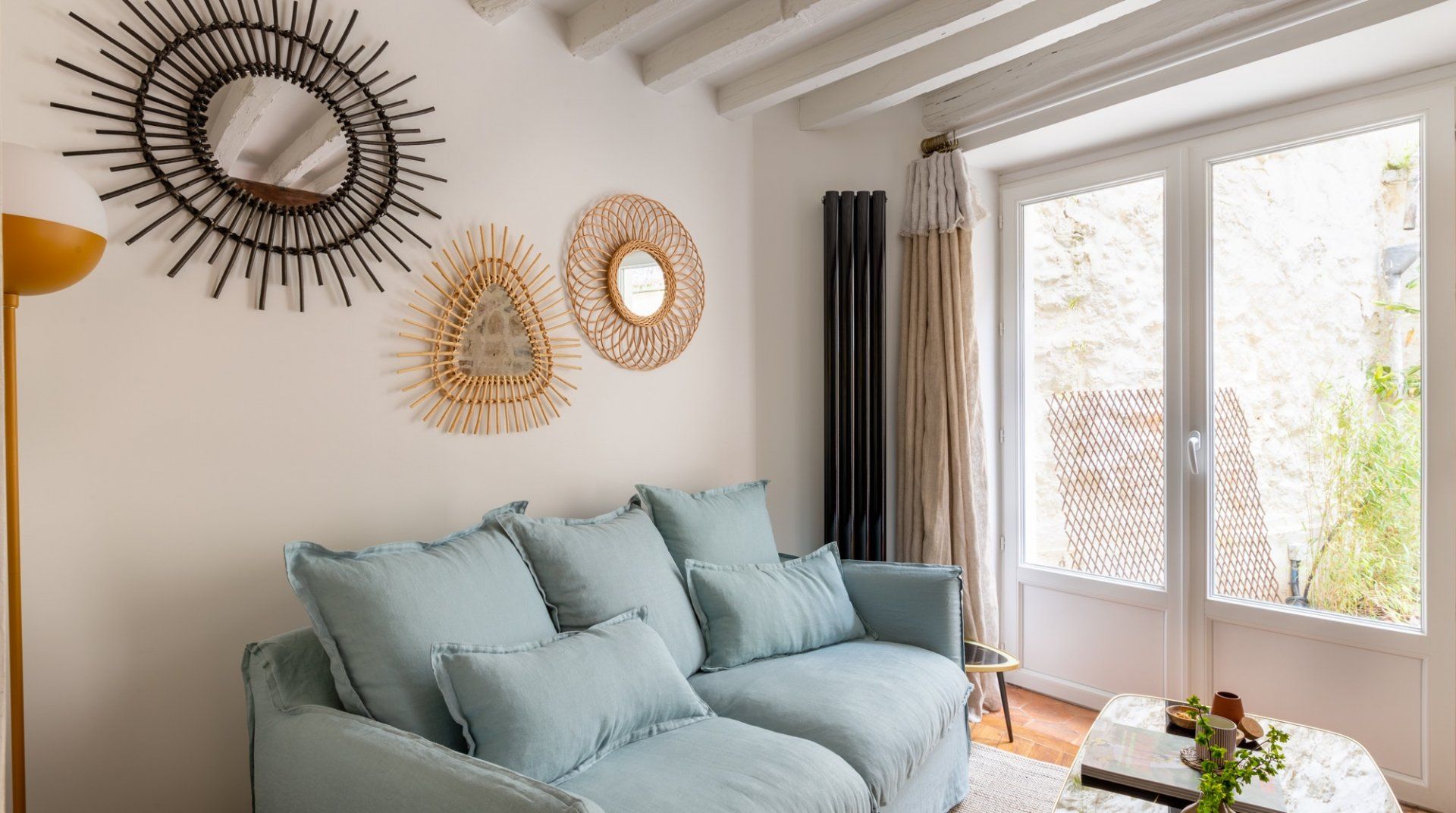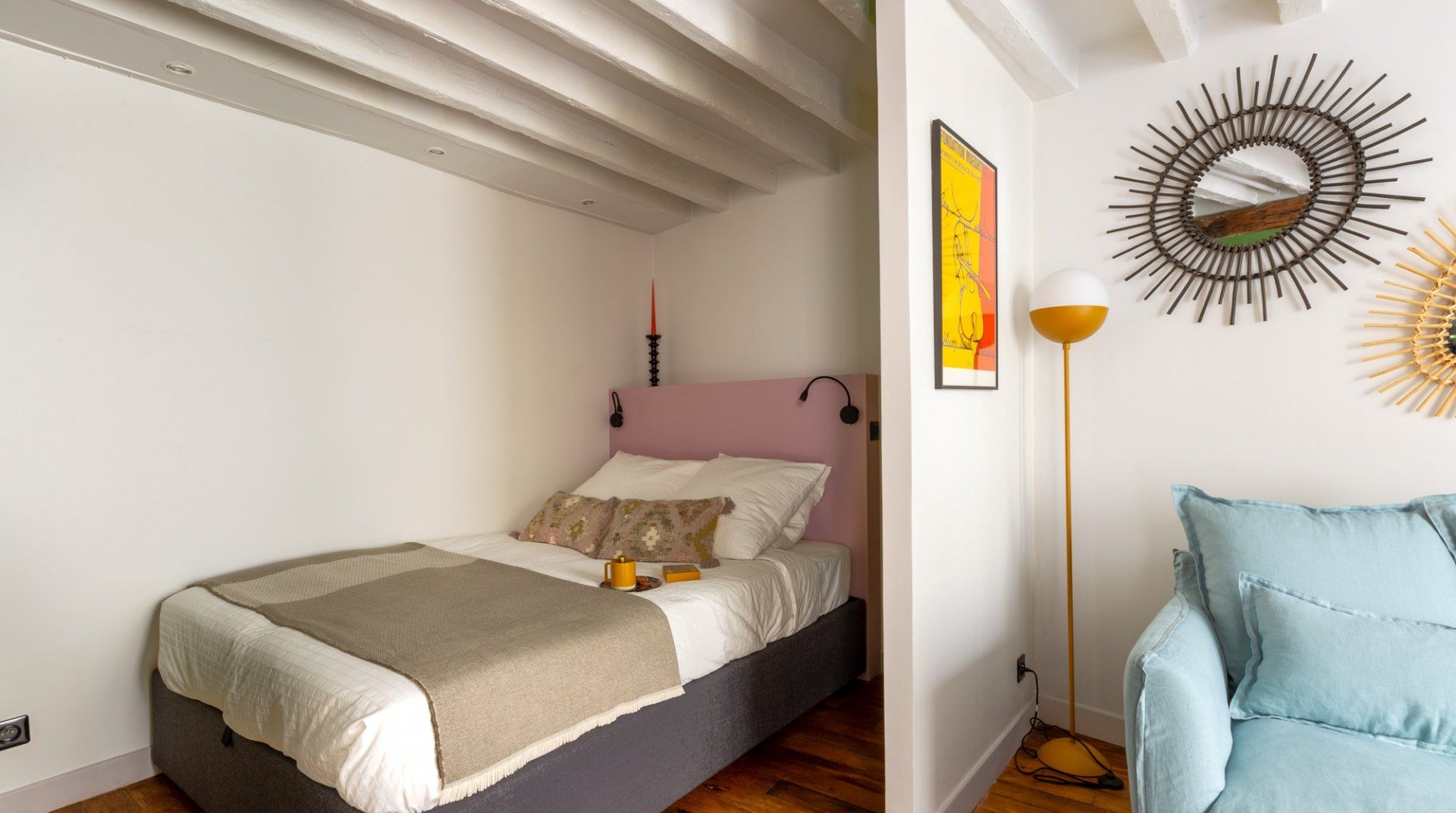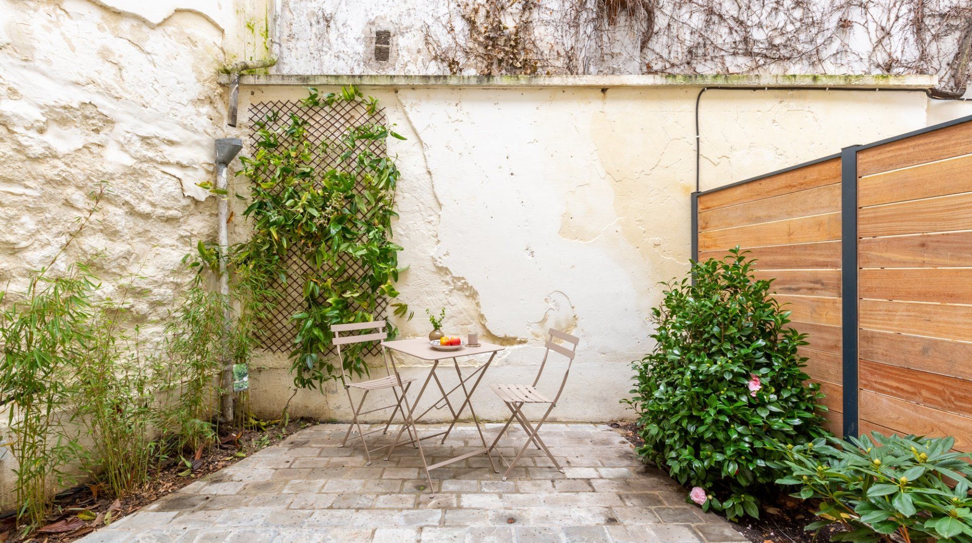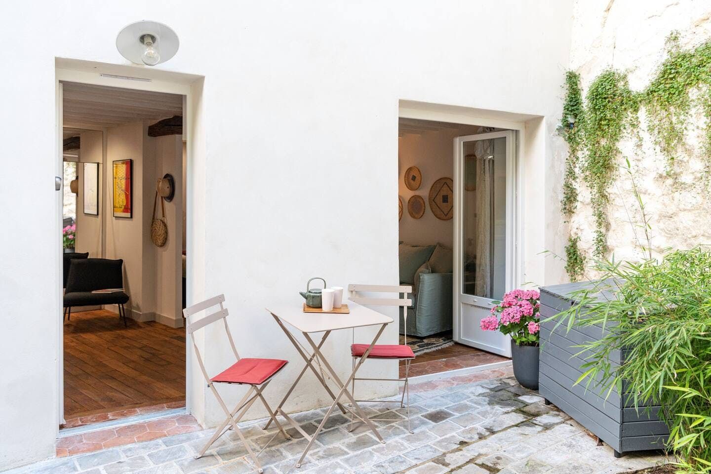 From its wood floors to its beamed ceilings and contemporary decor, there’s plenty of playfulness here in its soft colour palette and stylish wall ornaments mixed in with traditional Parisian charm. We love how much light pours in through the large windows, as well as from the glass doors that lead out onto a private courtyard garden. Whether you’re enjoying an alfresco breakfast of coffee or croissants or sipping a glass of French wine at sundown, you’ll relish having this outdoor space with its inviting bistro table and chairs.