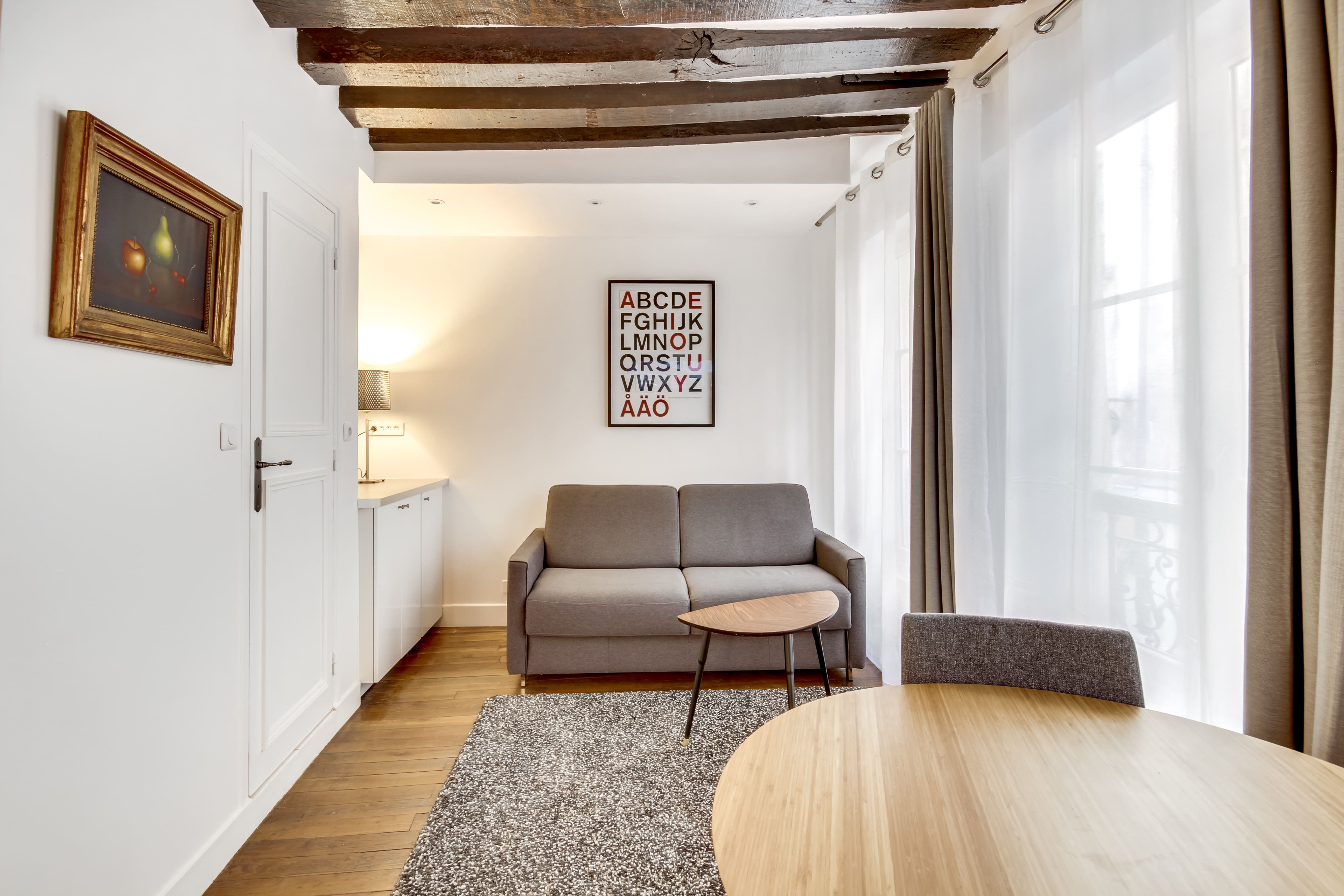 This chic apartment brings comfort to corporate stays in Paris. The muted coffee-and-cream colour palette gives it a tranquil air – this is a fuss-free base perfect for long-term stays. You’ll have all that you need here, including a kitchenette and a small dining table. The living space includes a sofa bed and wood beams that add character. Centrally located, this apartment is close to major attractions including the Louvre and Palais Garnier, with Metro stations nearby for exploring further afield.
