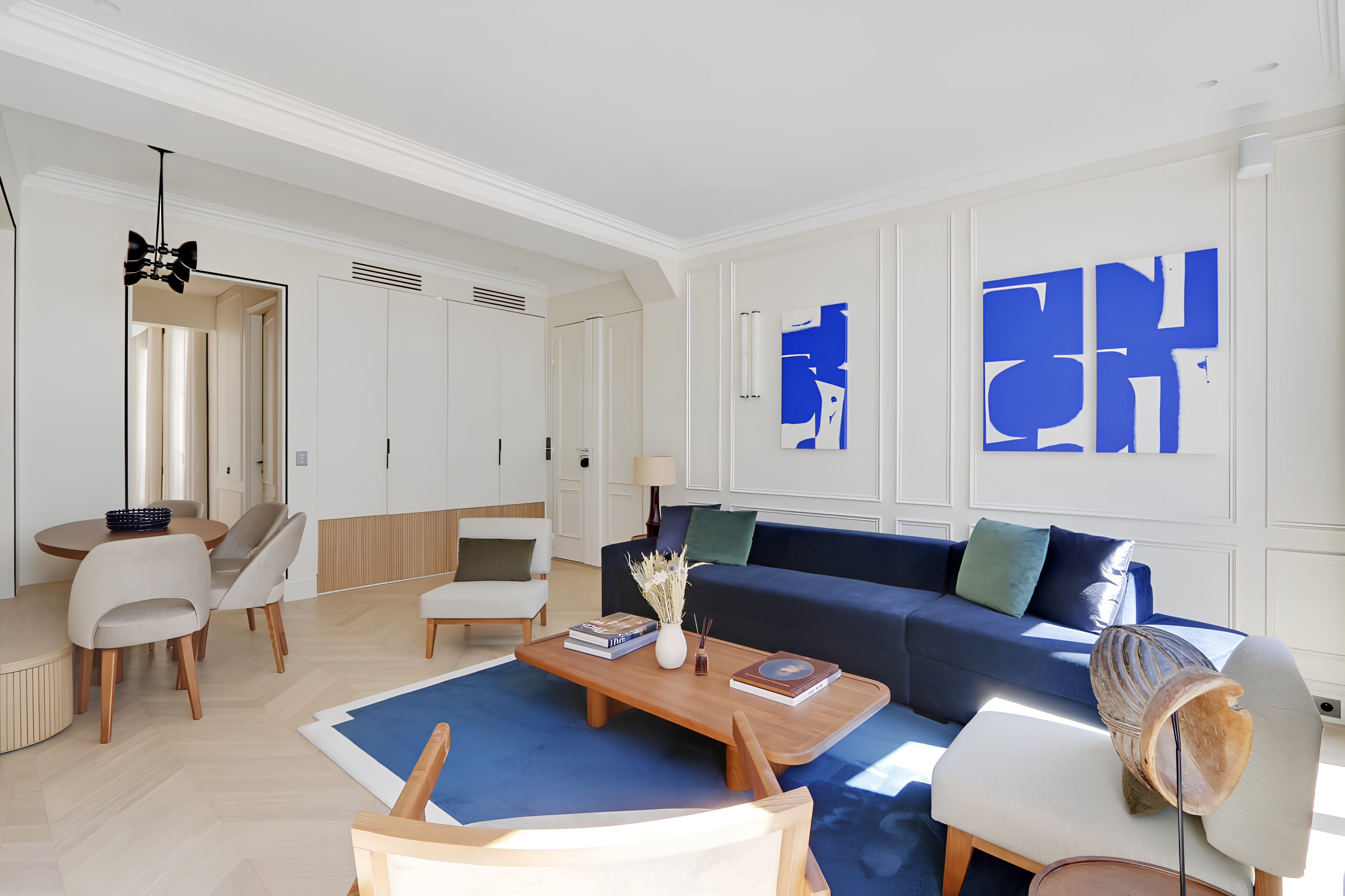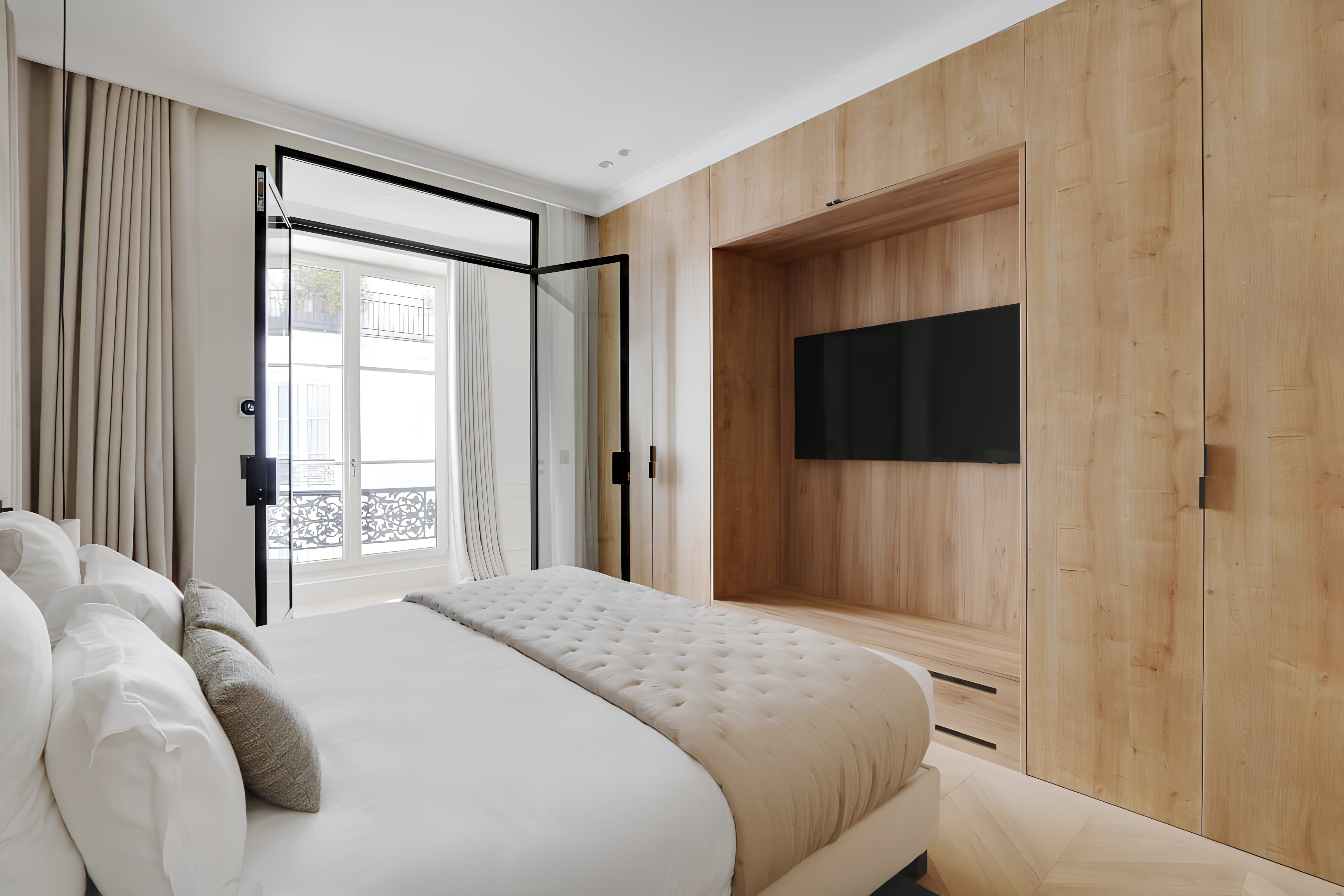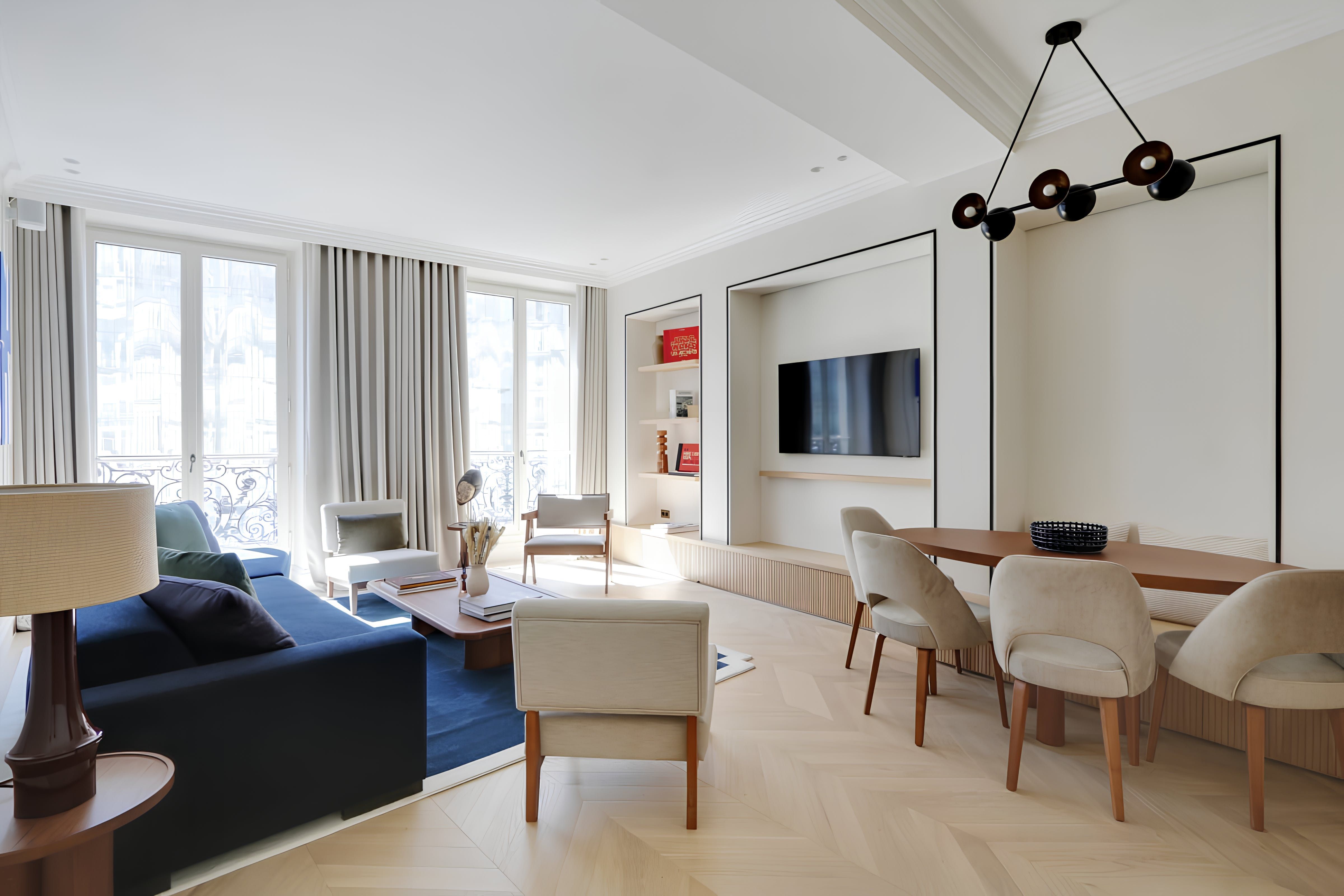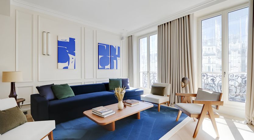 Look no further for a perfect location in Paris. We love that this second-floor home puts world-famous museums and fine dining on your doorstep. After shopping in Les Halles, you'll return to this historic Haussmann building, where a modern base awaits with a keyless entry code. Because guests five and six will sleep in the living area, expect a knock on the bedroom door when it's time for a shower. Both en-suites lack some privacy, which may have the others discussing plans on the Juliet balconies.