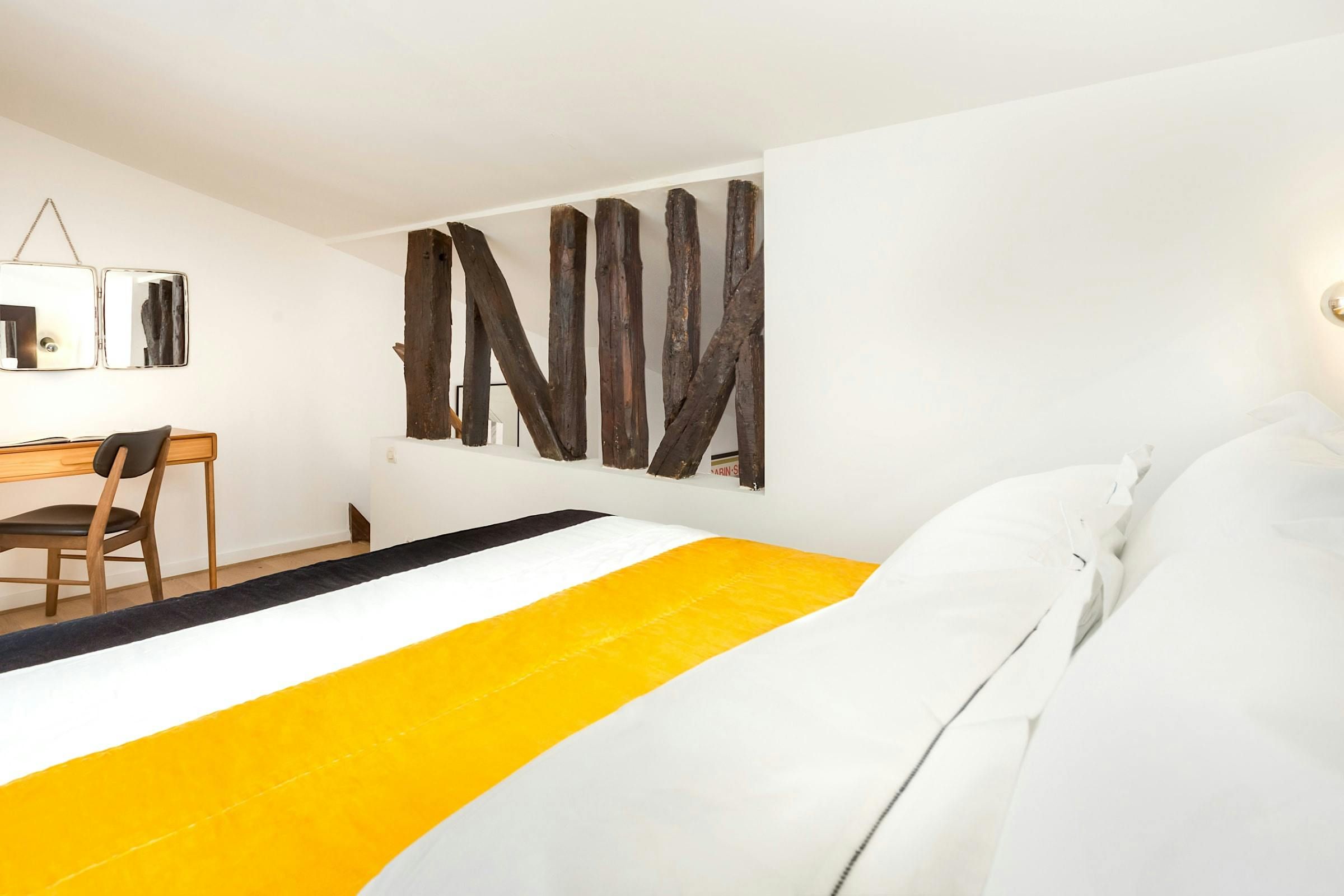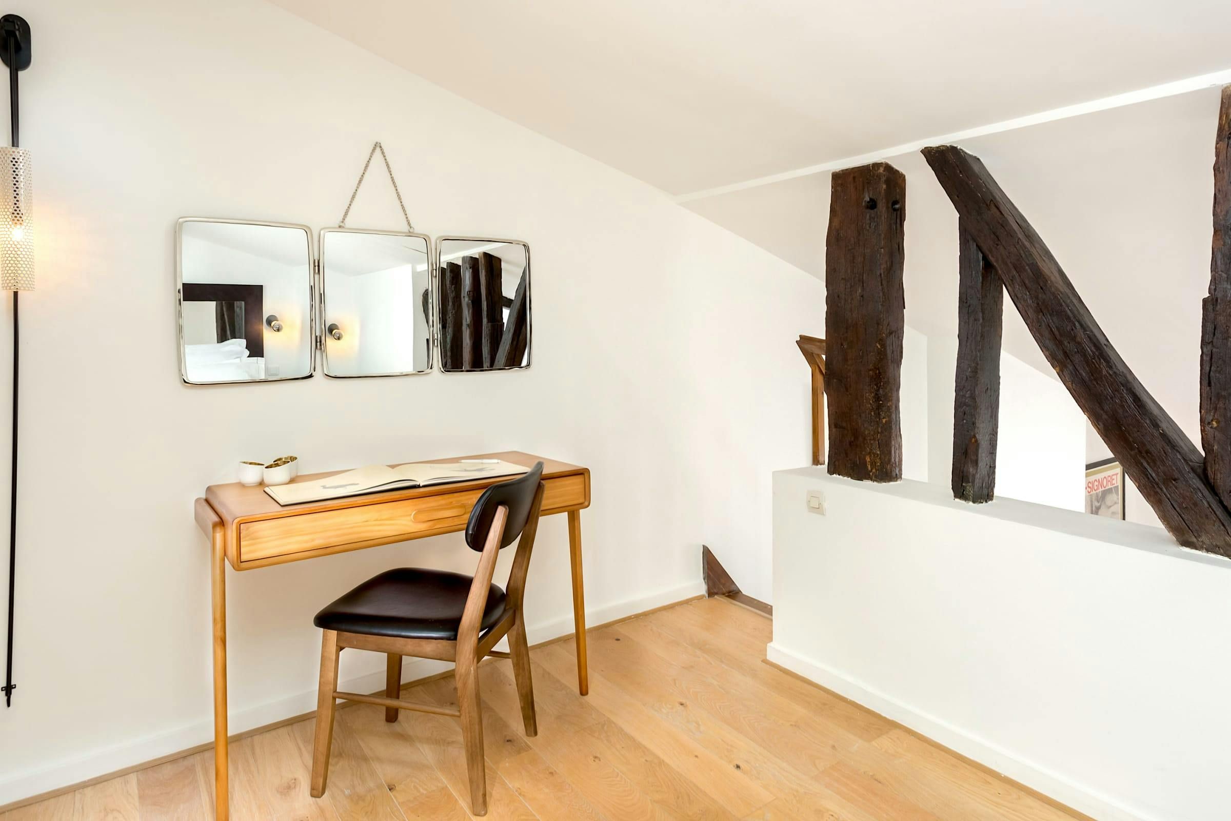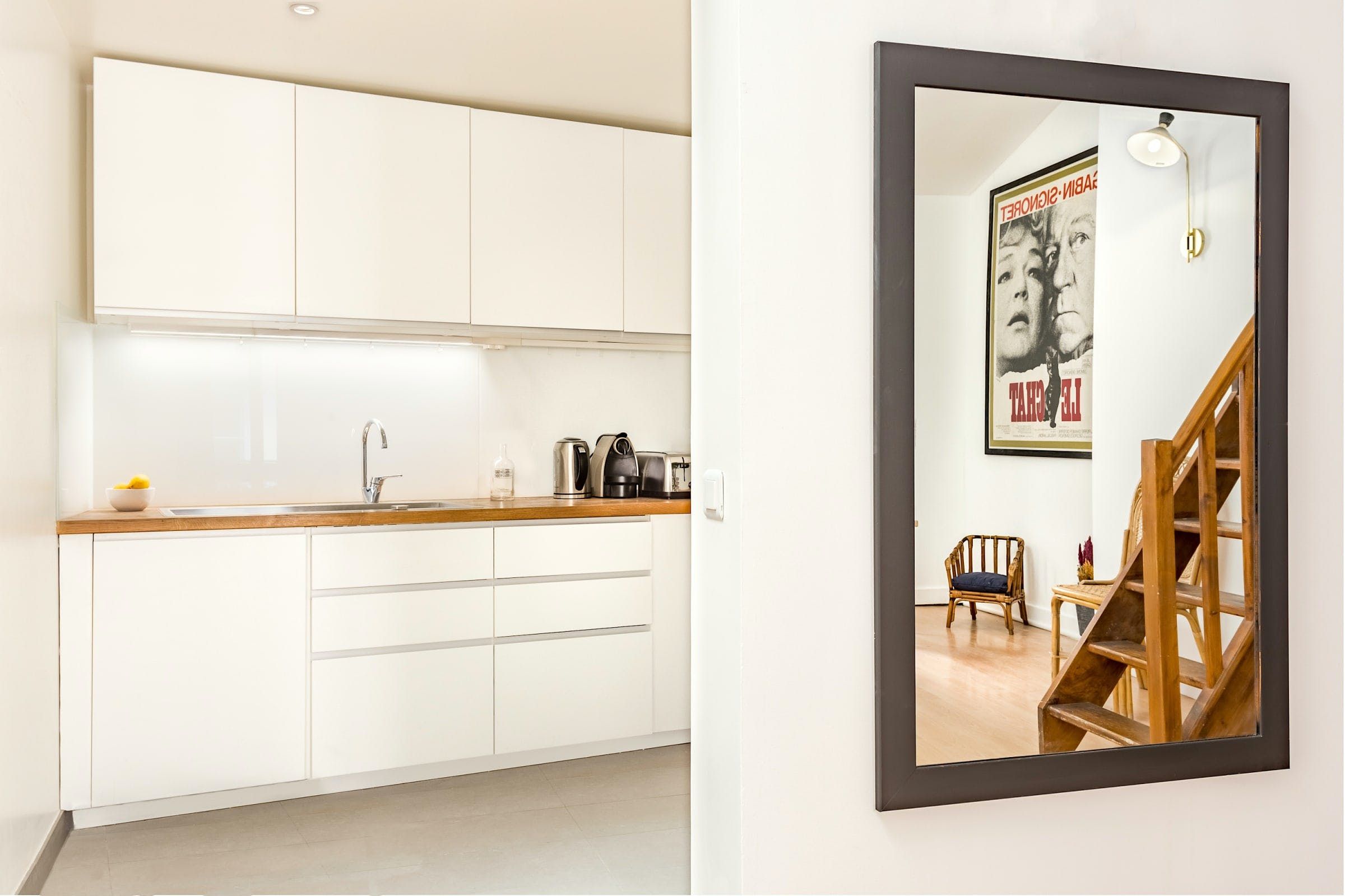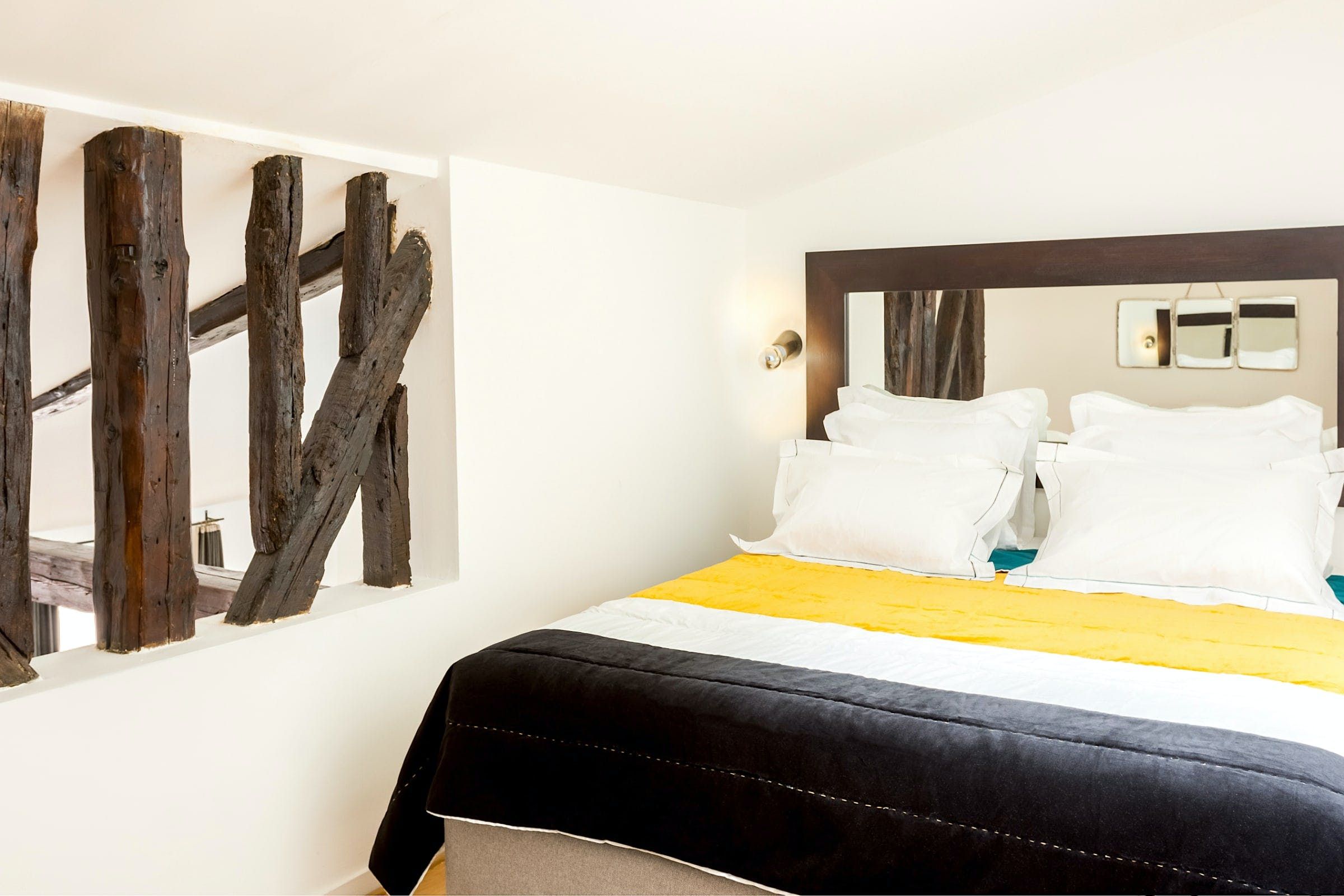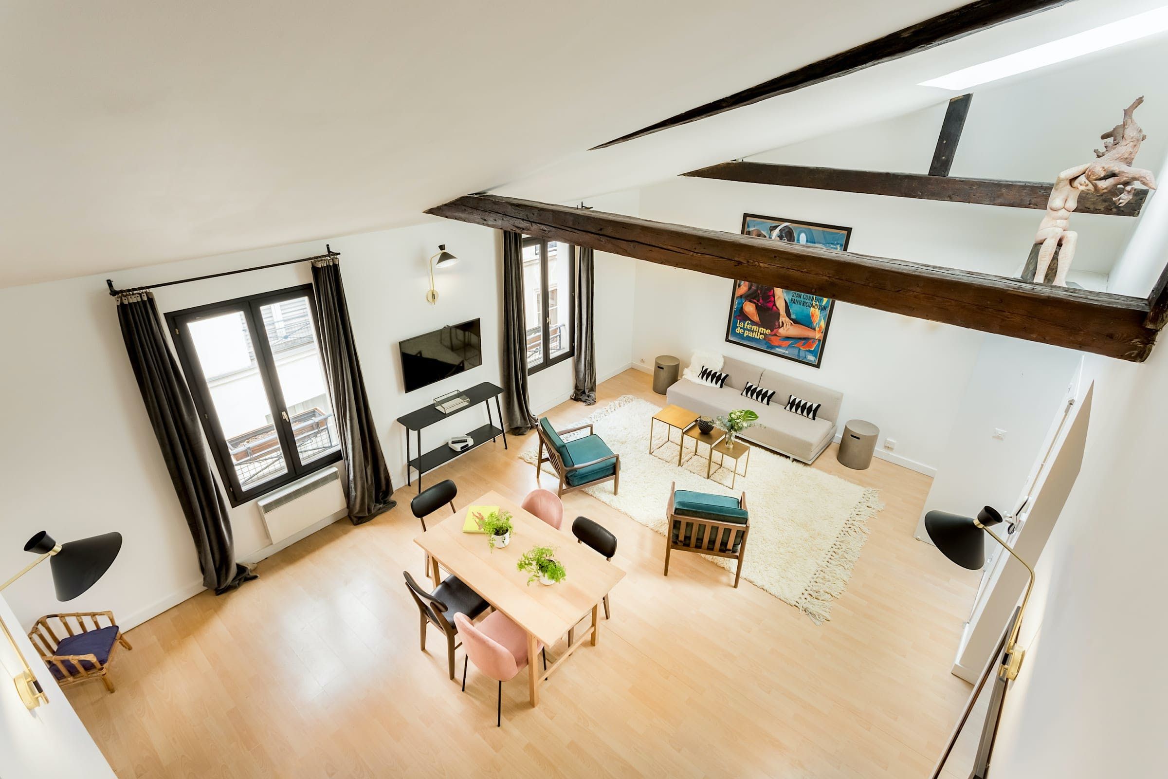 Tucked away in a quiet courtyard in Montorgueil, close to the Marais, this home is a peaceful hideaway in the city. It’s on a semi-pedestrian street just 50 metres from Sentier metro, surrounded by shops and bars. The apartment is bright and attractive, a converted loft on the third floor of the building – you’ll need to be ready to tackle quite a few stairs. The bedroom is on an open mezzanine level, with two guests on a sofa bed in the living room below, so it’s not the most private setup. But for a location like this, that’s easily forgiven.