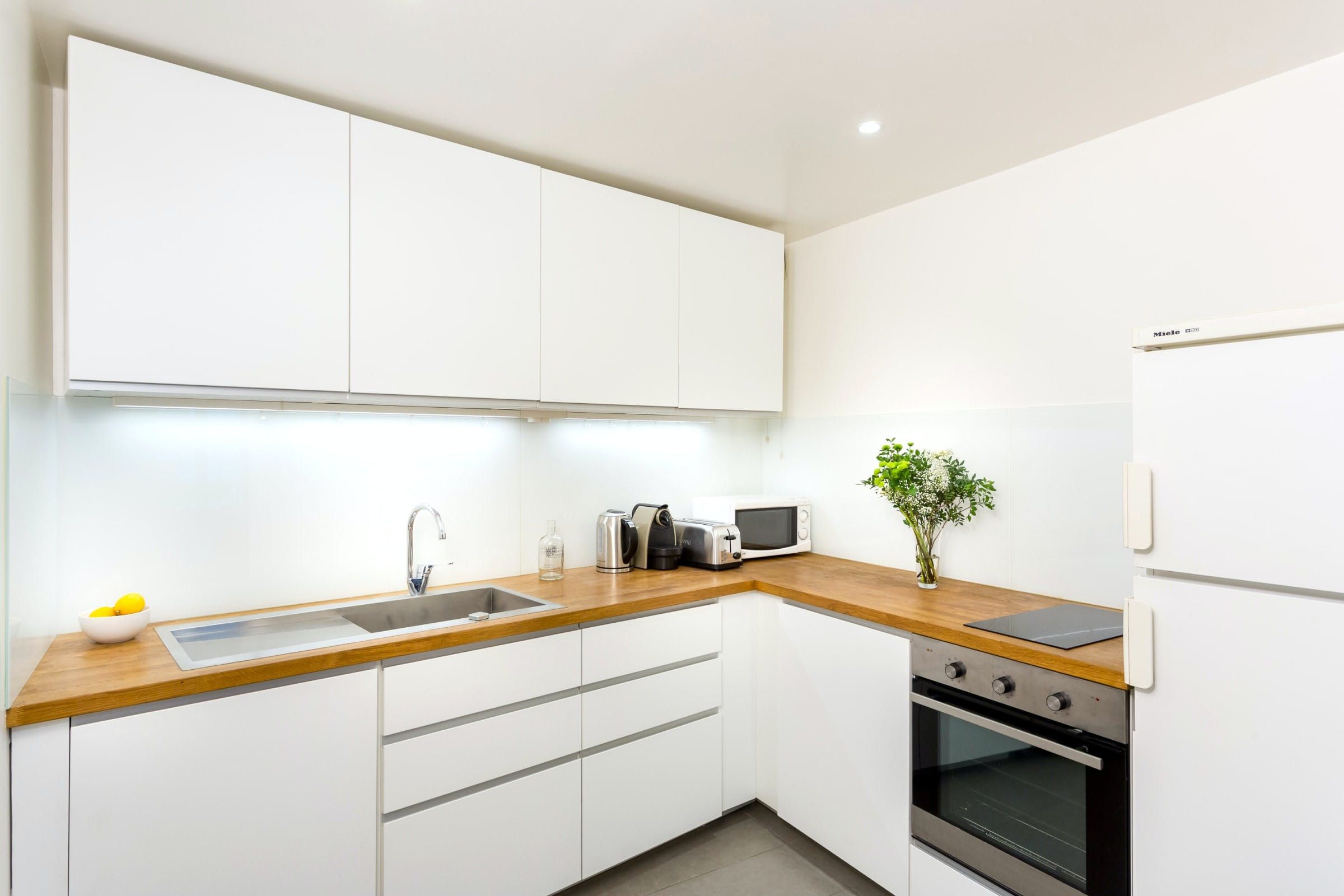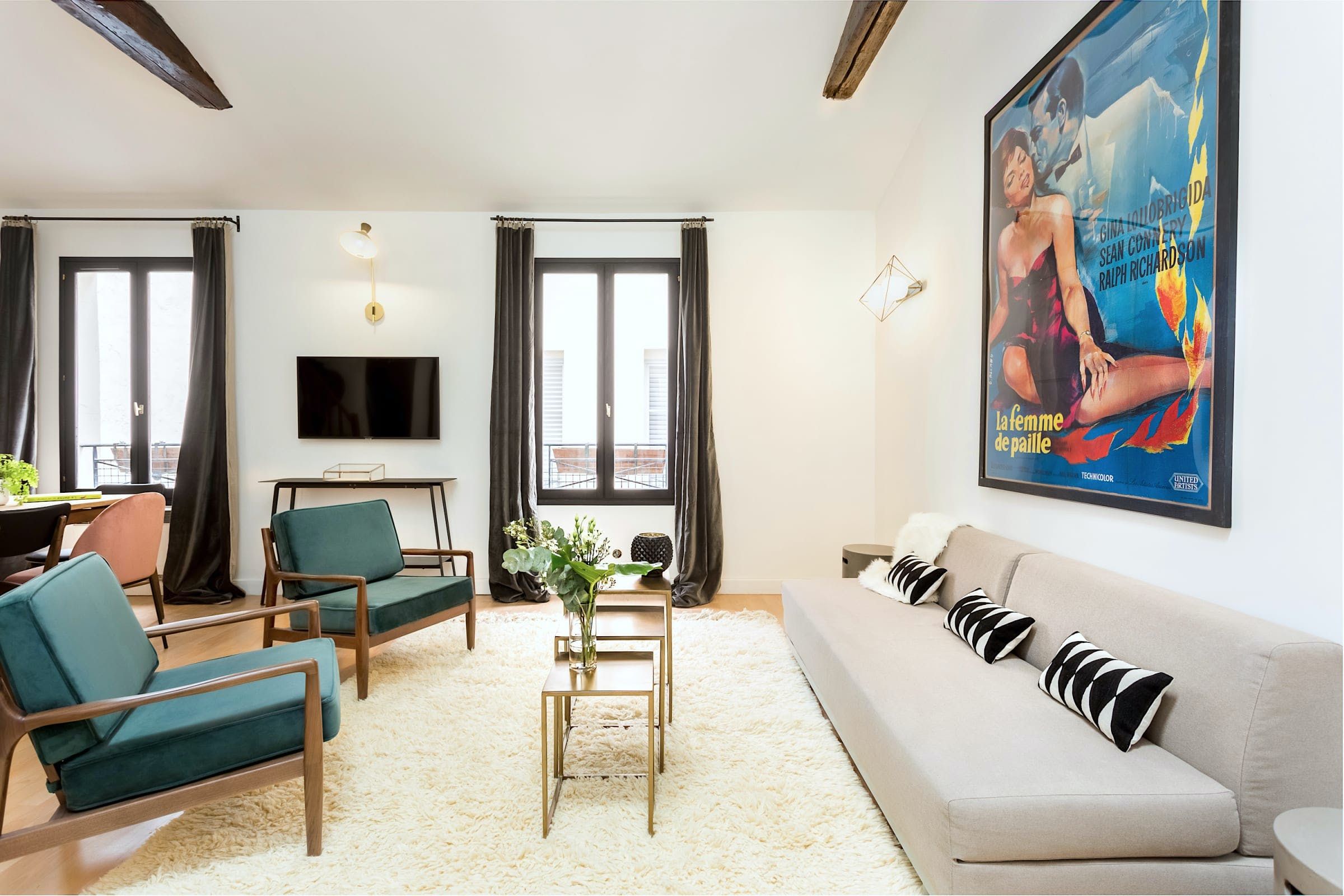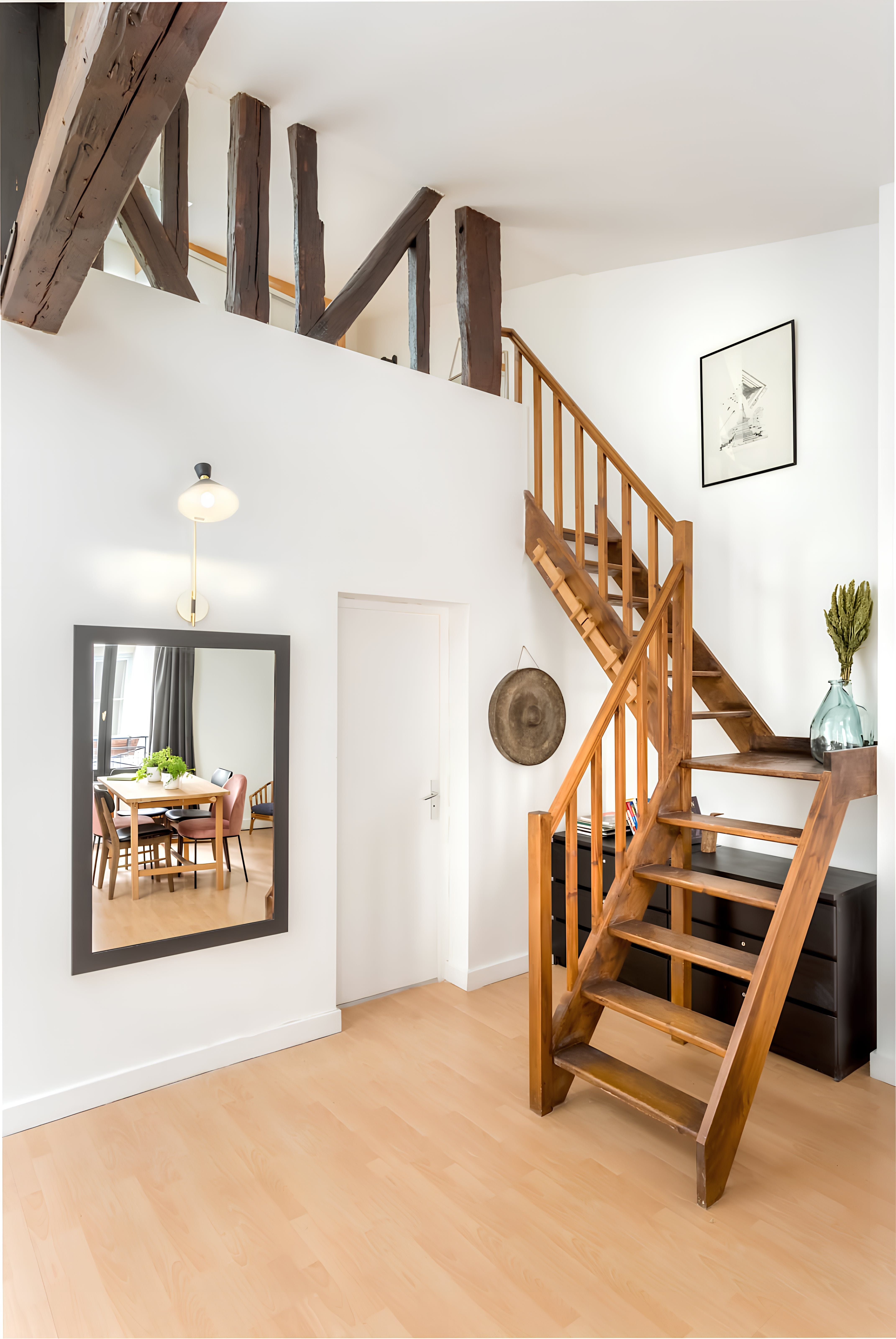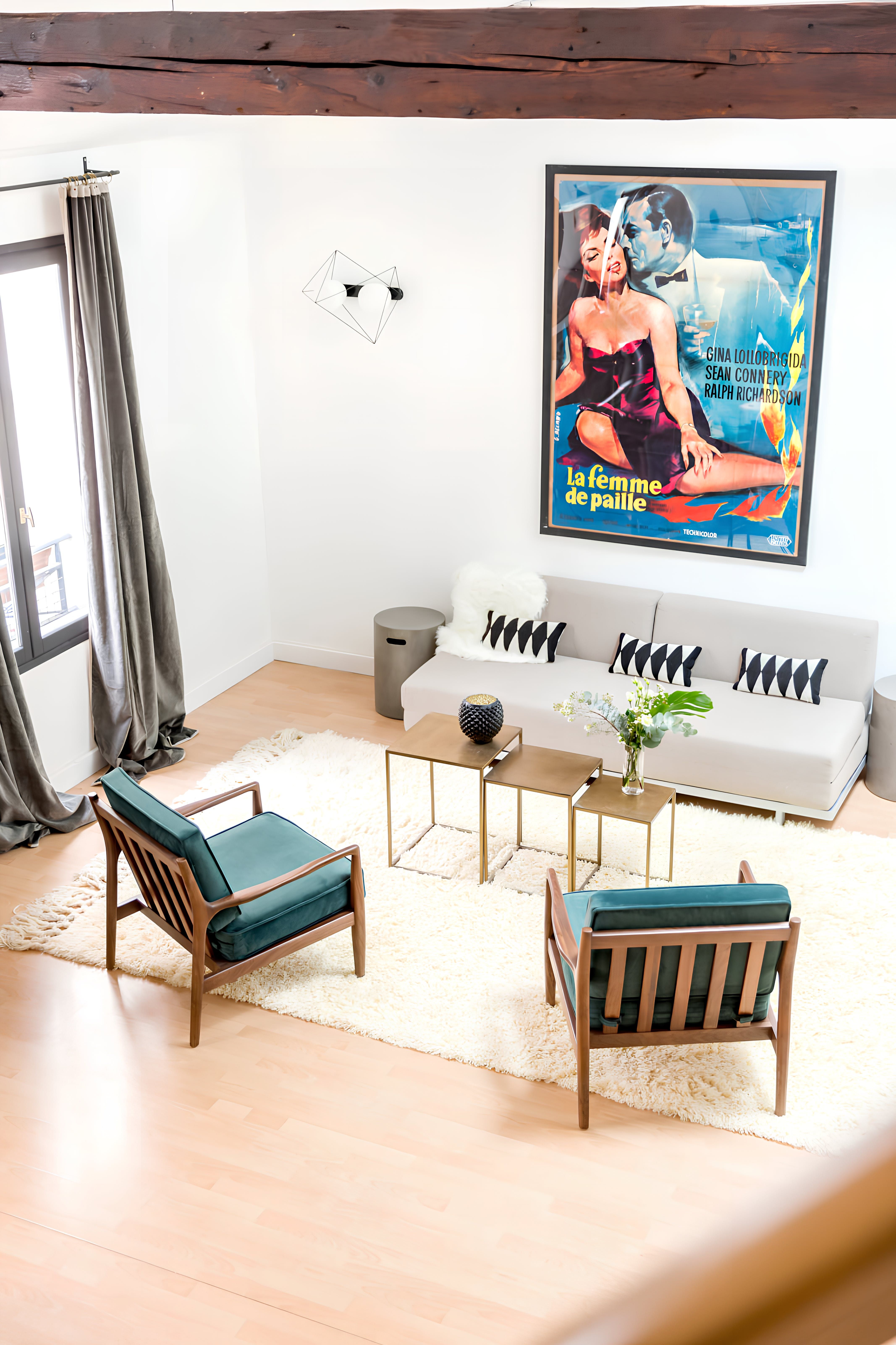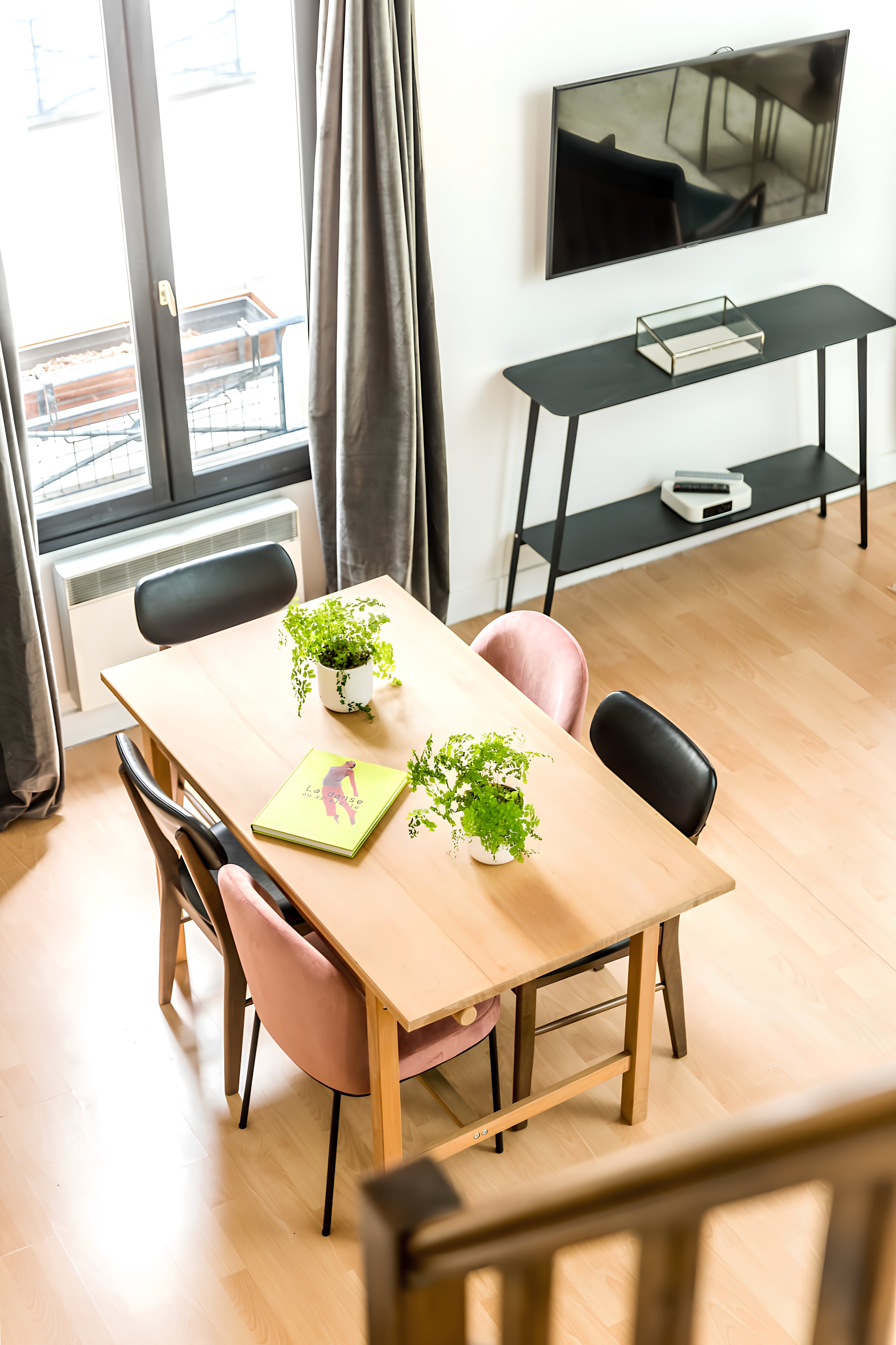 Tucked away in a quiet courtyard in Montorgueil, close to the Marais, this home is a peaceful hideaway in the city. It’s on a semi-pedestrian street just 50 metres from Sentier metro, surrounded by shops and bars. The apartment is bright and attractive, a converted loft on the third floor of the building – you’ll need to be ready to tackle quite a few stairs. The bedroom is on an open mezzanine level, with two guests on a sofa bed in the living room below, so it’s not the most private setup. But for a location like this, that’s easily forgiven.
