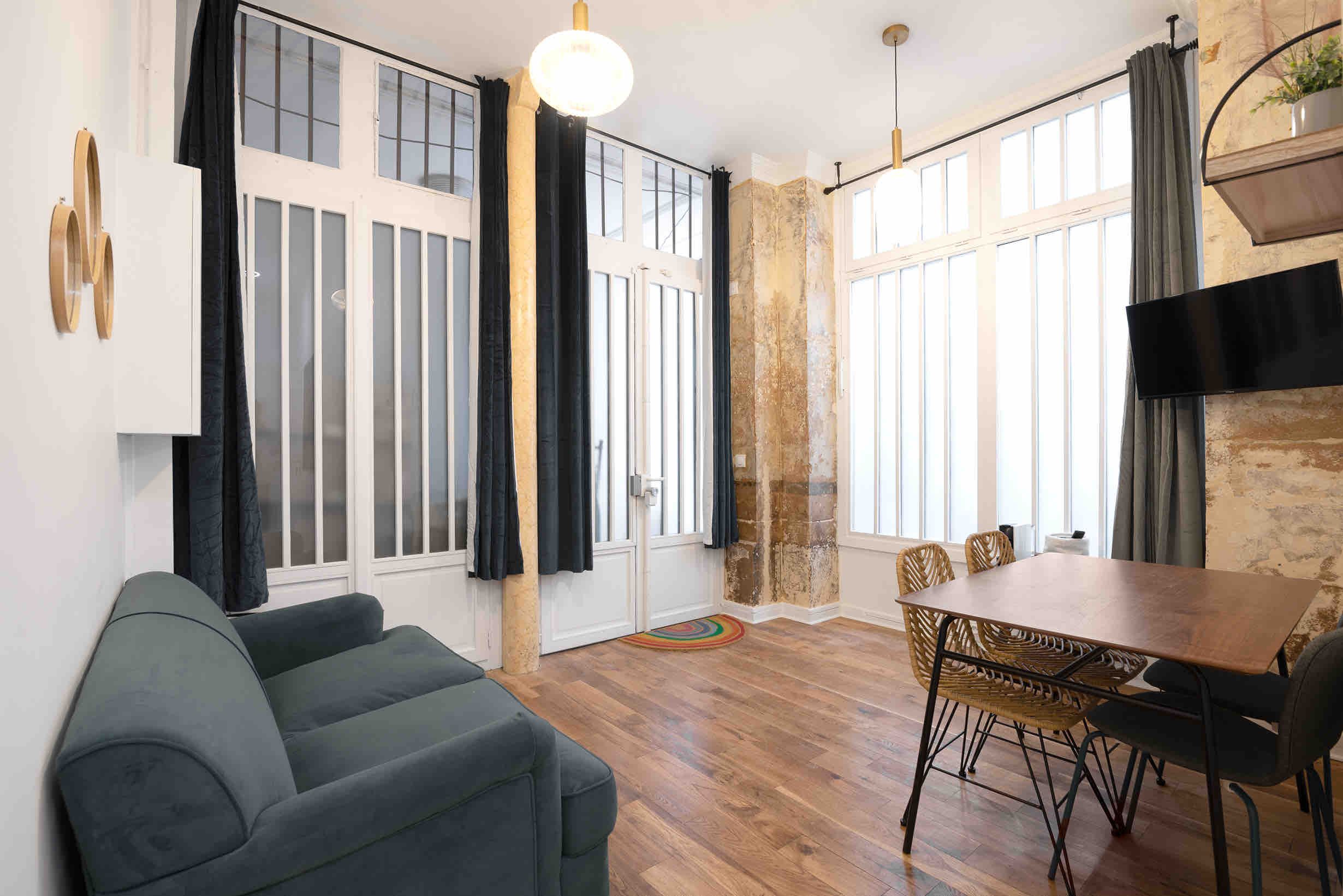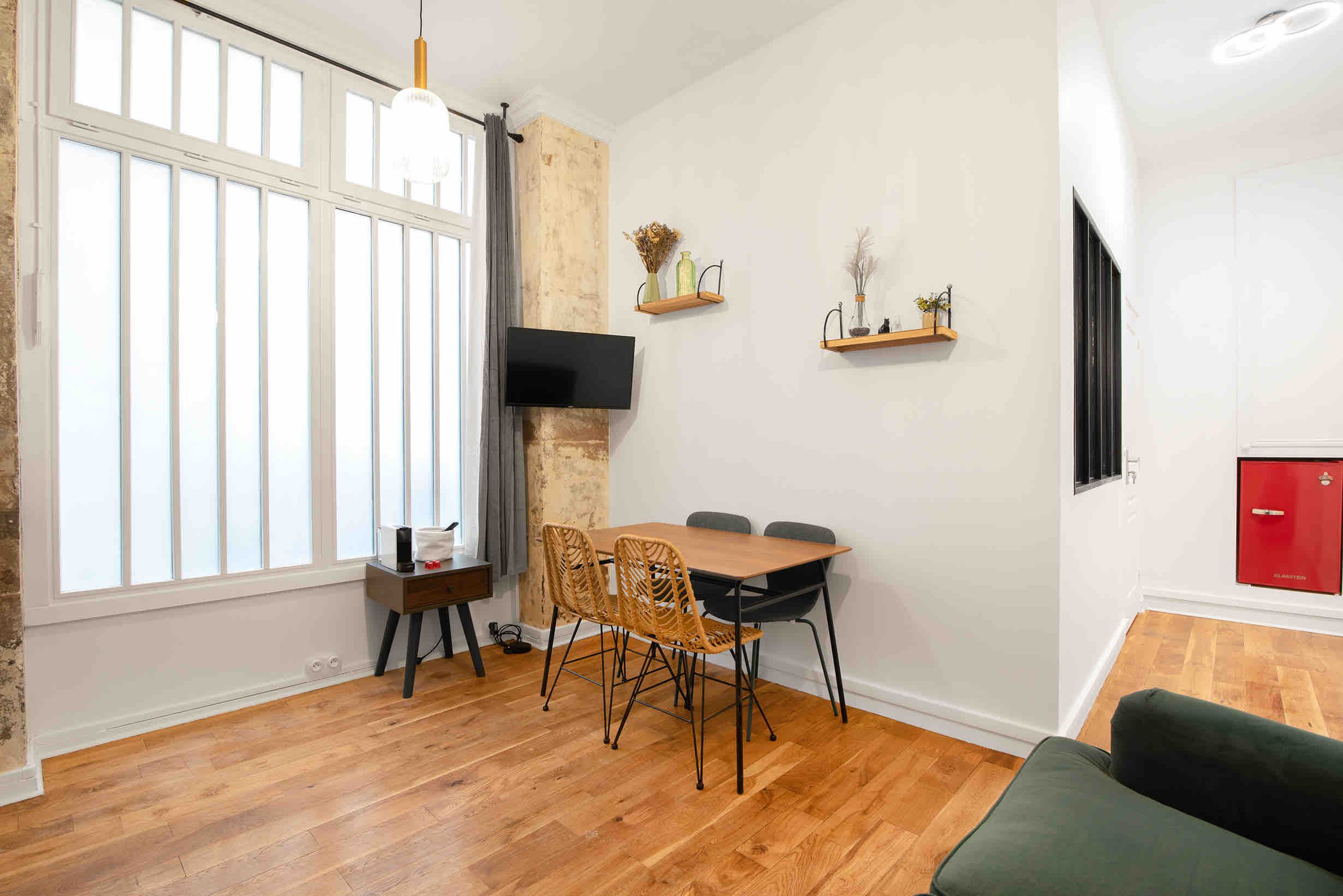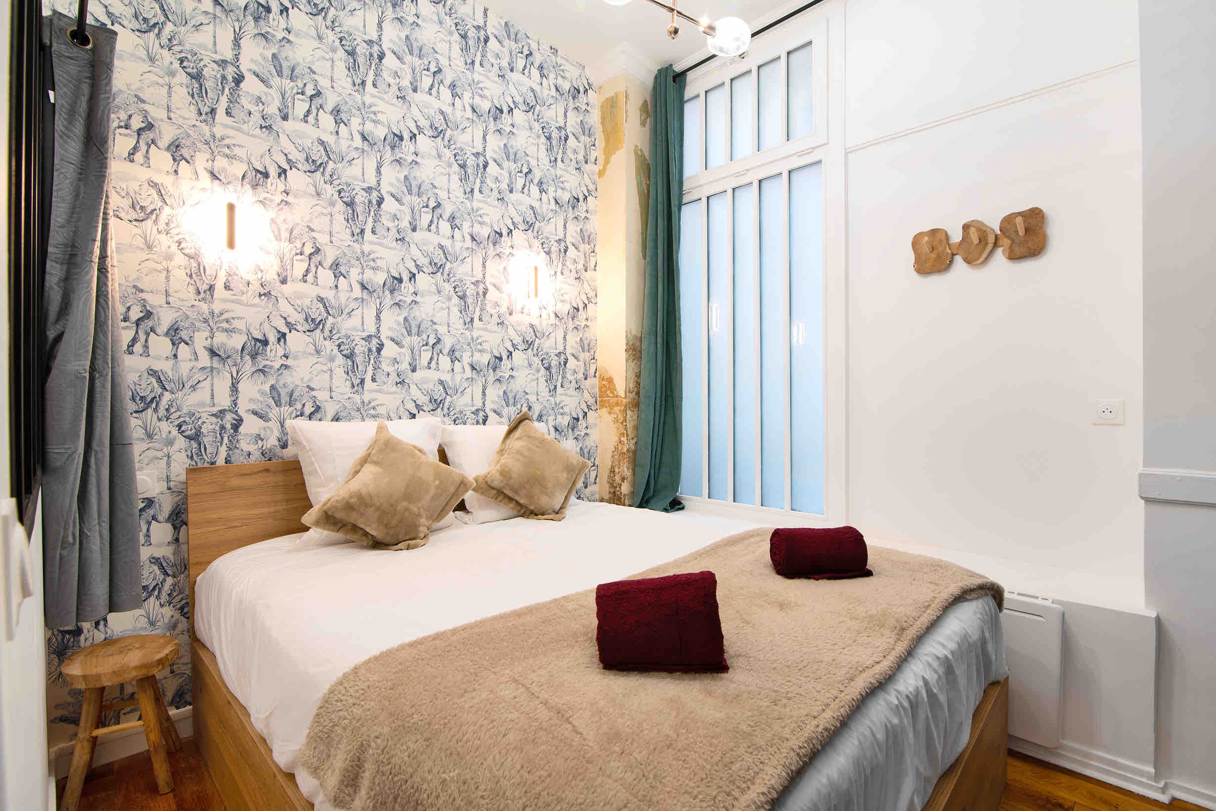 This apartment is within walking distance of vibrant Montmartre as well as the Palais Garnier. There are plenty of cafes and restaurants within a short stroll, too, which is convenient as this home’s kitchen has no oven (there’s a hob though). Facing the communal courtyard, the bright living room at this apartment also sleeps two guests on the sofa bed at full occupancy. We think this home will suit couples, families or friends who are looking for a good location with great public transport links.