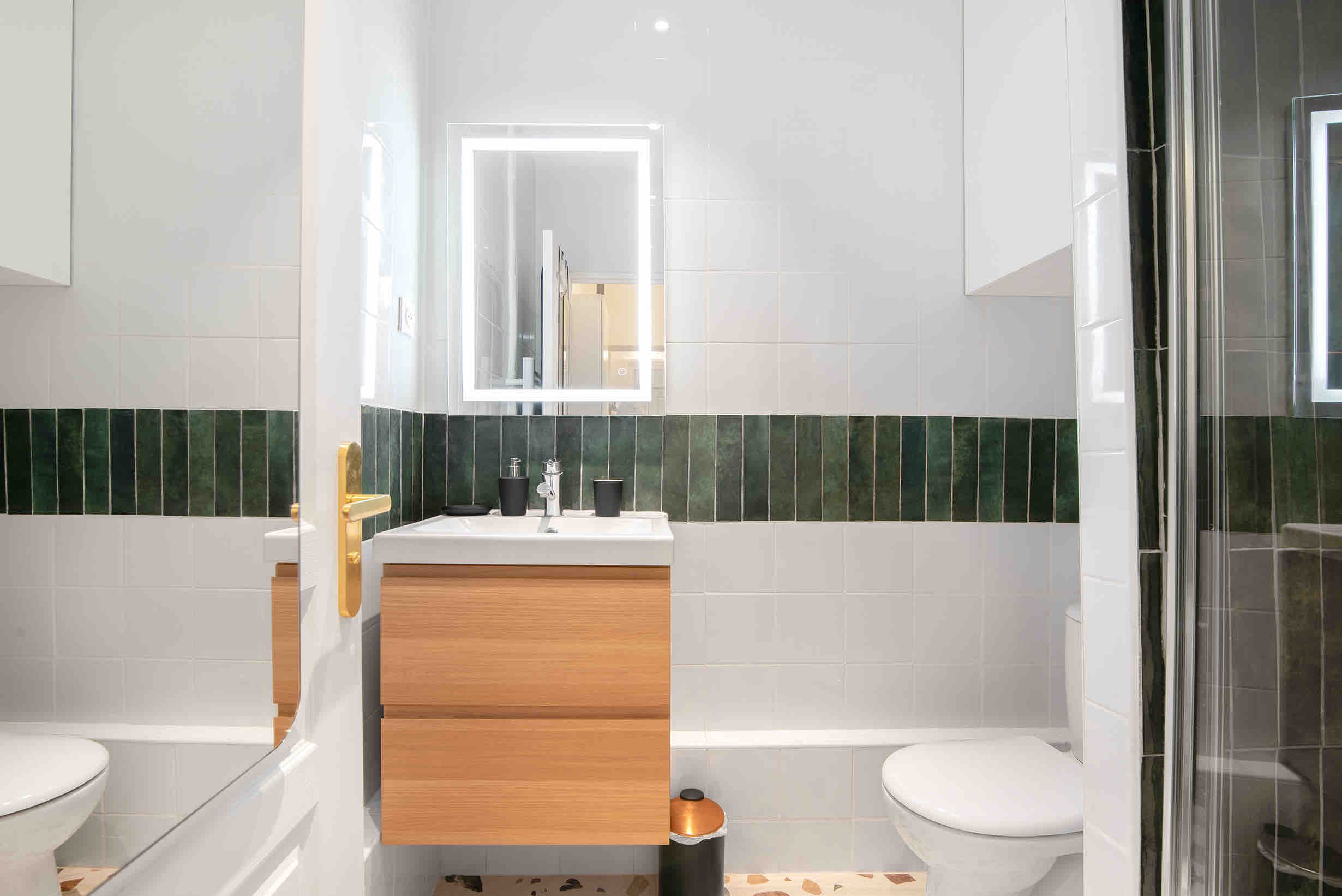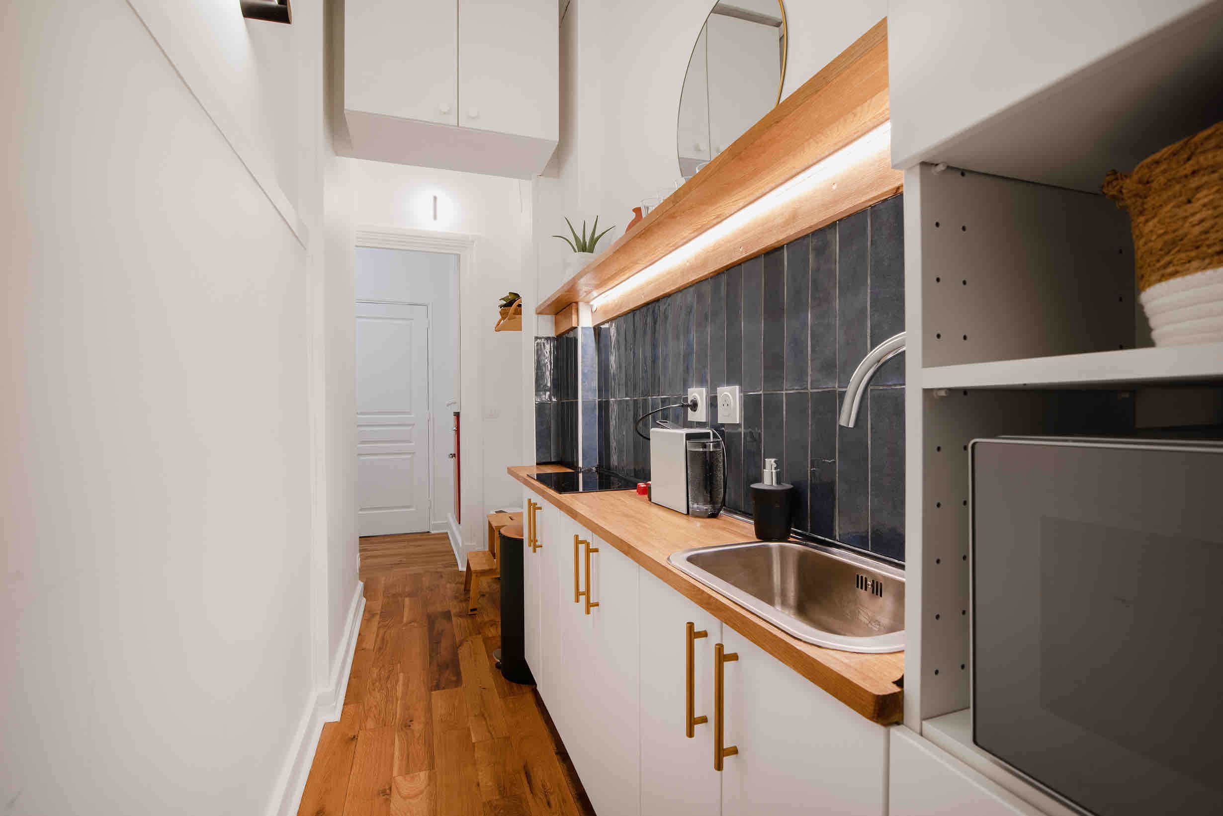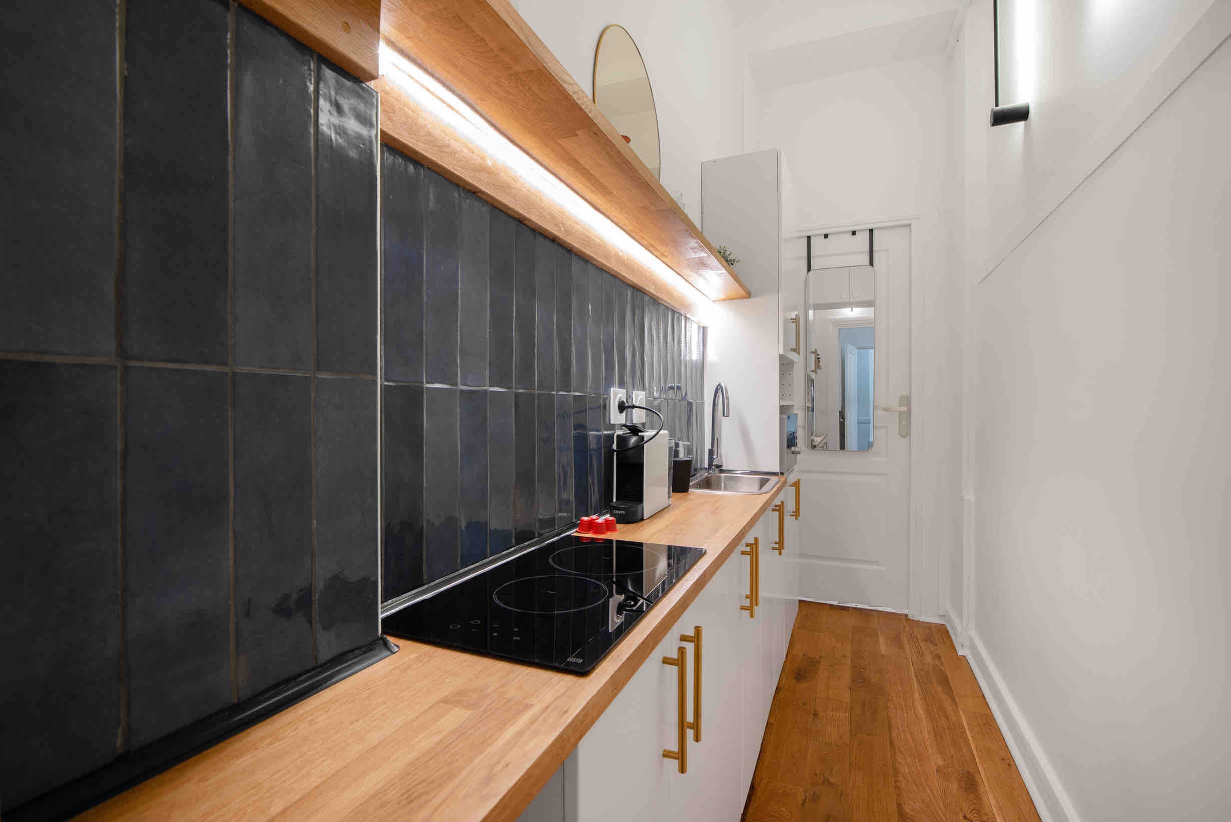 This apartment is within walking distance of vibrant Montmartre as well as the Palais Garnier. There are plenty of cafes and restaurants within a short stroll, too, which is convenient as this home’s kitchen has no oven (there’s a hob though). Facing the communal courtyard, the bright living room at this apartment also sleeps two guests on the sofa bed at full occupancy. We think this home will suit couples, families or friends who are looking for a good location with great public transport links.