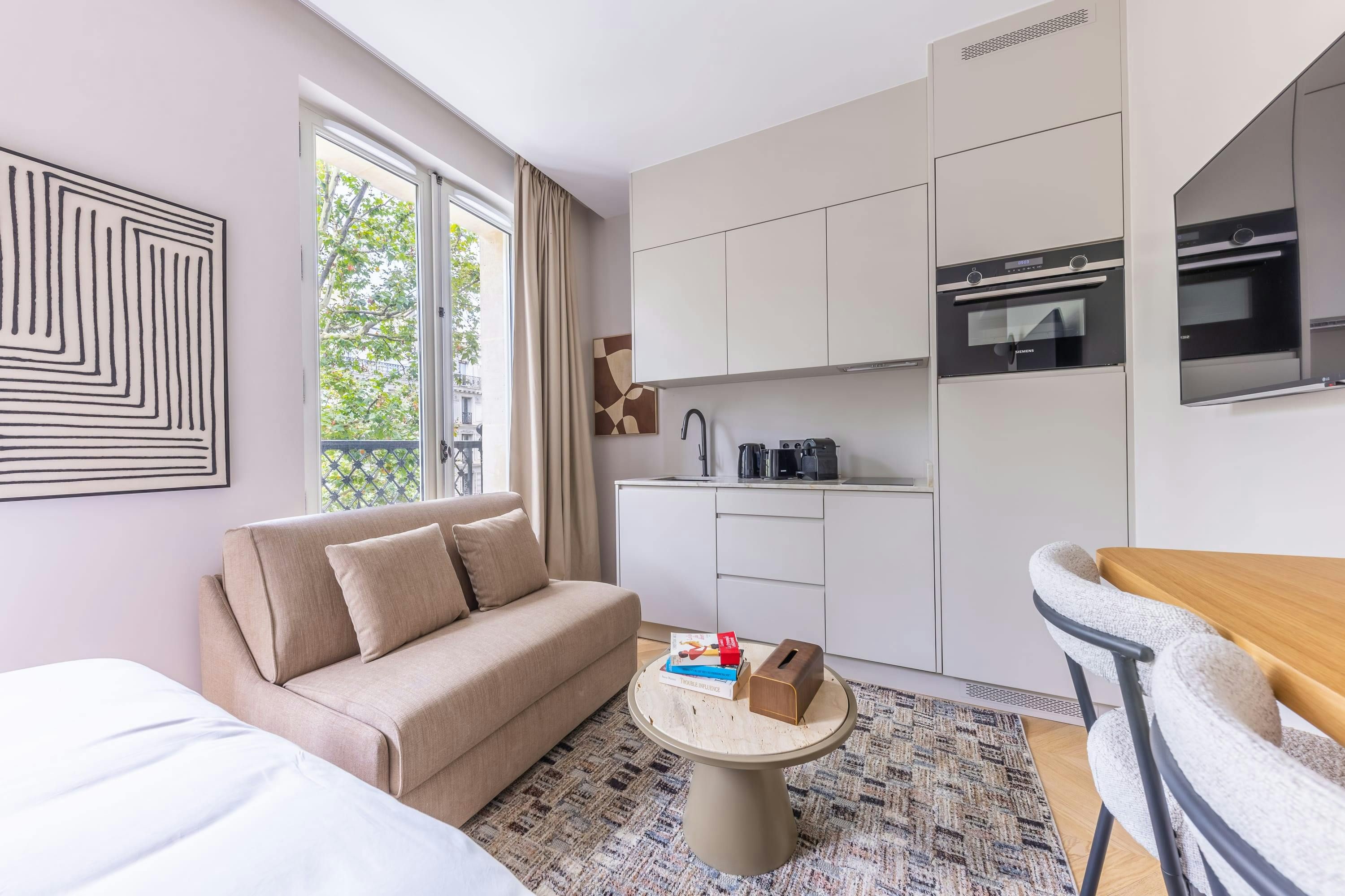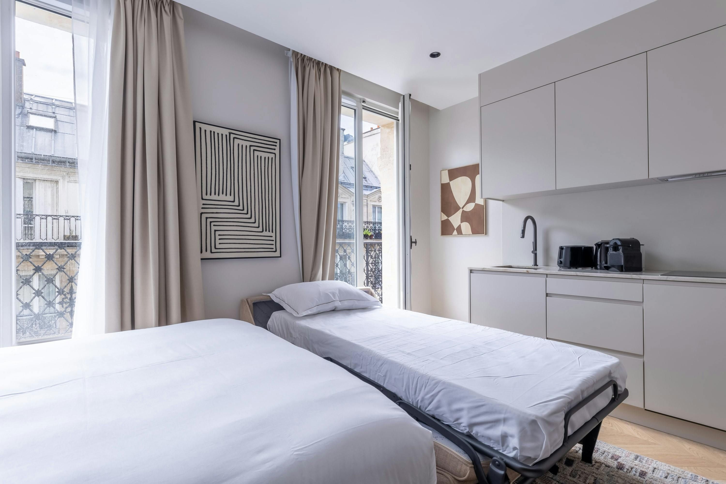 Set in the heart of the 3rd arrondissement, you’ll be a short stroll from the Pompidou Centre, the Musée des Arts et Métiers and the district of Le Marais. There are a wide range of eateries near this studio apartment and the Palais Royal and the Louvre are also within walking distance. We love the views from the small balcony over the typically Parisian street. And while the living and sleeping space is compact, it has everything you need (one guest will also be sleeping on a sofa bed here at full capacity). This comfy home is ideal for guests looking for a cultural break.