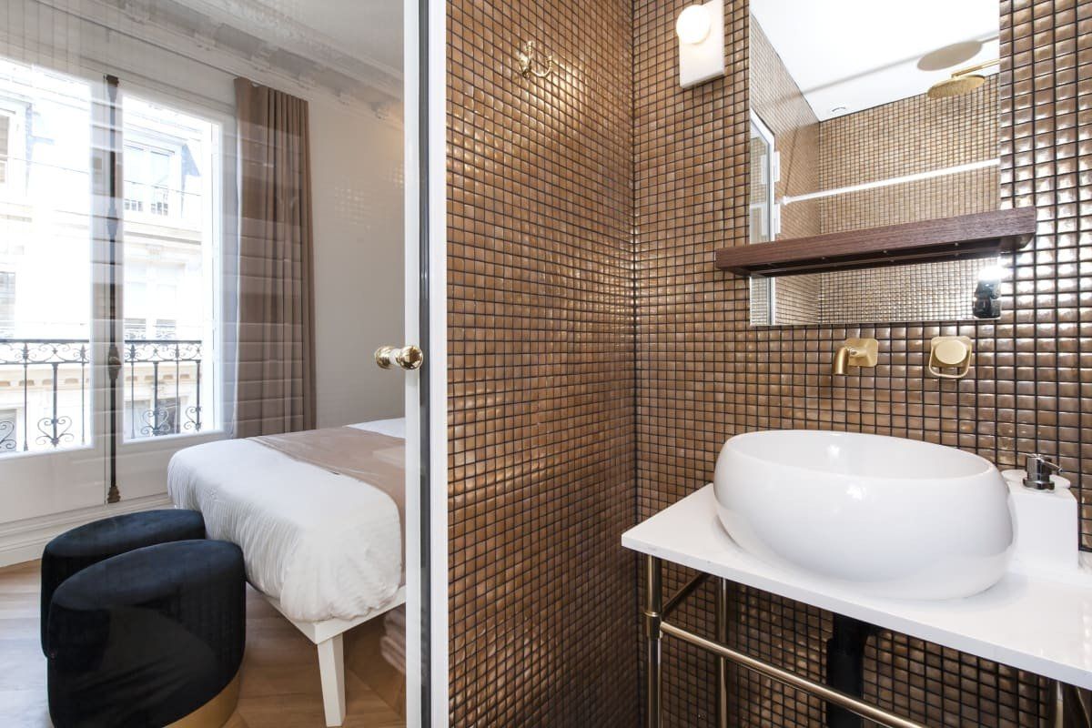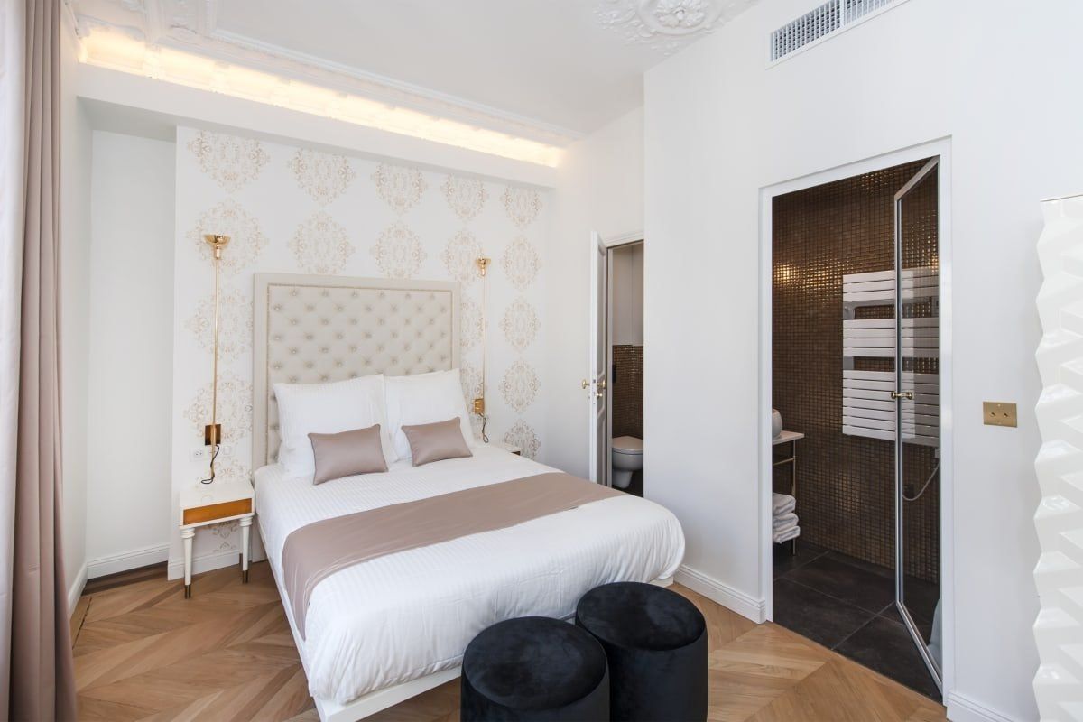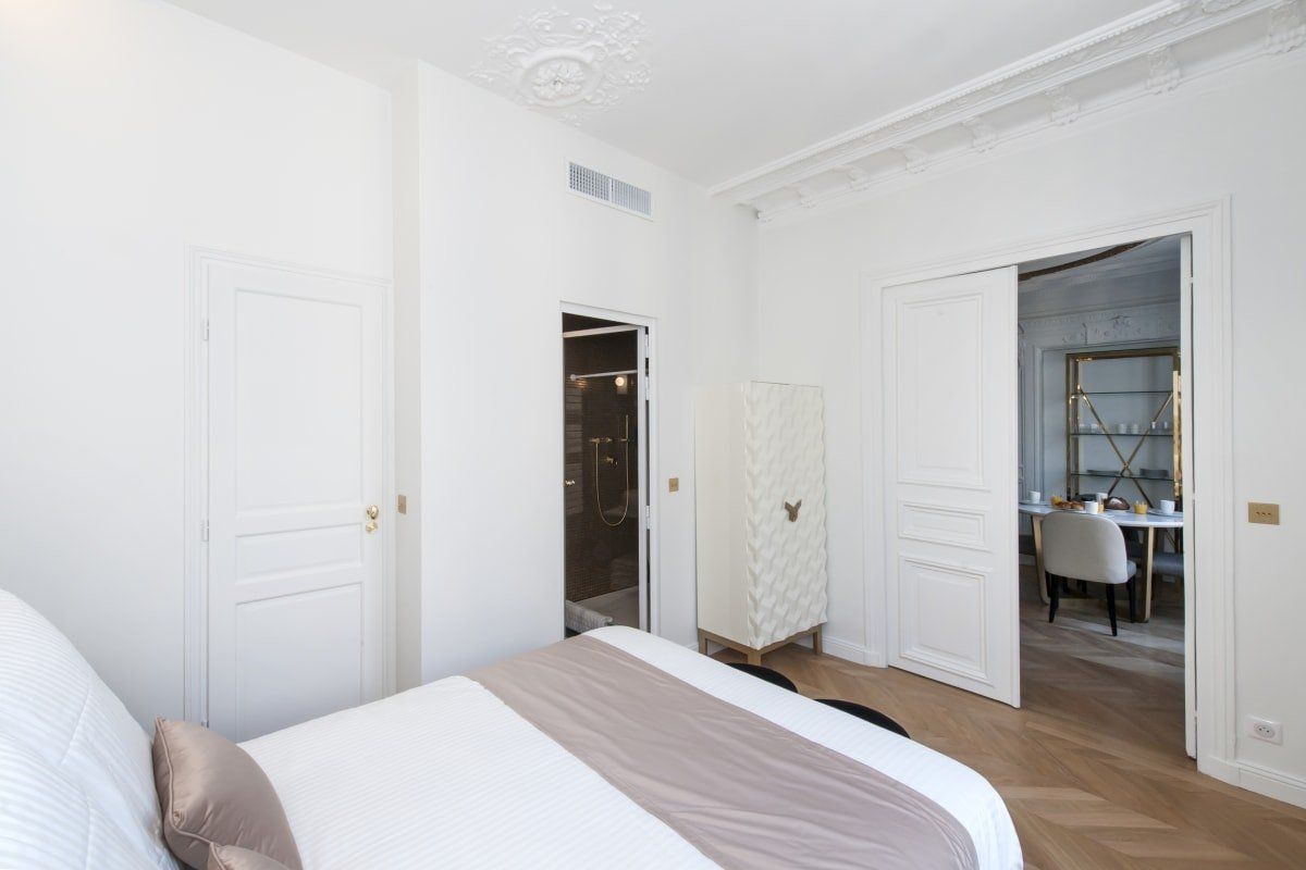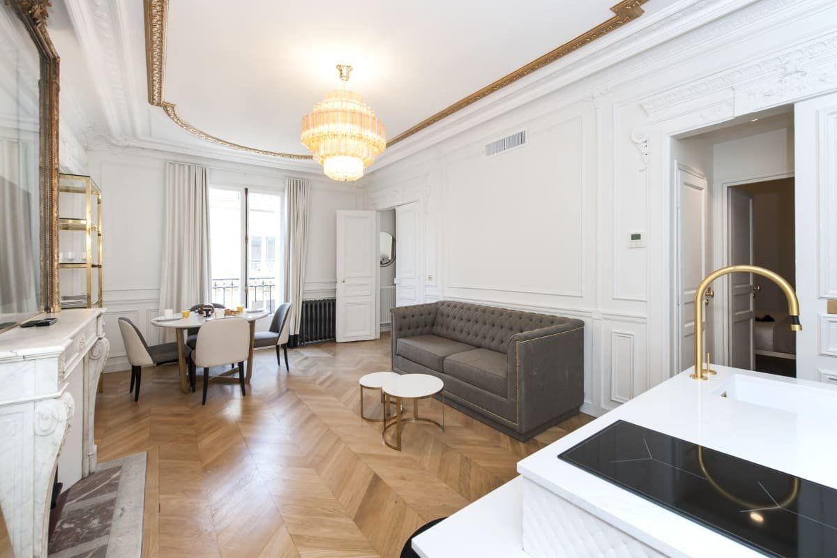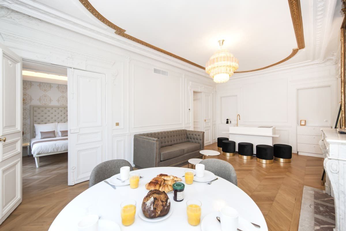 Inside, parquet floors, tall corniced ceilings and gold-edged accents create a stately welcome in the open-plan living space with contemporary furnishings adding to the glamorous scene. Gather around the dining table for breakfasts of fresh coffee and croissants or sit down to a sophisticated soirée over locally bought wine and cheese. The Juliet balcony here and in the main bedroom provide the ideal spots to perch with a drink while taking in 8th arrondissement views, while the beds beckon a comfortable night’s sleep. Factor in the luxurious rainfall showers and you’ve got everything you need for a relaxing city stay.