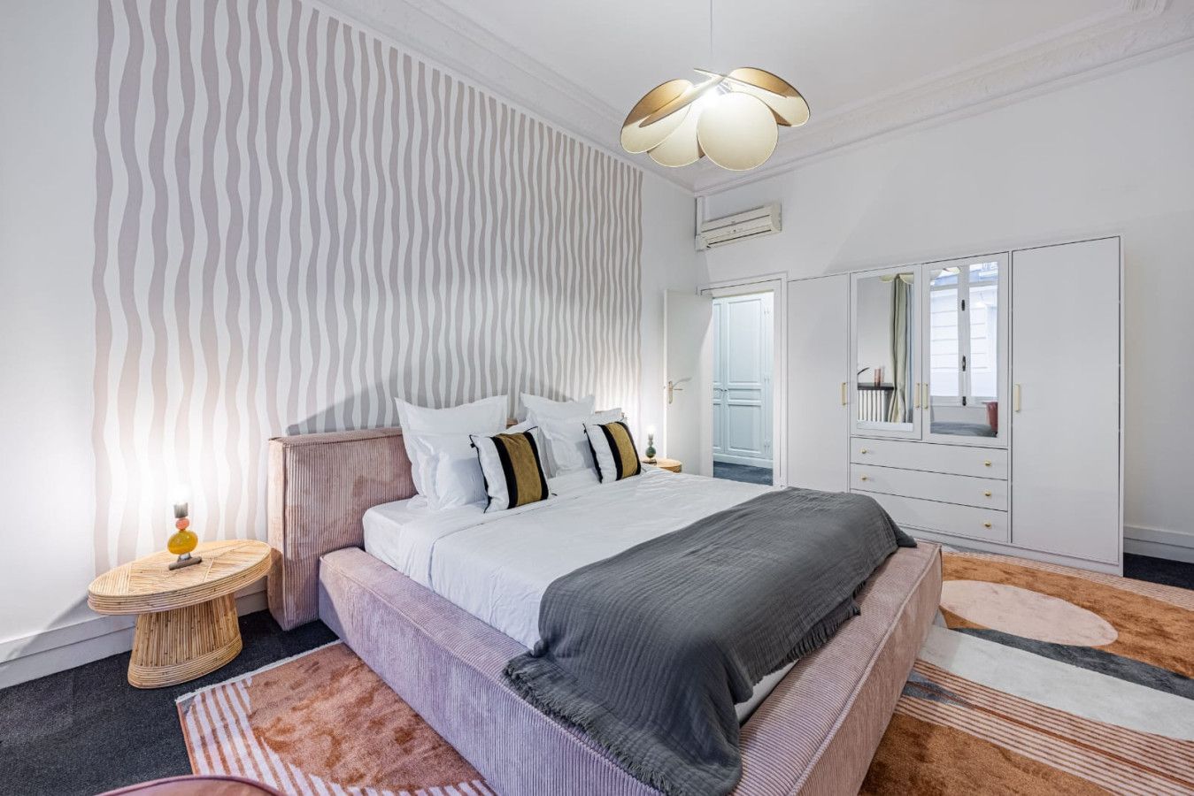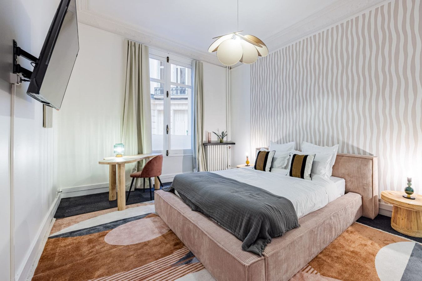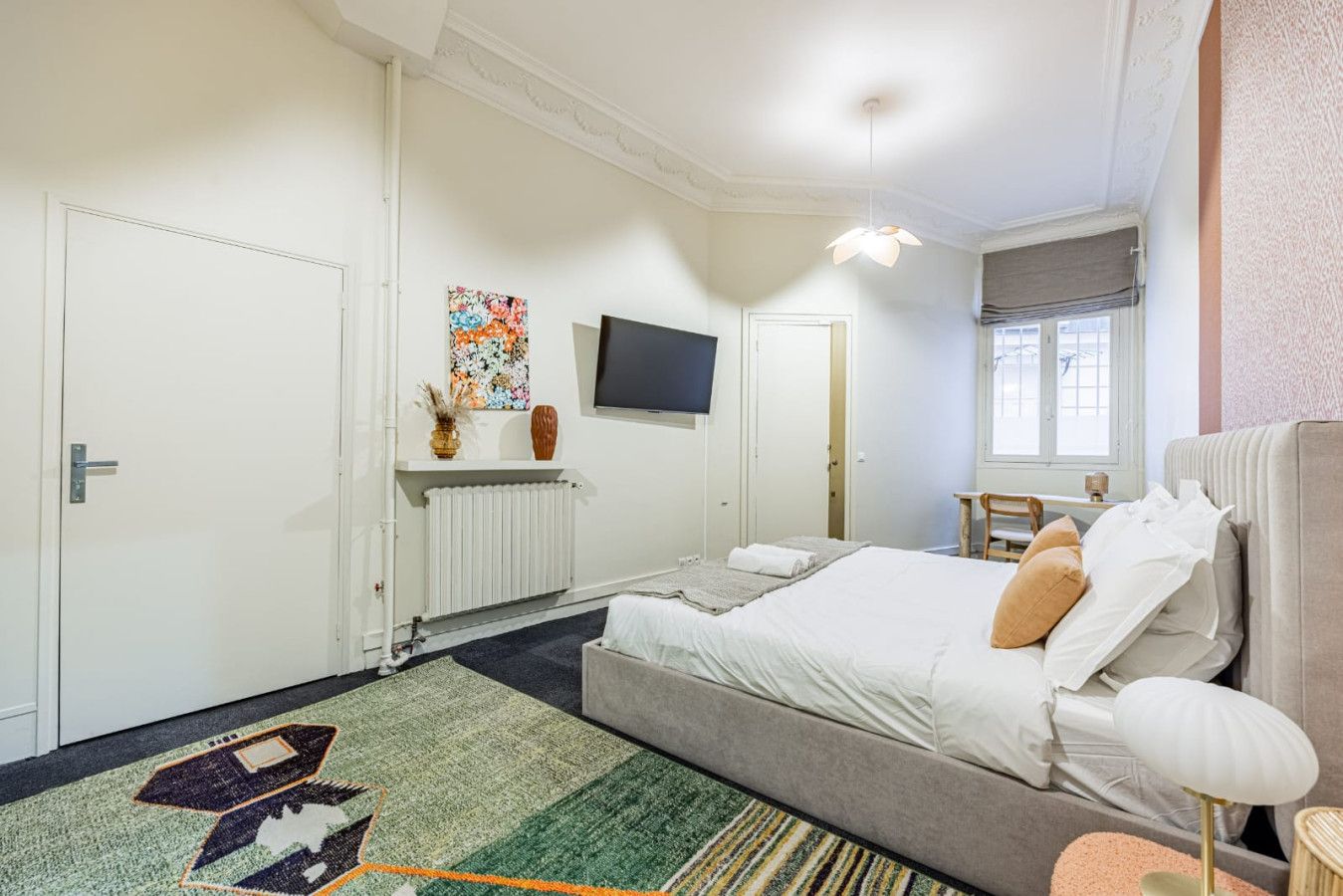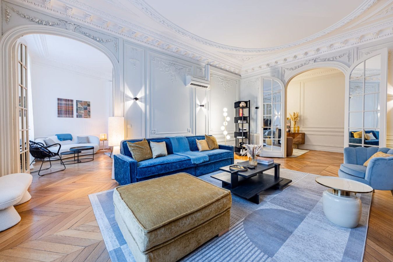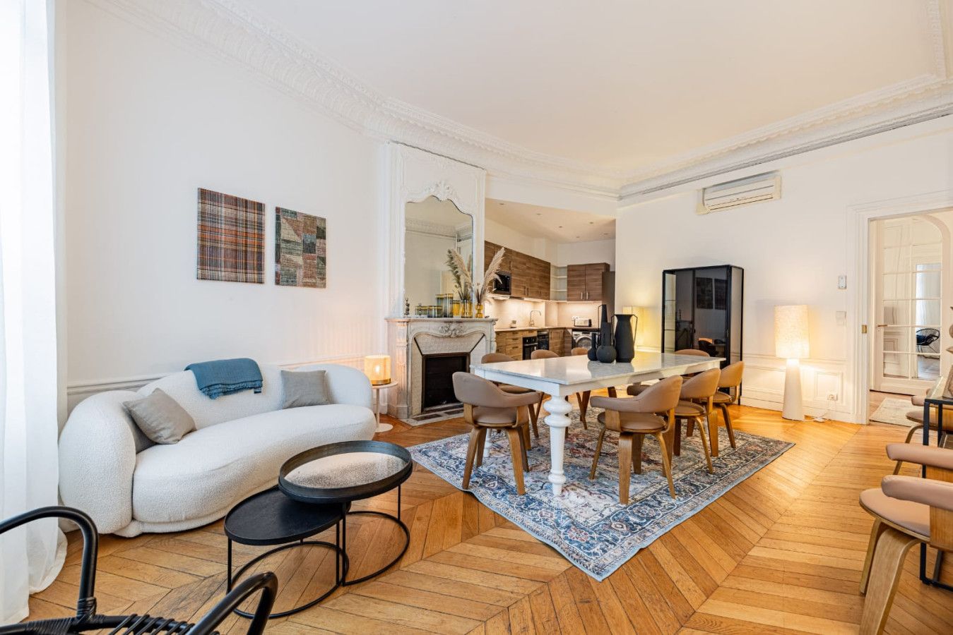 Step into classic Parisian grandeur in this beautifully designed apartment in the 8th arrondissement. High ceilings, arched doorways and ornate mouldings set the scene, while chevron wooden floors add timeless elegance. The space is expansive, bright, and made for gathering. There's an abundance of room to relax, dine, and unwind in style. At full capacity, a bit of bathroom coordination may be needed, but with interiors this stunning, it hardly matters. Just moments from the city's most iconic sights, this is a dream Parisian stay. It's spacious, sophisticated, and full of charm.
