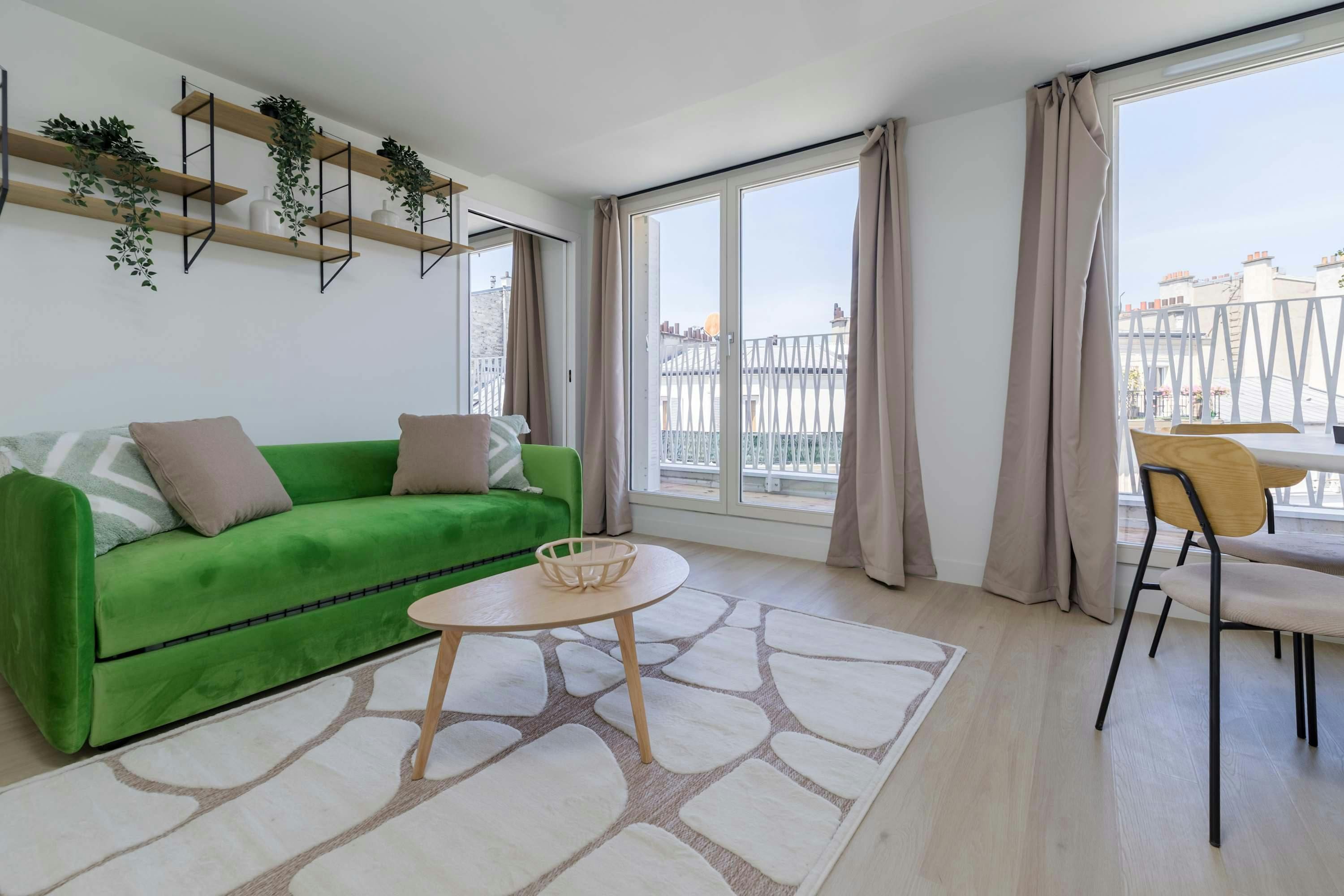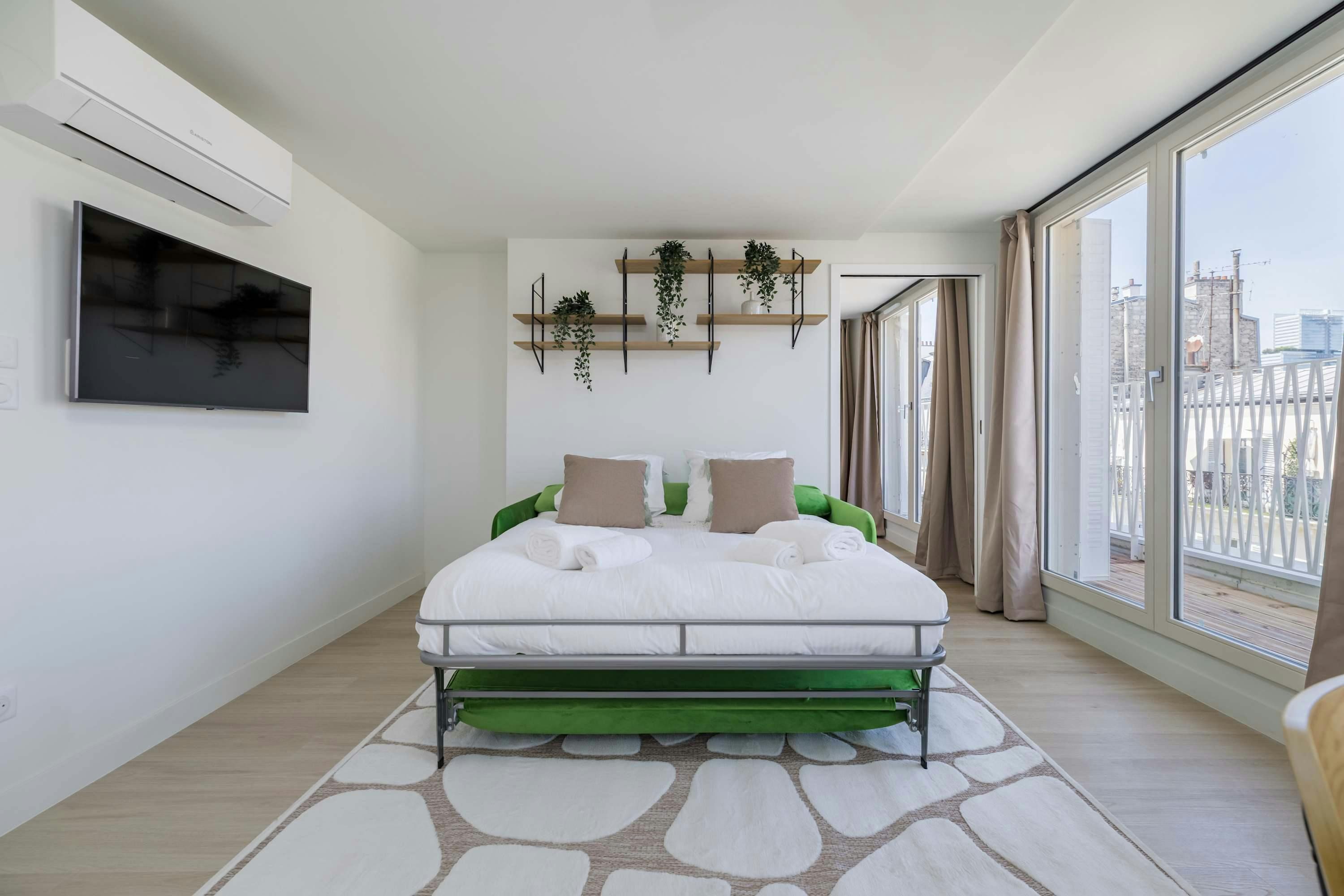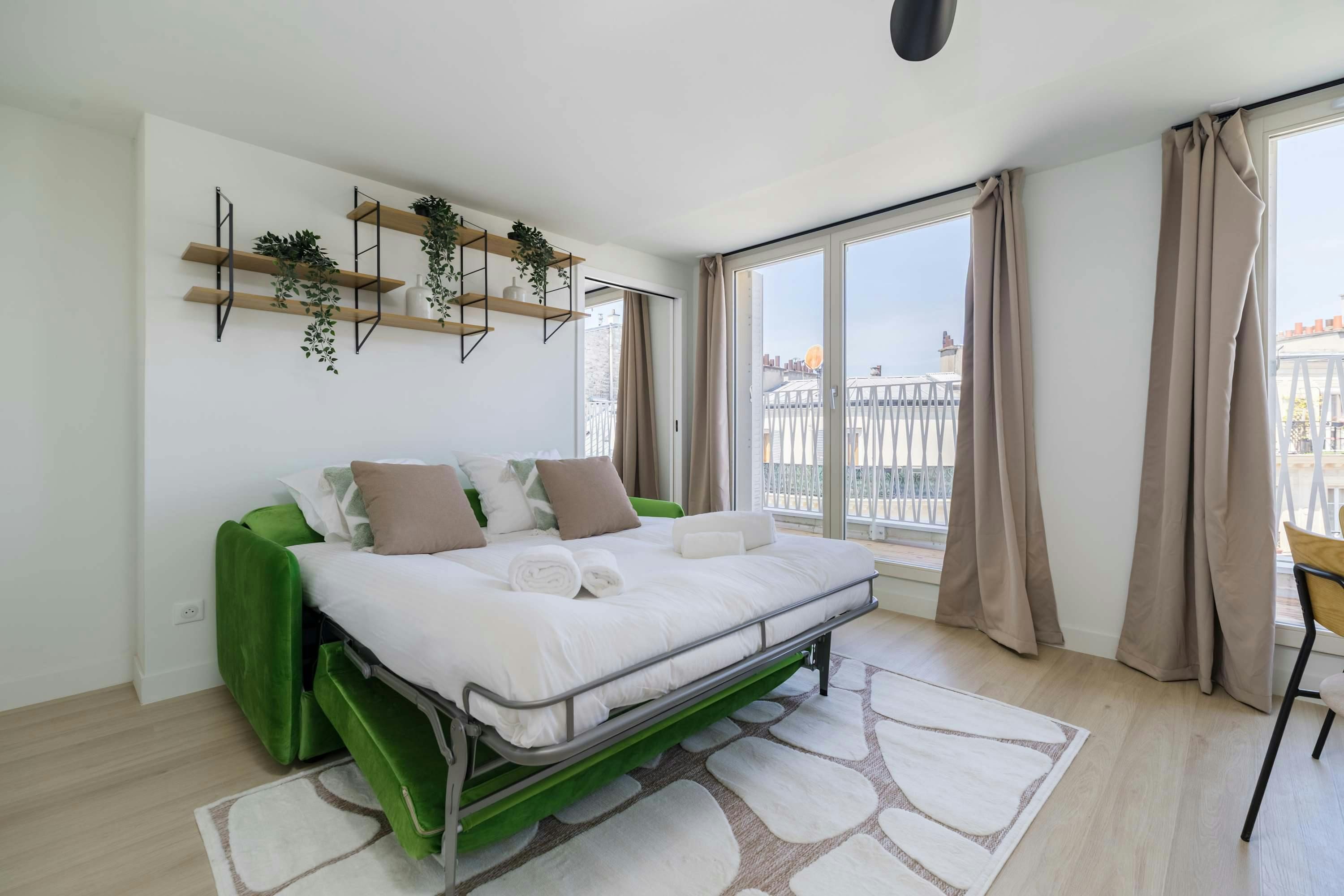 If you like being surrounded by plenty of green spaces, then this apartment’s address is ideal. Montmartre can also be reached on foot or by the excellent public transport links nearby. There are a variety of restaurants in the neighbourhood too, featuring cuisine from around the world. We love the views from this home's narrow balcony of the street’s typically Parisian architecture. Inside, the open-plan living area is bright, and it also sleeps guests three and four on a sofa bed. This apartment offers a comfortable and convenient base for your stay.