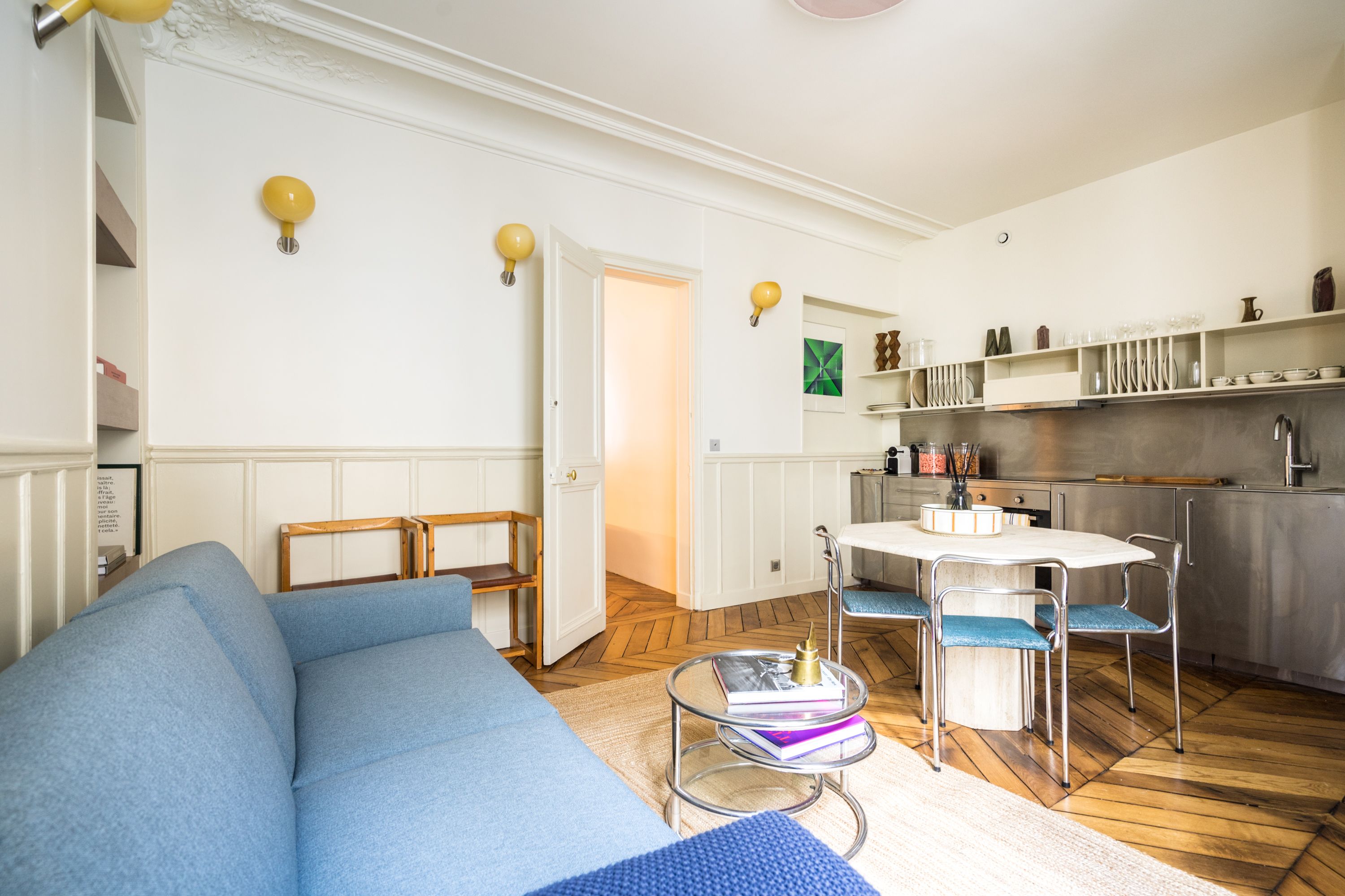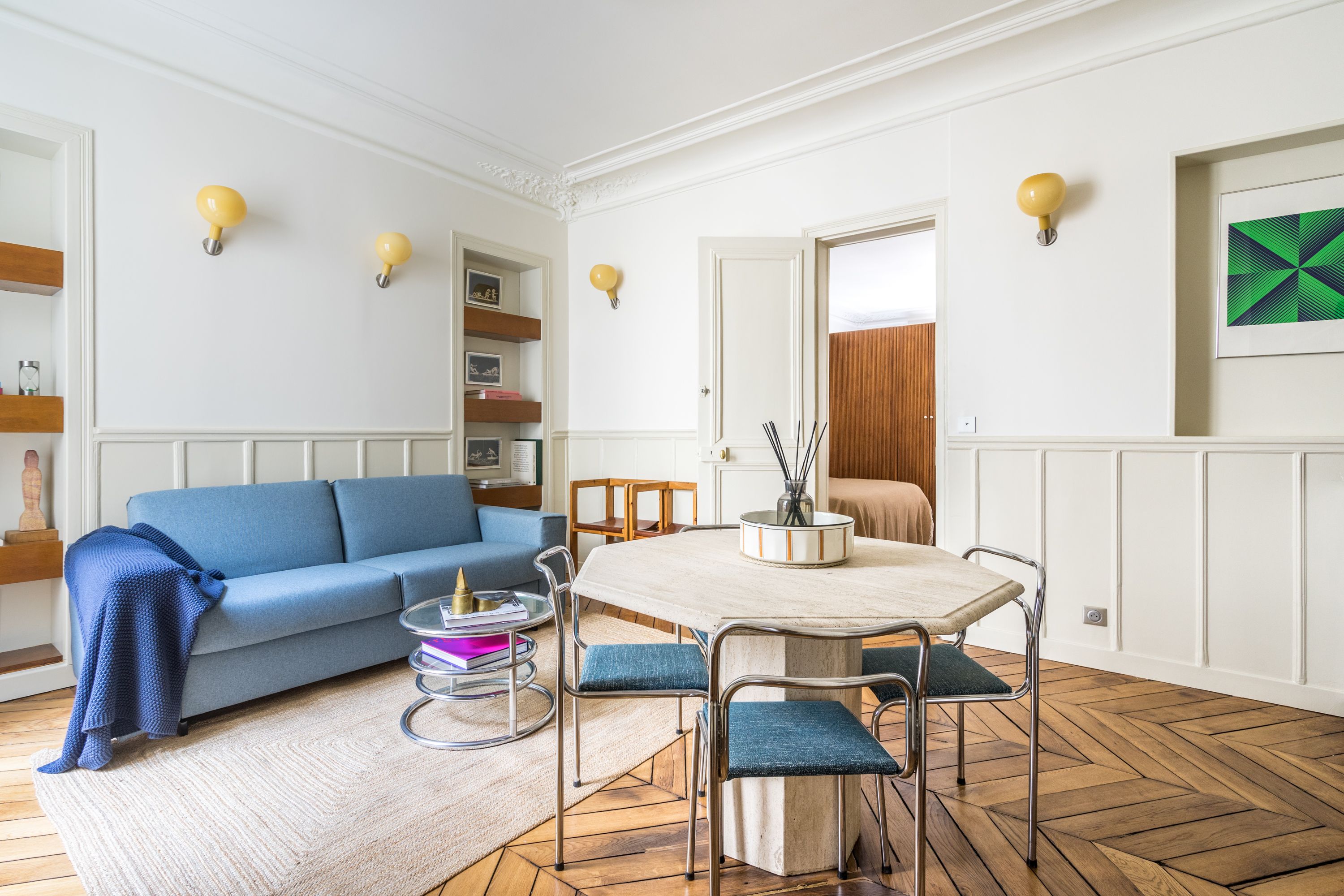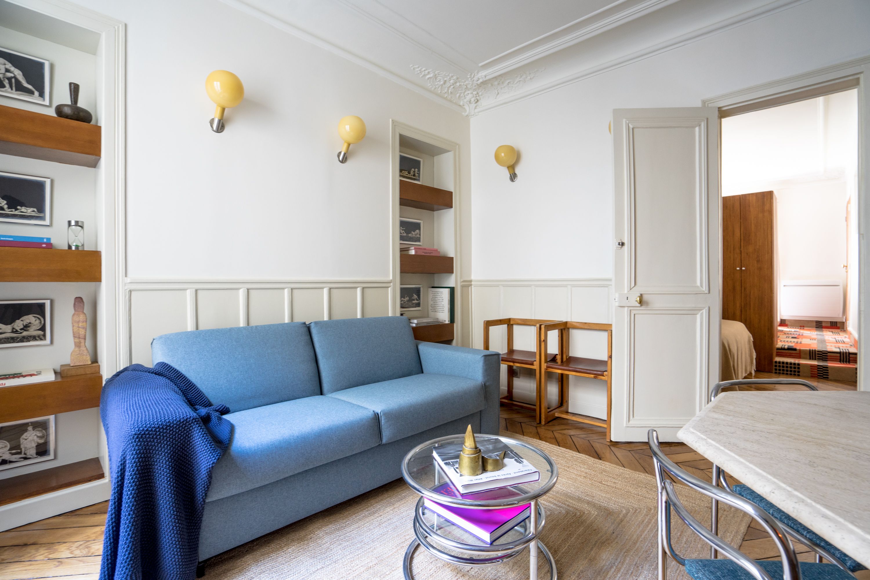 Experience classic Parisian style in this central apartment, designed by a renowned architect. Located within an historic Haussmann building, this home has been thoughtfully designed to blend original features with modern comfort. A carefully curated art and book collection adds character to this simple, comfortable home. A room divider adds privacy for the four guests sharing the bedroom, though at full occupancy, the fifth guest will sleep on a sofa bed in the living space. You’ll benefit from easy transport links, a great location, and plenty of shops and eateries nearby.