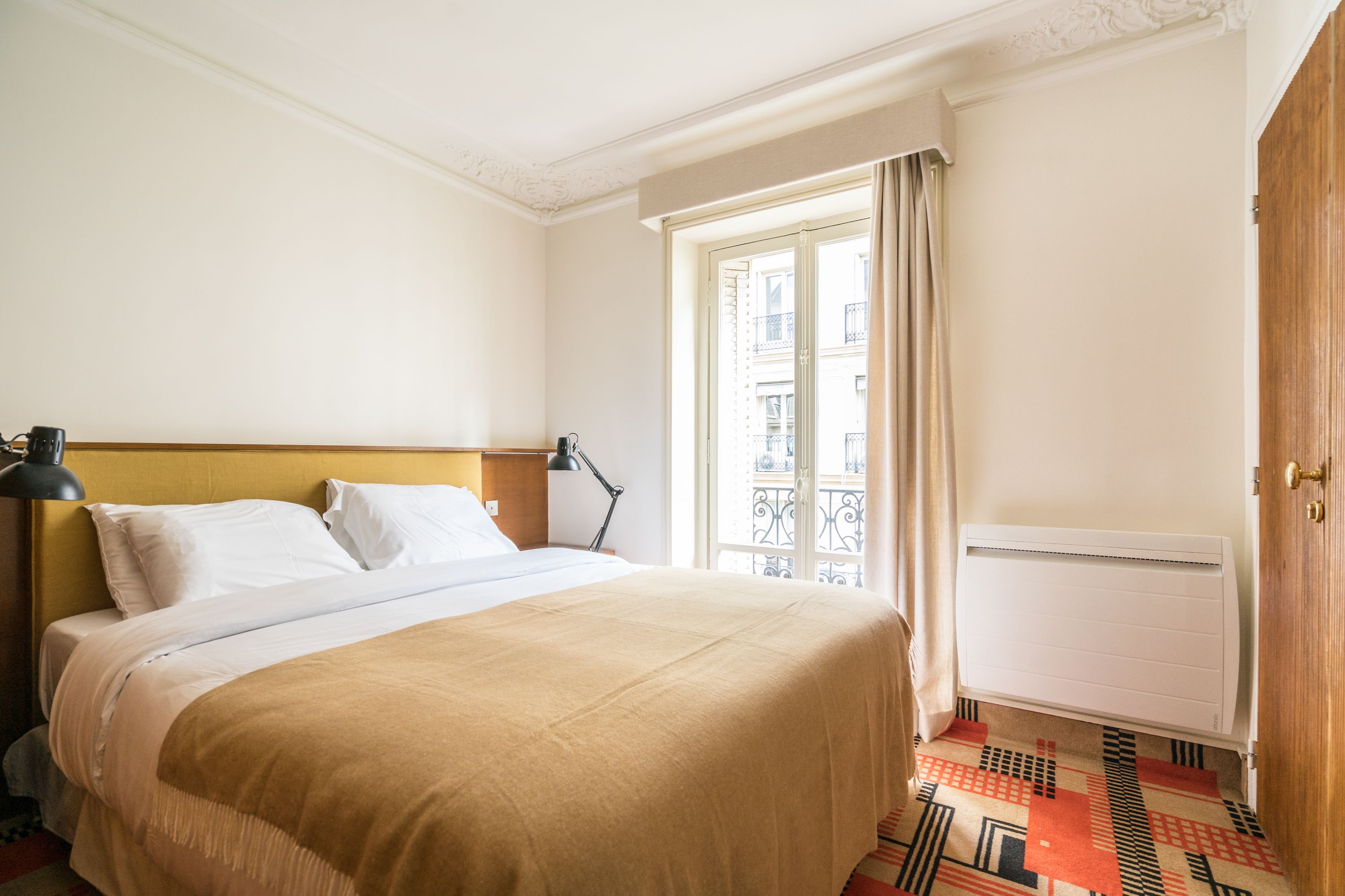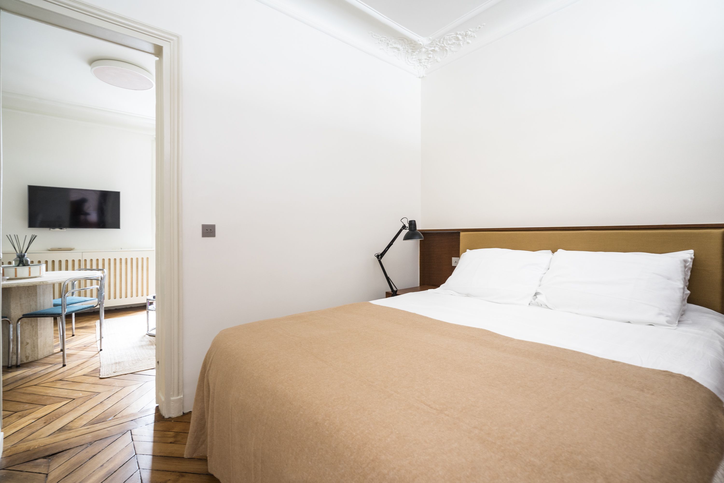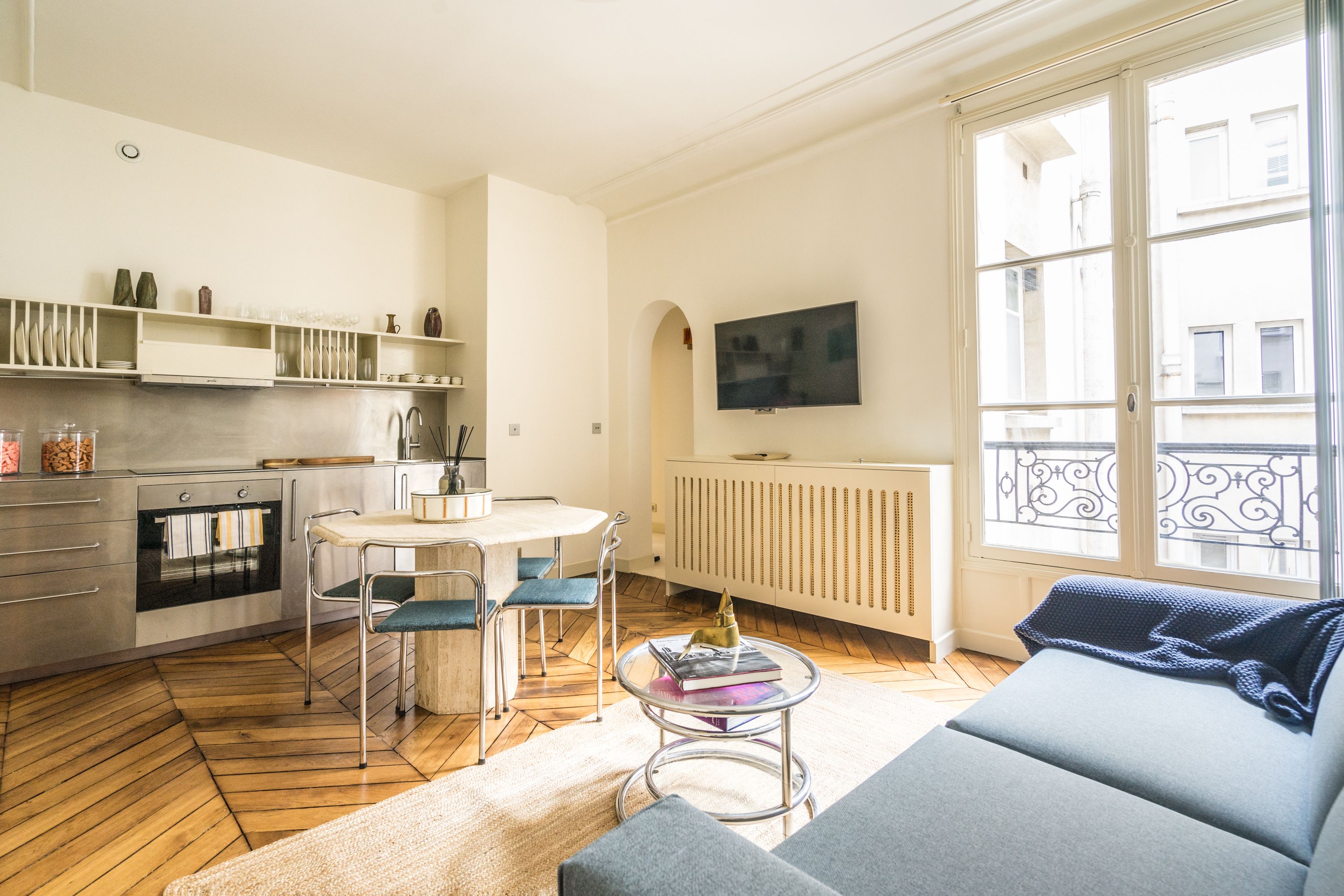 Experience classic Parisian style in this central apartment, designed by a renowned architect. Located within an historic Haussmann building, this home has been thoughtfully designed to blend original features with modern comfort. A carefully curated art and book collection adds character to this simple, comfortable home. A room divider adds privacy for the four guests sharing the bedroom, though at full occupancy, the fifth guest will sleep on a sofa bed in the living space. You’ll benefit from easy transport links, a great location, and plenty of shops and eateries nearby.