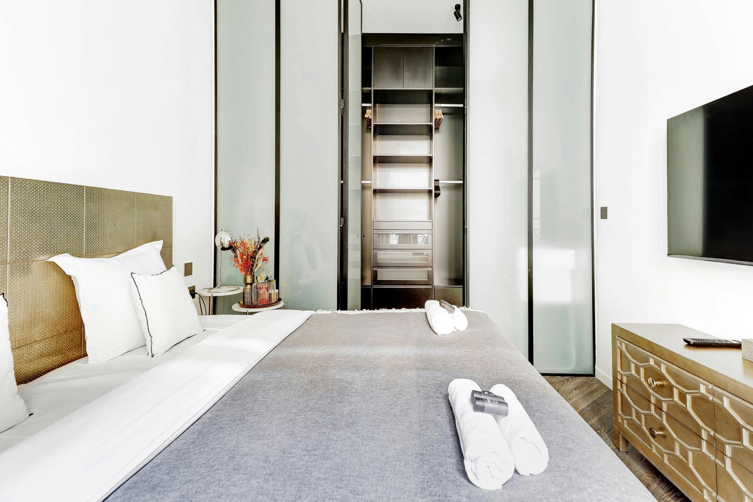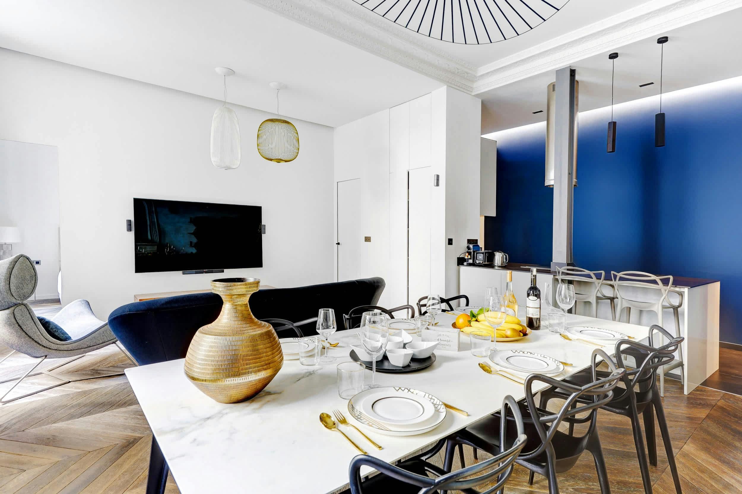 Set in a 19th-century Haussmannian building in the prestigious 16th arrondissement, this elegant apartment blends historic charm with modern design. Soaring ceilings, tall windows and ornate details give the space a light‑filled, effortlessly chic feel. What could be more Parisian? The living room is perfect for unwinding, while the kitchen is fully equipped for whipping up some locally-inspired cuisine. At full capacity, two guests will sleep on the sofa bed in the living room, which makes things a little cosy. But with the Champs‑Élysées, Arc de Triomphe and Trocadéro all a short drive or stroll away, the location makes every moment here unforgettable.