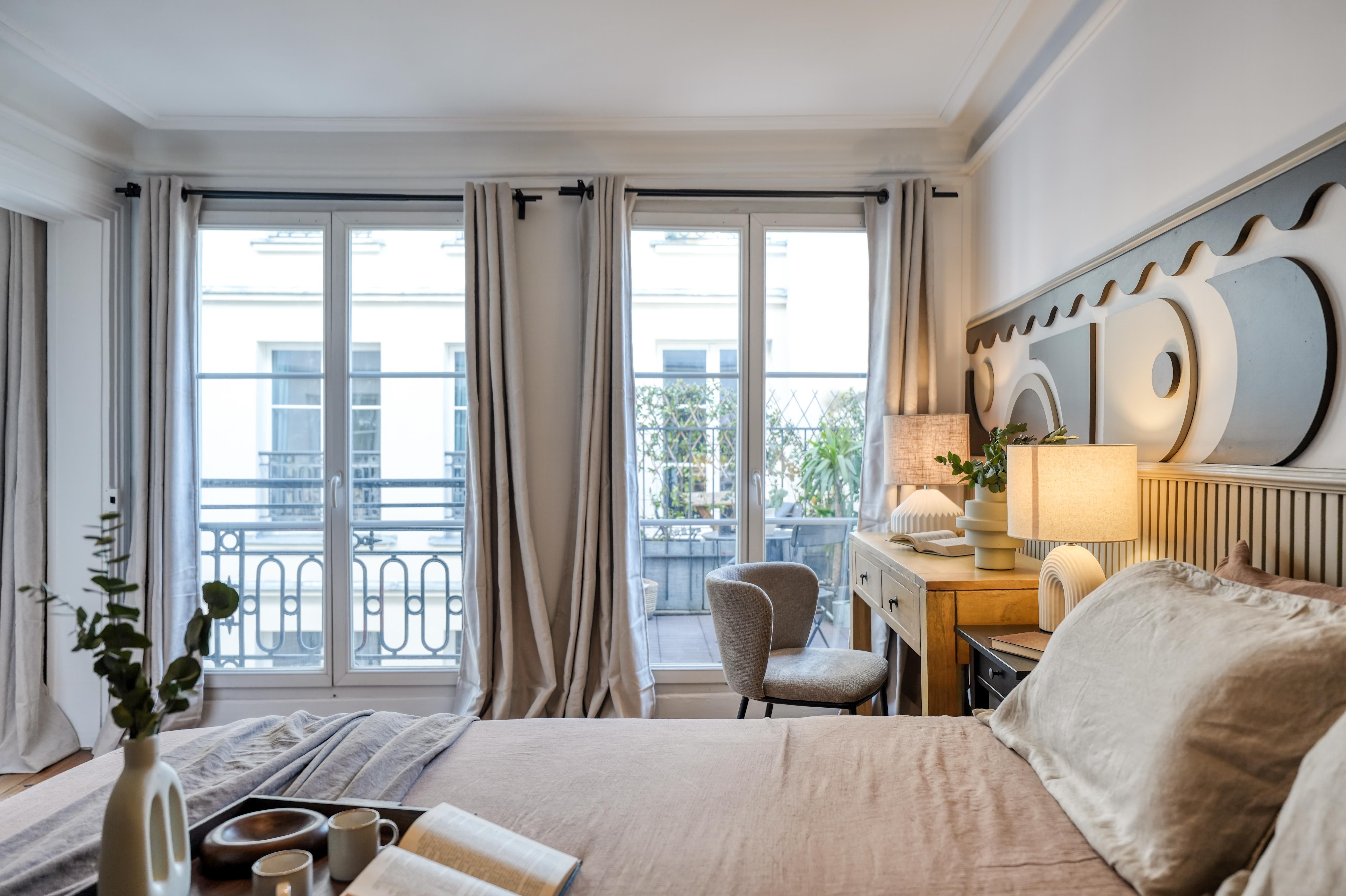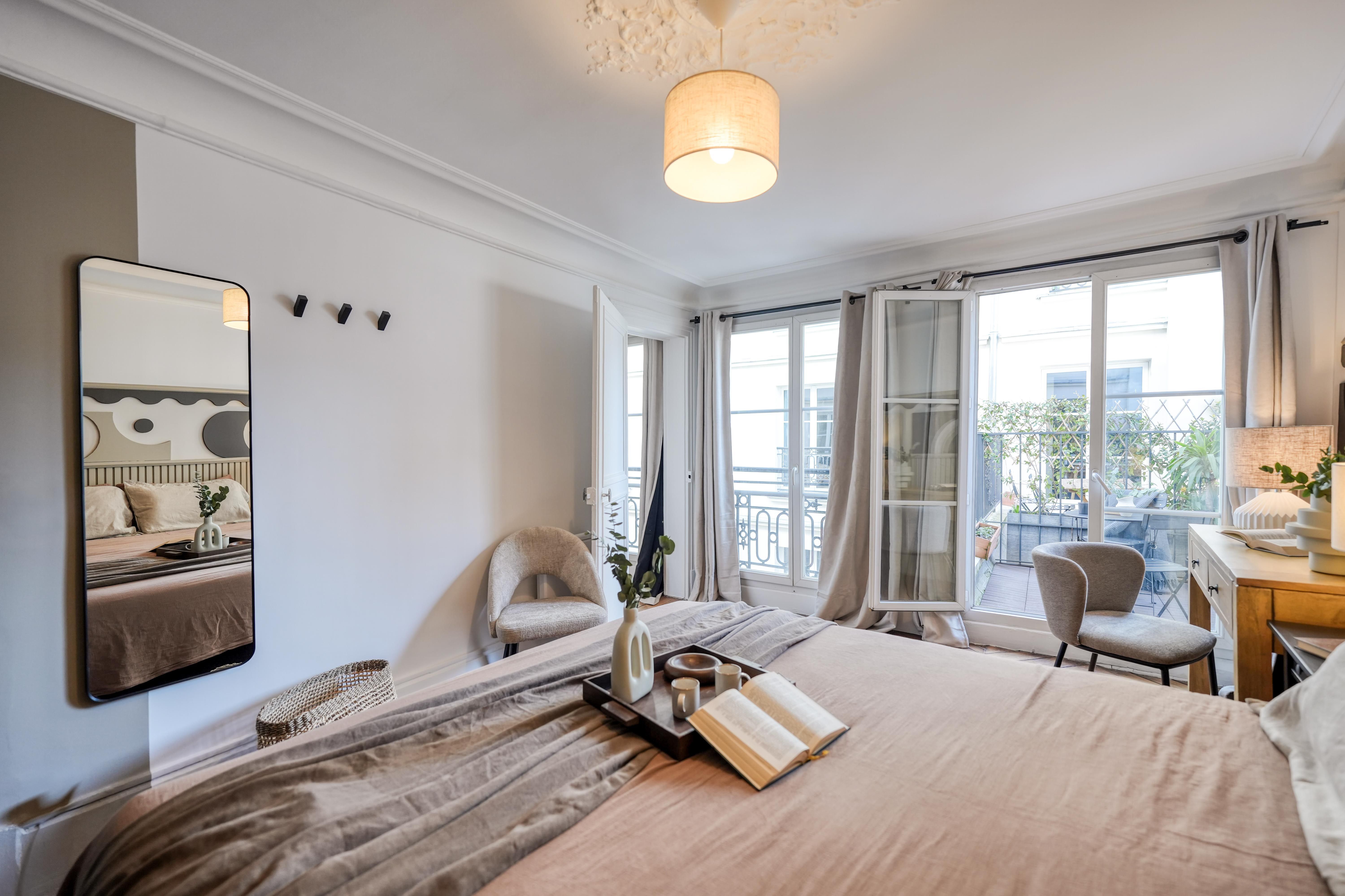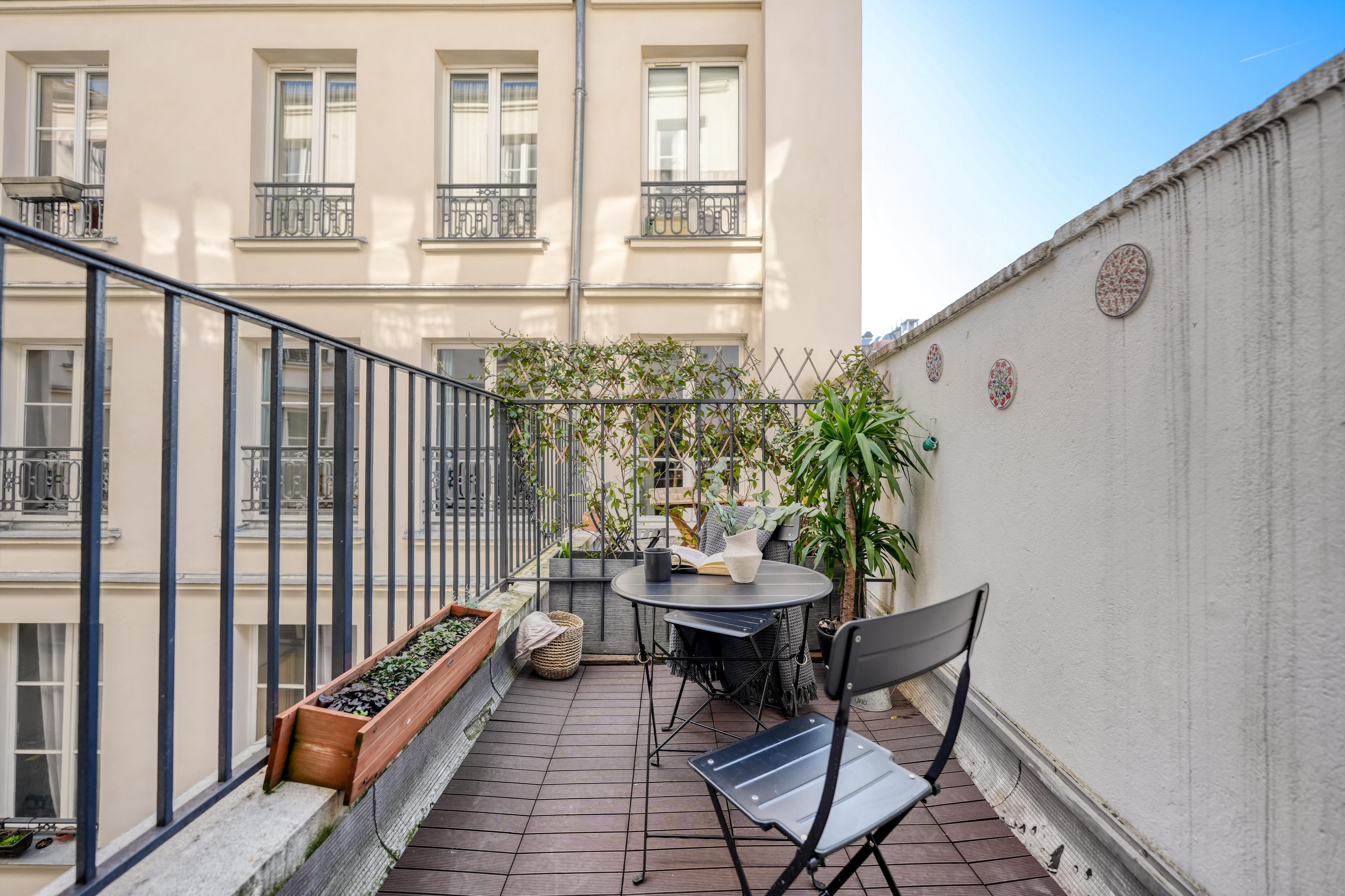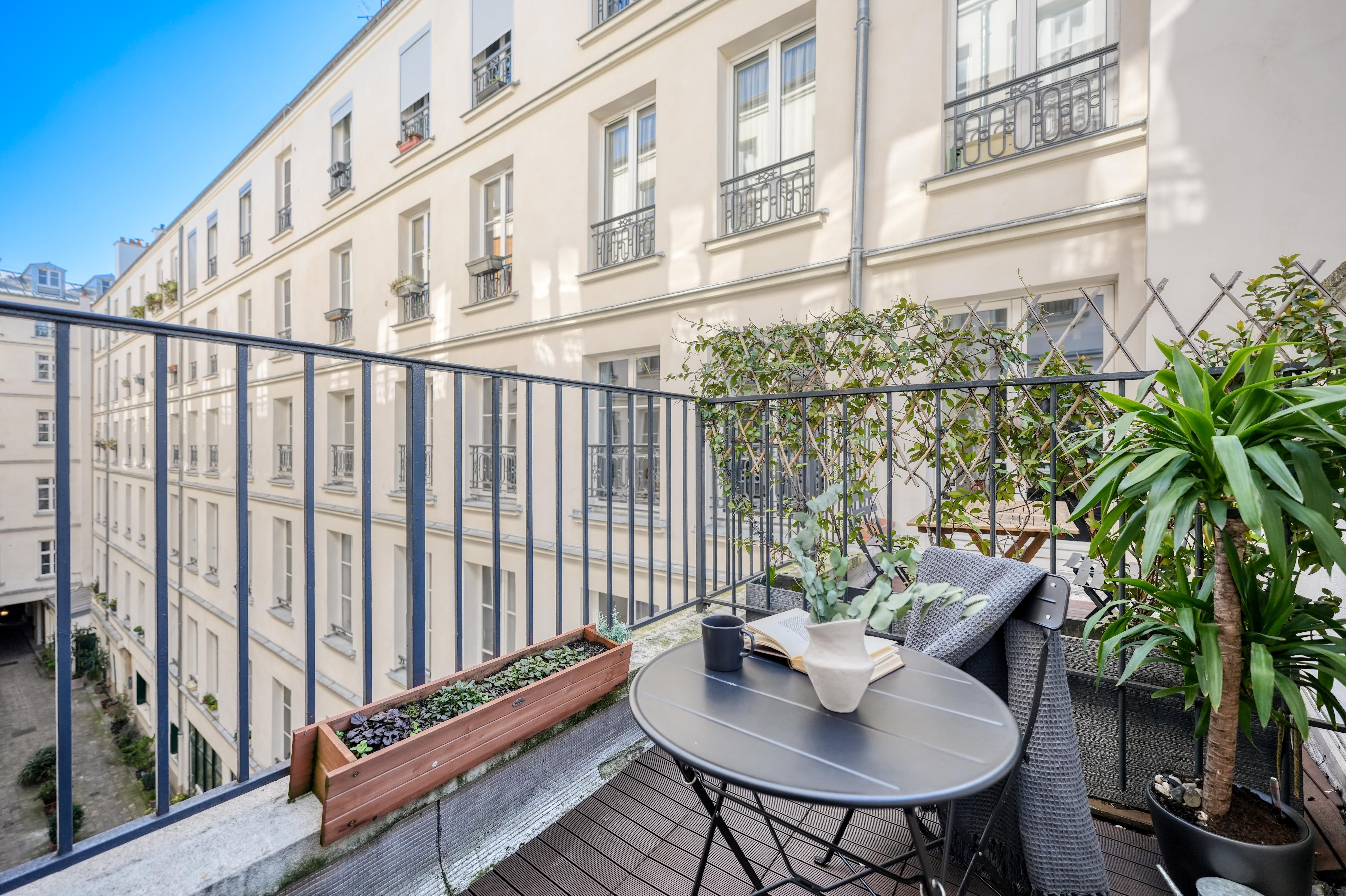 Stylish, sophisticated, and set in the heart of Paris – what's not to love about this apartment? You'll find it in Grands Boulevards, a stone's throw from shops, restaurants, and well-connected transport links. It's the perfect size for two people, though a third guest could squeeze in on the sofa bed. There's a desk in the bedroom if you're planning to work from home, as well as a compact but practical kitchen where you can rustle up light bites. Topping it all off is the private balcony overlooking the building's Haussmannian architecture – perfect for a cup of coffee or a glass of wine as the sun goes down.