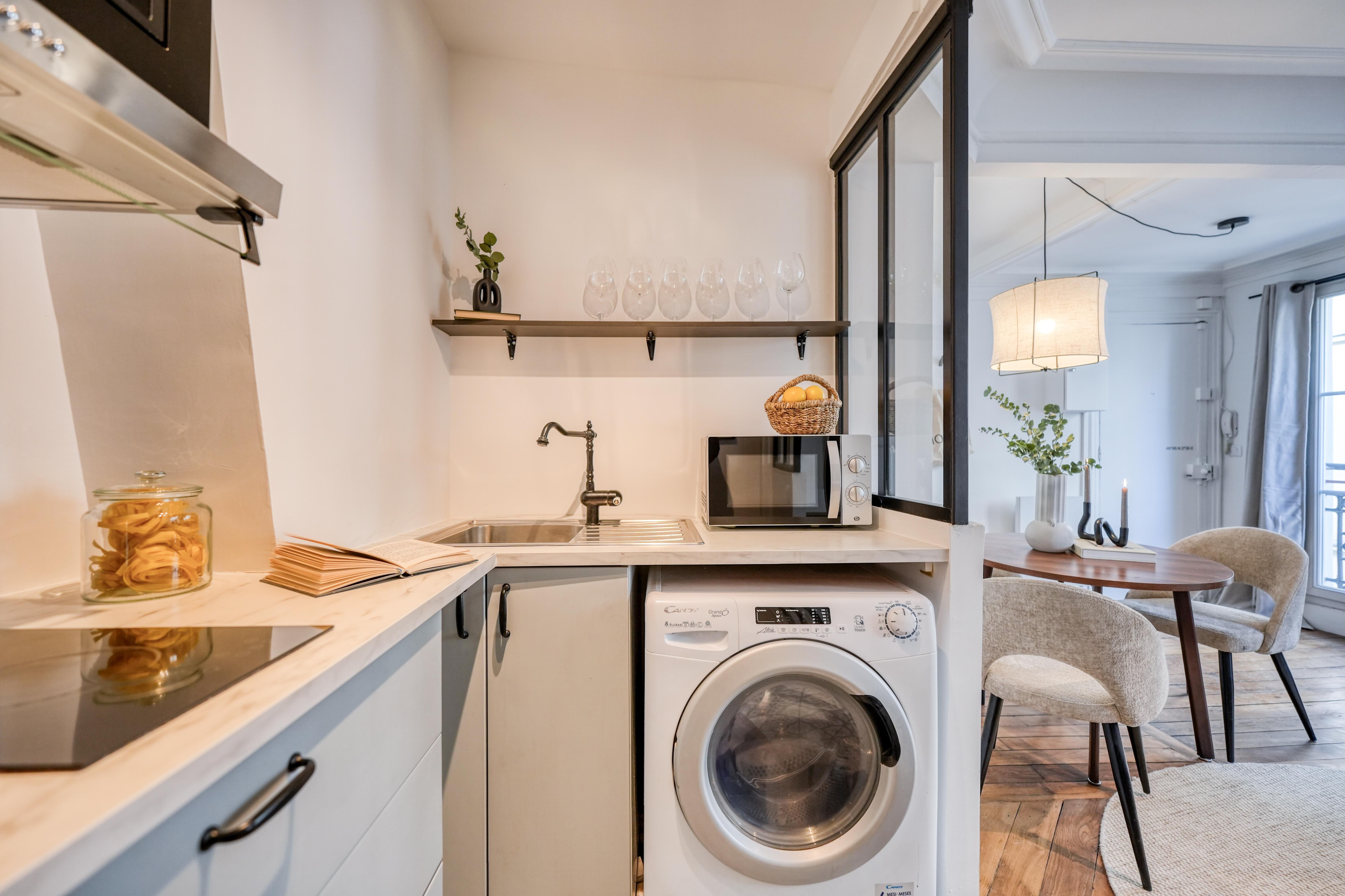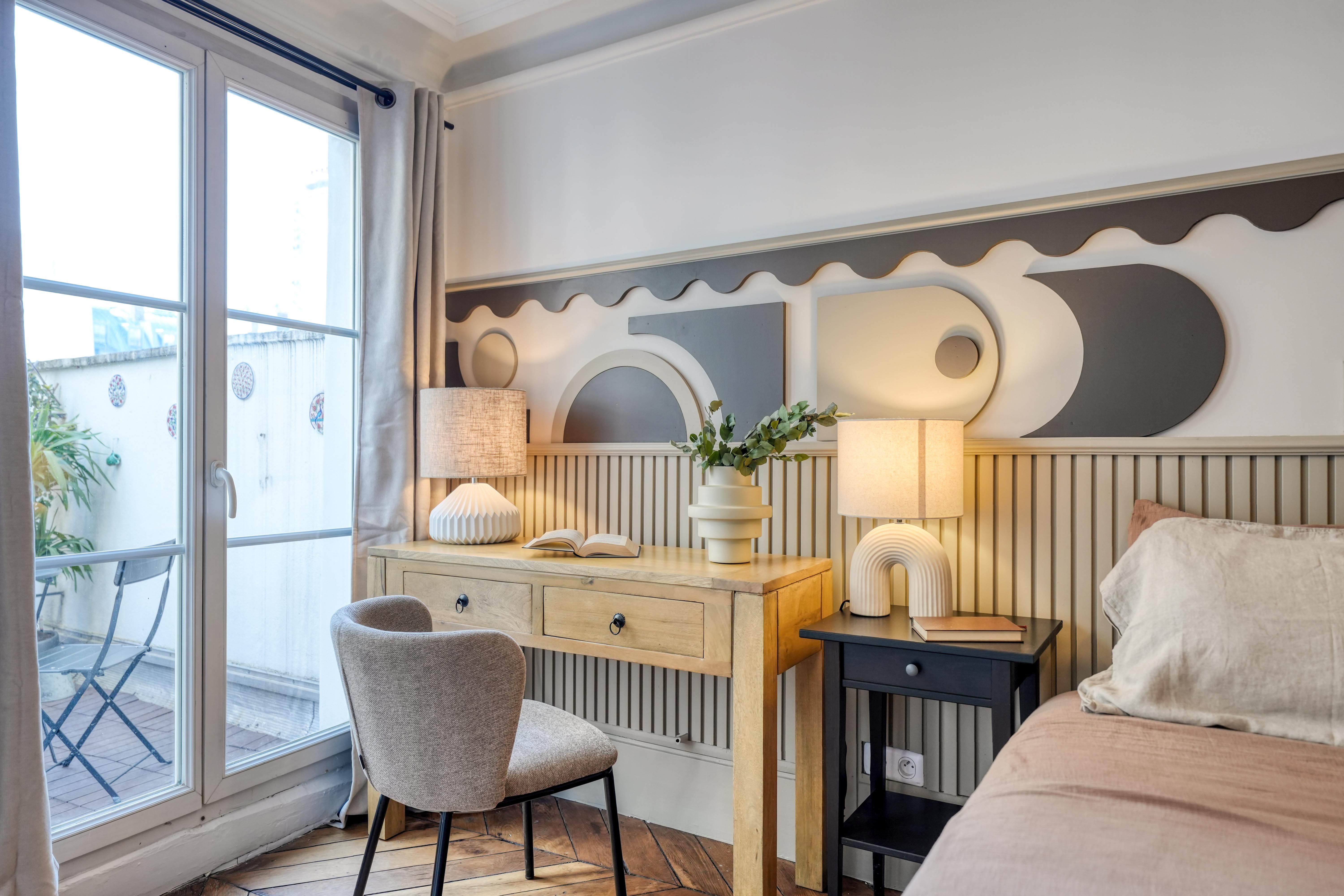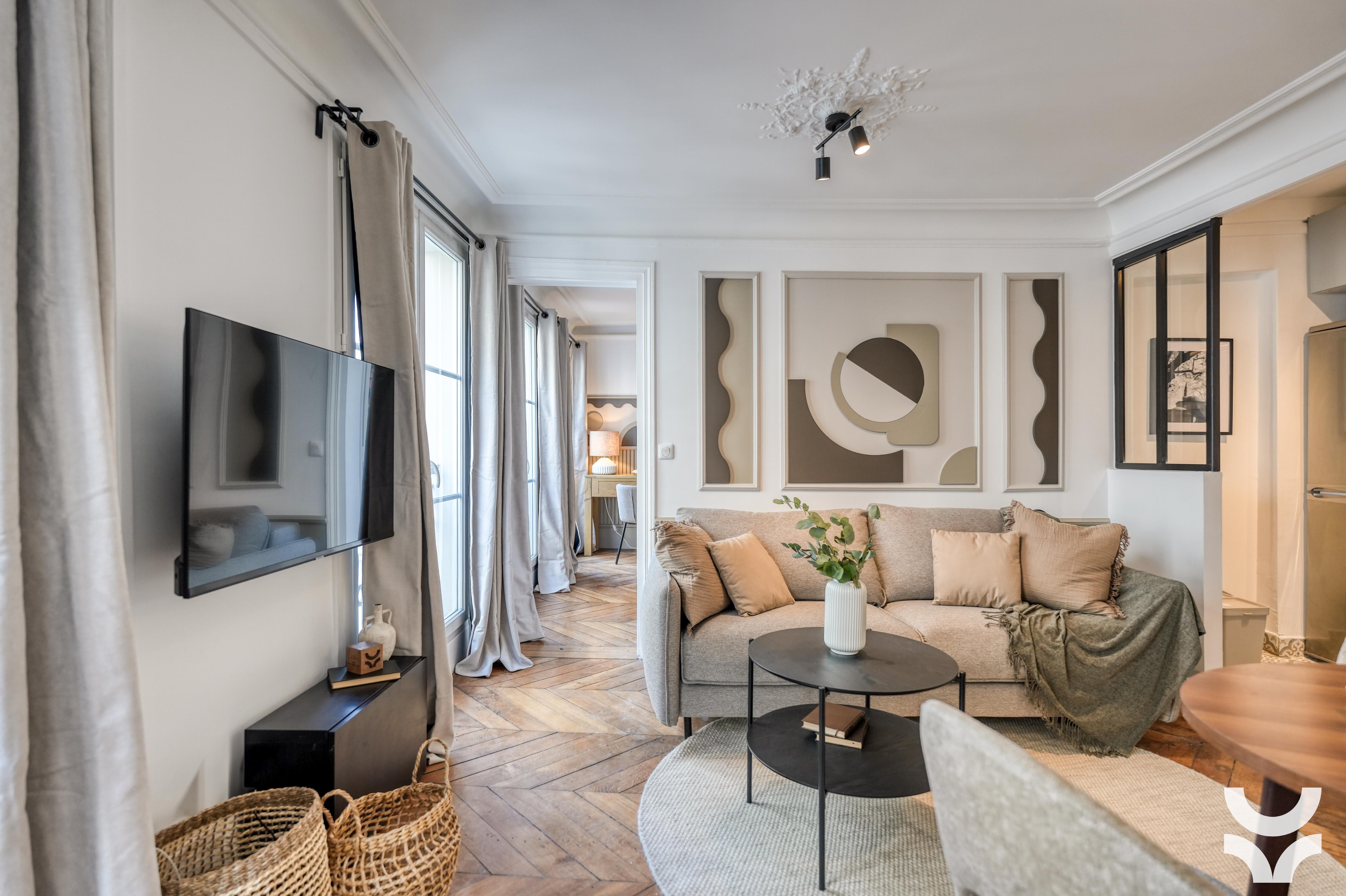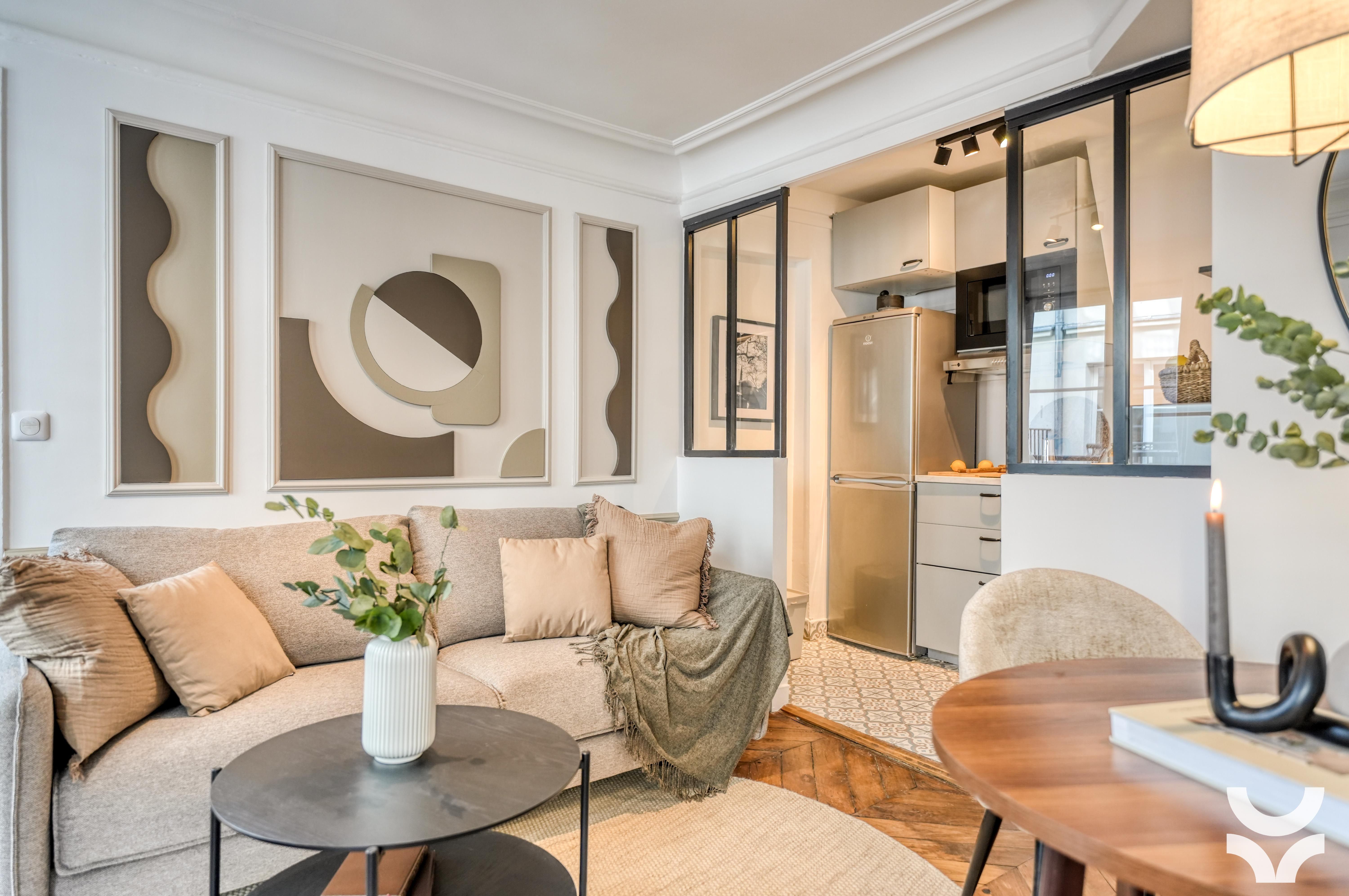 Stylish, sophisticated, and set in the heart of Paris – what's not to love about this apartment? You'll find it in Grands Boulevards, a stone's throw from shops, restaurants, and well-connected transport links. It's the perfect size for two people, though a third guest could squeeze in on the sofa bed. There's a desk in the bedroom if you're planning to work from home, as well as a compact but practical kitchen where you can rustle up light bites. Topping it all off is the private balcony overlooking the building's Haussmannian architecture – perfect for a cup of coffee or a glass of wine as the sun goes down.