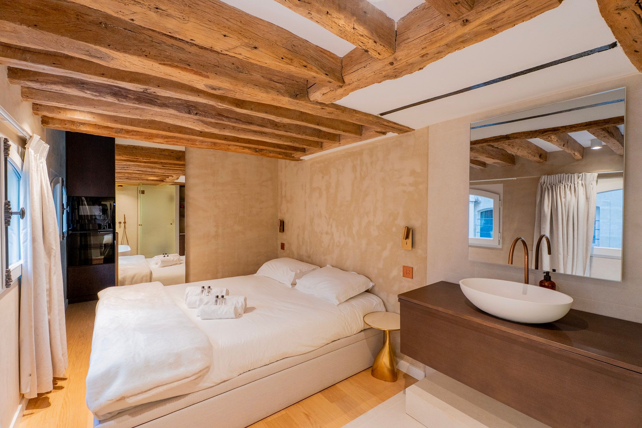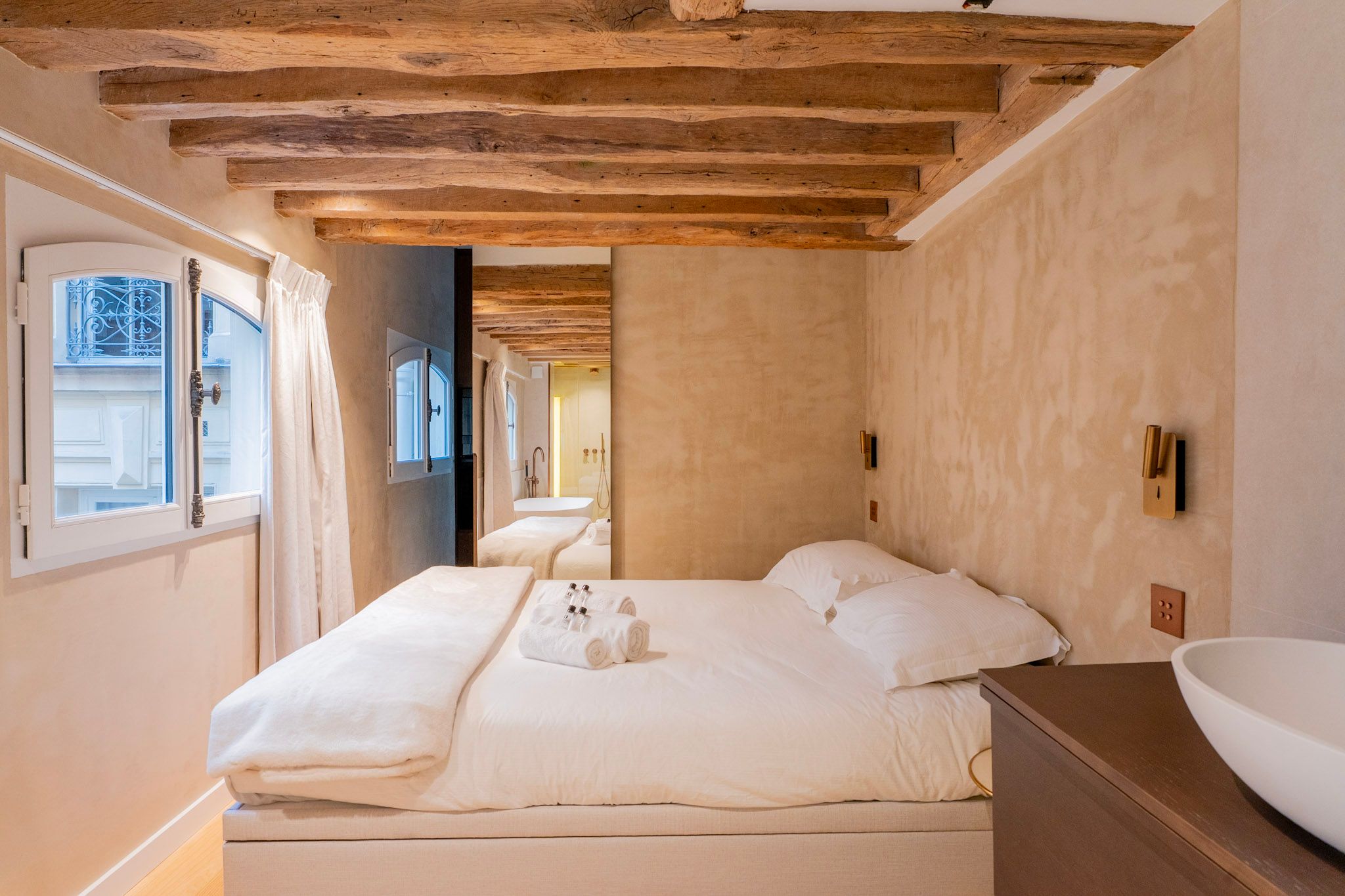 Set in the heart of Paris, a short stroll from the Palais Garnier and the Palais-Royal, this apartment is perfect for culture lovers. The Louvre Museum and the Tuileries Garden are both within easy walking distance, too. Housed in a majestic 18th-century Hôtel Particulier, the living space is filled with character – this room also sleeps guests three and four on a sofa bed. We love the main bedroom here with its freestanding bathtub as well. This is a great home in a truly fantastic location.