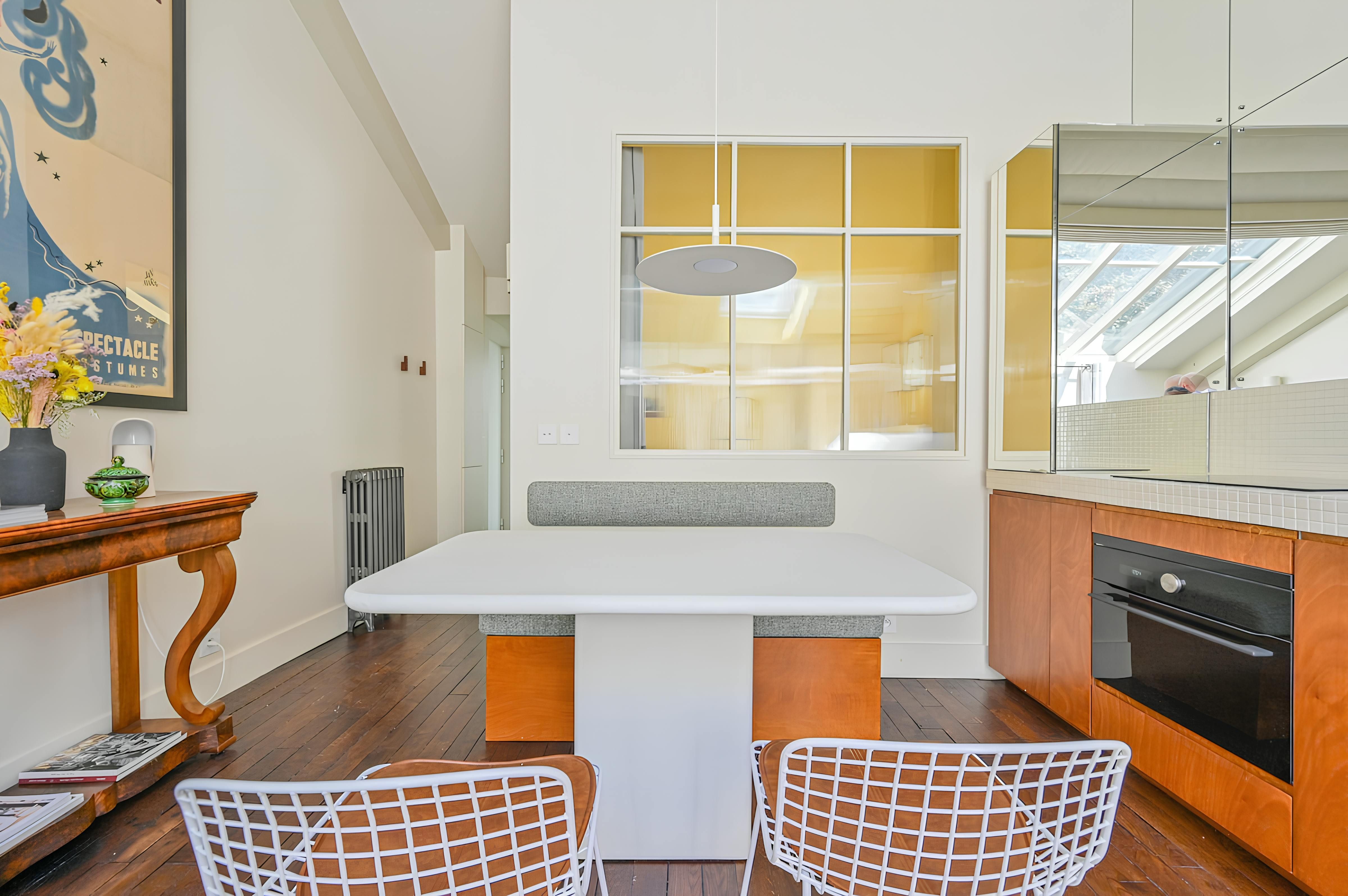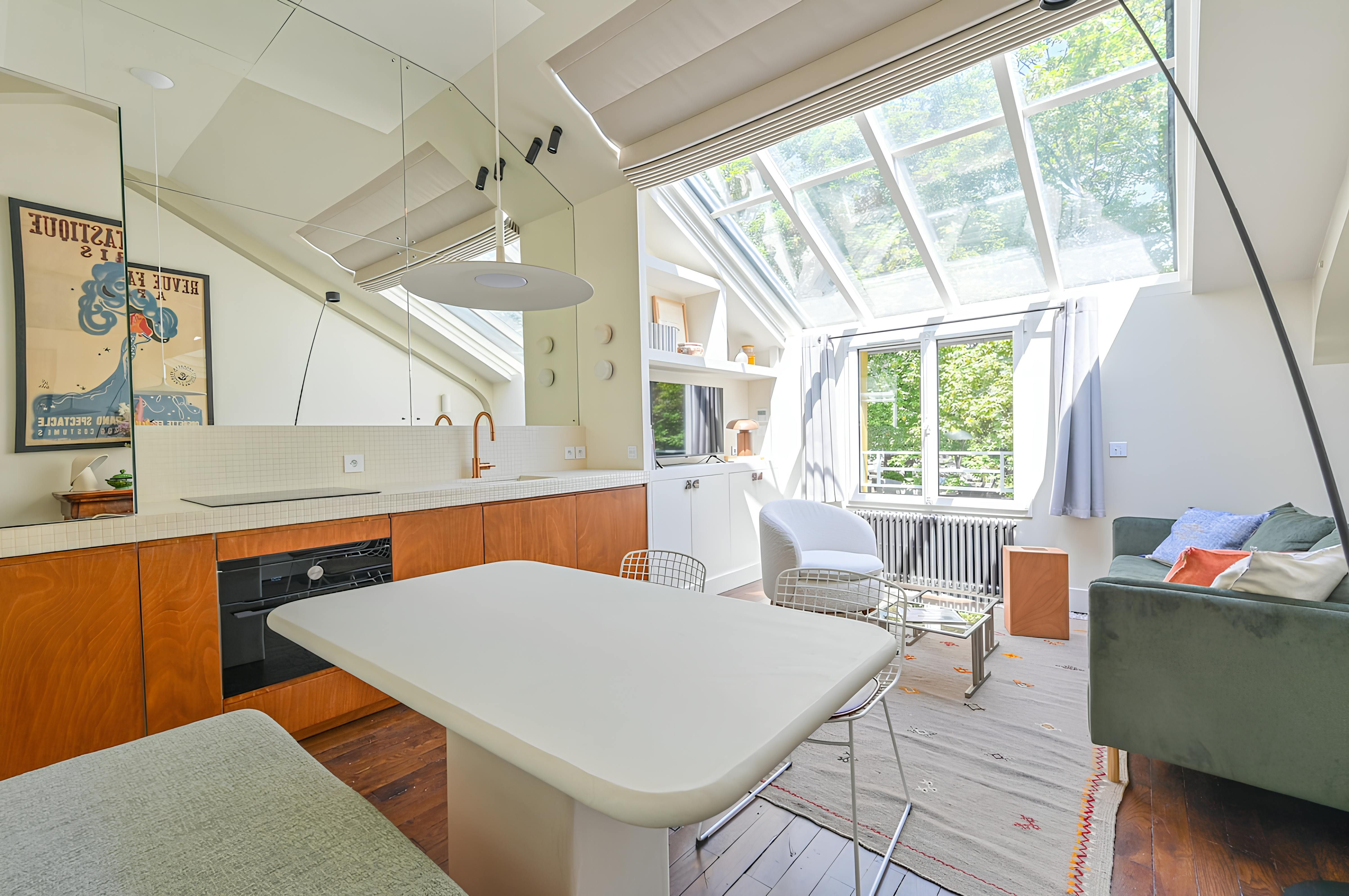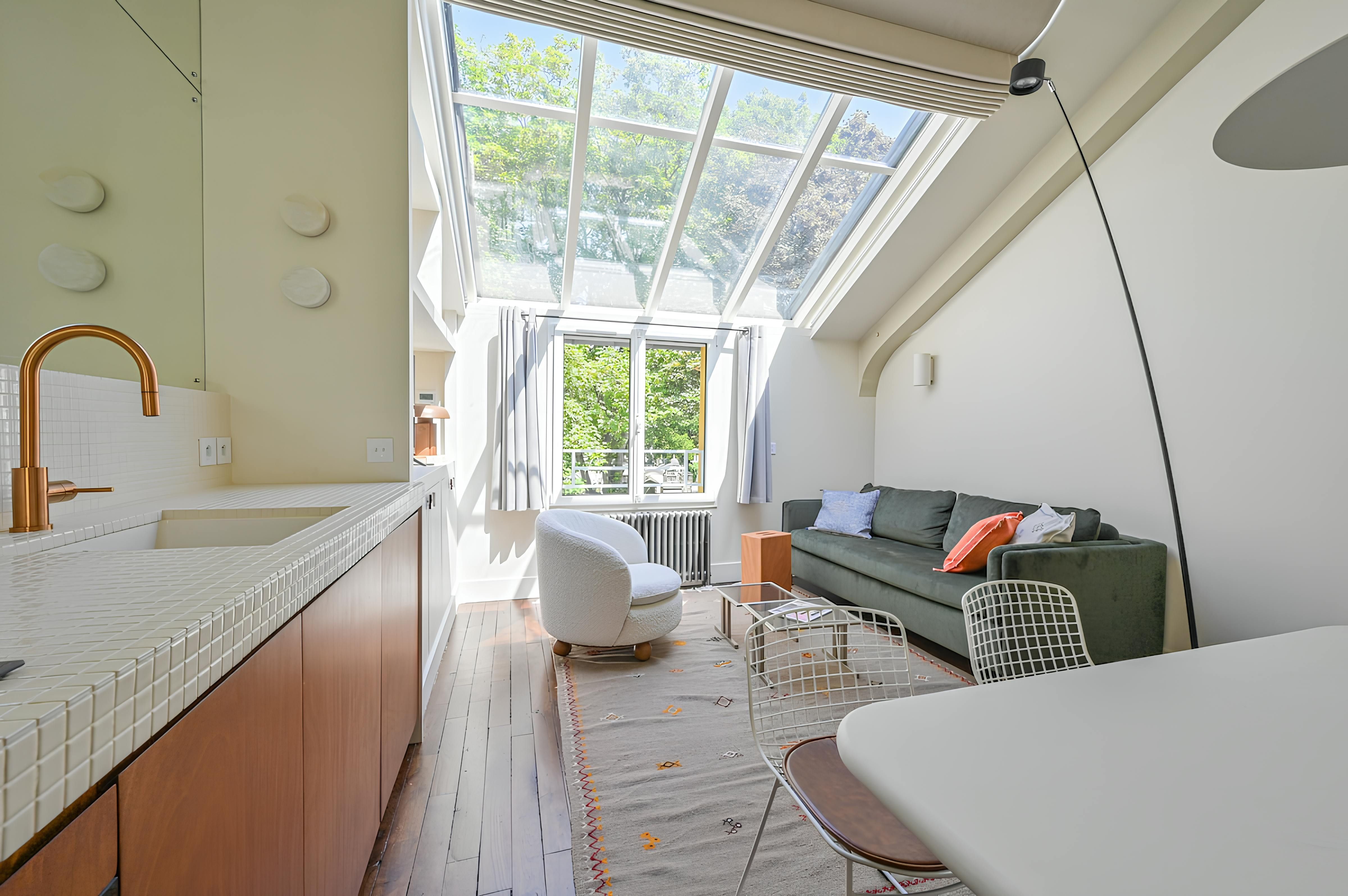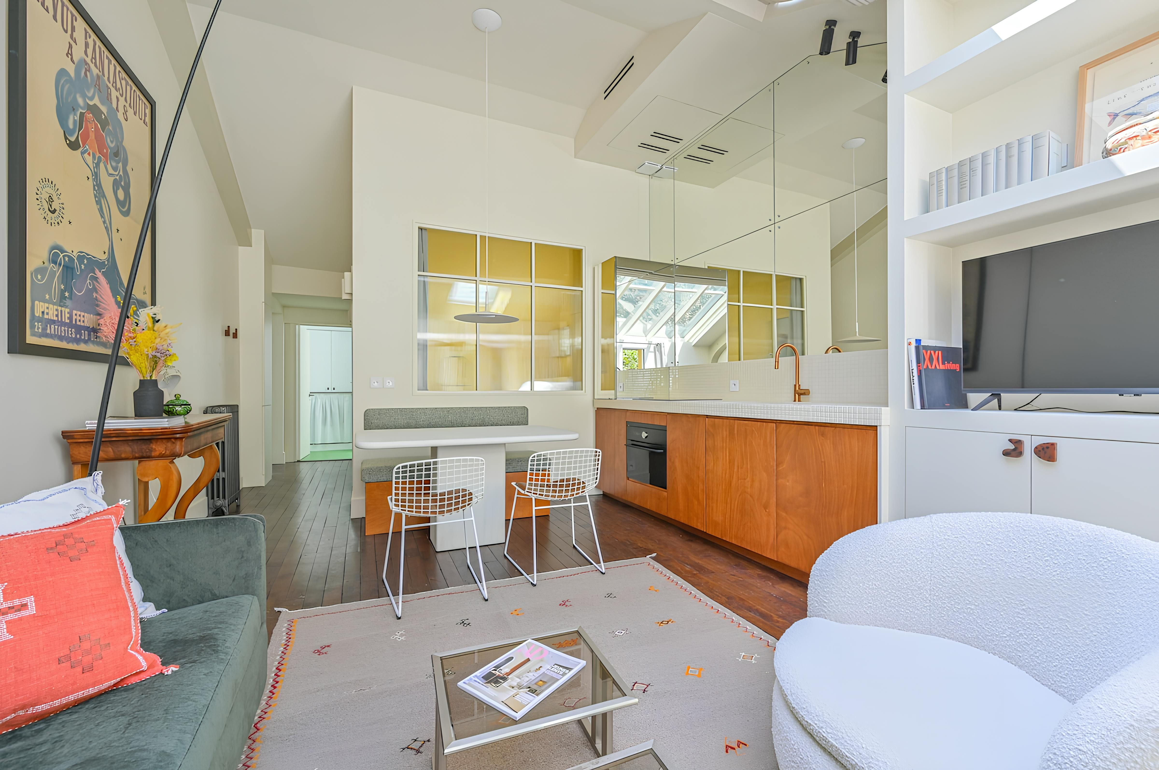 This petite apartment is full of light. It boasts a glass roof and windows that look out onto the greenery of Cimitière de Montmartre, making it a tranquil home-from-home. The combination of glass and a mirrored panel makes the space seem bigger than it is, too – though it’s worth pointing out that there’s only one bedroom so at full occupancy, two guests will sleep on the sofa bed in the living room. You’ll be positioned between the Moulin Rouge and Place de Clichy, tucked away in a quiet tree-filled courtyard.