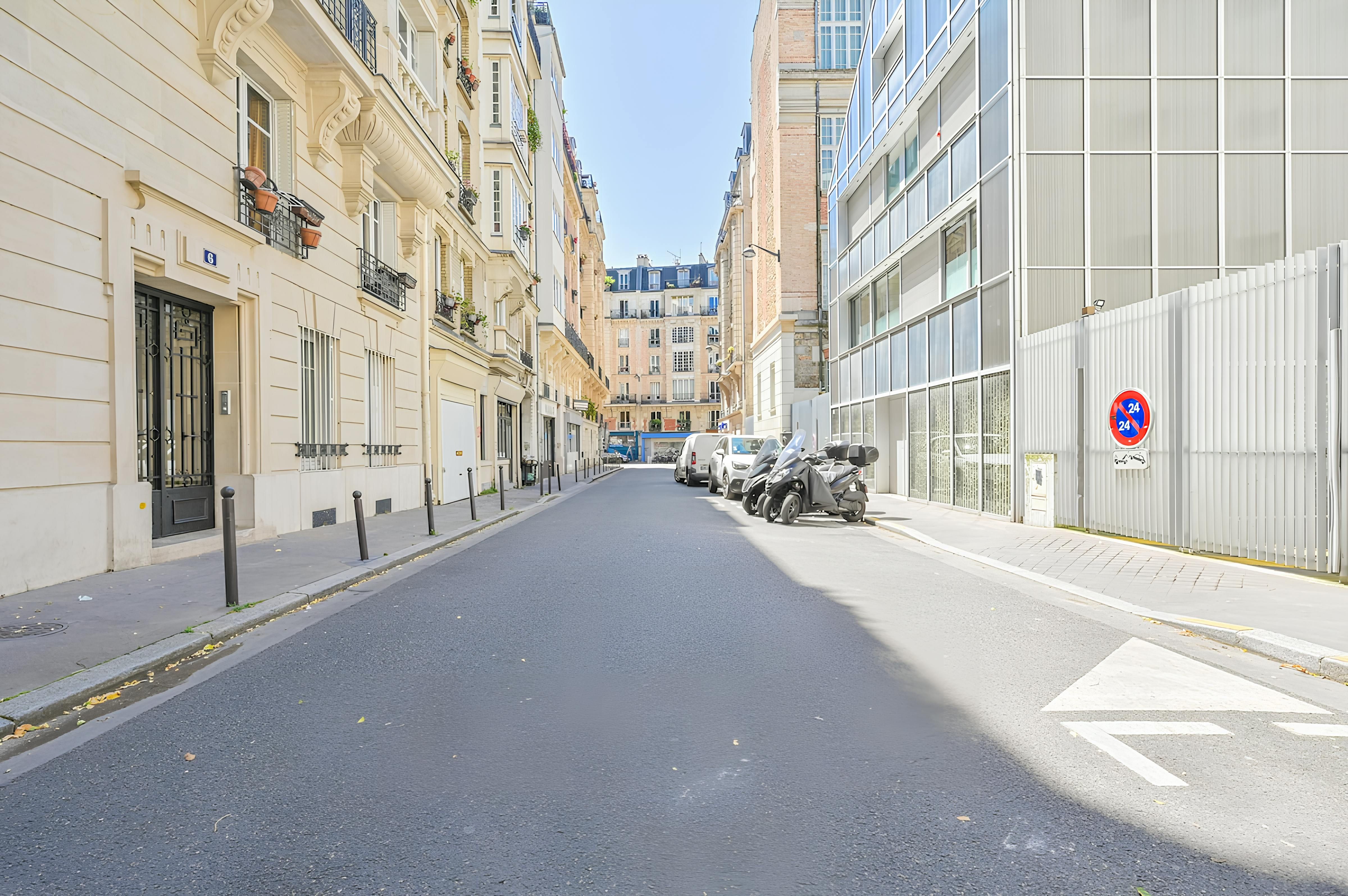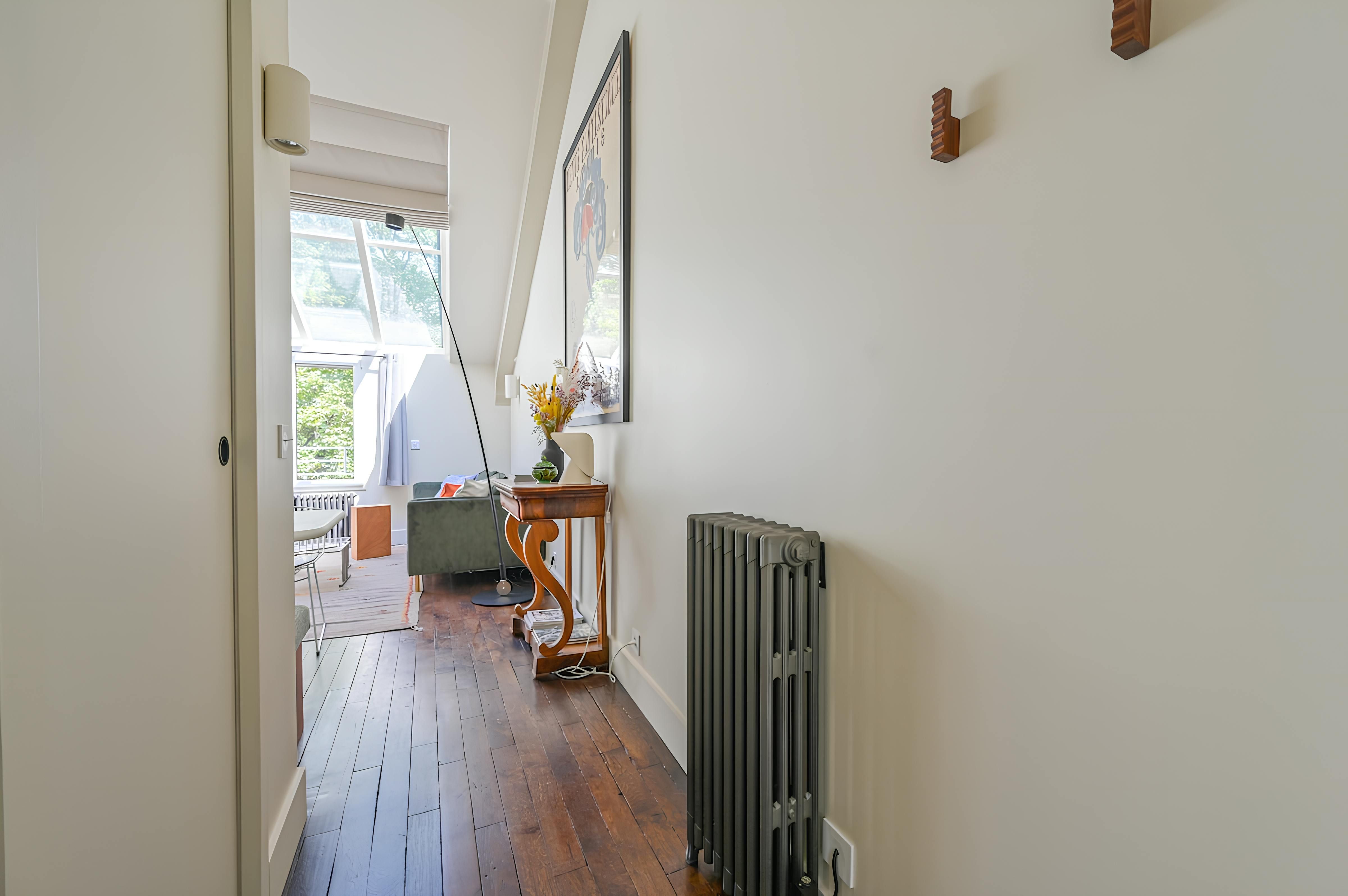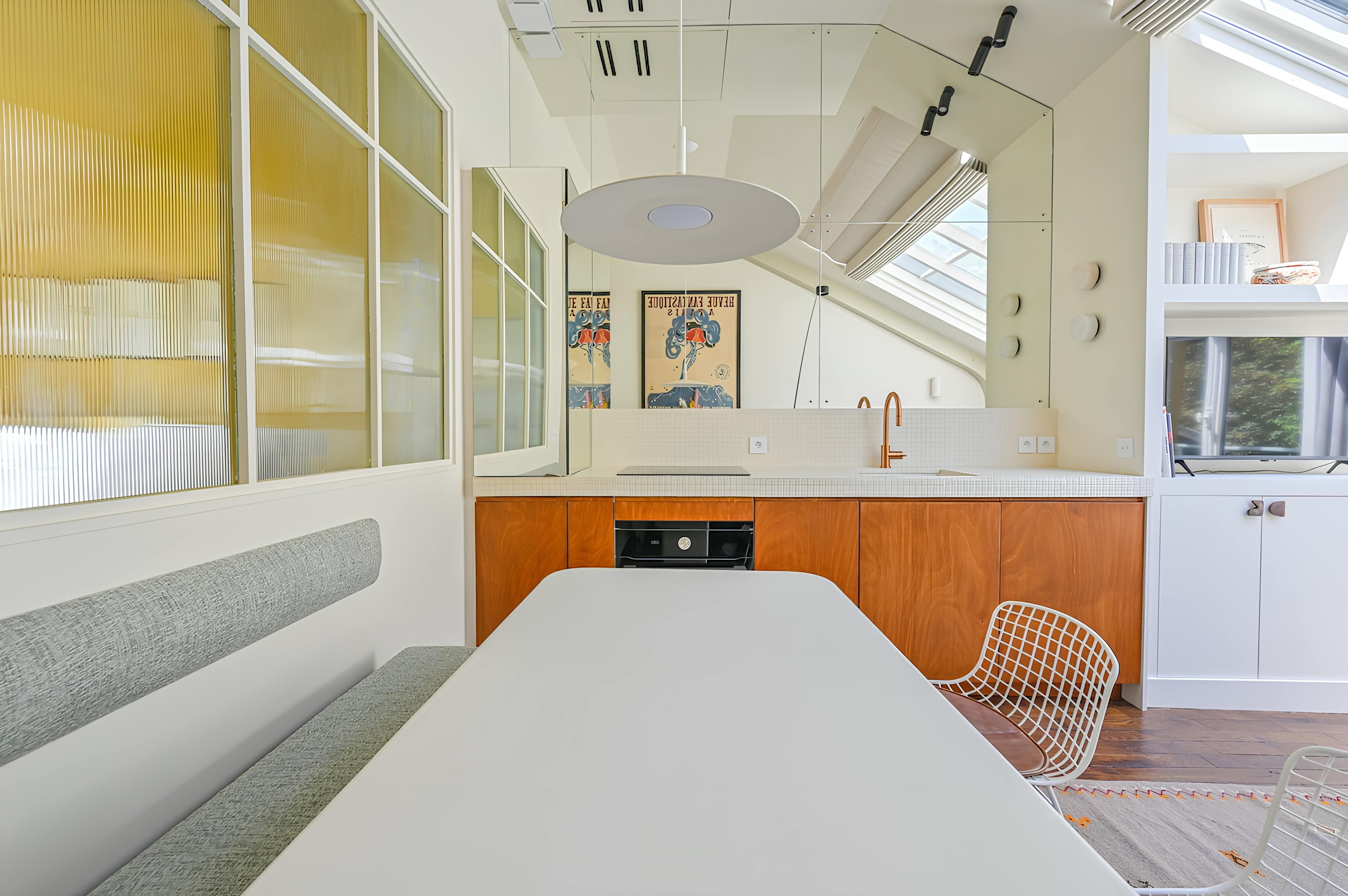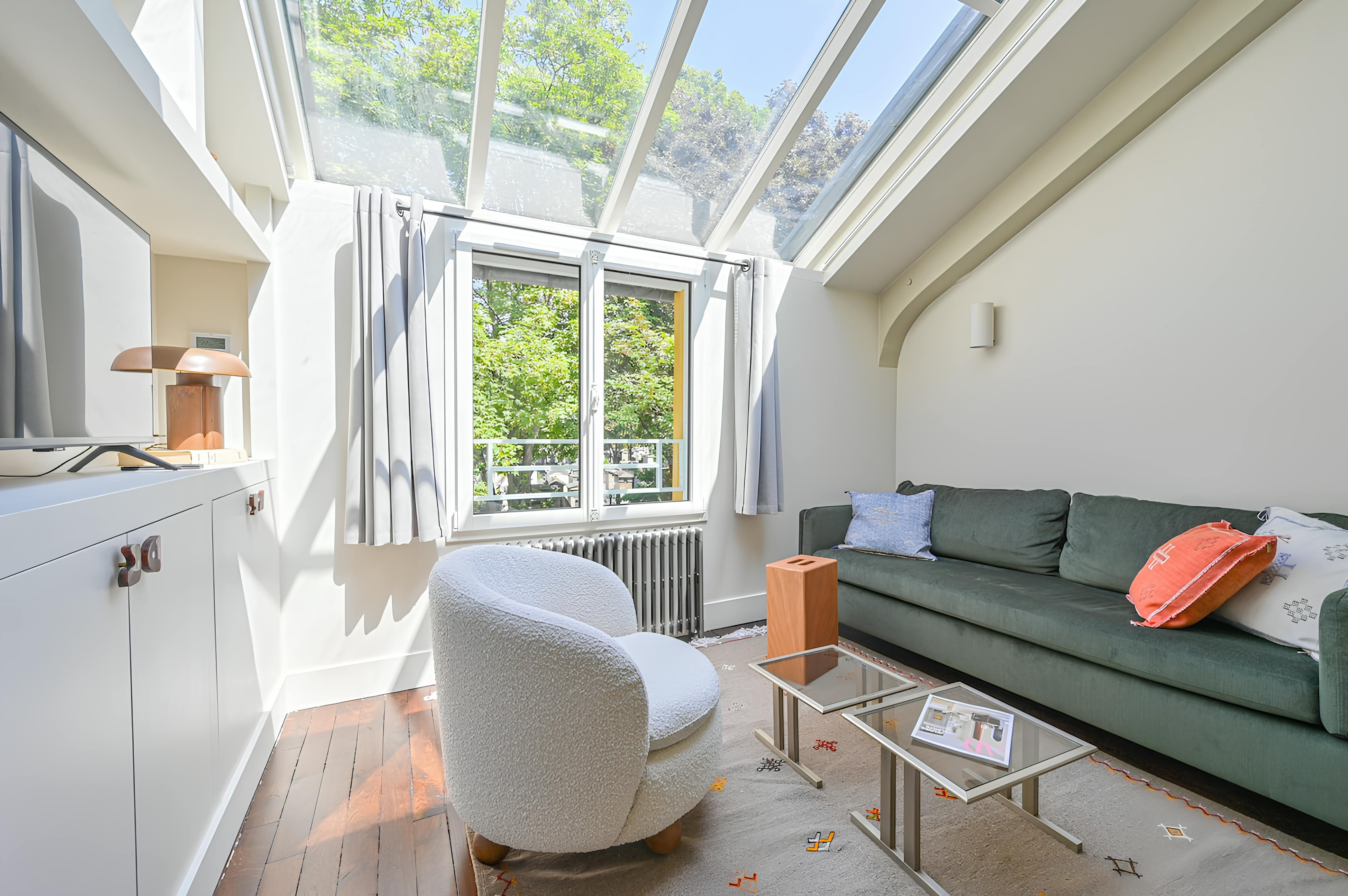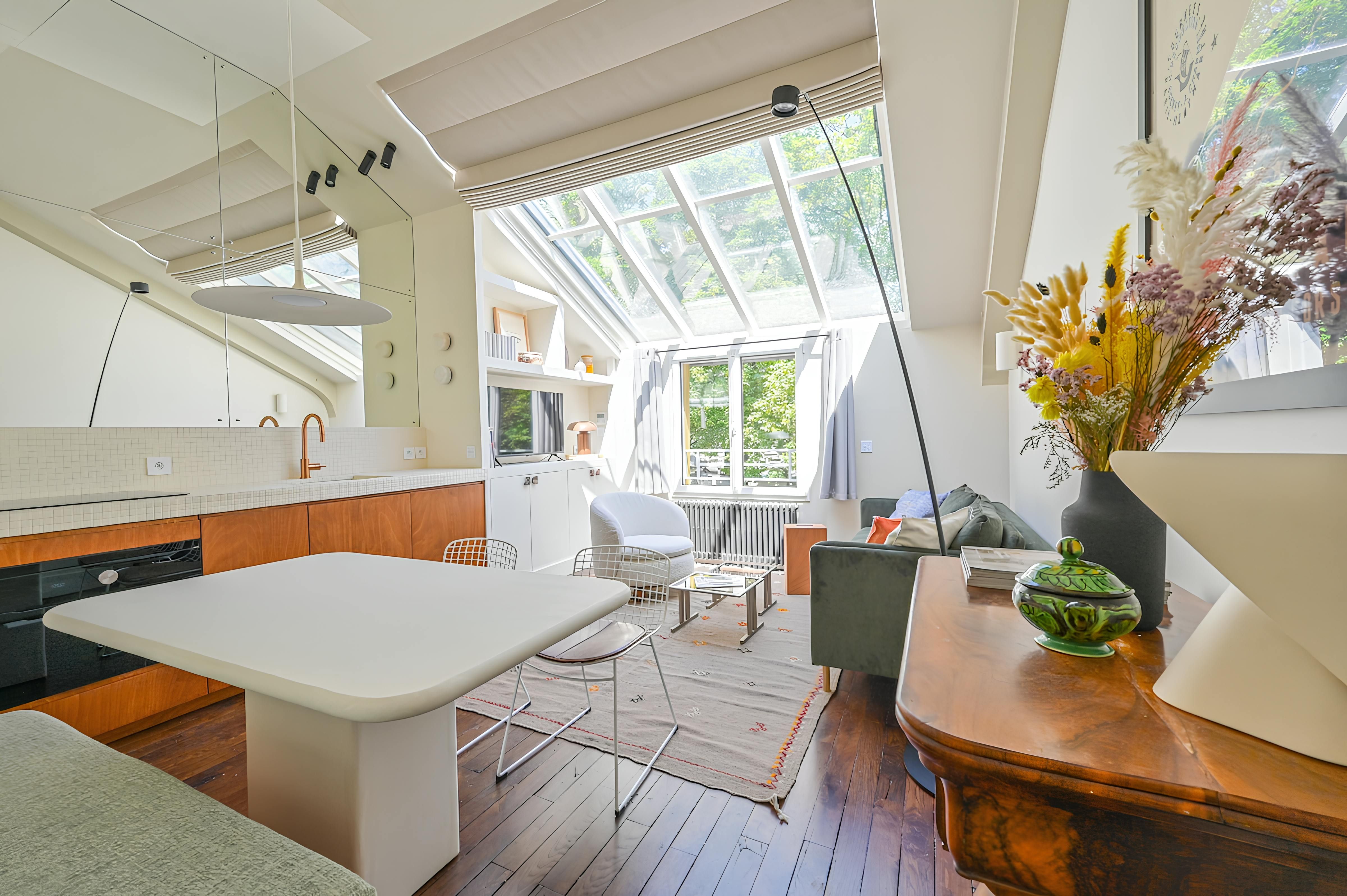 This petite apartment is full of light. It boasts a glass roof and windows that look out onto the greenery of Cimitière de Montmartre, making it a tranquil home-from-home. The combination of glass and a mirrored panel makes the space seem bigger than it is, too – though it’s worth pointing out that there’s only one bedroom so at full occupancy, two guests will sleep on the sofa bed in the living room. You’ll be positioned between the Moulin Rouge and Place de Clichy, tucked away in a quiet tree-filled courtyard.