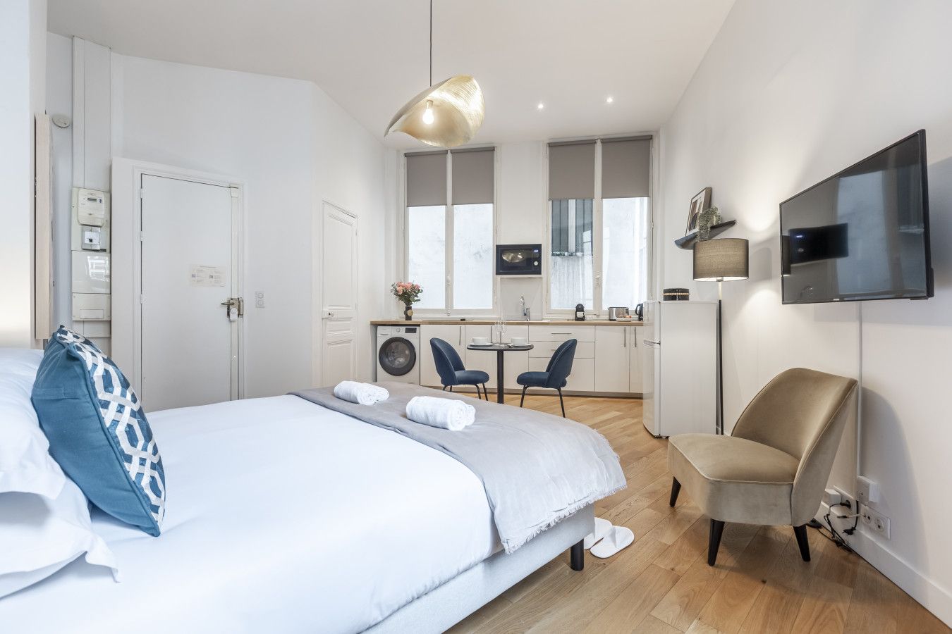 Simple in style but conveniently located, this studio apartment is a practical base in Paris. Given that it’s a studio, space and privacy are limited, so we’d recommend this for couples and solo travellers. You’ll have a petite kitchenette and a small dining table that you can use as a workspace if you’re visiting the City of Lights for business. You’ll be in the thick of things here, with the Champs-Élysées an eight-minute walk away, and the Arc de Triomphe just as close.