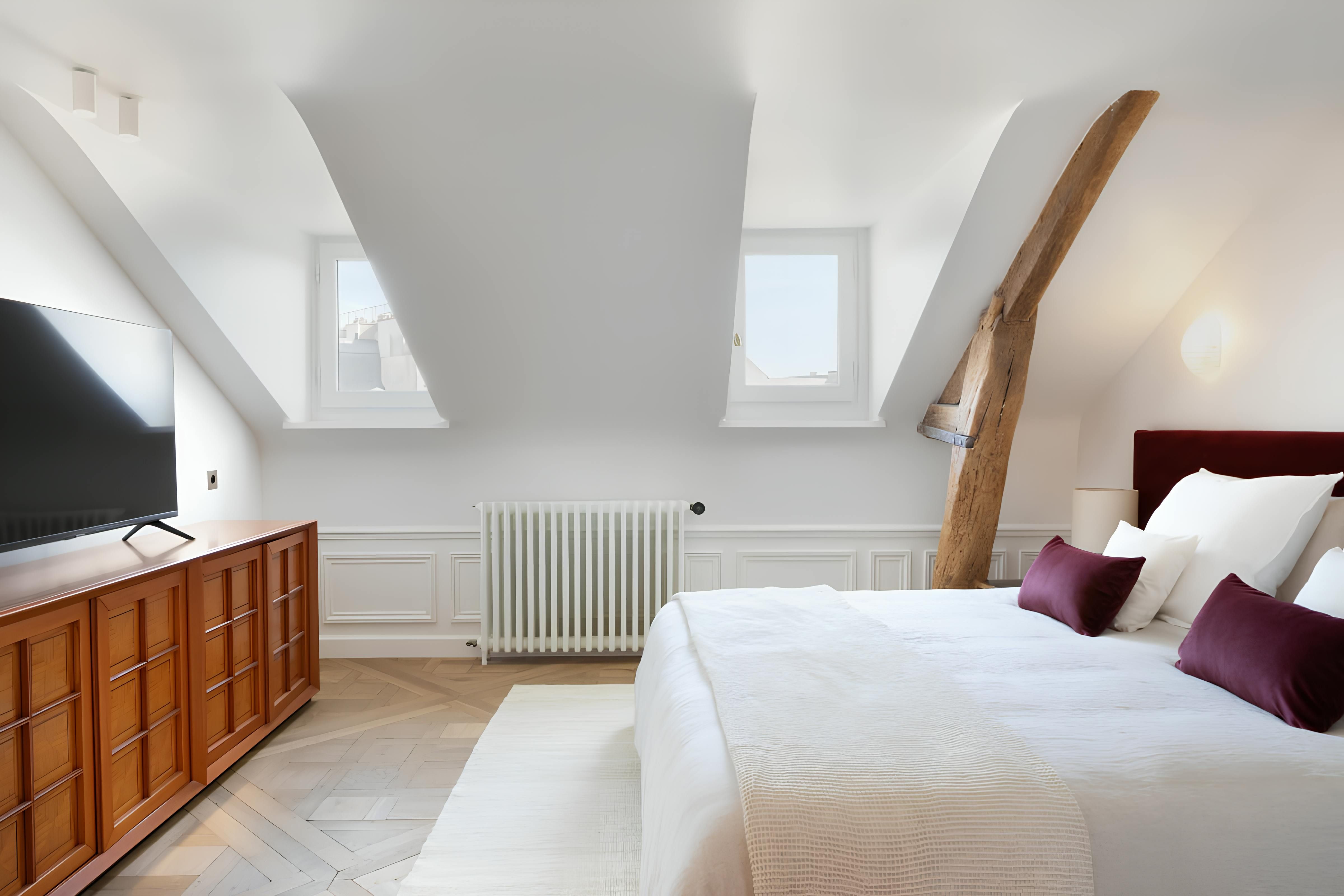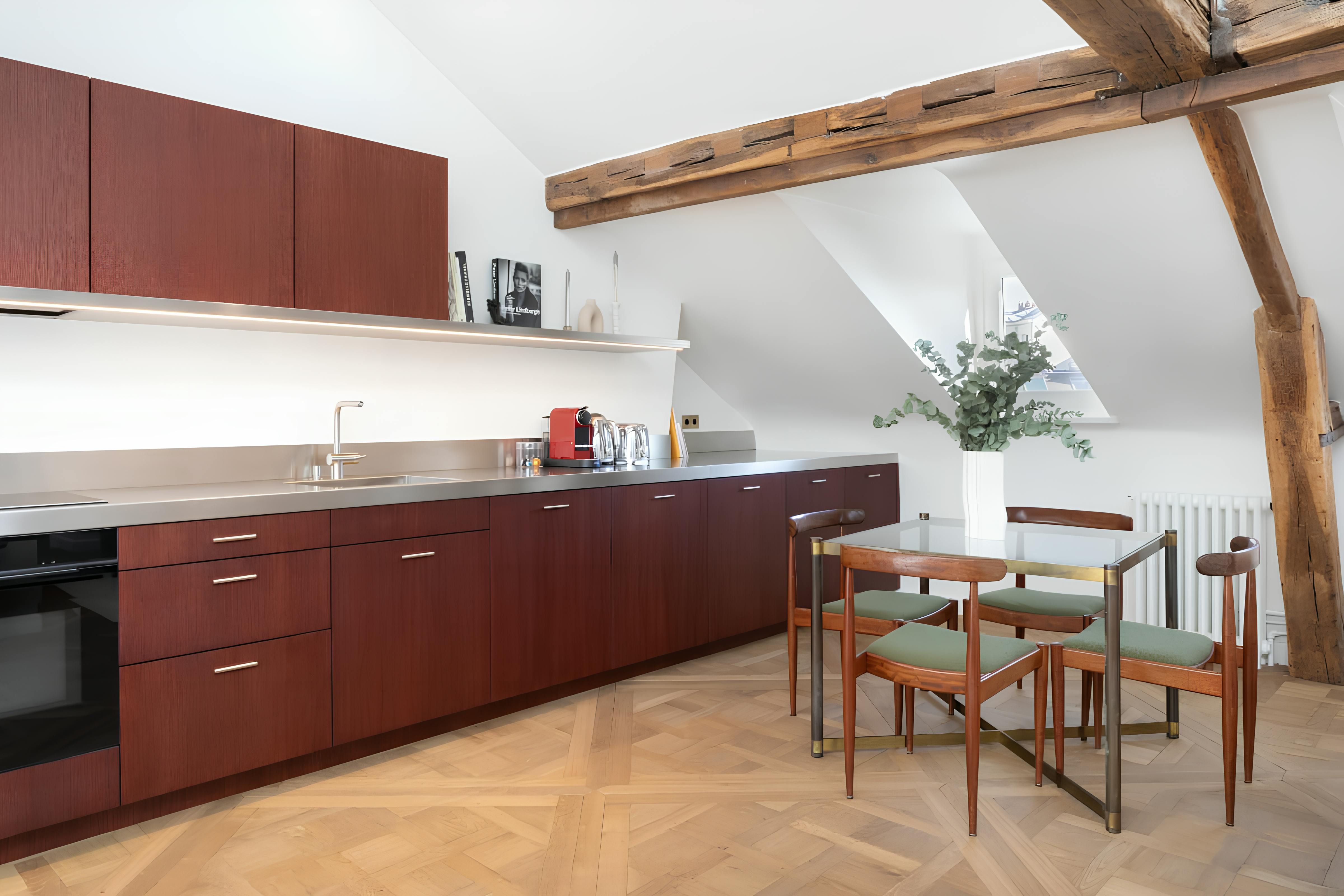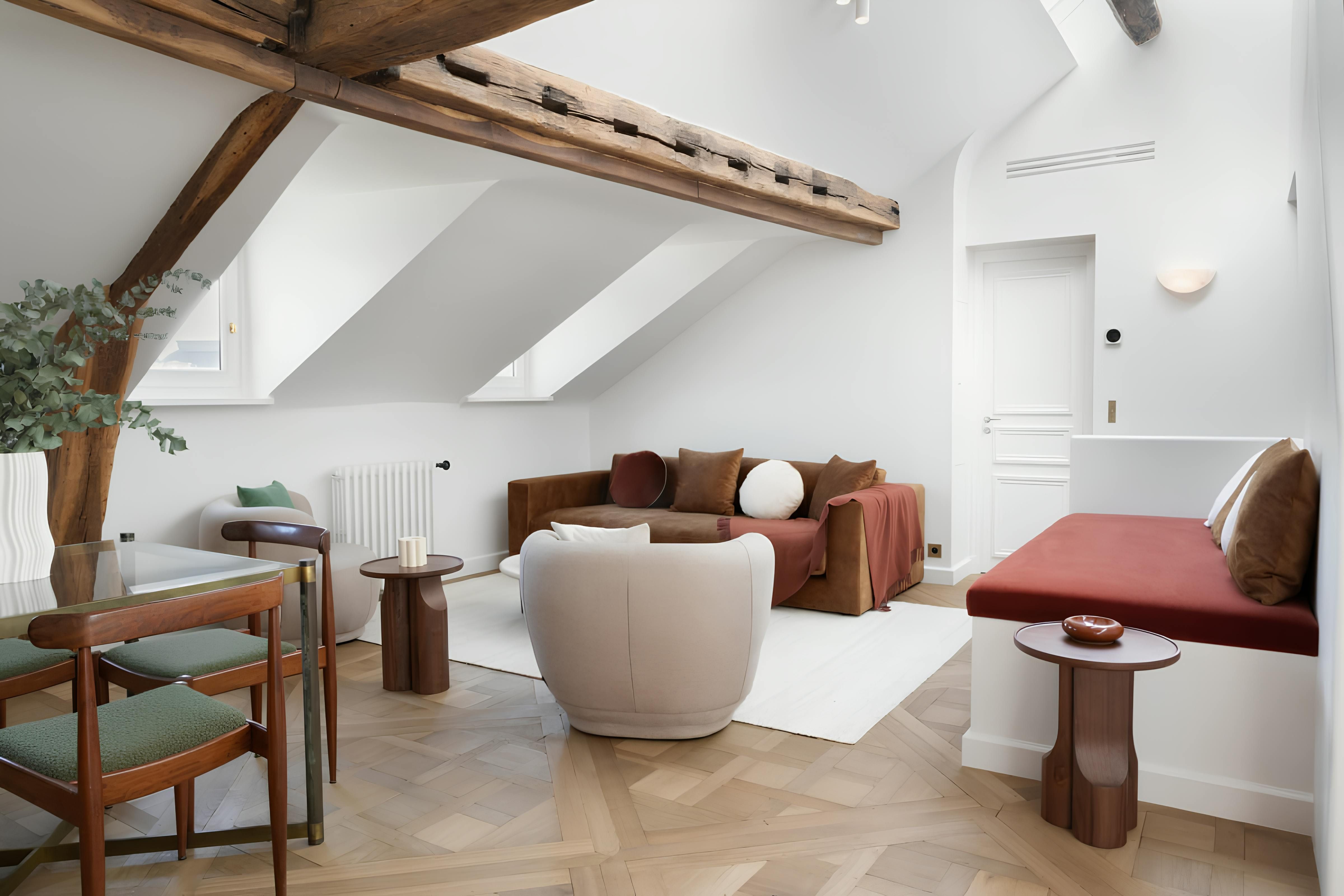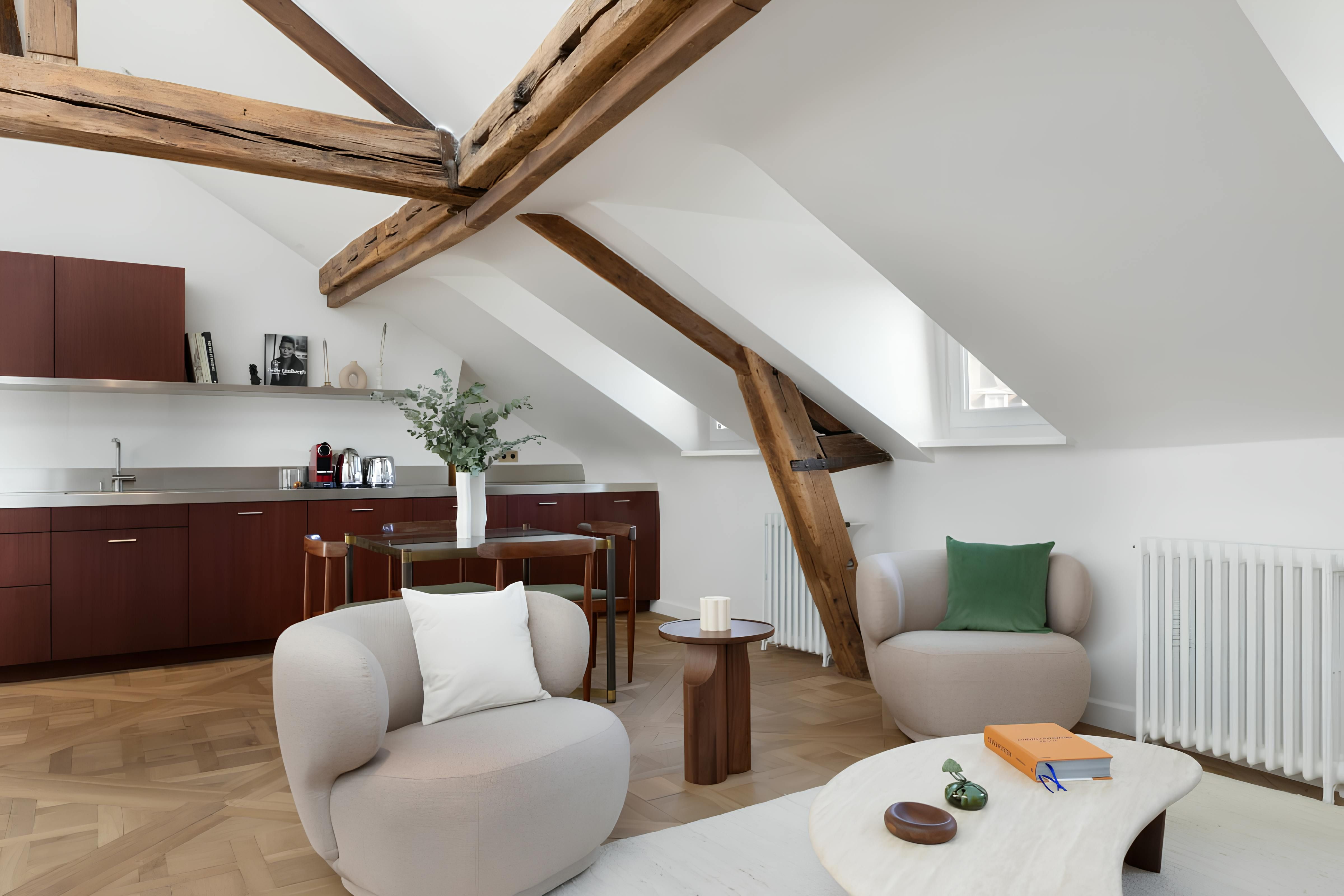 In the eaves of a characterful Haussmann building, this apartment makes a cosy base for couples. Upon entering, you're greeted by original wooden beams, A-frame ceilings, and elegant details. The kitchen has all you need to rustle up dinner – though plenty of gourmet eateries are nearby – while the living area is awash with natural light. Best of all is the location. Situated on the Île de la Cité, you'll be just a short walk from Notre Dame Cathedral, the Seine, and a metro station. All in all, we can't think of a better spot for two.