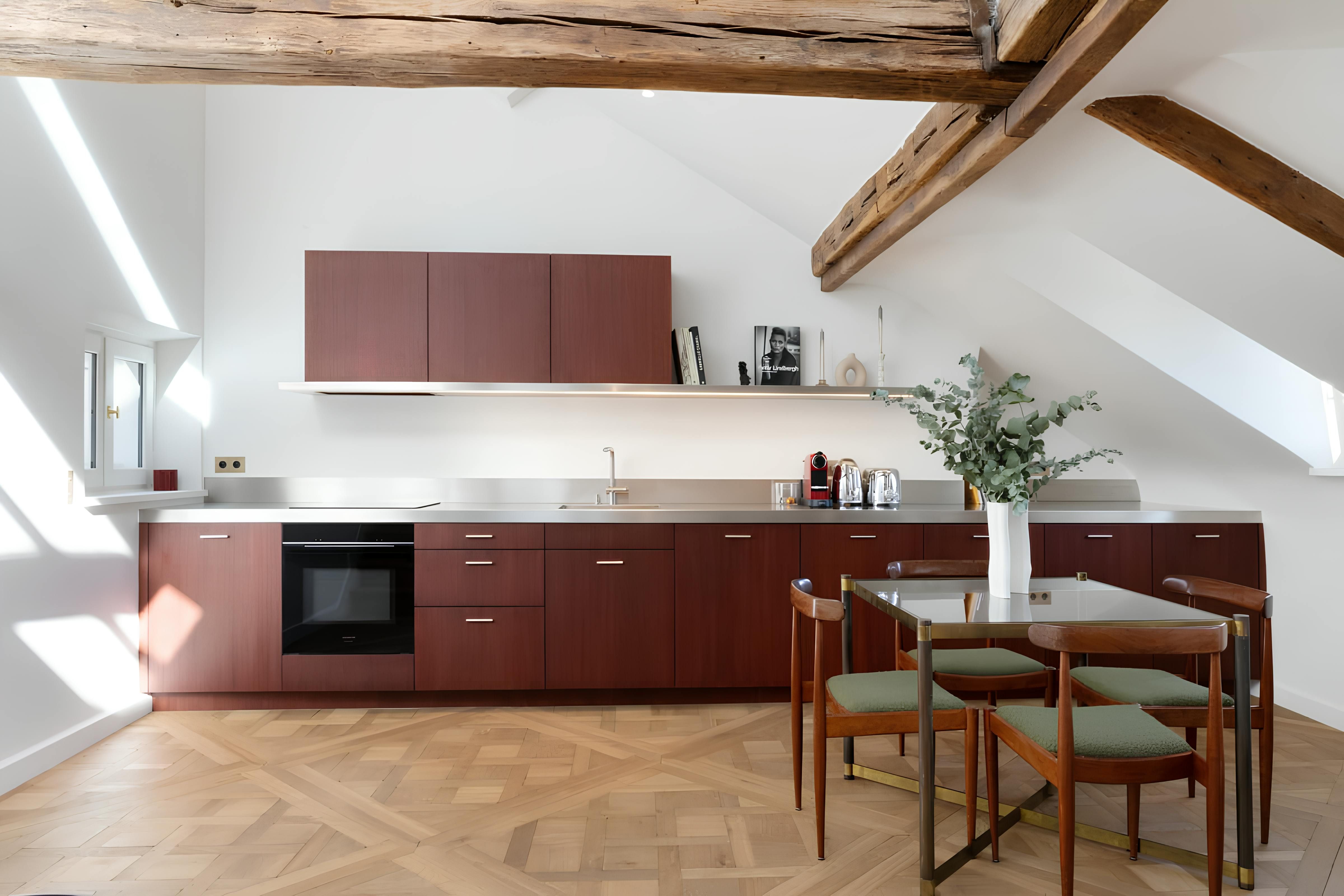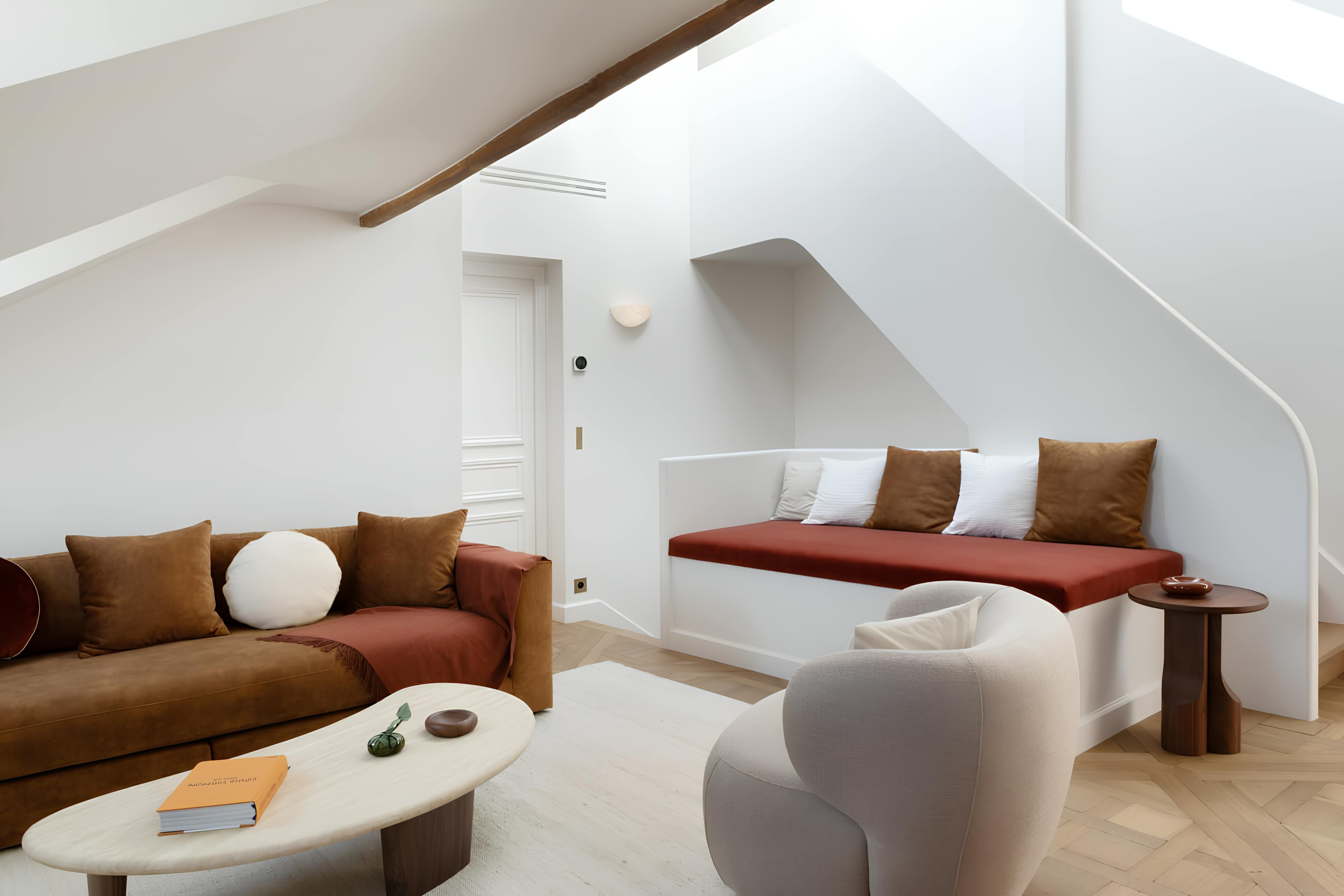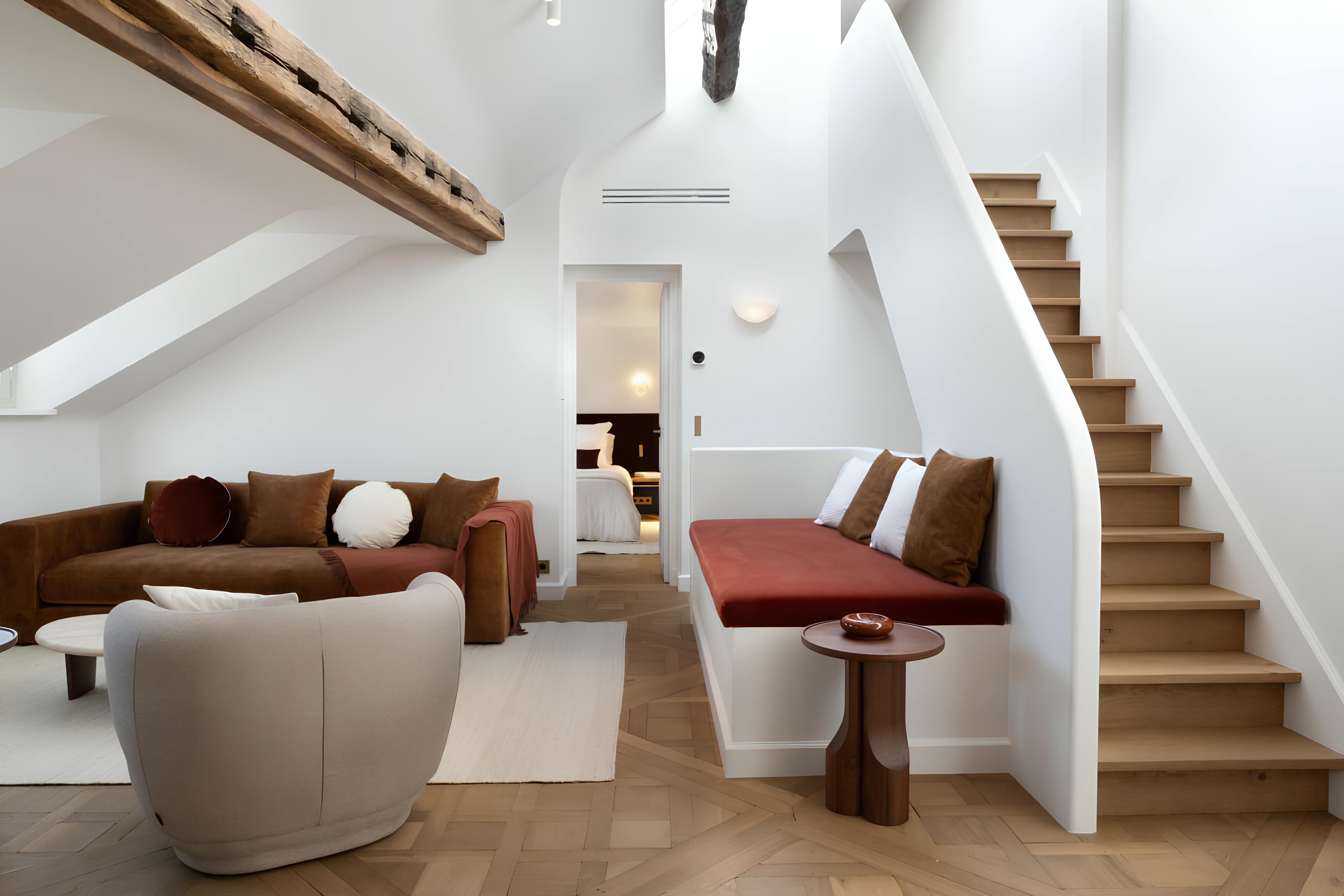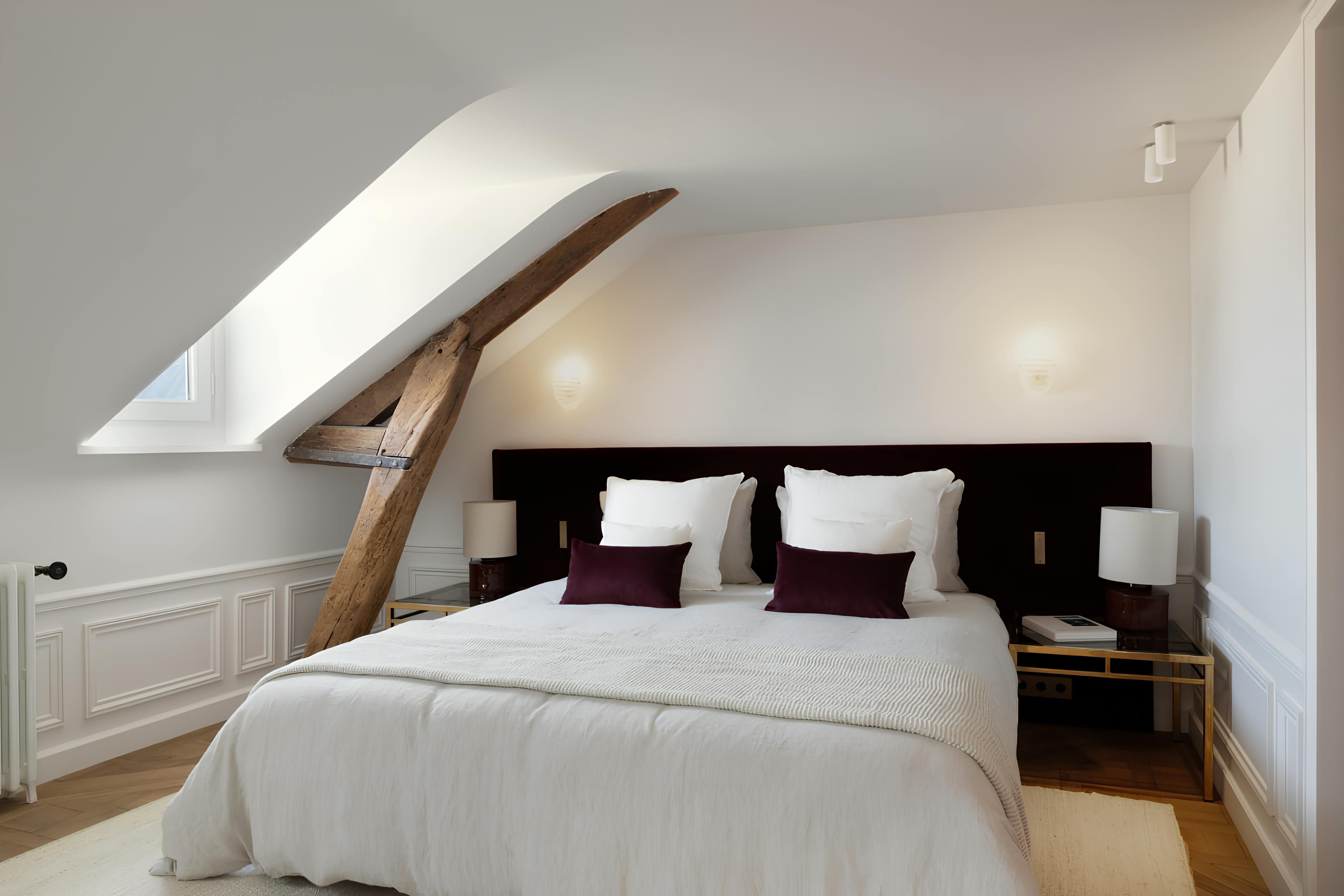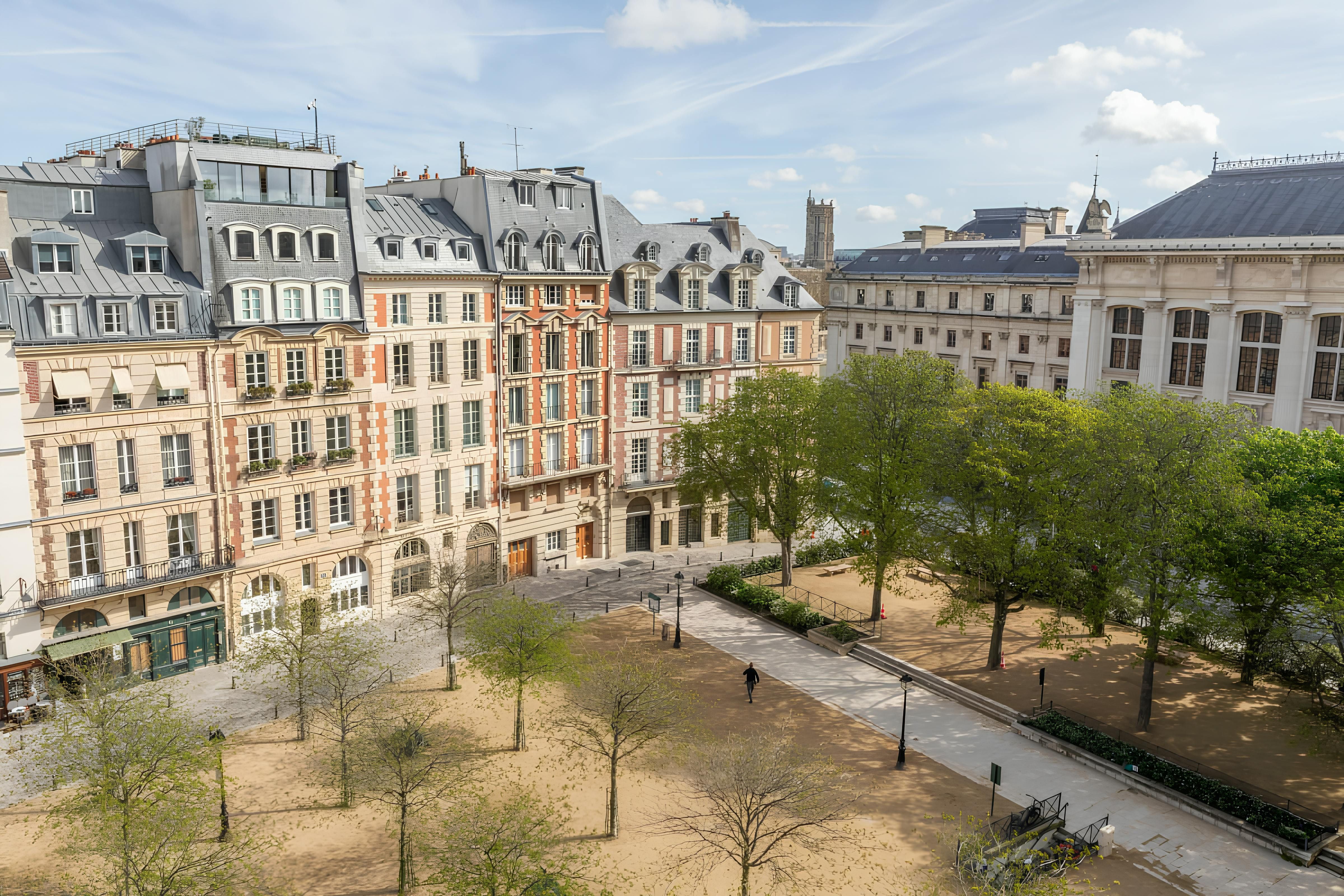 In the eaves of a characterful Haussmann building, this apartment makes a cosy base for couples. Upon entering, you're greeted by original wooden beams, A-frame ceilings, and elegant details. The kitchen has all you need to rustle up dinner – though plenty of gourmet eateries are nearby – while the living area is awash with natural light. Best of all is the location. Situated on the Île de la Cité, you'll be just a short walk from Notre Dame Cathedral, the Seine, and a metro station. All in all, we can't think of a better spot for two.
