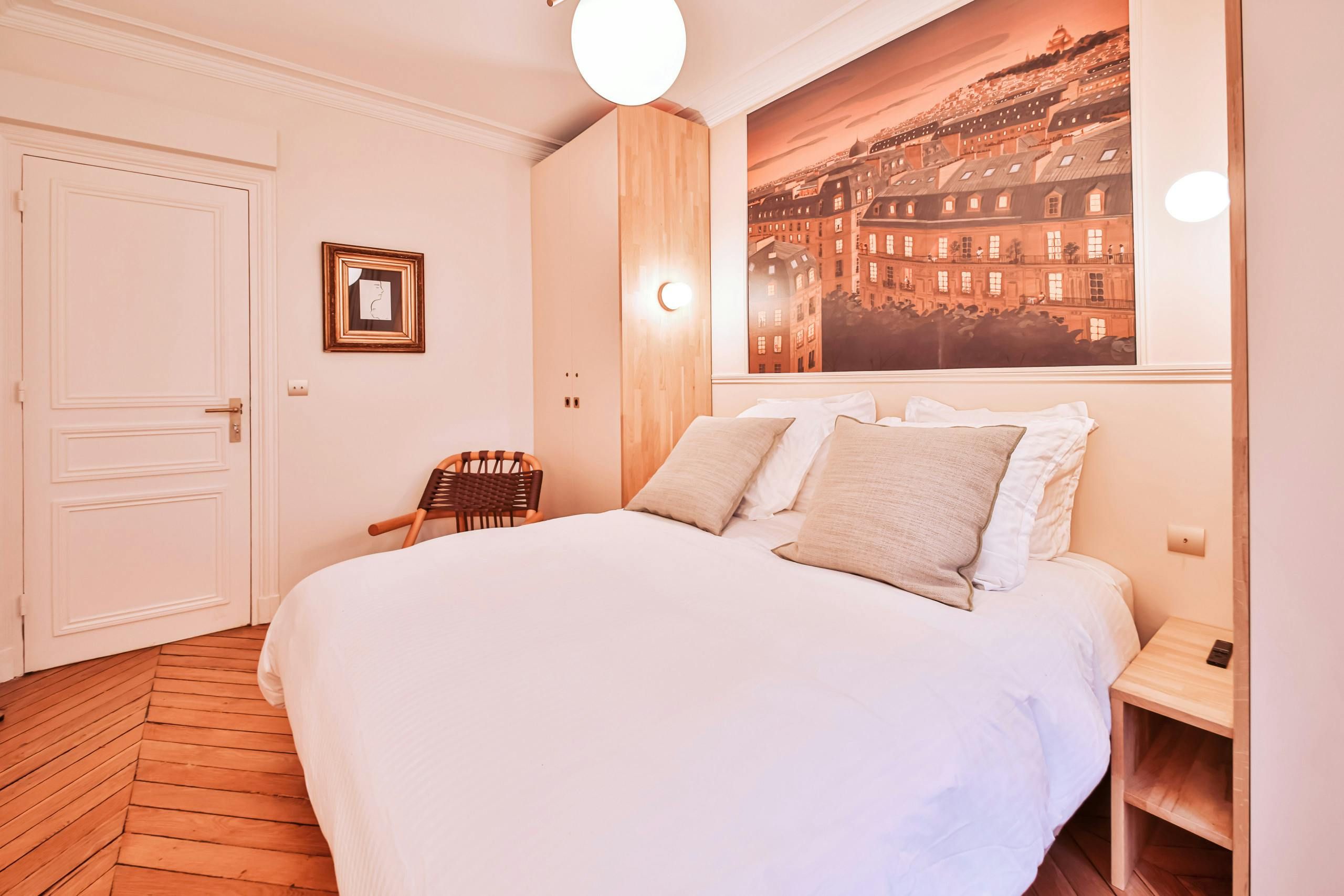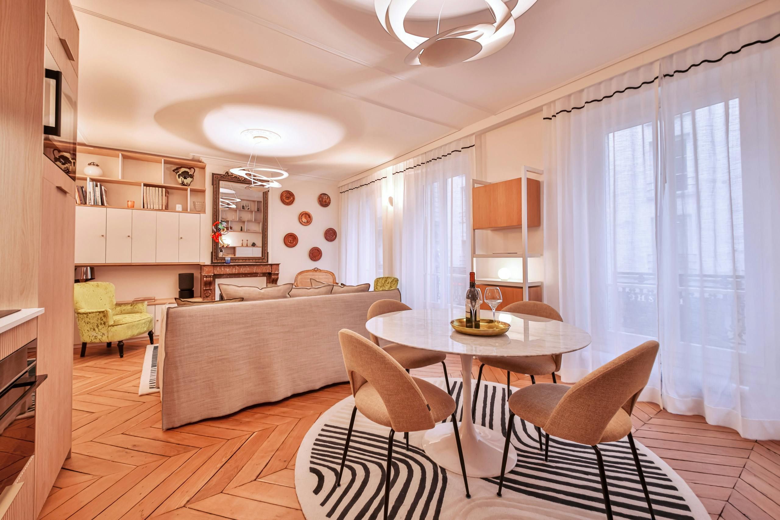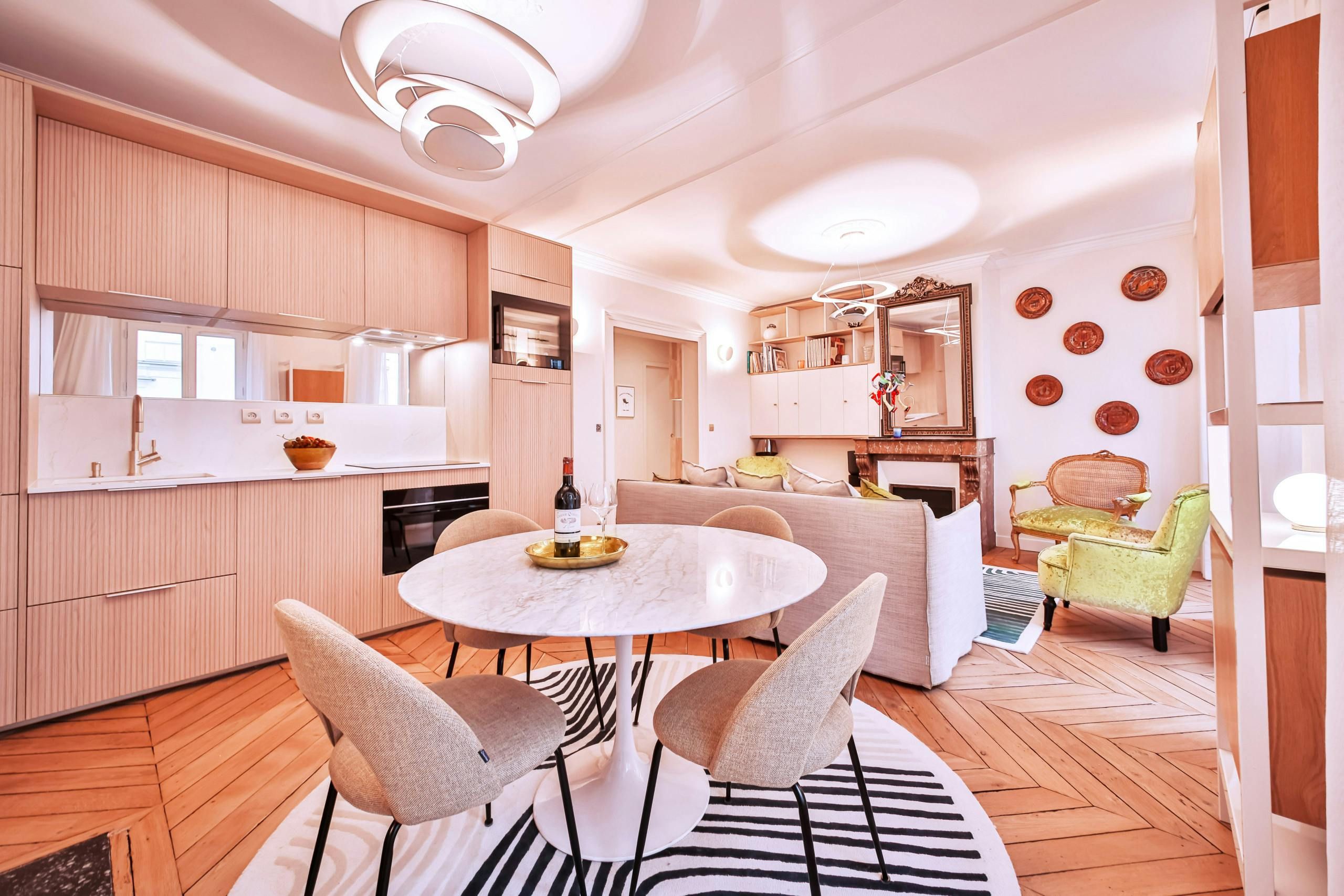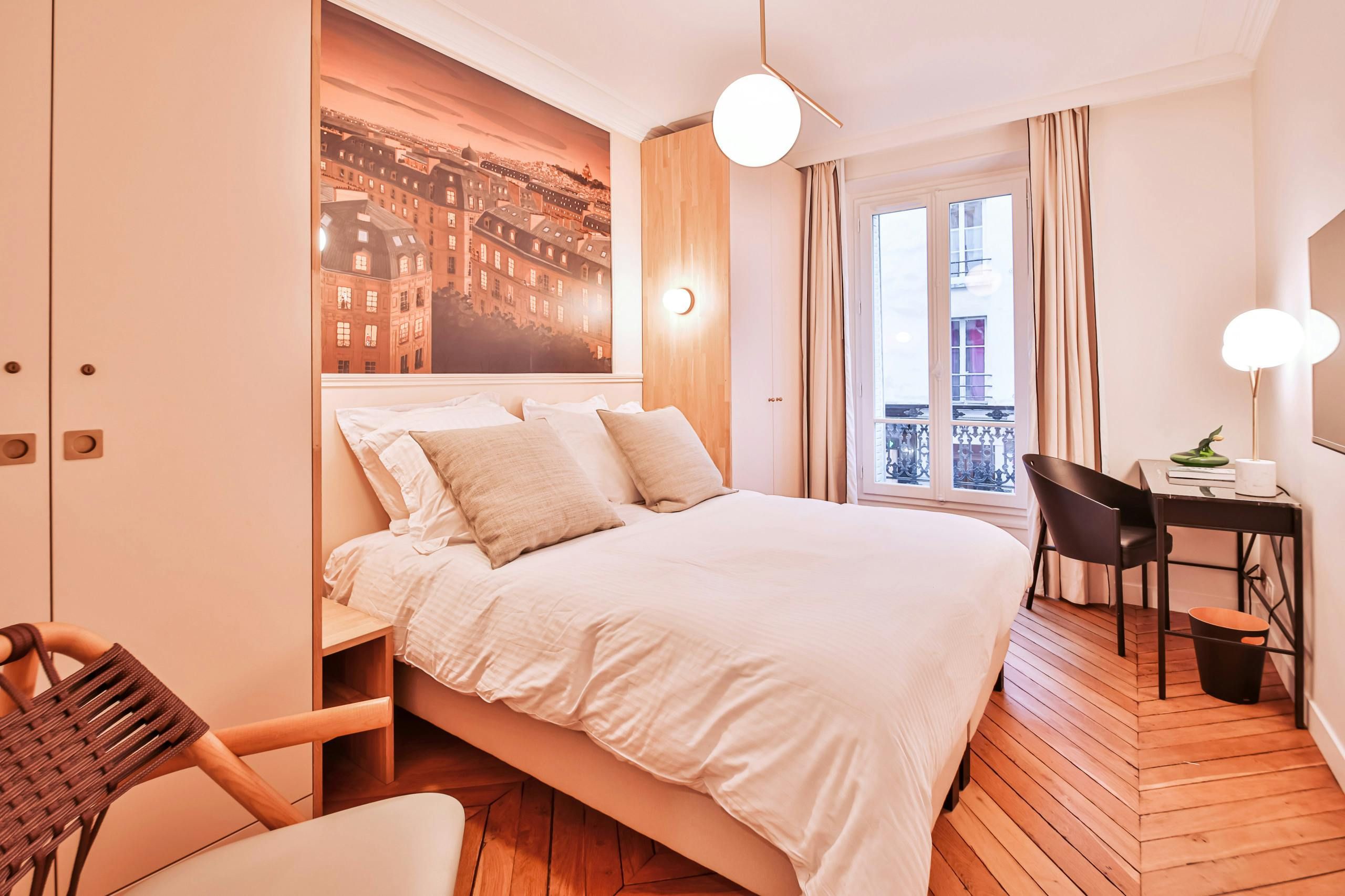 Just a short stroll from the Jardin du Luxembourg, you’ll find this elegant apartment. Cultural landmarks like the Panthéon are also within walking distance. The neighbourhood has a variety of cafes, boutiques, and fine dining options too. Housed in a traditional Parisian building, this home, with its period features, is ideal for families, couples, or friends seeking a comfortable stay. There’s a convivial open-plan living area and a couple of the bedrooms have a desk, too, if you need to work while away in Paris.