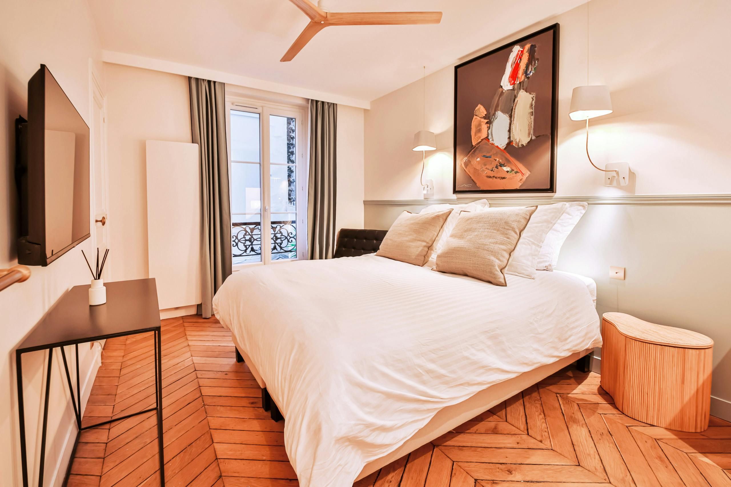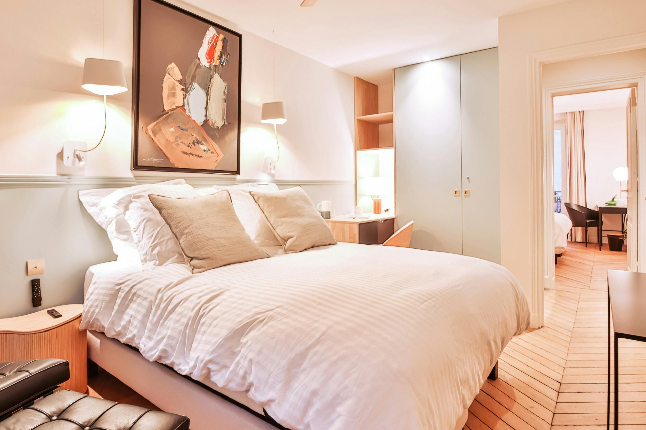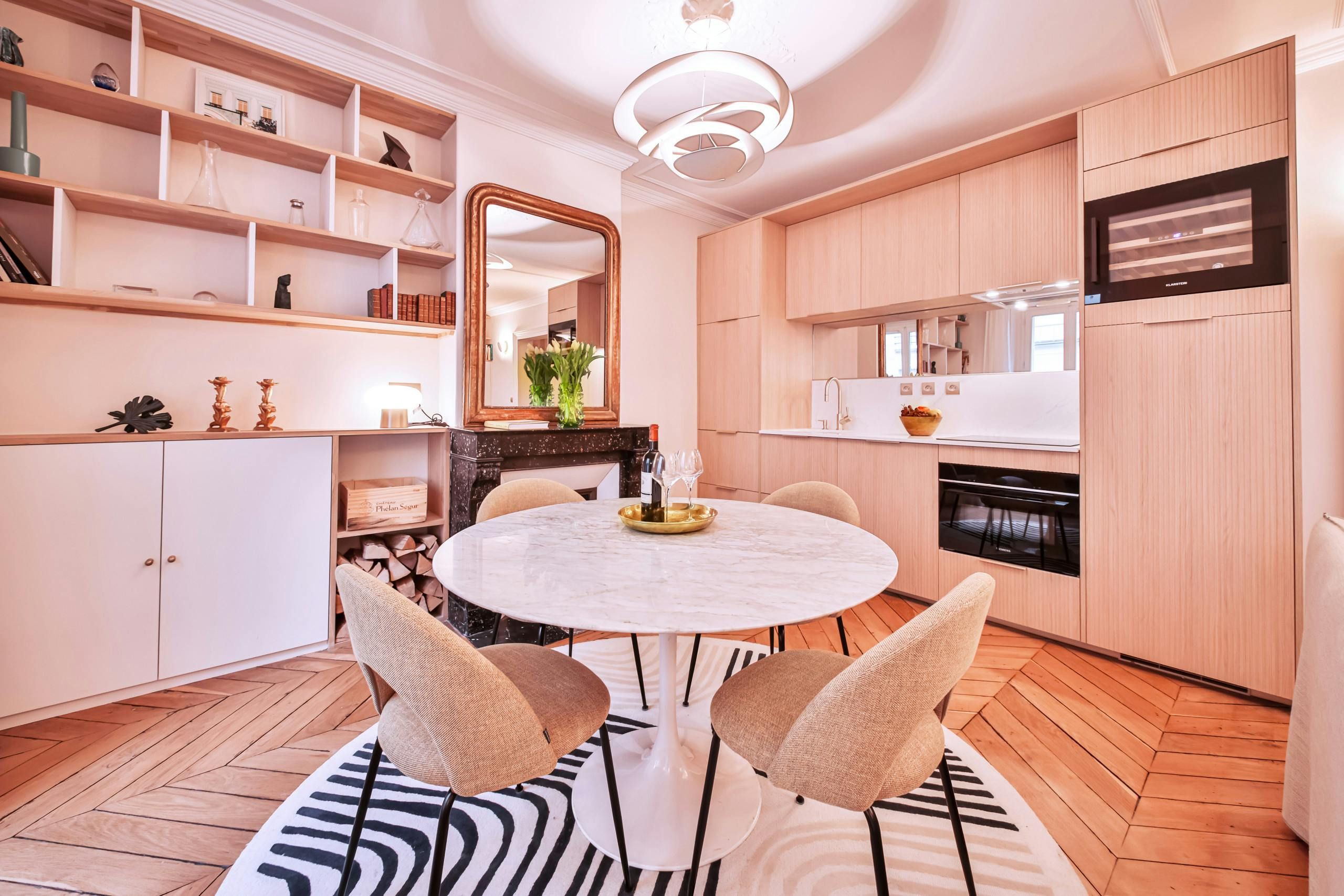 Just a short stroll from the Jardin du Luxembourg, you’ll find this elegant apartment. Cultural landmarks like the Panthéon are also within walking distance. The neighbourhood has a variety of cafes, boutiques, and fine dining options too. Housed in a traditional Parisian building, this home, with its period features, is ideal for families, couples, or friends seeking a comfortable stay. There’s a convivial open-plan living area and a couple of the bedrooms have a desk, too, if you need to work while away in Paris.