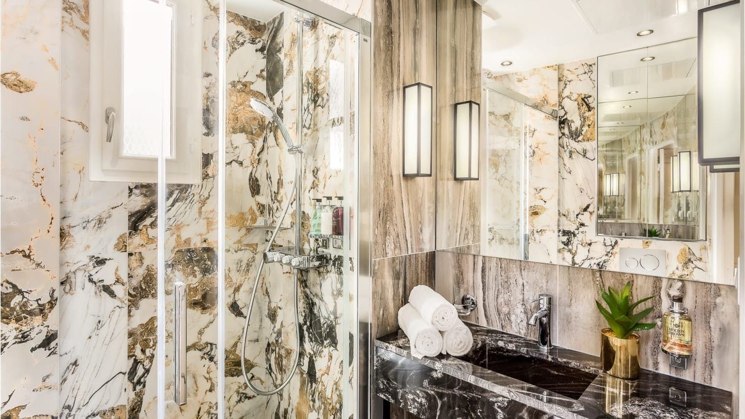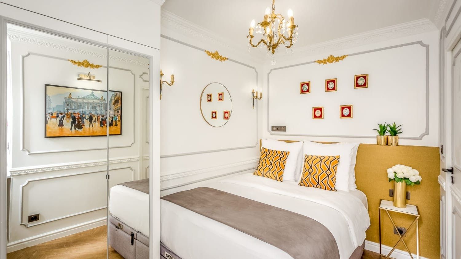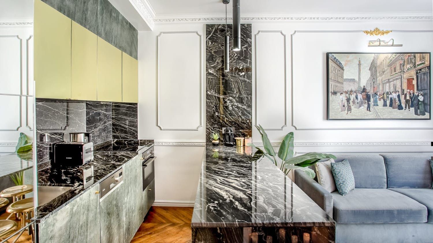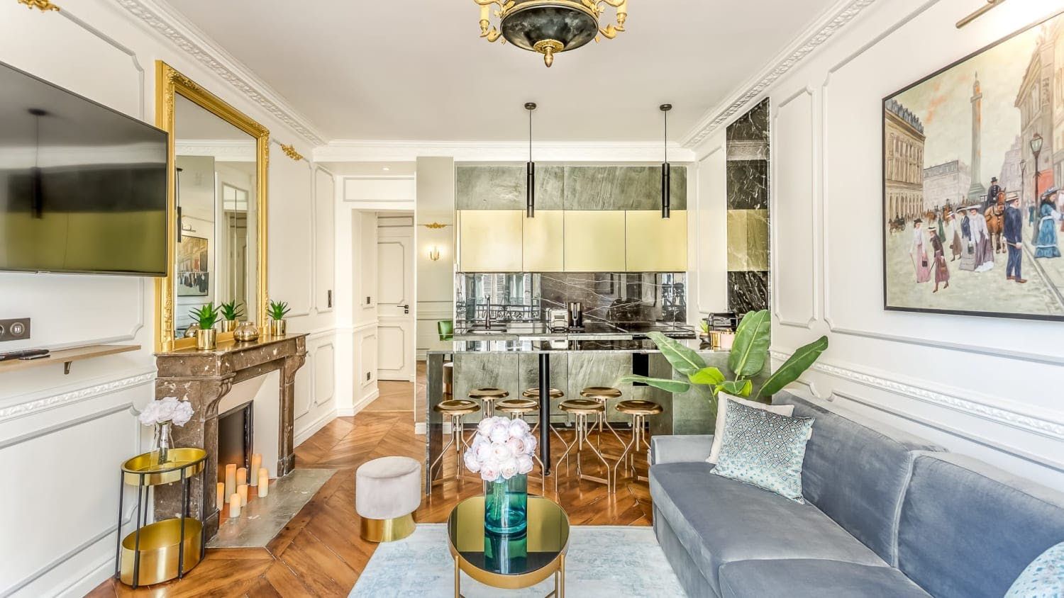 Set in a quintessentially Parisian building – think elegant 19th-century Haussmann architecture – this stylish apartment is the picture of sophistication. Nestled in the city’s 1st arrondissement and recently redecorated by a renowned French architect, this home is teeming with Parisian charm, boasting high ceilings, ornate mouldings, and Point de Hongrie flooring that zigzags throughout the property. Every detail here has been chosen with the utmost care, from the neutral-coloured curtains to the plush sofa cushions, and the large gilt mirrors in the living and sleeping areas only add to the sense of space that permeates this luxury property.