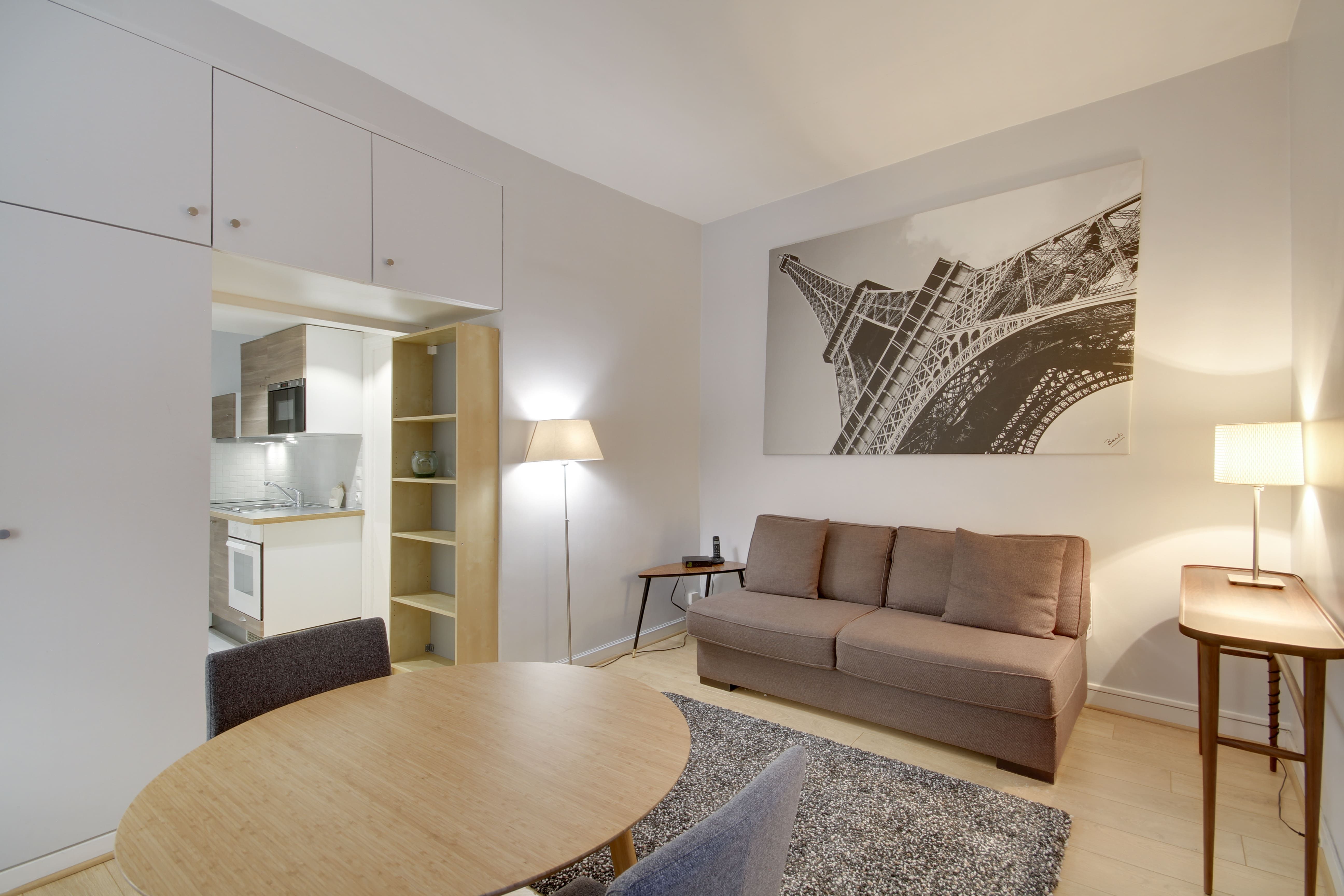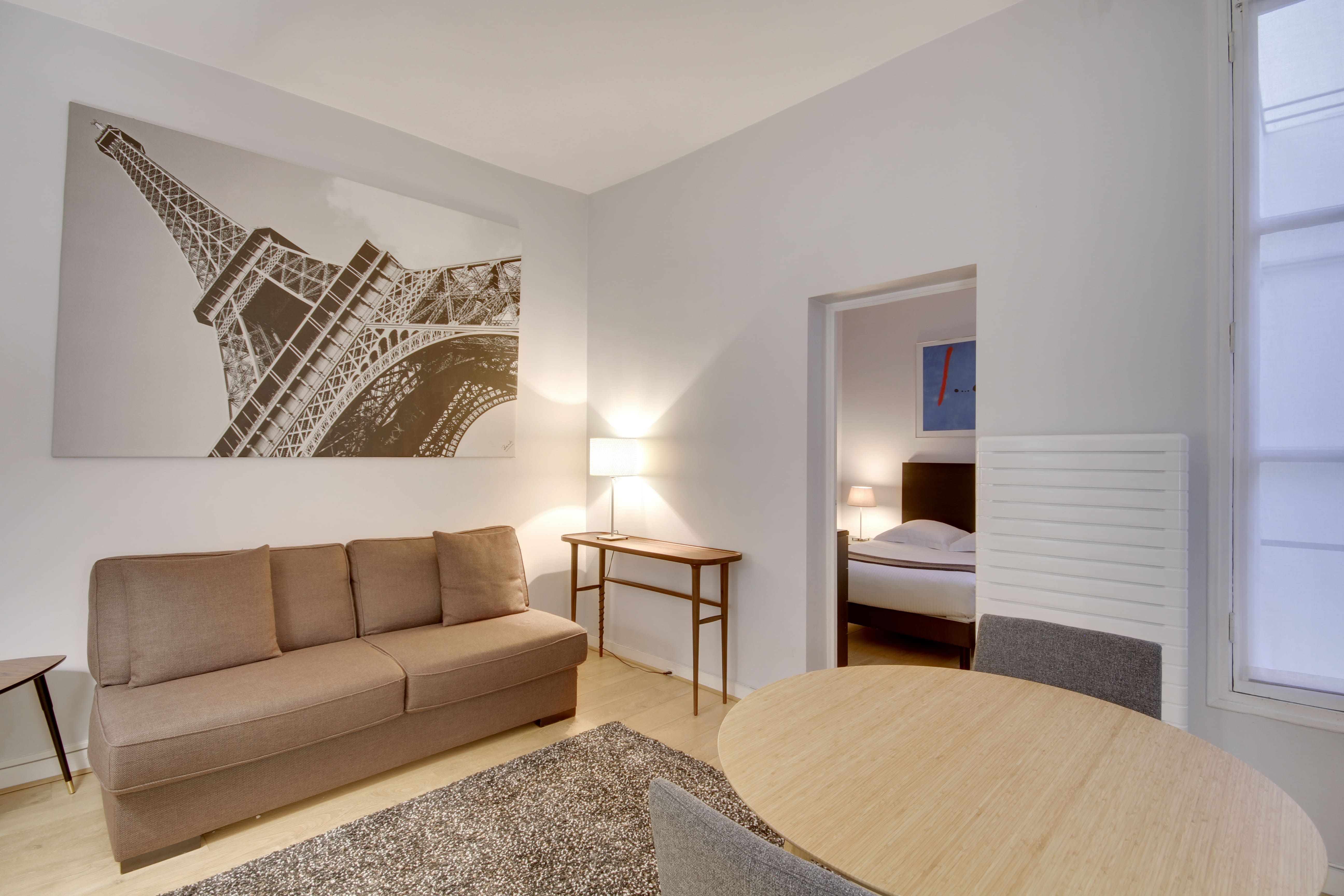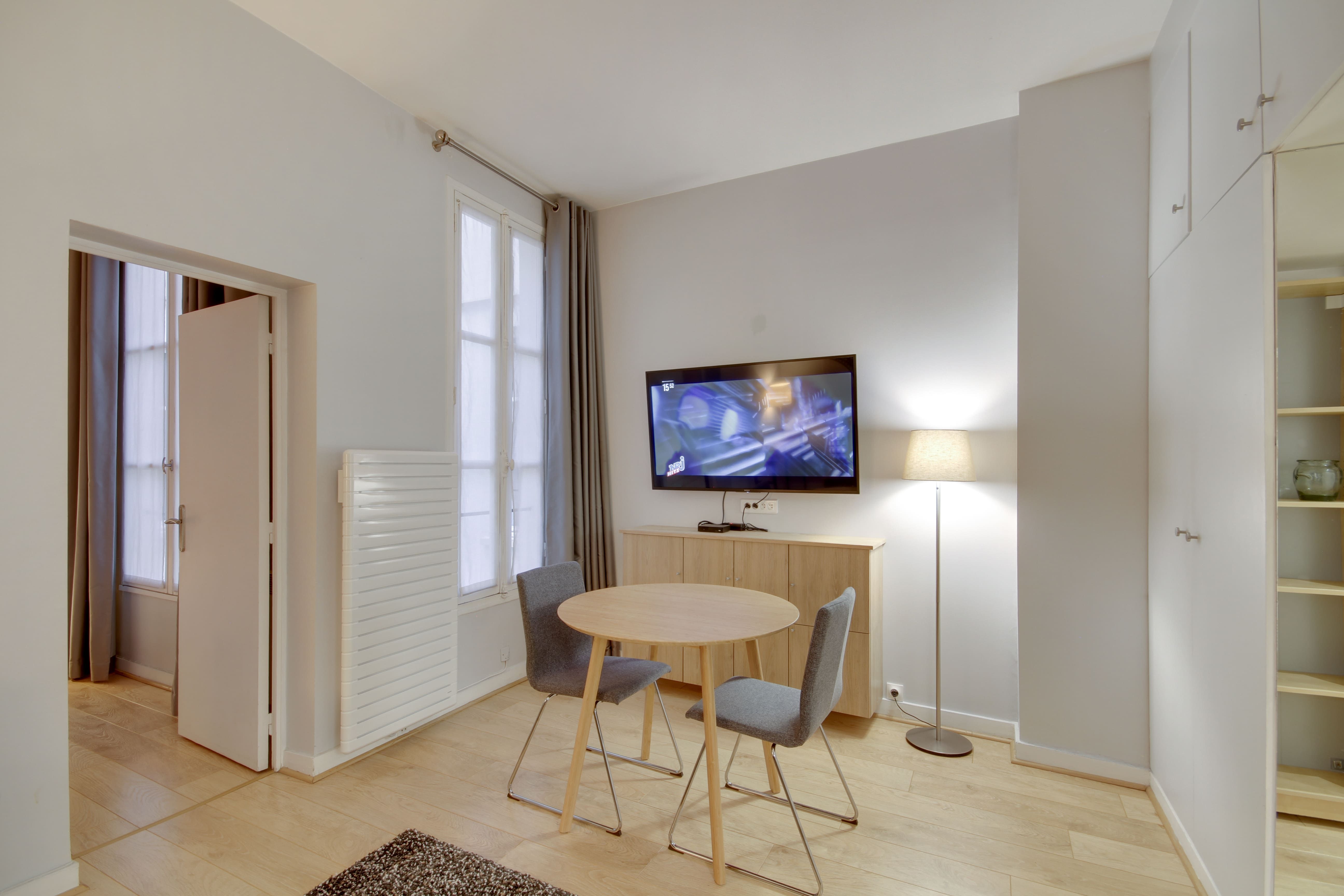 Situated a short walk from the Jardin du Palais Royal and the Louvre Museum, this apartment, designed for business people has an enviable location. The public transport links in the locale are also great, so if you need to travel to other areas, such as the business district of La Défense, you’re covered. There are plenty of restaurants in the vicinity, too, or you can do some cooking at home in the compact, but well-equipped kitchen. And, when you need to catch up on work, the dining table doubles up as a space for the laptop. This place is the ideal City of Light pied-à-terre.