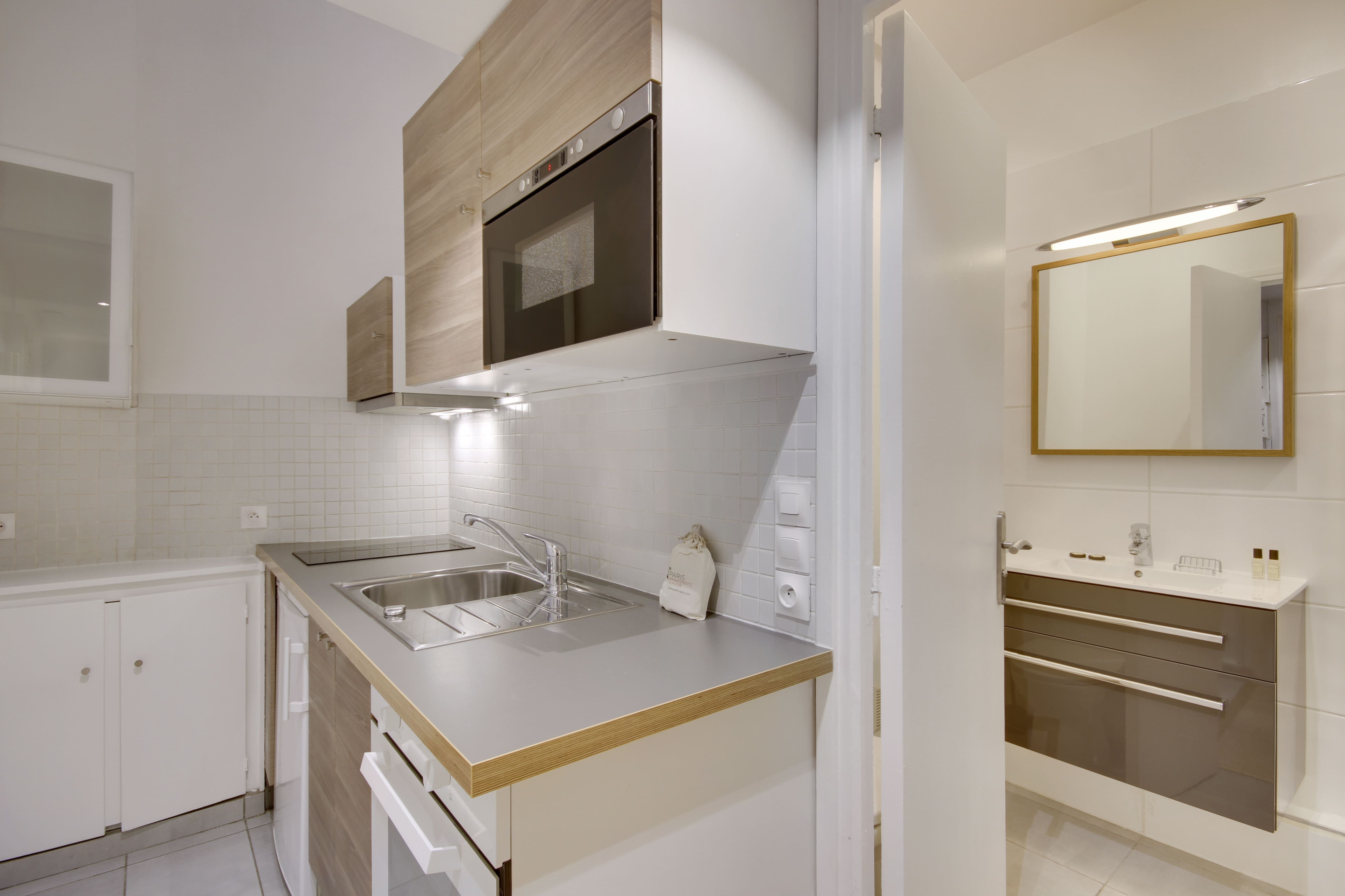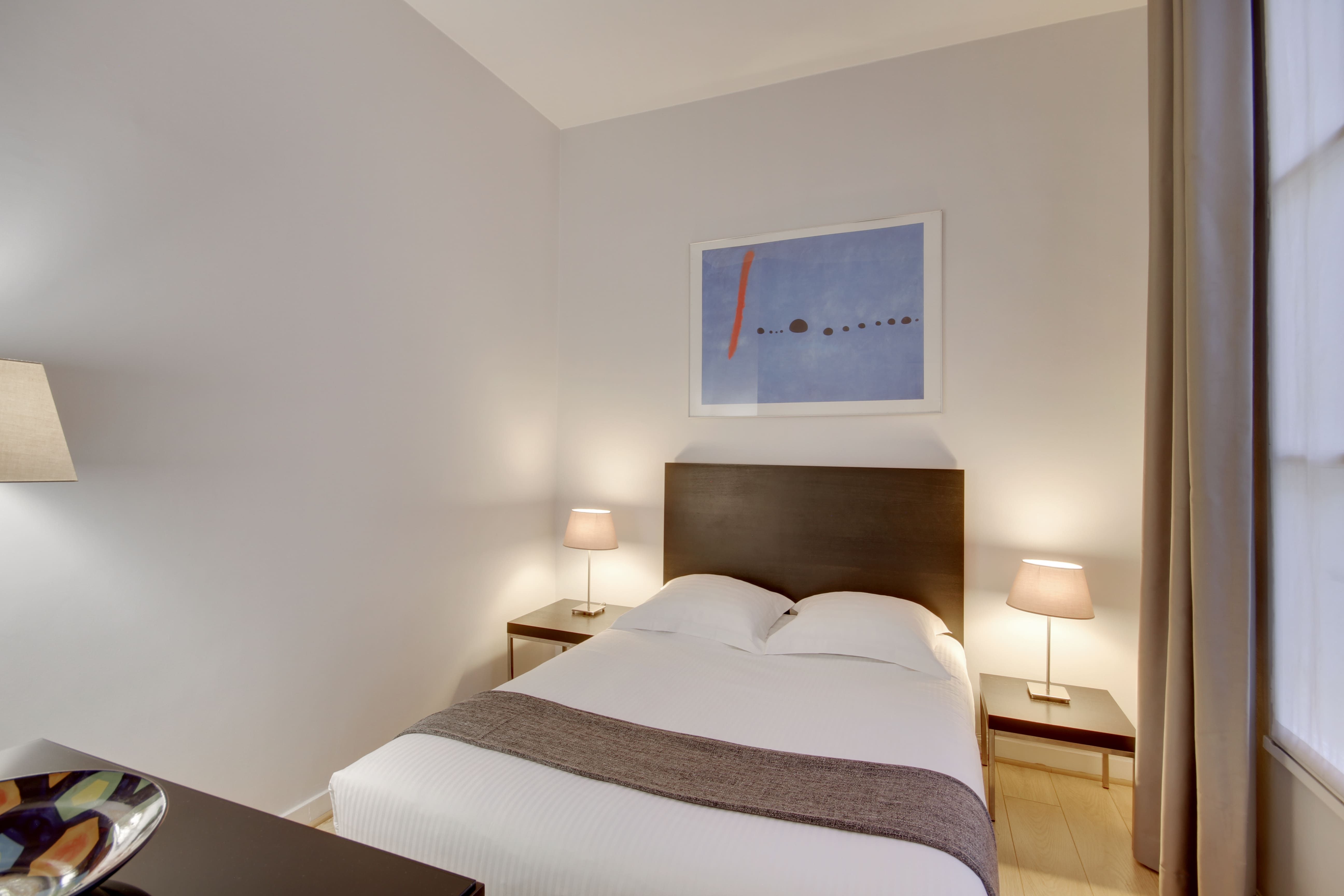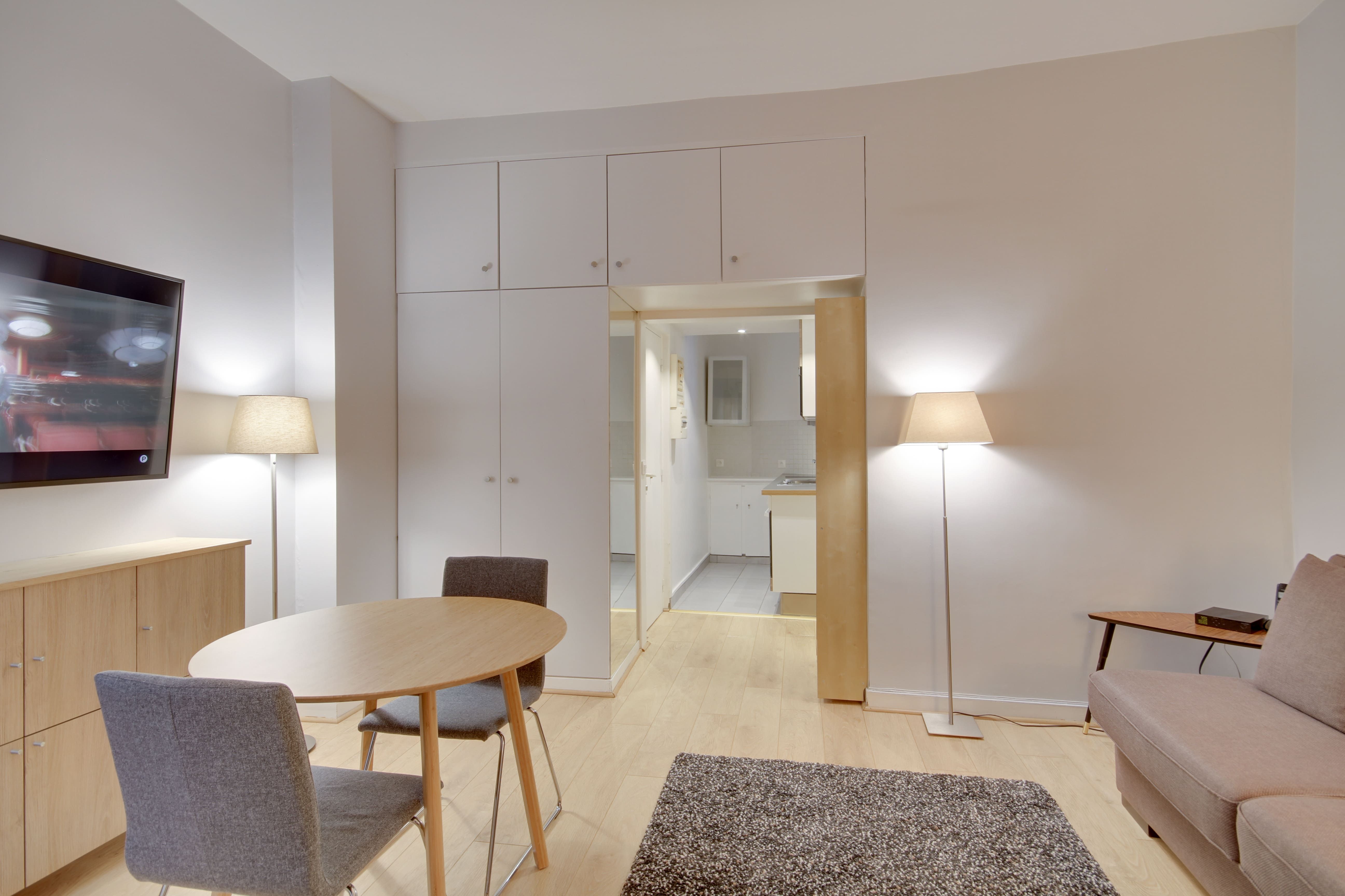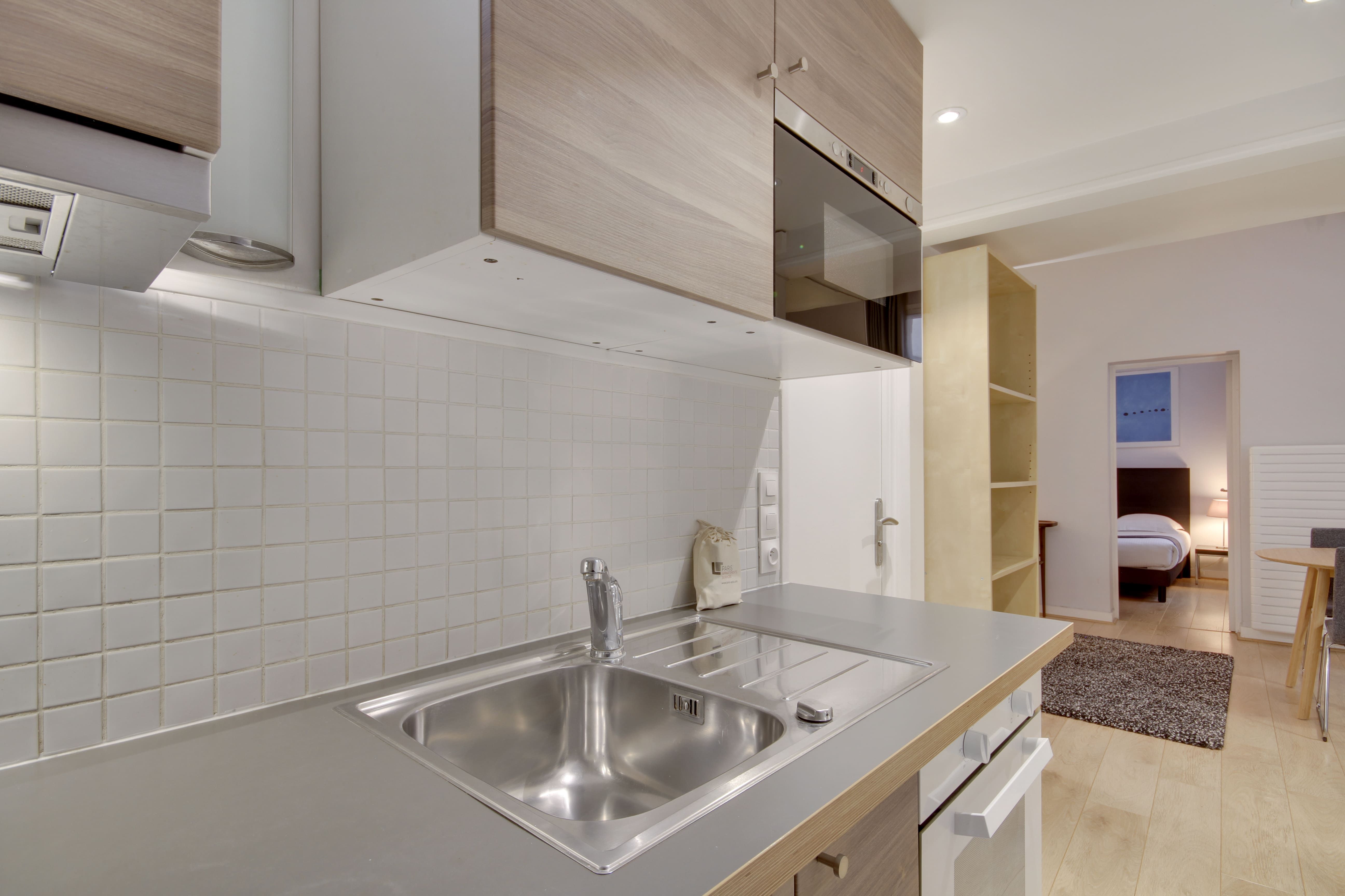 Situated a short walk from the Jardin du Palais Royal and the Louvre Museum, this apartment, designed for business people has an enviable location. The public transport links in the locale are also great, so if you need to travel to other areas, such as the business district of La Défense, you’re covered. There are plenty of restaurants in the vicinity, too, or you can do some cooking at home in the compact, but well-equipped kitchen. And, when you need to catch up on work, the dining table doubles up as a space for the laptop. This place is the ideal City of Light pied-à-terre.