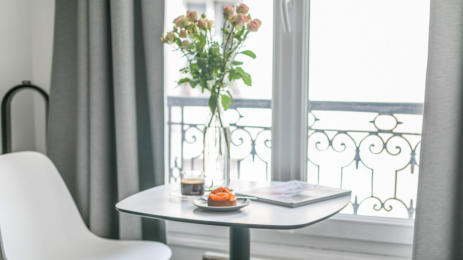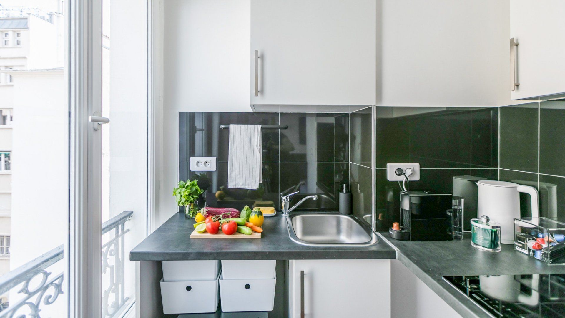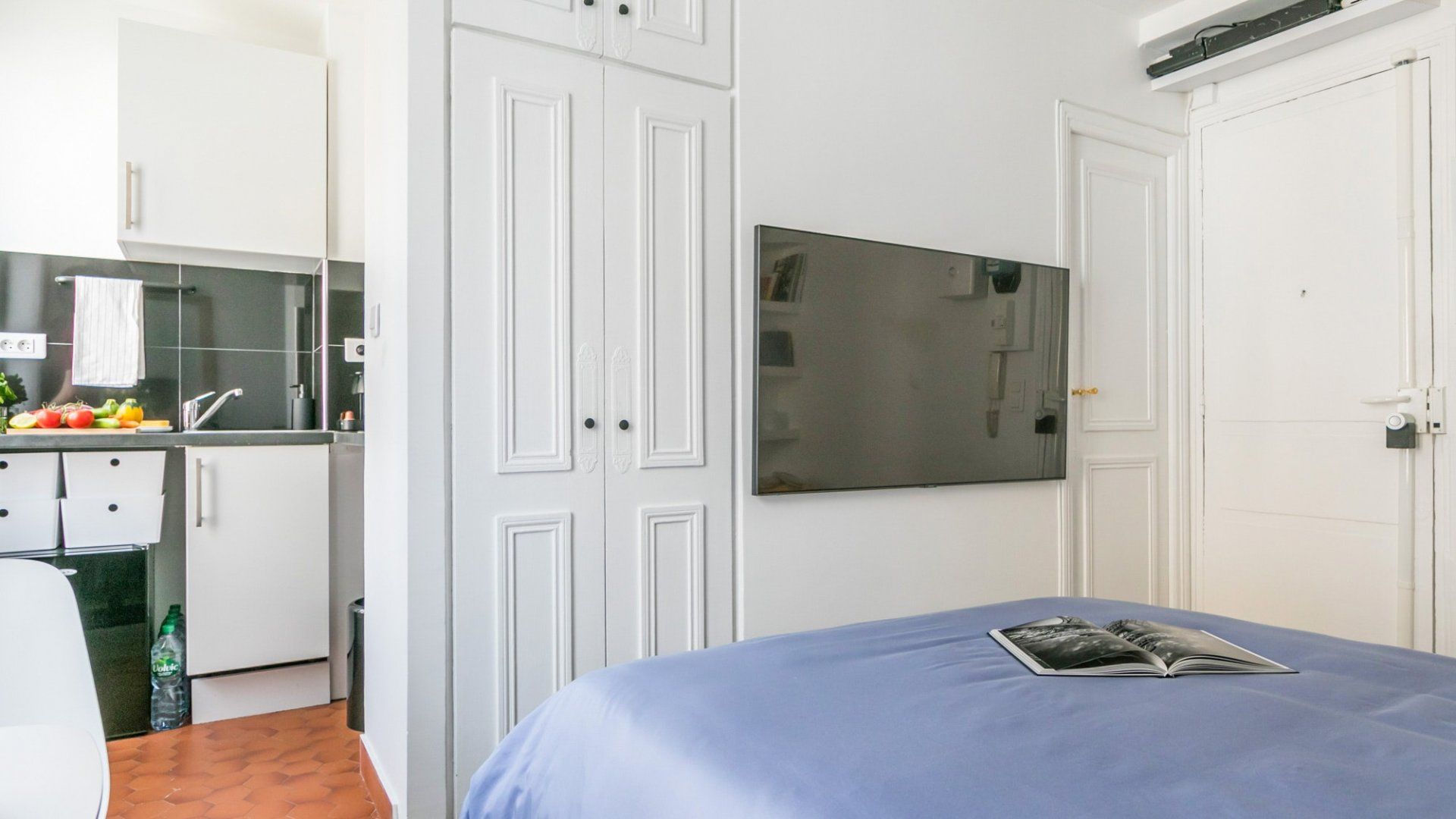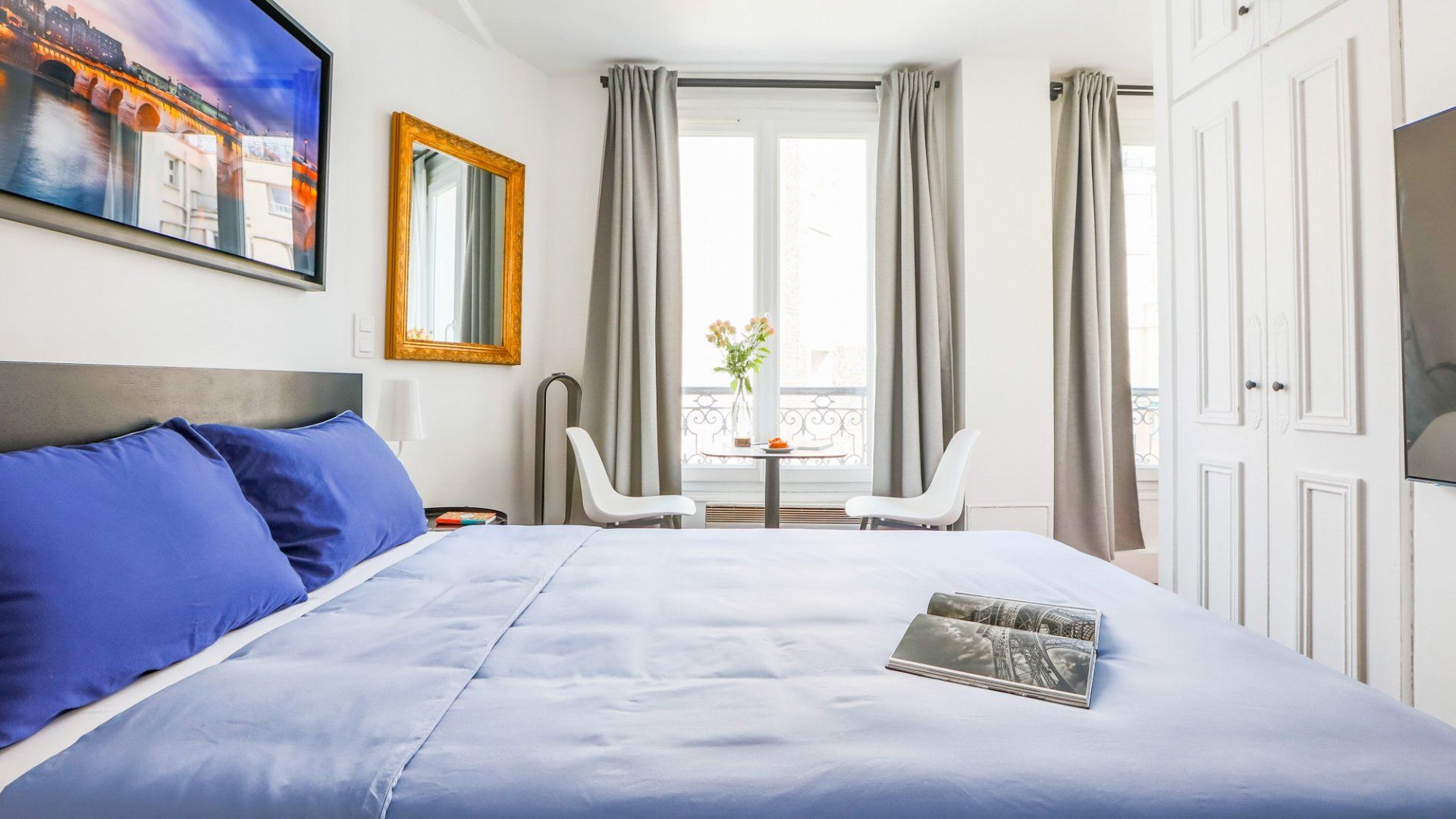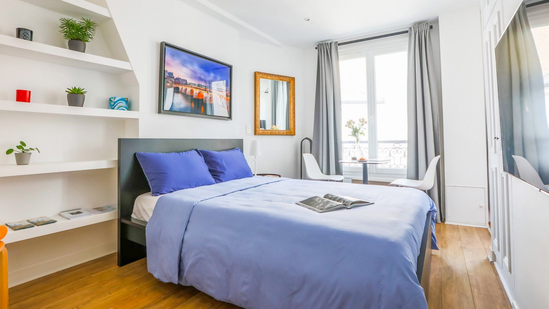 While the Champs-Élysées is known for luxury and opulence, this studio is an understated sanctuary in the heart of the 8th arrondissement. With modern bookshelves set into white walls, along with a traditional wrought-iron balcony framing the windowsill, there are some delightful contrasts in this home. And despite the cosy space and its minimalist decor, there are some very luxurious details that make it feel more like a hotel. Breakfast items are all included, as well as slippers, shower caps, toothbrushes, and incredibly comfy memory foam pillows. We love the window view – you’re looking down onto a communal courtyard of lush greenery, including a living wall and a bridge running over a tranquil water feature. It’s hard to believe that the hectic roundabout of the Arc de Triomphe is just over ten minutes away. Passing through this famous arch feels like going through an entrance to some of Paris’ most exclusive neighbourhoods. While you’ve got every designer store you could possibly ask for, you might want to soak up some culture at the Musée d’Art Moderne or Musée de l'Orangerie, both within twenty minutes from home. With metro stops as close as a three-minute walk, head out to explore this bustling city, safe in the knowledge that your studio is a peaceful retreat to return to.