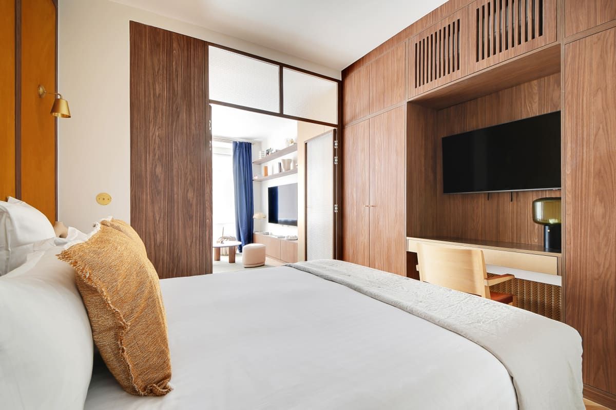 *The bedroom is separated from the living area by glass frosted doors.