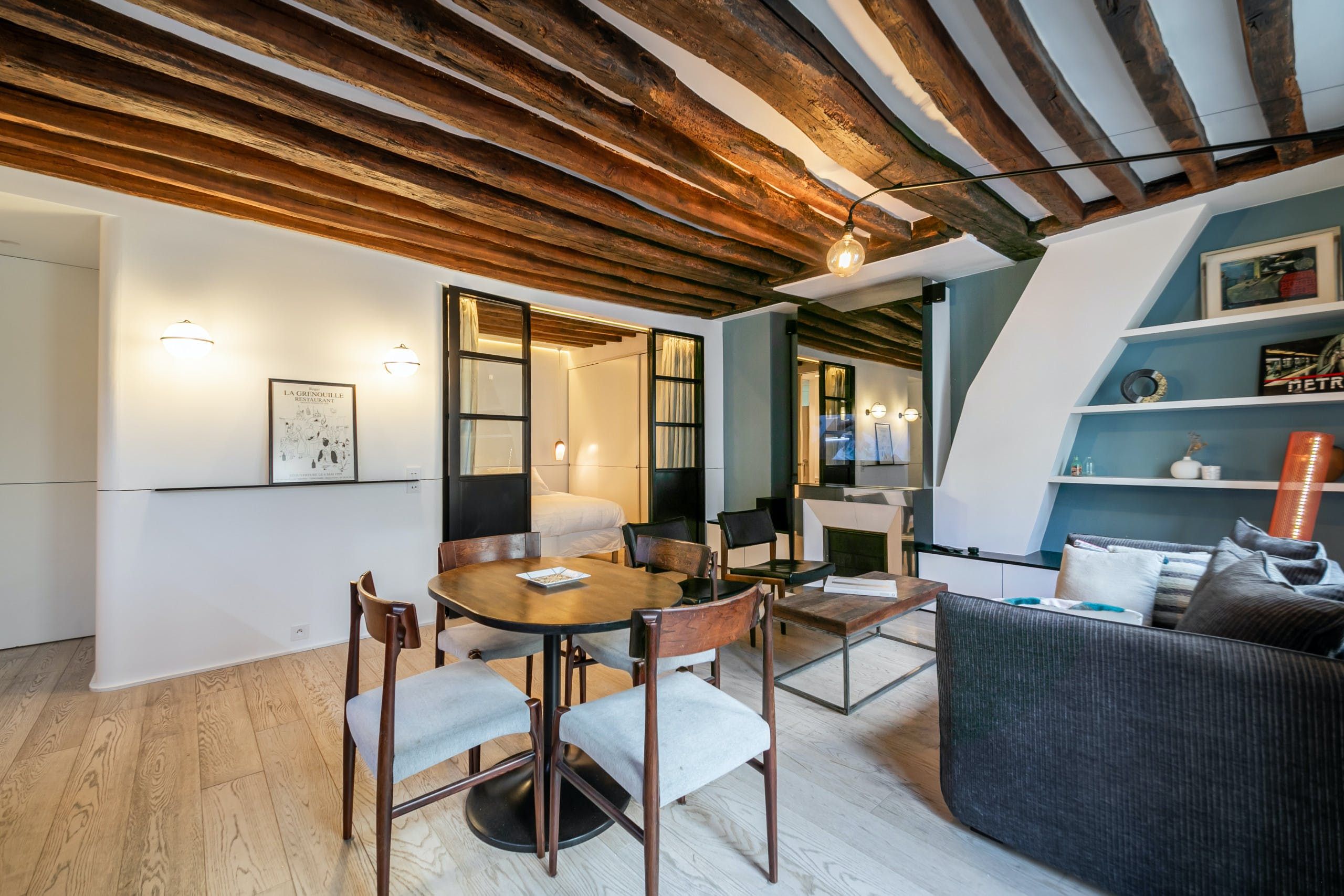 Île Saint-Louis is known for its timeless charm, and this apartment matches that vibe perfectly. Here you’ll find parquet floors, exposed beams, and vintage furniture in an apartment that’s warm and welcoming. Everything you need is close to hand here, whether you want to admire the Notre-Dame or stroll to the Marais for a spot of shopping. Easy transport links mean that you can explore the rest of Paris with no trouble at all.