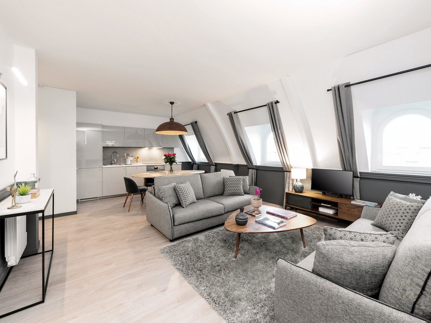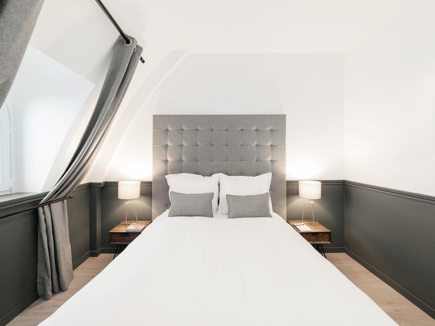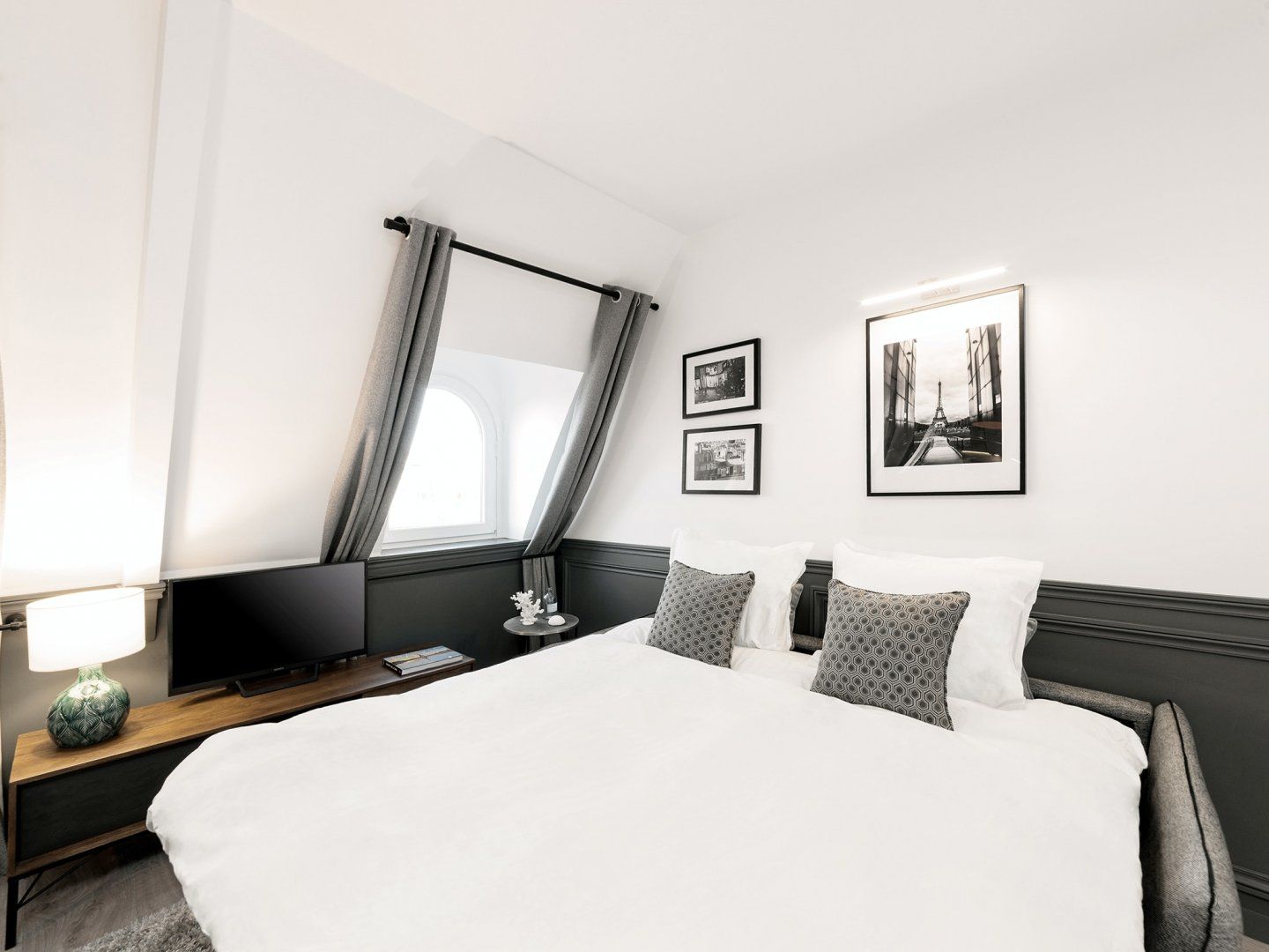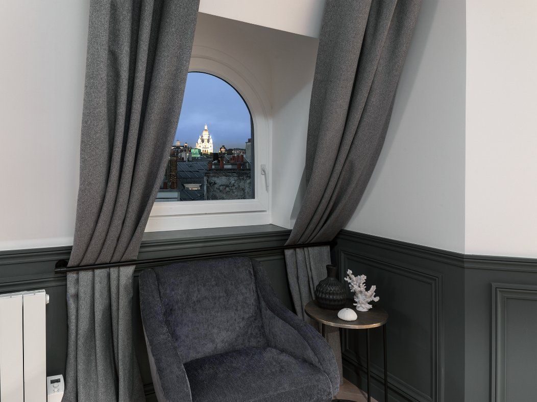 To make your stay in Paris truly special, you’ve got to sip champagne while looking out to the city at dusk, and see the Sacré-Cœur lit up on the skyline. And it’s even better when you can do this from the comfort of your own home. This fabulous abode is set up in the sloped roof of a 2nd arrondissement building, with multiple arched windows offering jaw-dropping views of the City of Light. The decor is understated (to let the views do the talking) with plush grey fabrics and furnishings taking pride of place in the huge lounge. This colour scheme continues throughout, with cushioned headboards and charcoal-grey tiled bathrooms. Sleek, stylish, and sophisticated, the home echoes the vibe of the neighbourhood. Less than a minute from Sentier metro station, this apartment is also convenient for trips around the city. But we recommend checking out the local delights. Wander around to find traditional kerbside cafés, classy bars, and plenty of delicious dining spots. Shoppers will love the flagship stores of Les Halles, just a nine-minute walk from home. Culture hunters can visit the striking ‘inside-out’ architecture of the Centre Pompidou, fourteen minutes away.