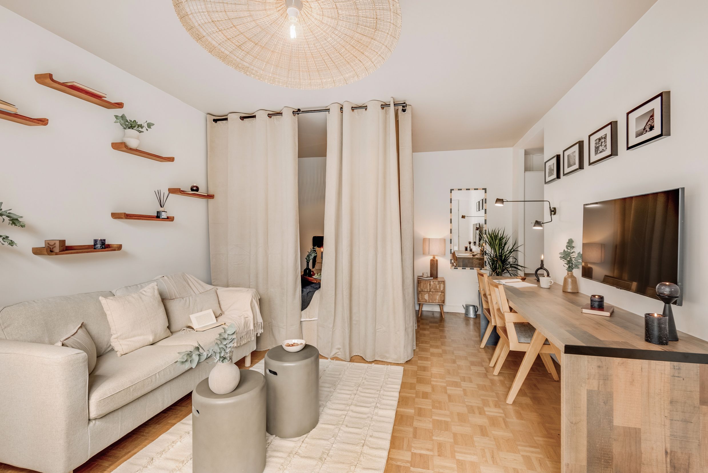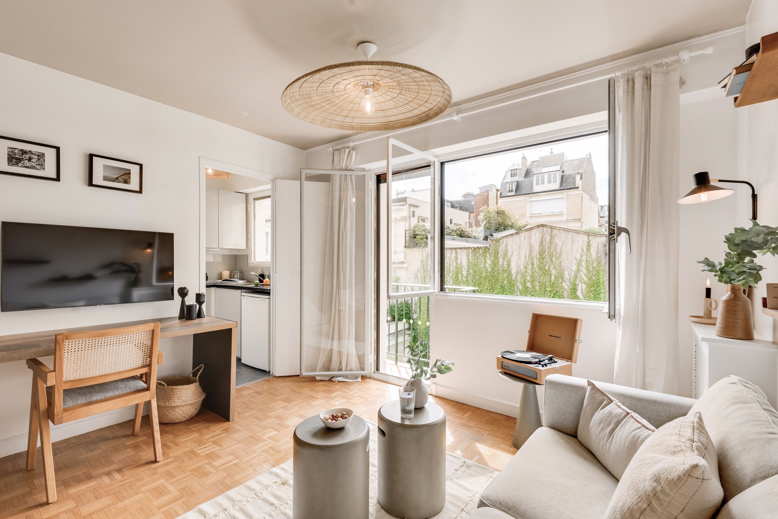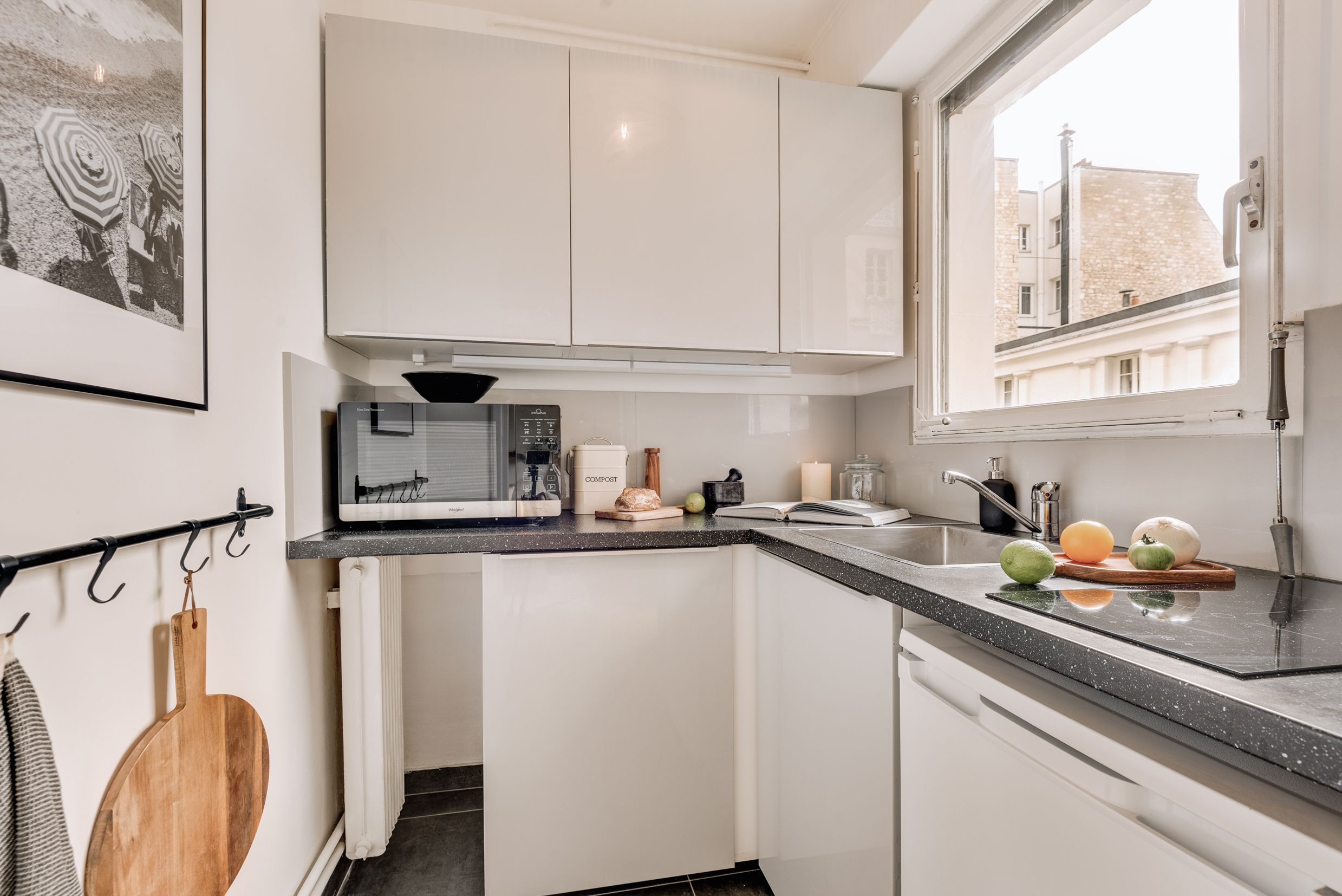 This studio apartment is located in the neighbourhood of Auteuil, sandwiched between the River Seine and the Bois de Boulogne. It may be compact, but there’s a comfortable sofa for relaxing on after a busy day seeing the sights and you can throw open the door to the small balcony to maximise the space. While the kitchen is ideal for preparing snacks and light bites, it doesn’t have an oven – the perfect excuse for heading to one of the local restaurants for a Boeuf Bourguignon.