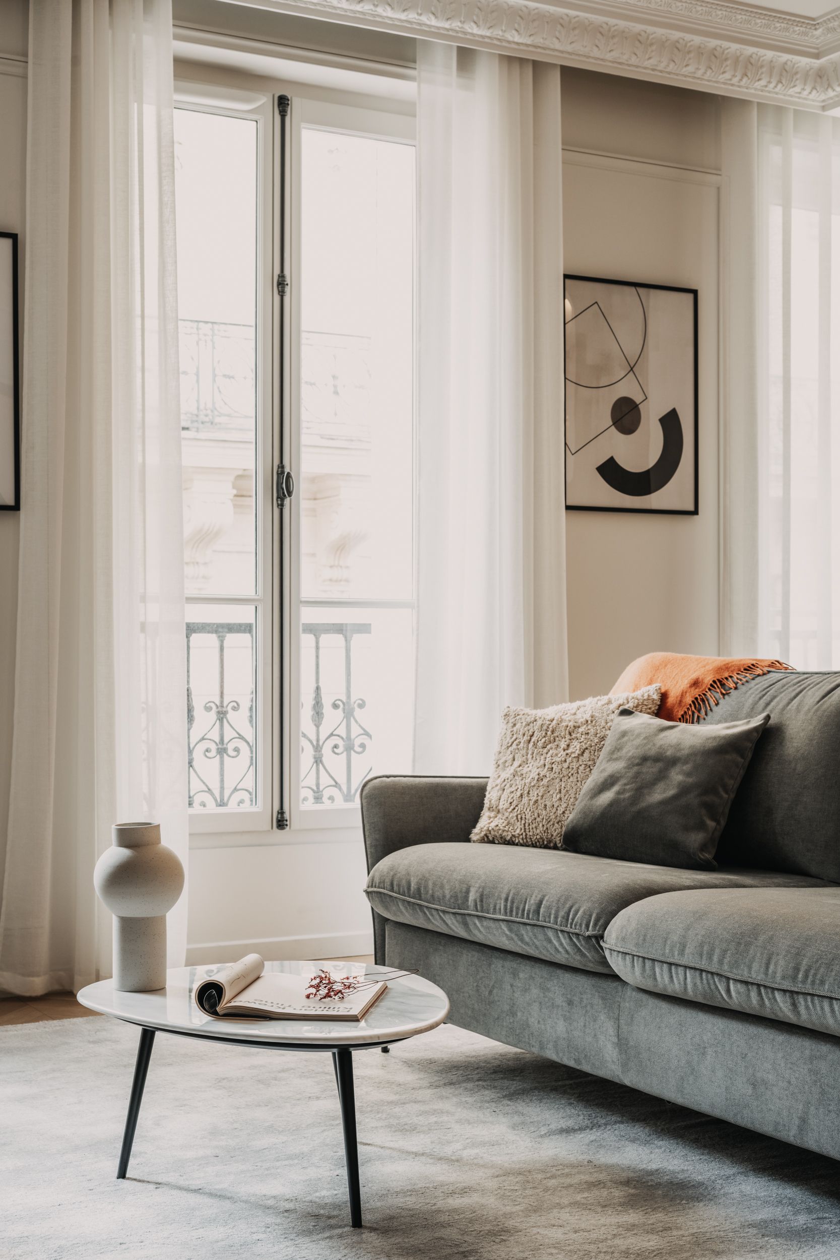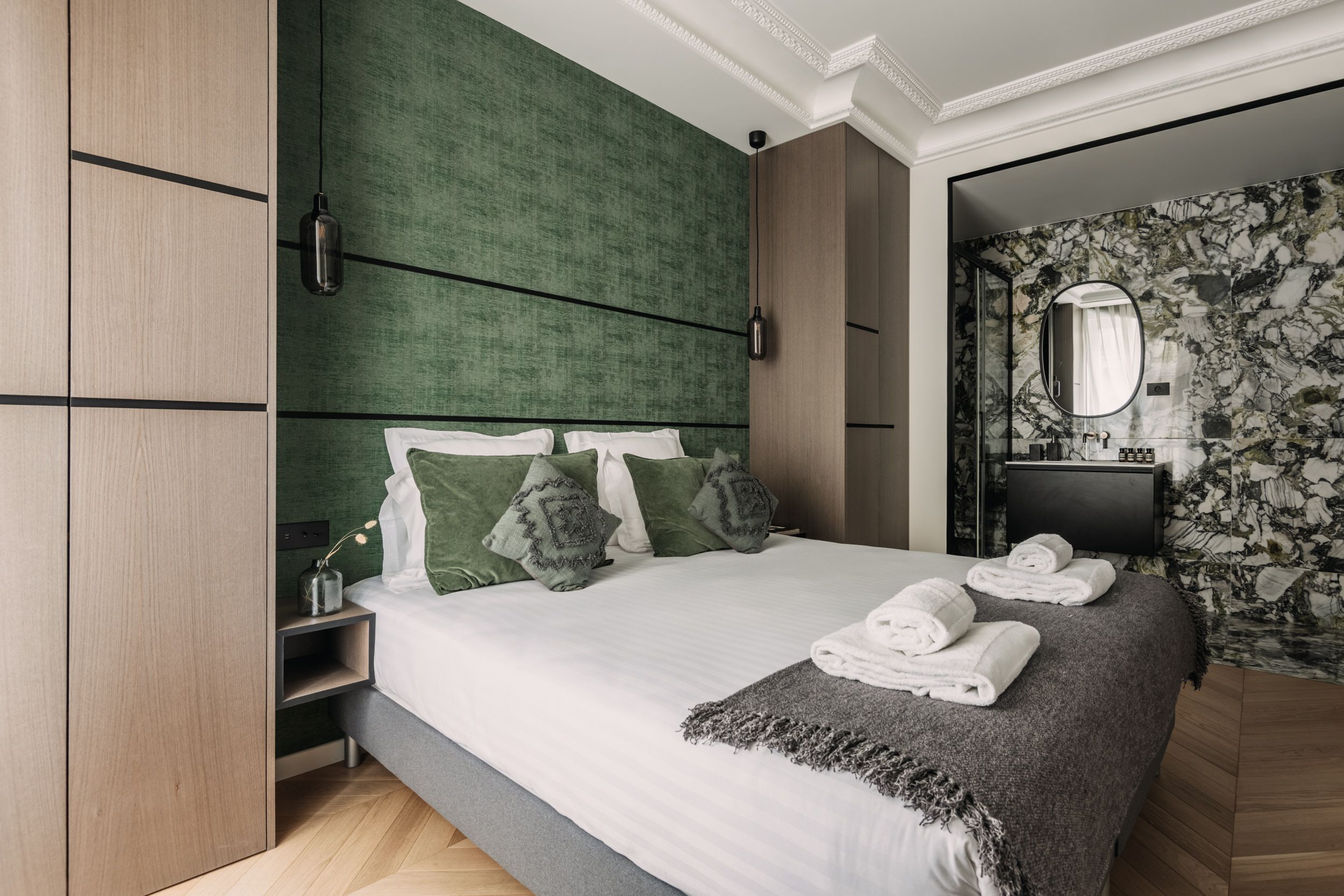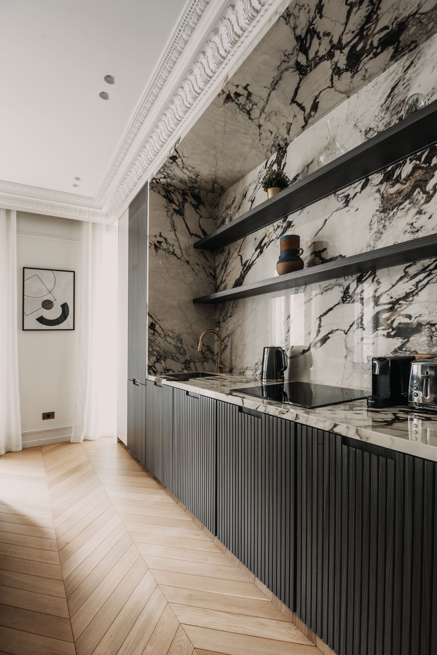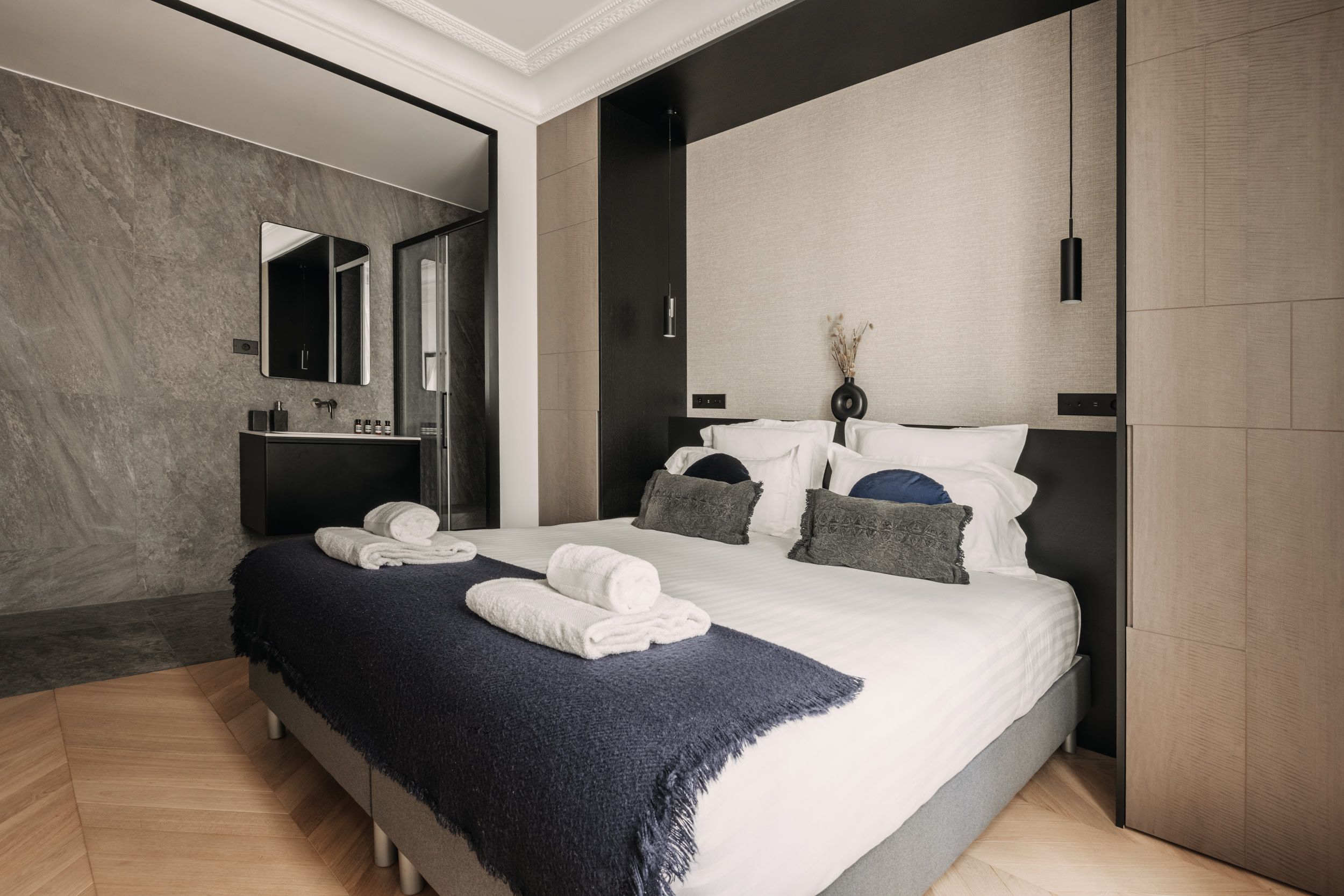 Well suited to groups of friends coming together for a city getaway, each of the king-sized bedrooms boast a pristine en-suite bathroom for that extra privacy. And the entire home is flooded in natural light thanks to the ornate Juliet balcony doors. It's an elegant reminder of the grand Haussmann beginnings of this period property.