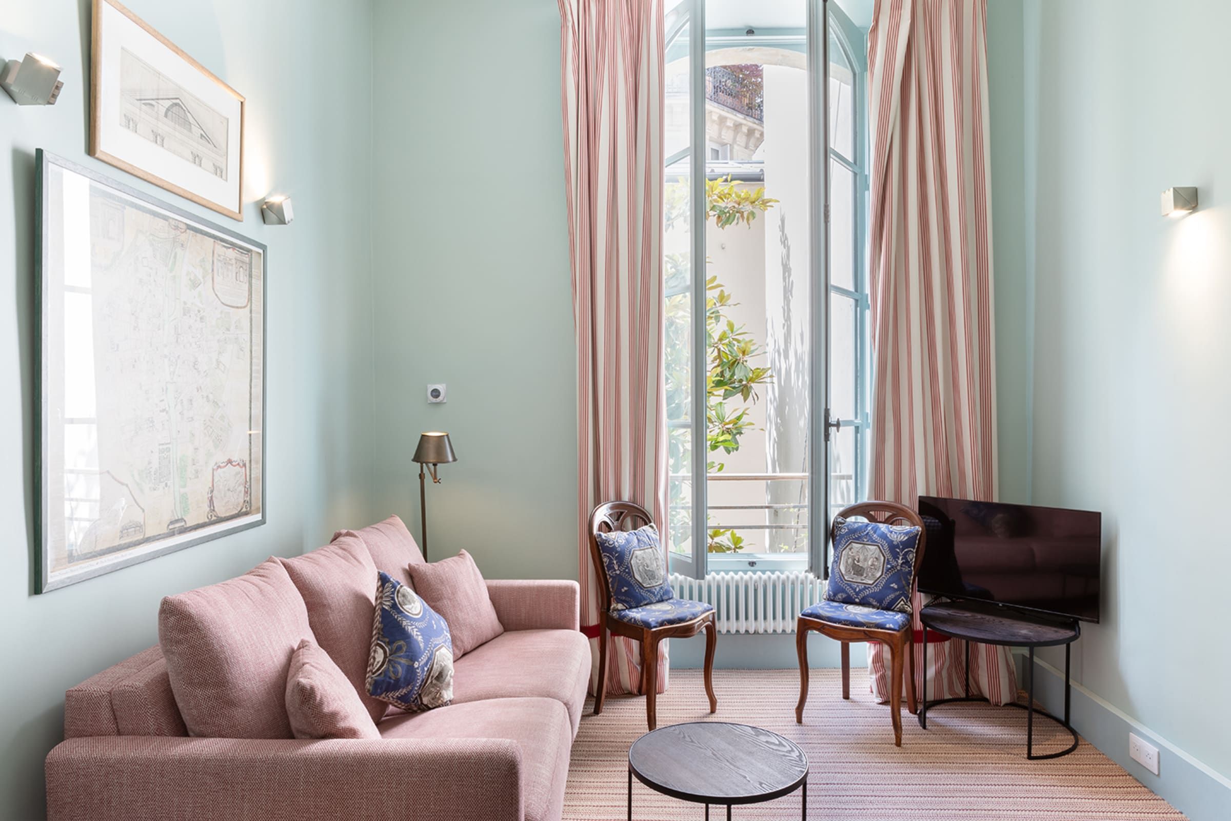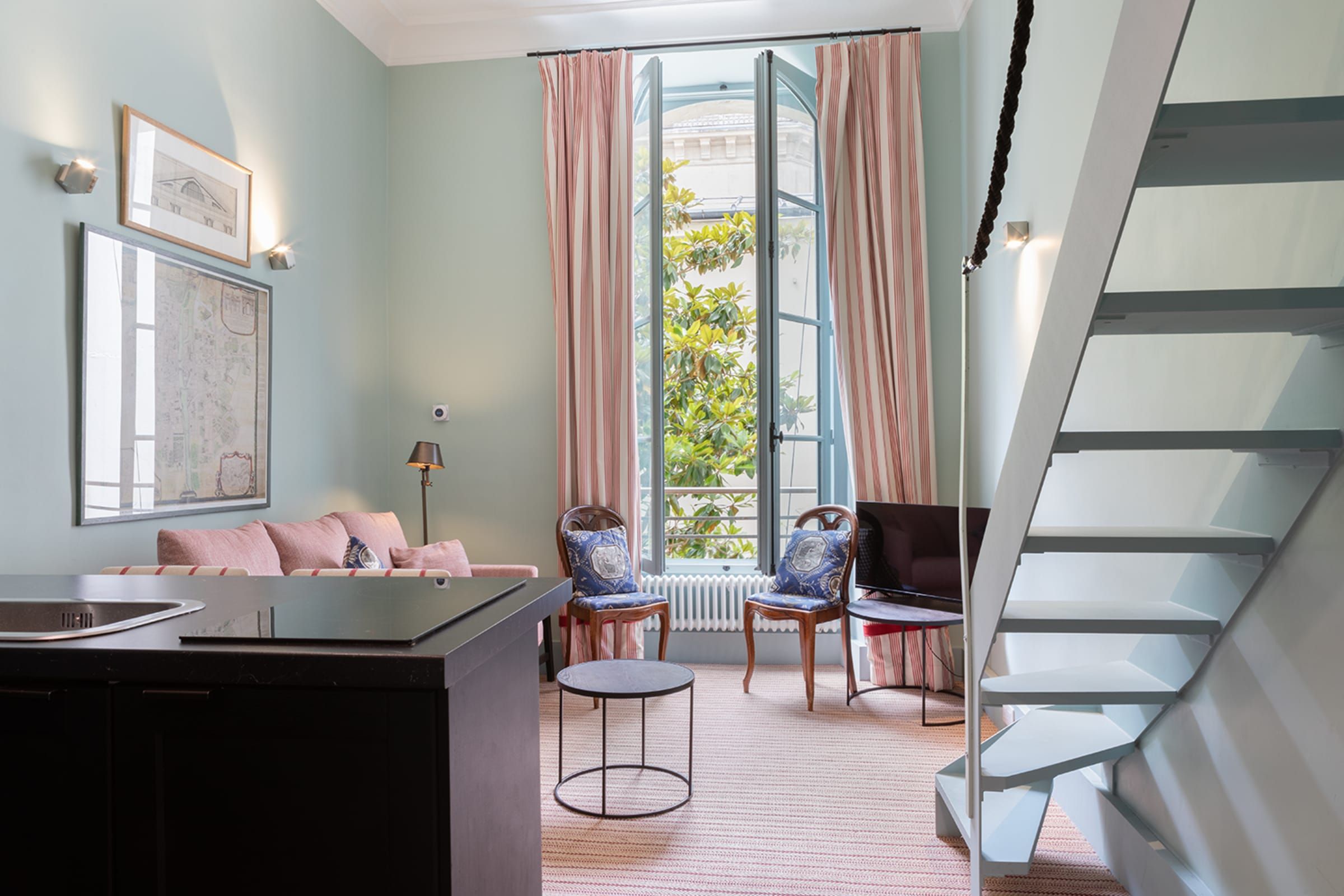 Surrounded by restaurants and chic coffee shops, this apartment is an excellent place to stay, location-wise. There are several museums nearby, as well as the beautiful Jardin du Luxembourg. You’ll also find a variety of stores in the neighbourhood, including Le Bon Marché. Back at this studio-style apartment, set over two levels, there’s a cosy open-plan living room with a kitchenette. It's compact, like the rest of the place, but it has everything you probably need. Upstairs, on the mezzanine, there’s a bedroom – this space has relatively low ceilings, so it might not suit taller guests. Otherwise, this is a great little pied-à-terre with a fantastic address.