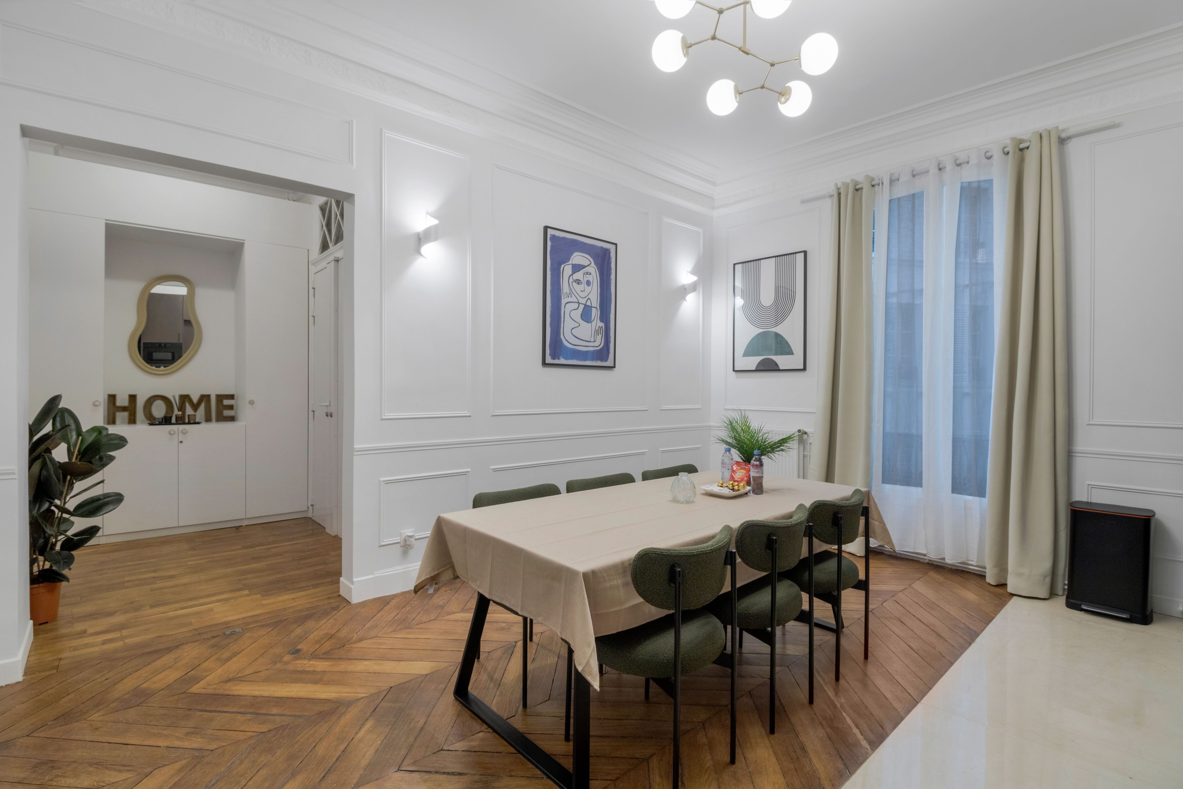 Spacious and well-located, this apartment offers a practical yet characterful stay in Paris’ lively 10th arrondissement. You’ll be close to the Canal Saint-Martin, with its waterside cafés and boutiques, and just a short metro ride from the Eiffel Tower and Marais. The home features four comfortable bedrooms and a matching amount of bathrooms, making it a solid choice for families or friends travelling together. The open-plan kitchen-dining space is ideal for relaxed dinners, while the piano in the living room brings musical delight and liveliness to hosting.