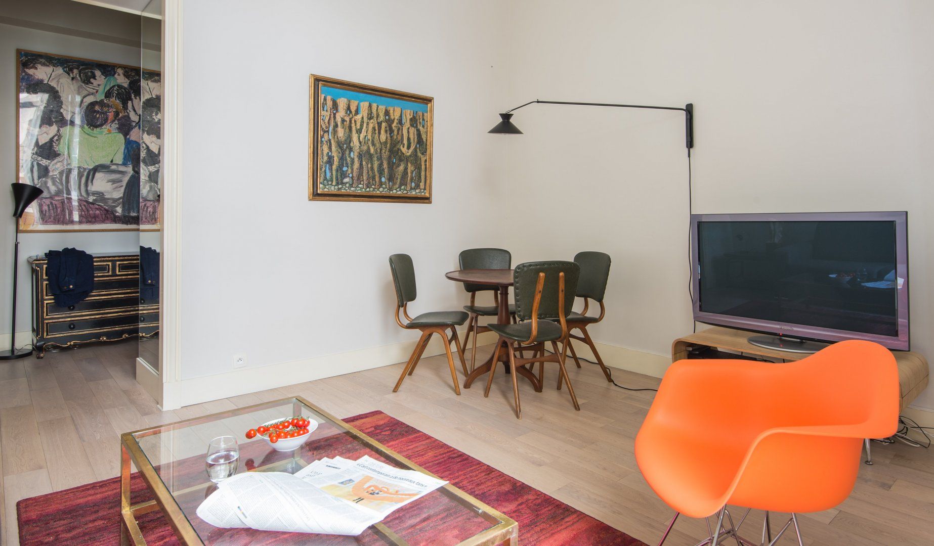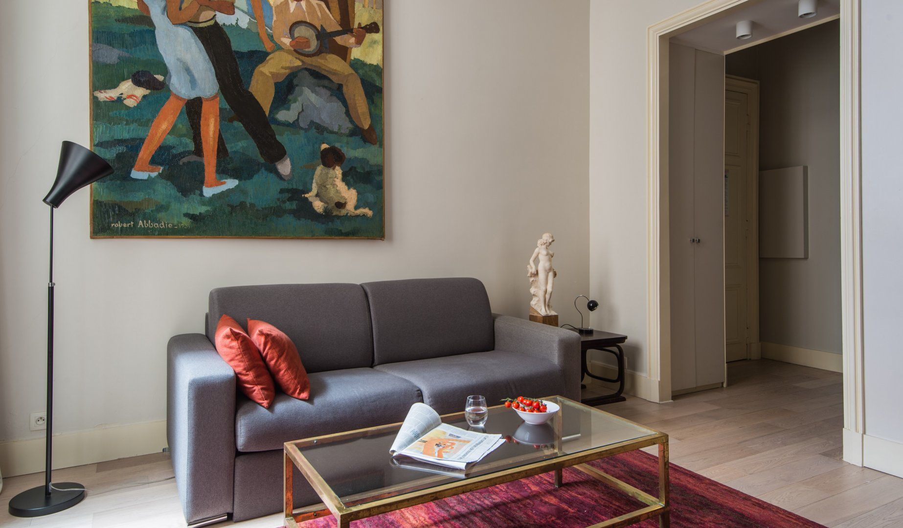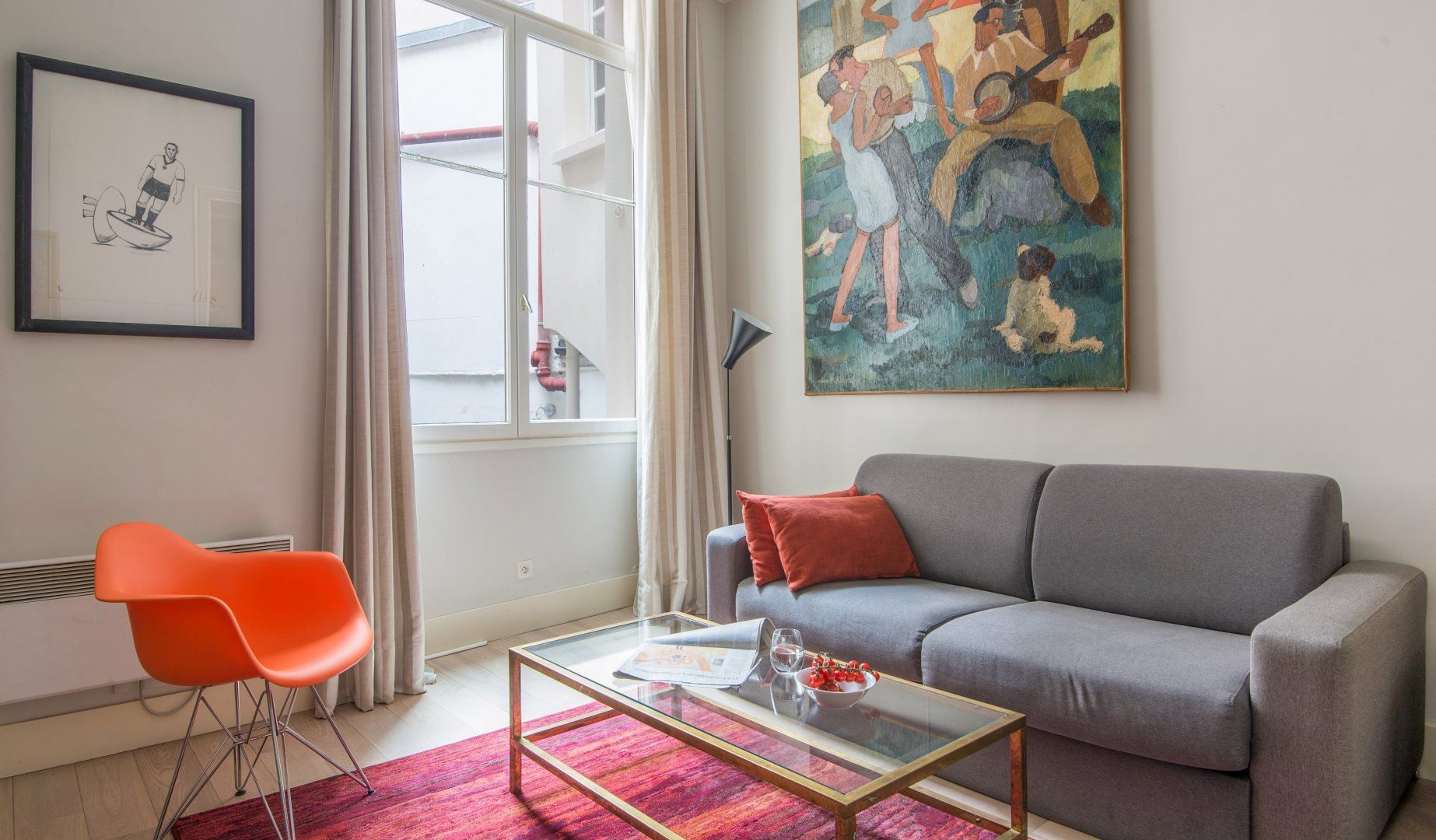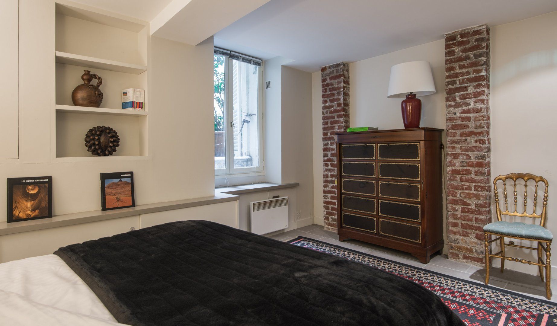 Tucked away in a Marais courtyard, sheltered from the nearby hustle and bustle, this one-bedroom ground floor apartment is simple but stylish with its statement wall art and clean lines. This home is definitely one for the culture vultures, and you're spoiled for choice when it comes to nearby museums. Still, it's the Musée National Picasso-Paris and the Maison Européene de la Photographie that should be at the top of the list. Elsewhere Le Marais is known for offering Paris' best shopping experience along the nearby Rue des Francs Bourgeois, a selection of fantastic restaurants to suit any budget, as well as being the hipster hub of the city's LGBTQ+ scene. If you feel the urge to explore further afield, you're well served by the Metro, which can have you tramping around the majority of tourist sights in around twenty minutes. With the delights of the Marais are at your fingertips, you'll love coming back to this quiet haven at the end of a day spent exploring.