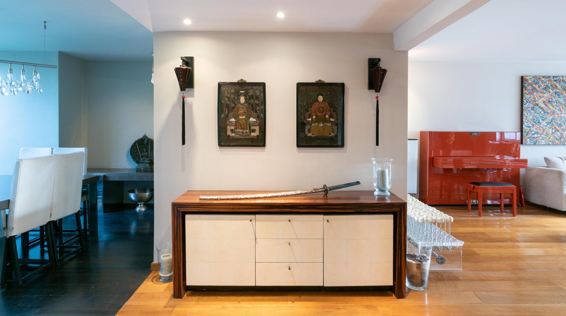 Stepping in to look around the decor, you'll notice a Samurai sword, antique Asian adornments, a bright red piano, striking abstract artwork and artistic objects that will have you feeling as if you've walked into a gallery or museum in the best possible way. Effortlessly chic, the mid-century furnishings, wooden floors and ample natural light make it a stylish yet homely space to unwind after a day roaming around the City of Lights below.