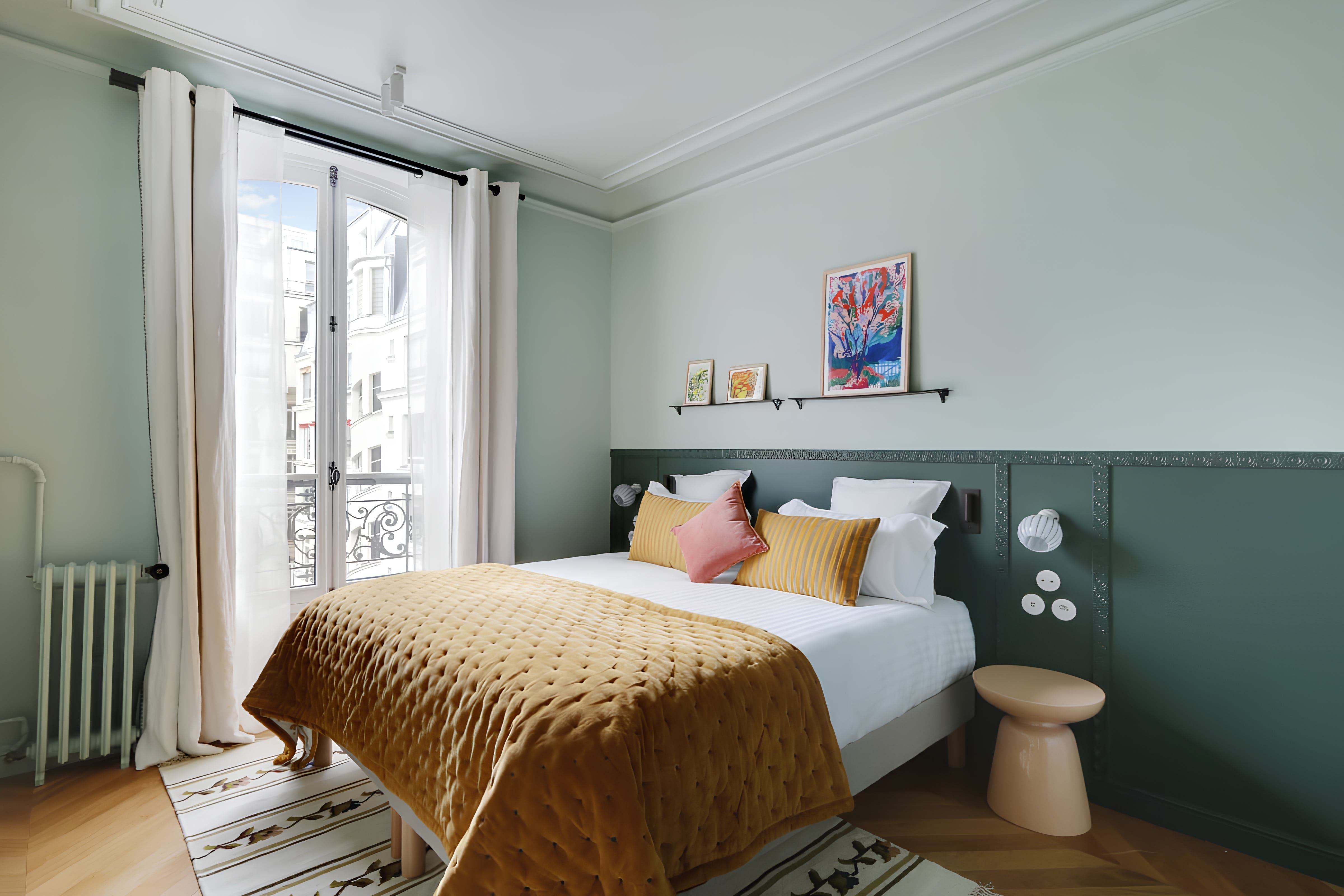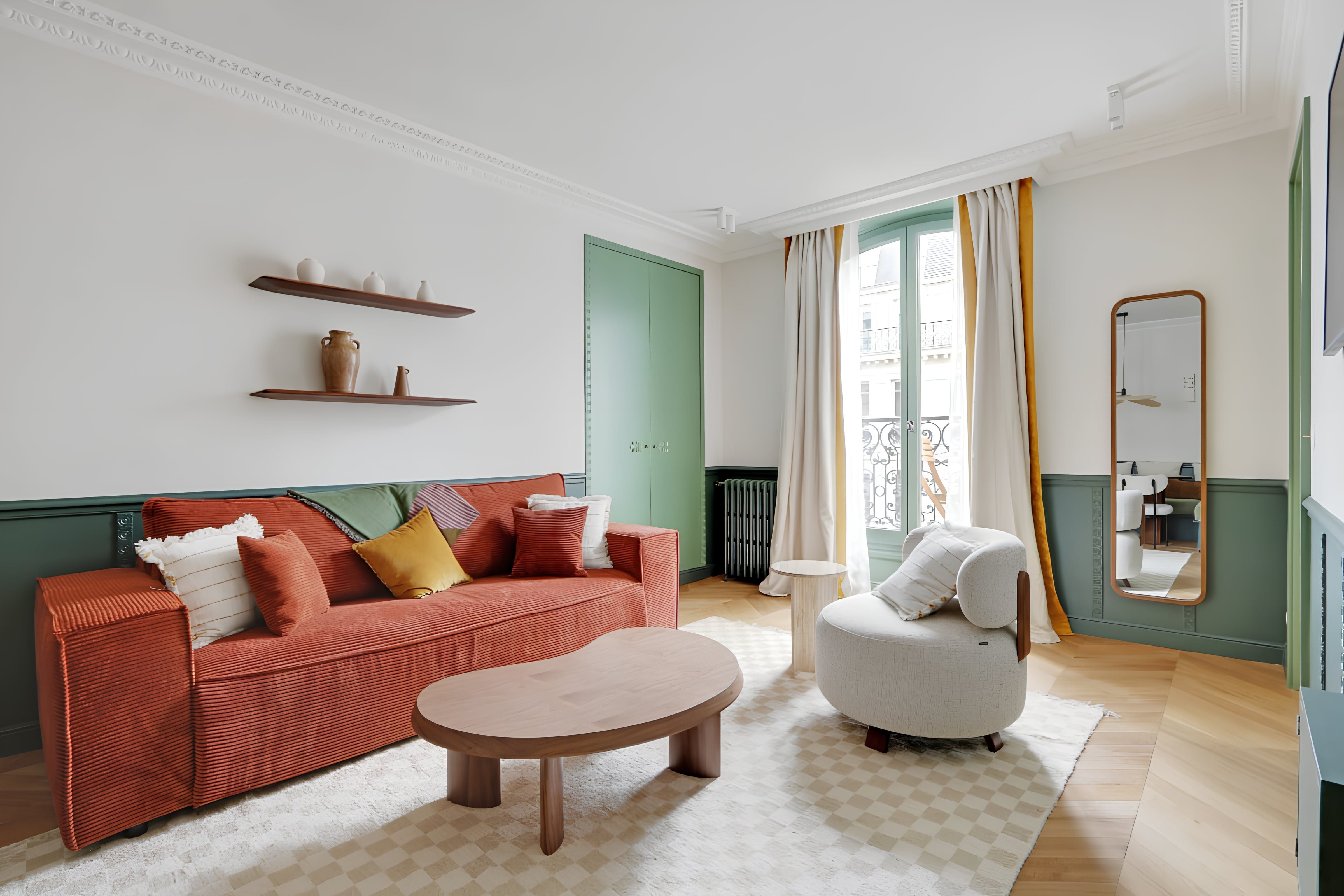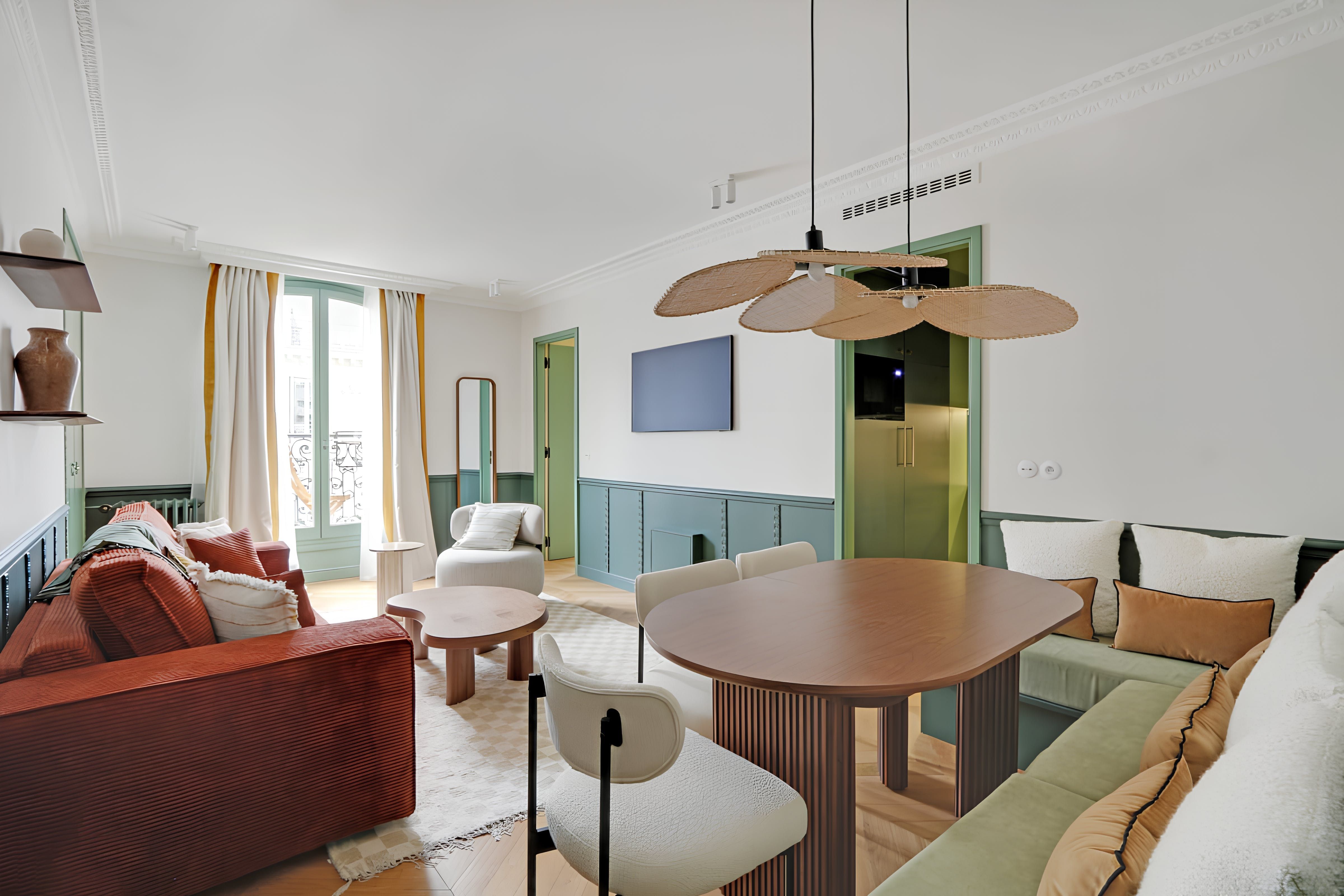 Housed in a typical Haussmann building in the heart of Paris, this apartment is right in the mix. You'll find boutiques, restaurants and cafes on your doorstep as well as plenty of public transport options for travelling to the city's most iconic landmarks. At home, the colourful appearance and comforting spaces will help to recharge your batteries after busy days of sightseeing. But the real standout here is the charming balcony, which serves as a great spot to watch the hustle and bustle of the city streets below. Note that two people will be sleeping on a sofa bed at full capacity.