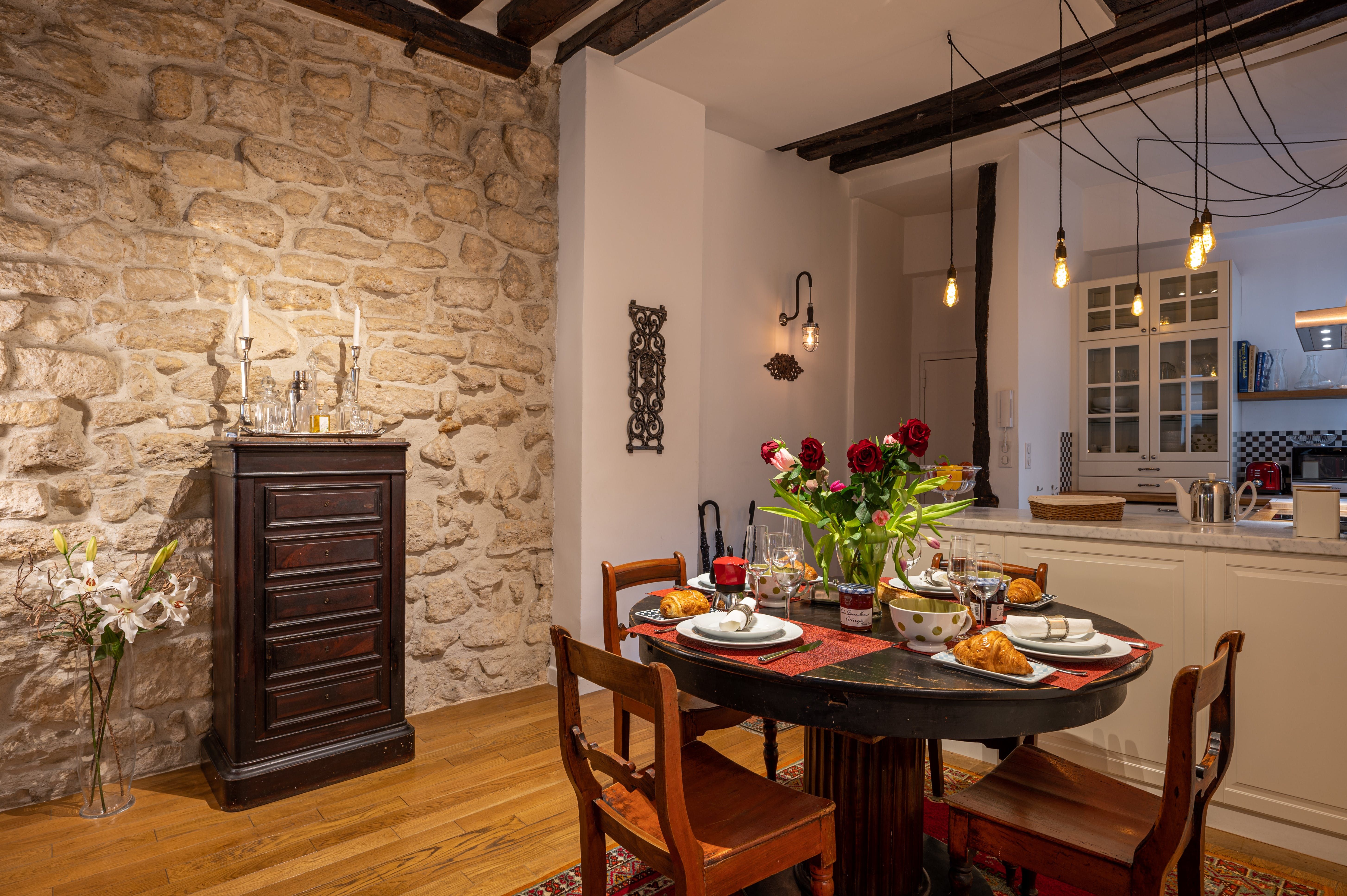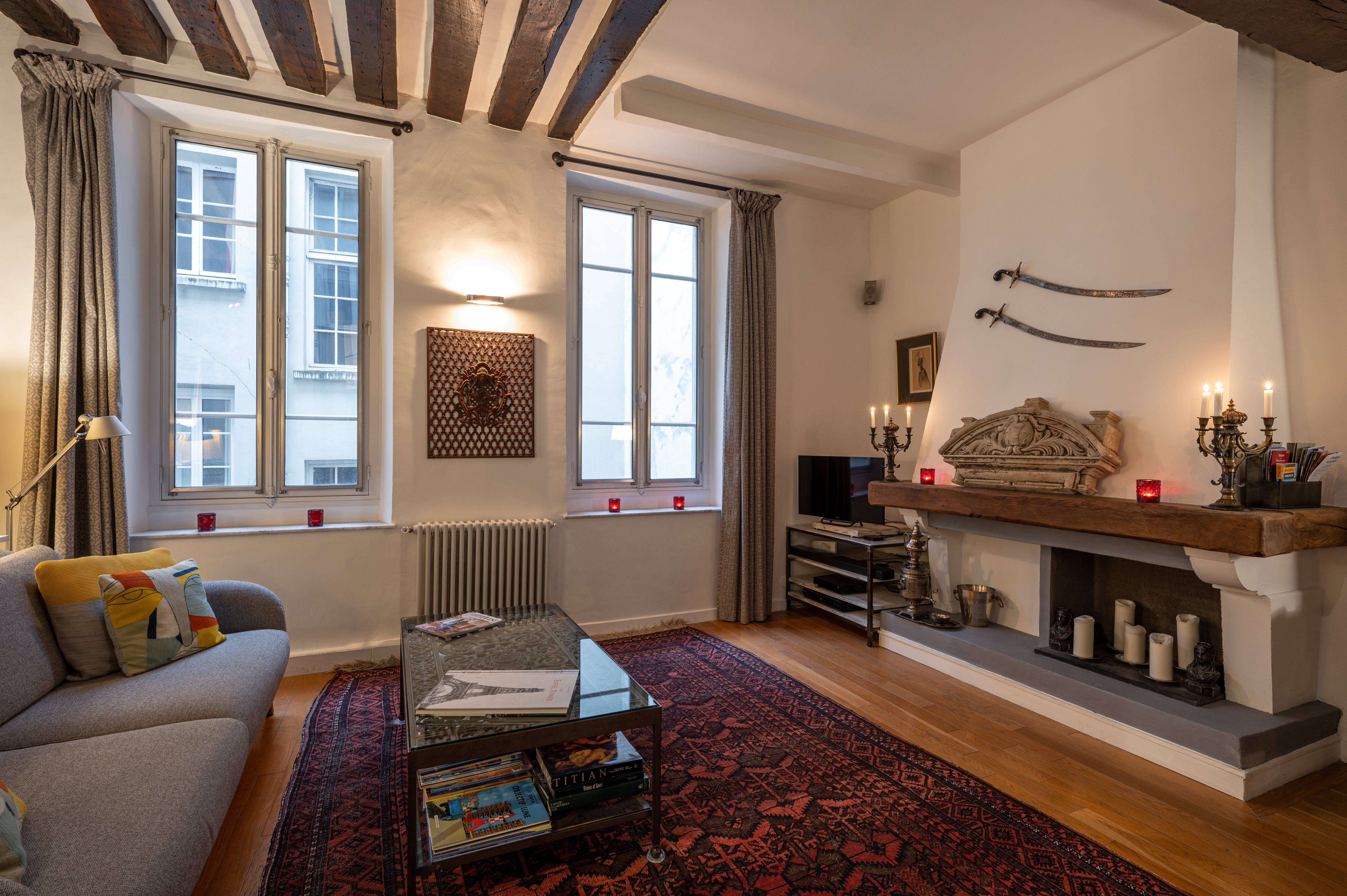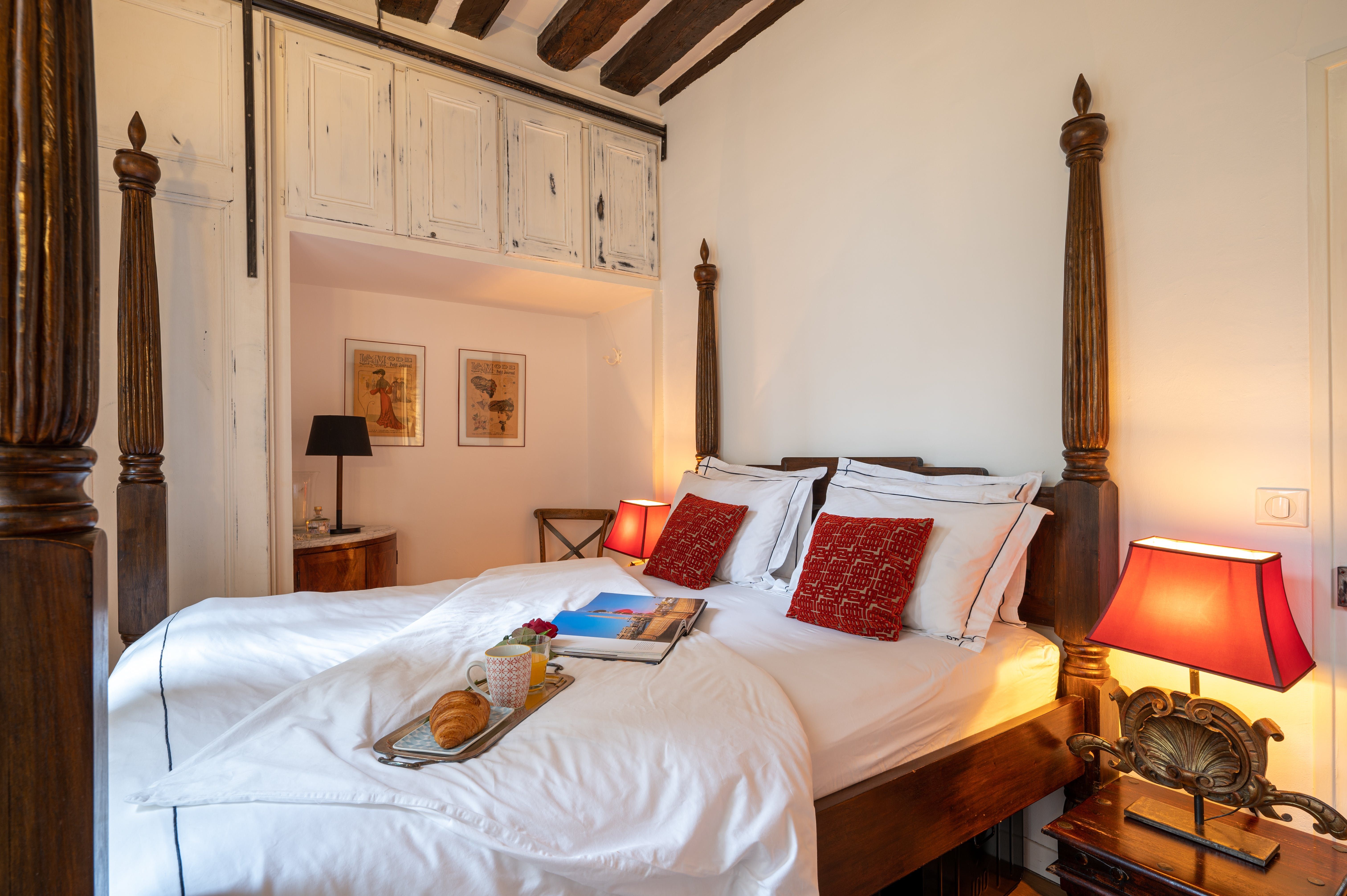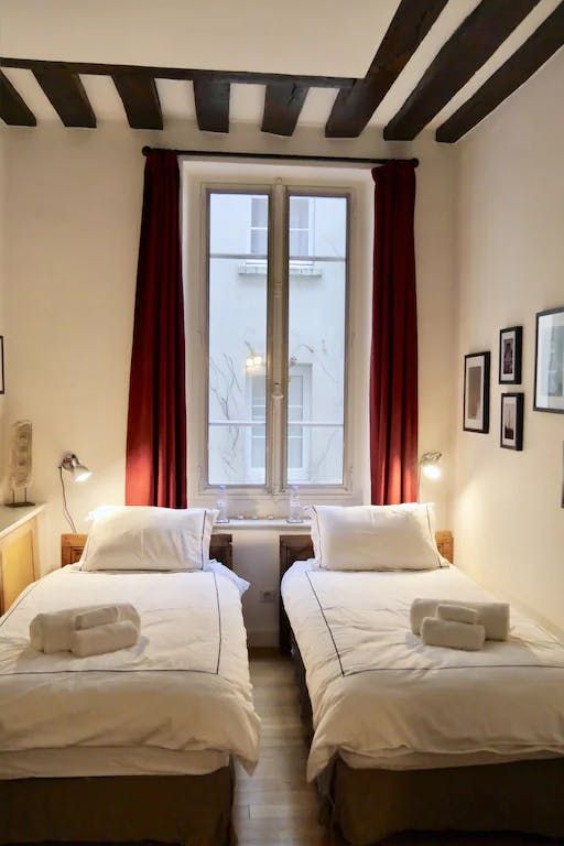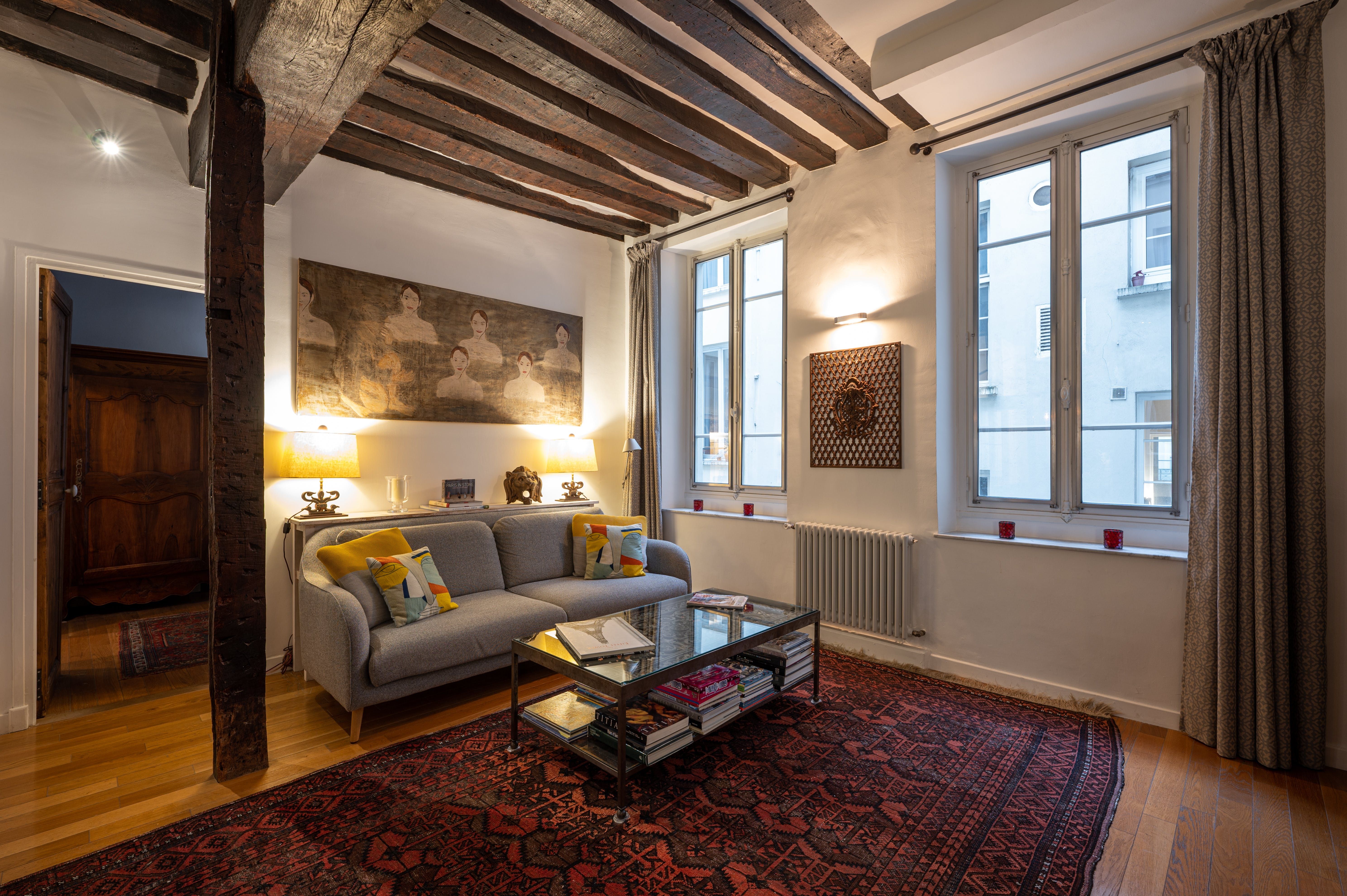 This two-bedrooms apartment located in the Marais exemplifies the typical home of this district. Recently renovated, it's keep some original elements such as the exposed wood beams, the parquet flooring and the black and white marble in the bathrooms. It would be ideal for a group of friends who want discover this charming neighbourhood.