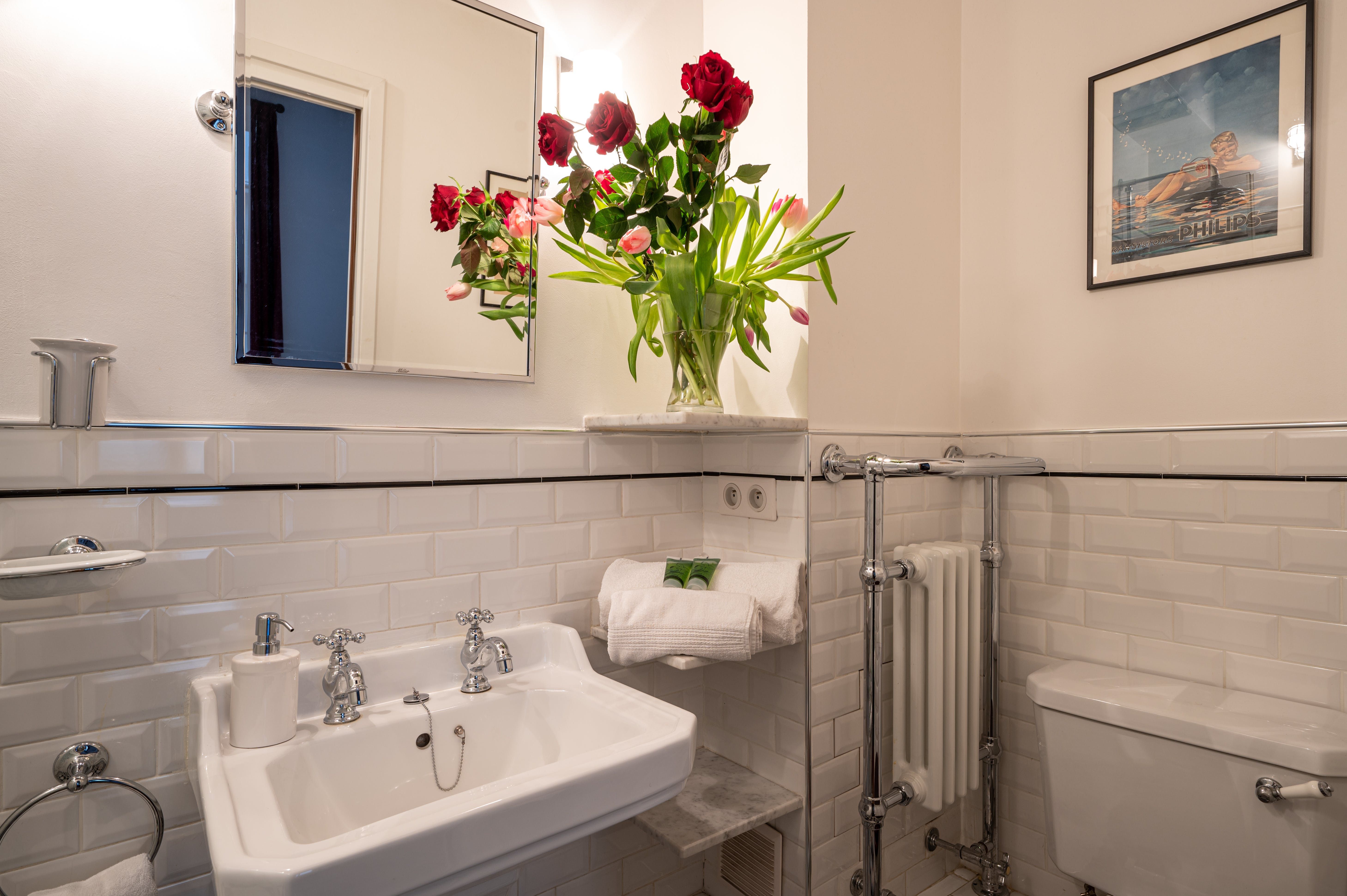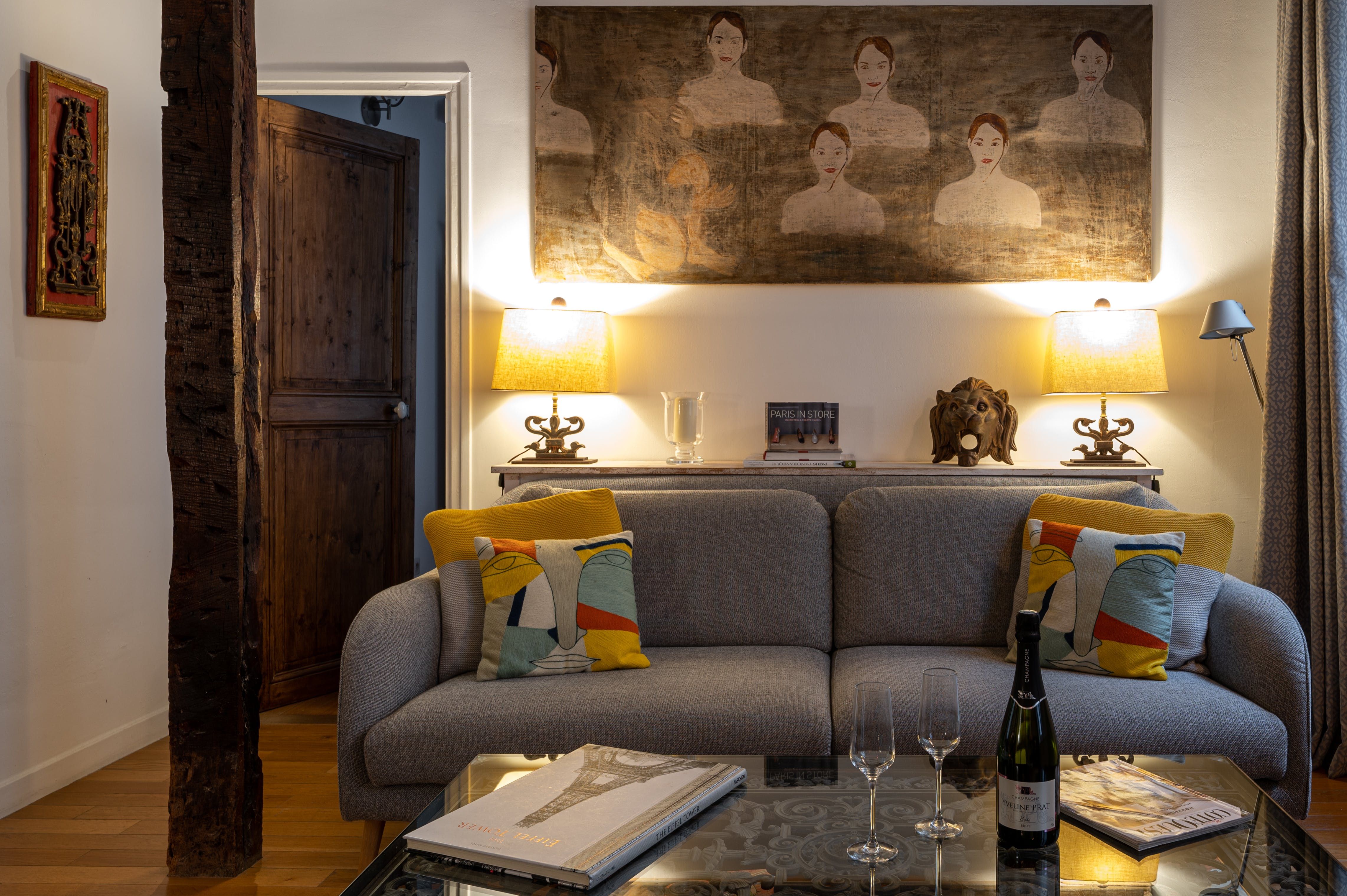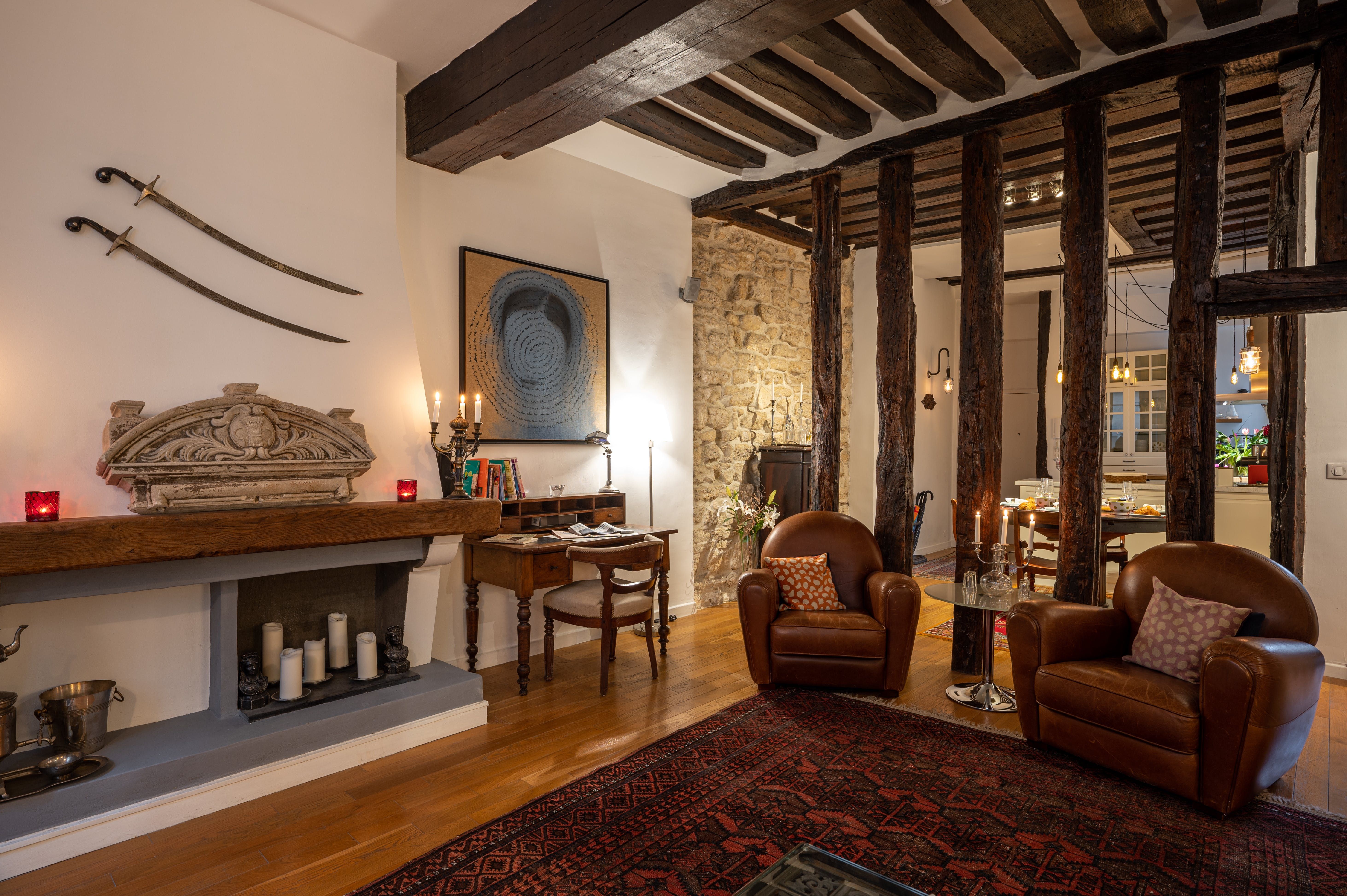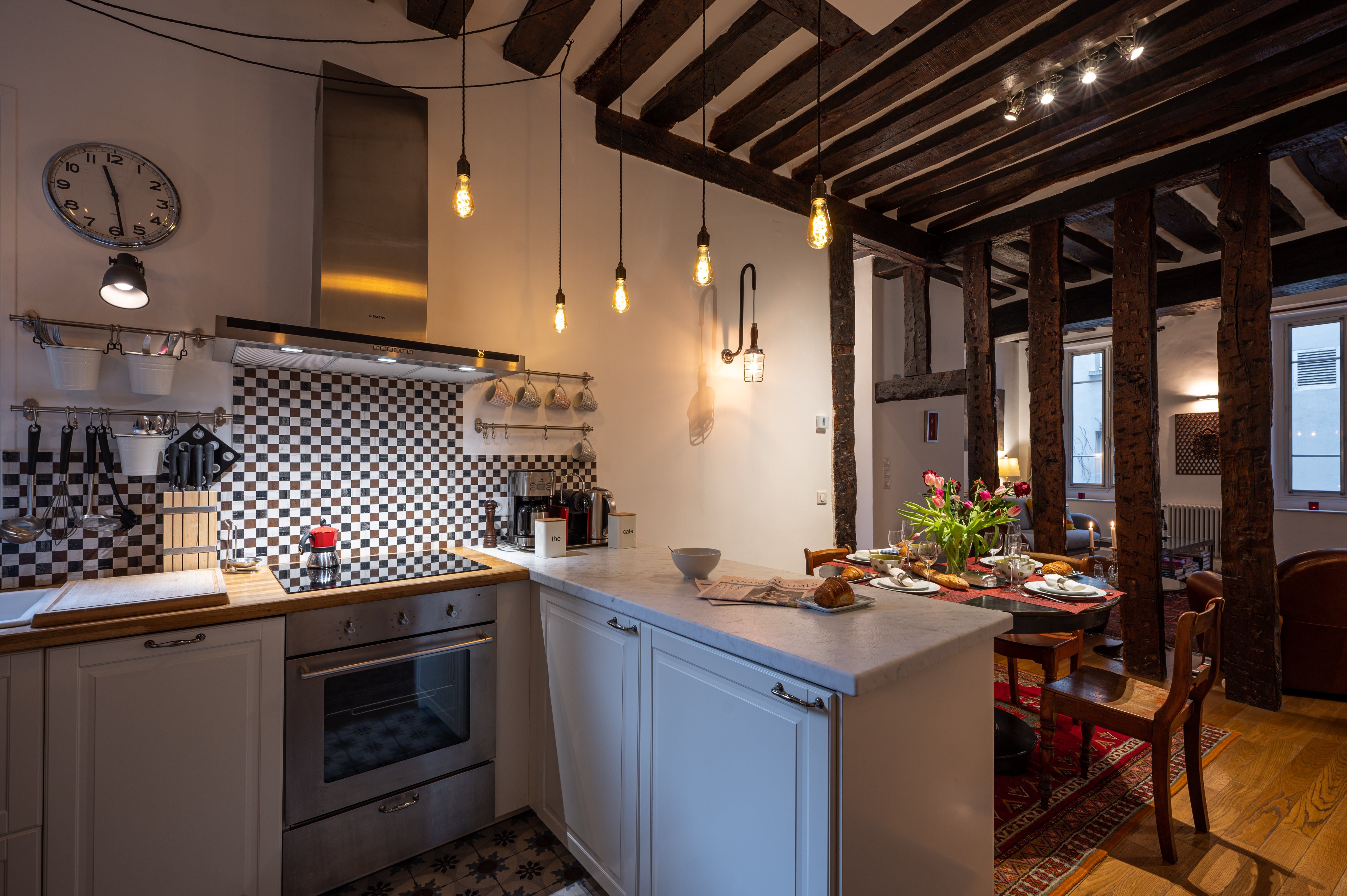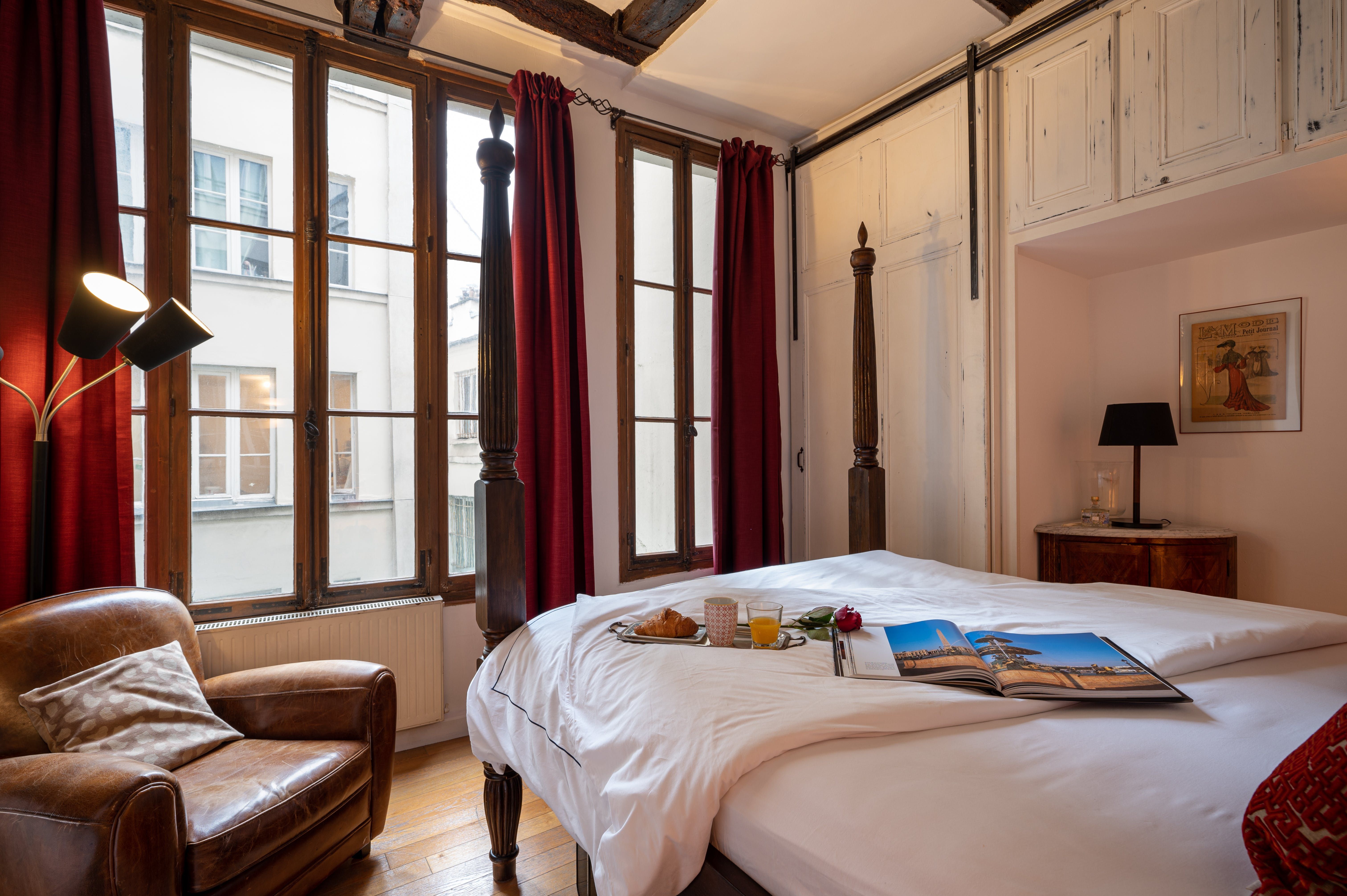 This two-bedrooms apartment located in the Marais exemplifies the typical home of this district. Recently renovated, it's keep some original elements such as the exposed wood beams, the parquet flooring and the black and white marble in the bathrooms. It would be ideal for a group of friends who want discover this charming neighbourhood.