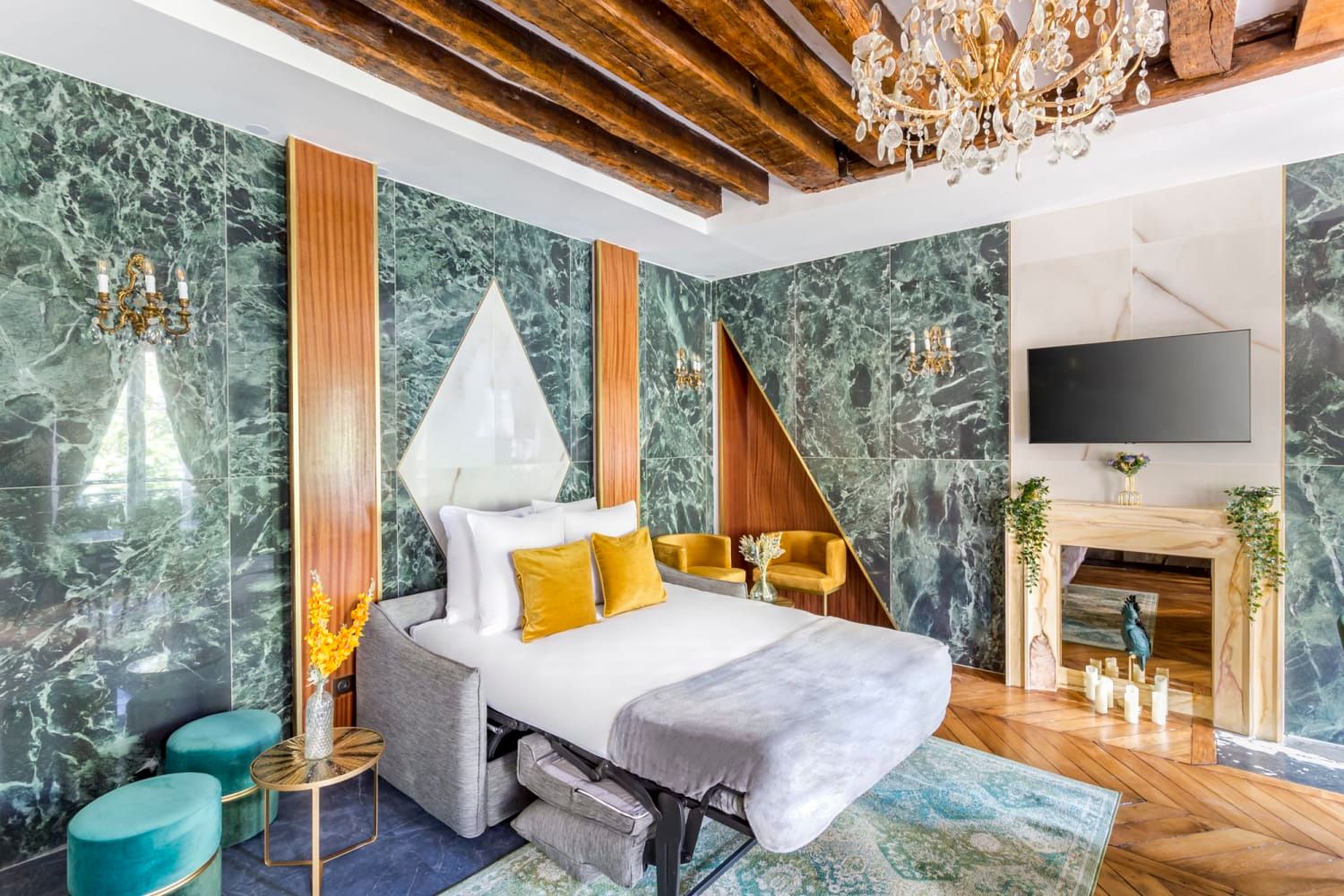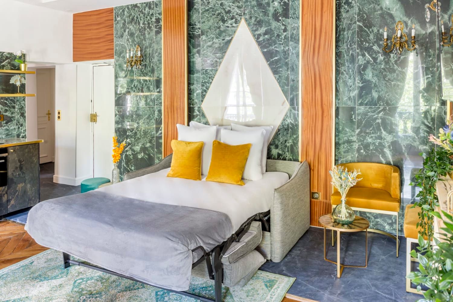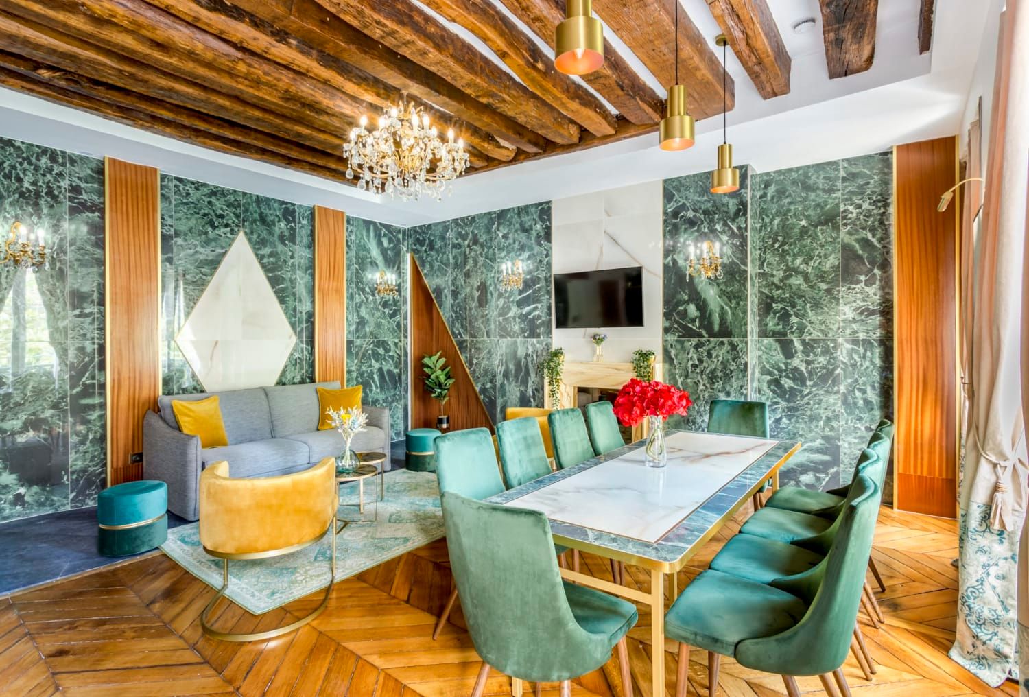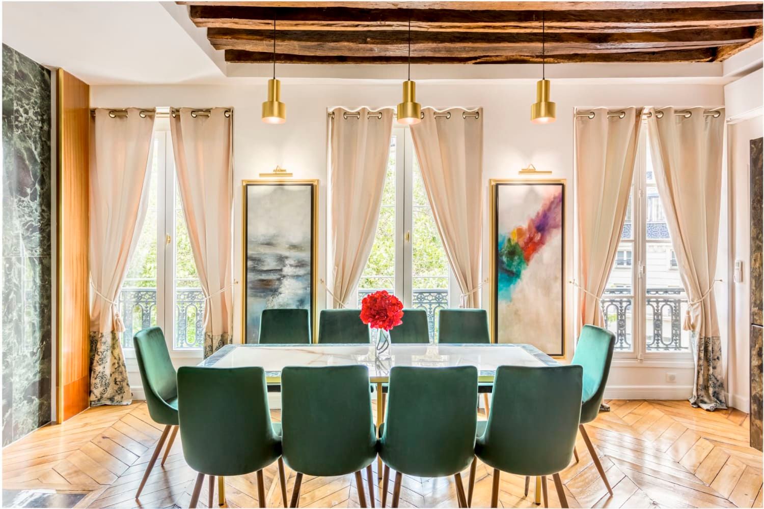Back at this apartment, located in a beautiful period building, this colourful abode was designed by a renowned Parisian architect and mixes contemporary French design with character features. We love the old beams, luxurious marble finishes, crystal chandeliers and herringbone parquet floors. The sumptuous bedrooms are perfect for getting some rest after a busy day in the City of Light. We particularly adore the master bedroom with its gorgeous clawfoot bath. This place is ideal for a group of friends, family or business professionals.