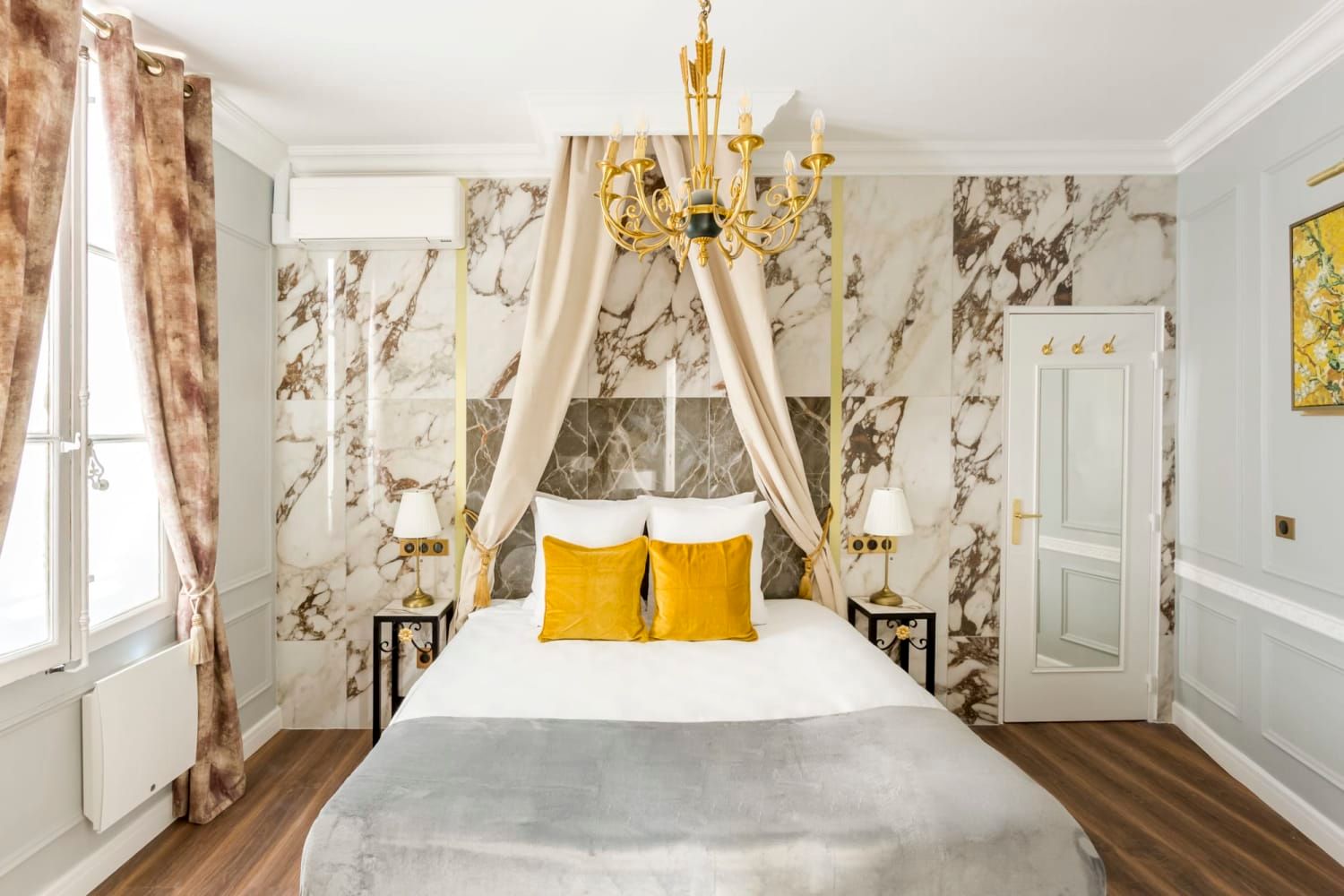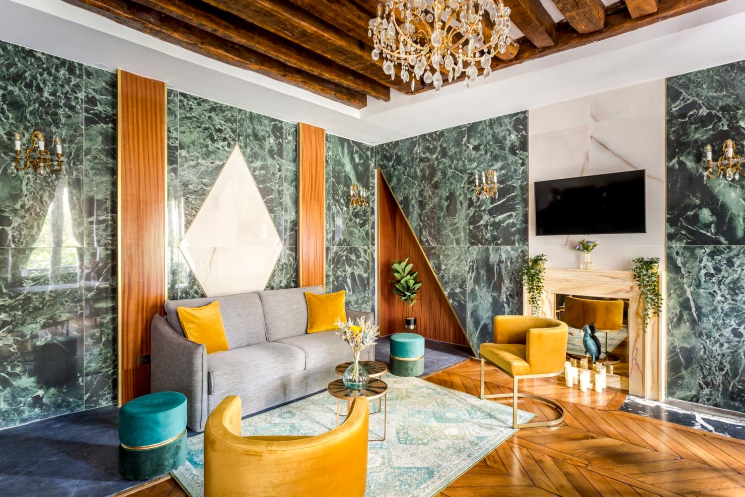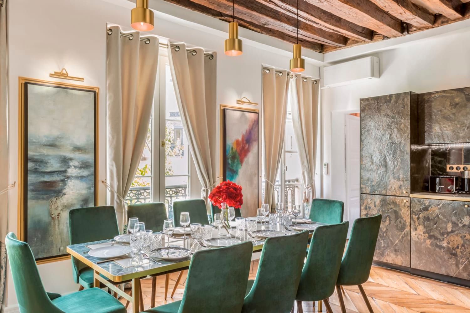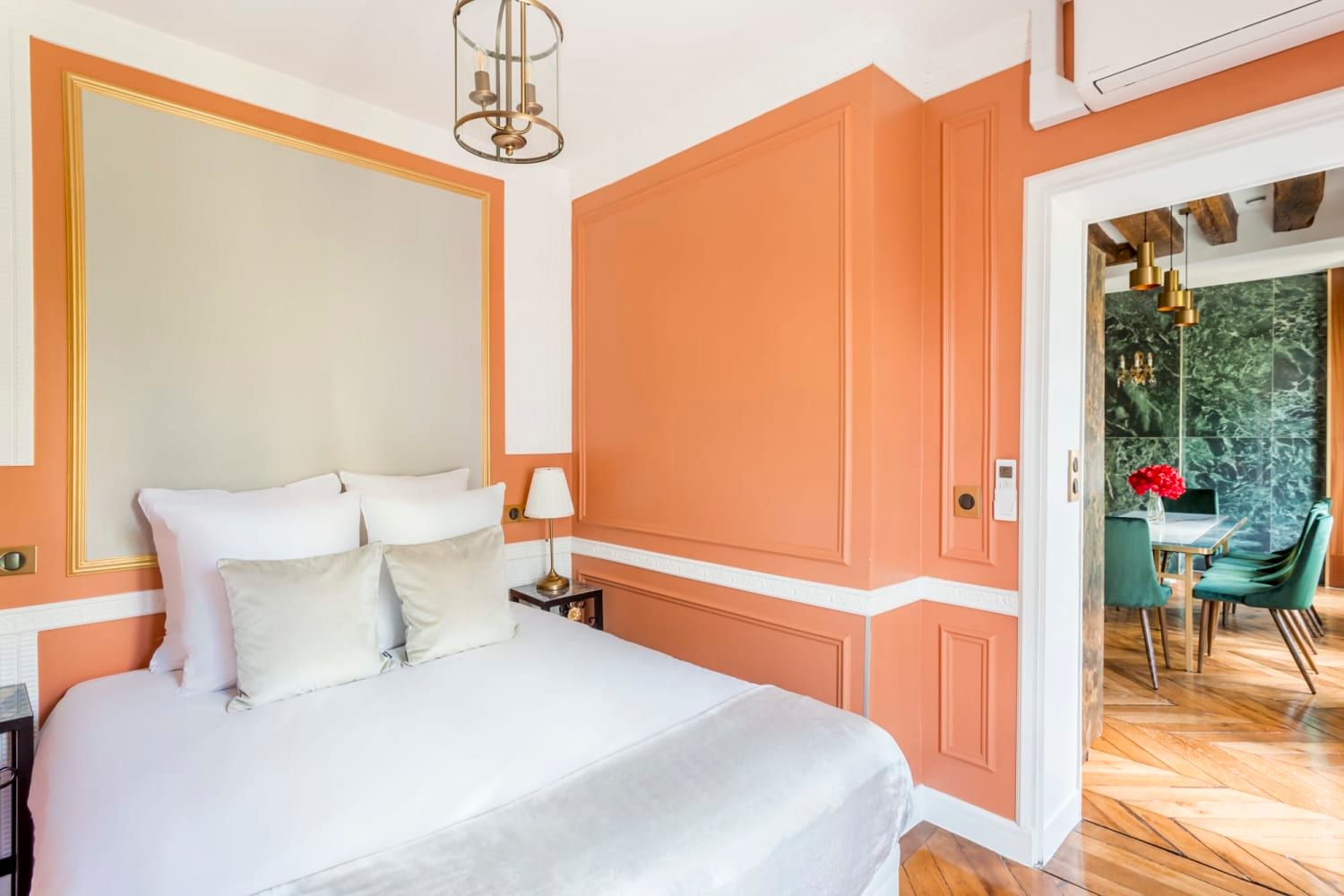 Back at this apartment, located in a beautiful period building, this colourful abode was designed by a renowned Parisian architect and mixes contemporary French design with character features. We love the old beams, luxurious marble finishes, crystal chandeliers and herringbone parquet floors. The sumptuous bedrooms are perfect for getting some rest after a busy day in the City of Light. We particularly adore the master bedroom with its gorgeous clawfoot bath. This place is ideal for a group of friends, family or business professionals.
