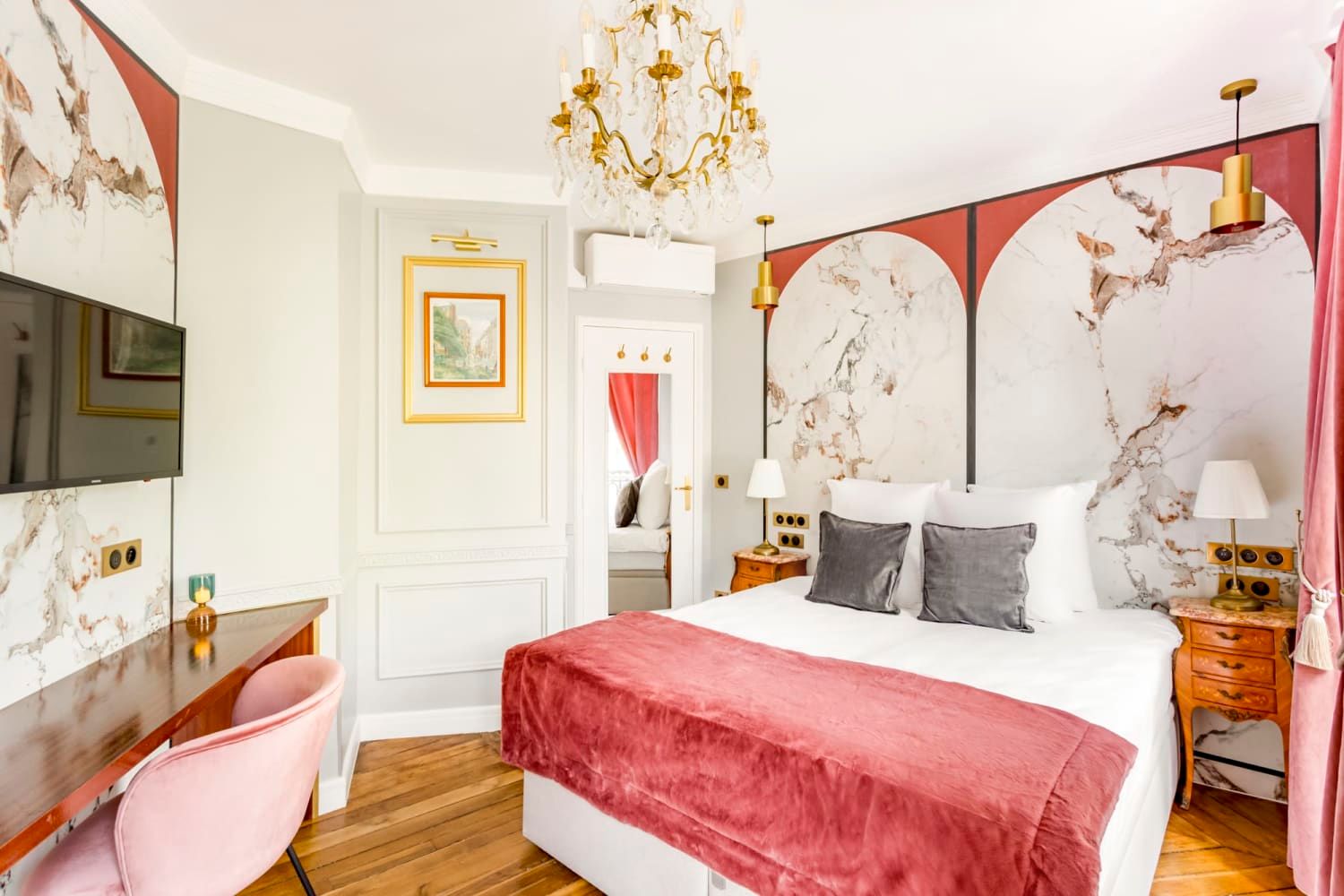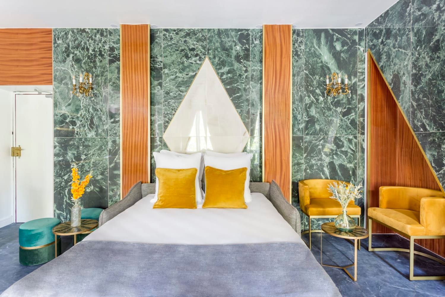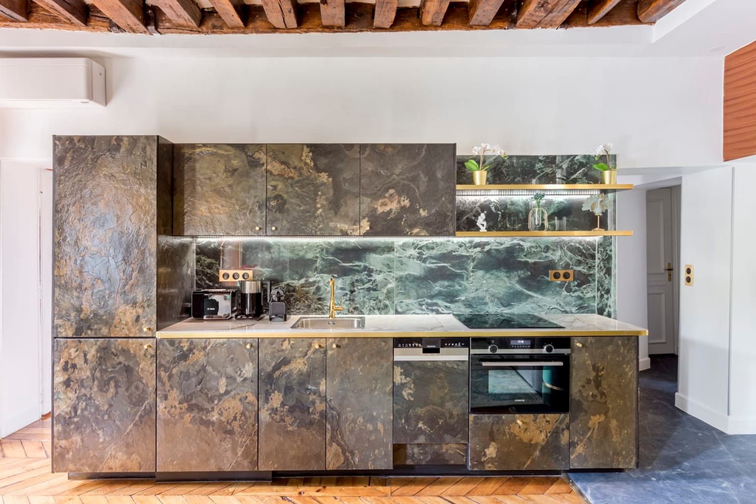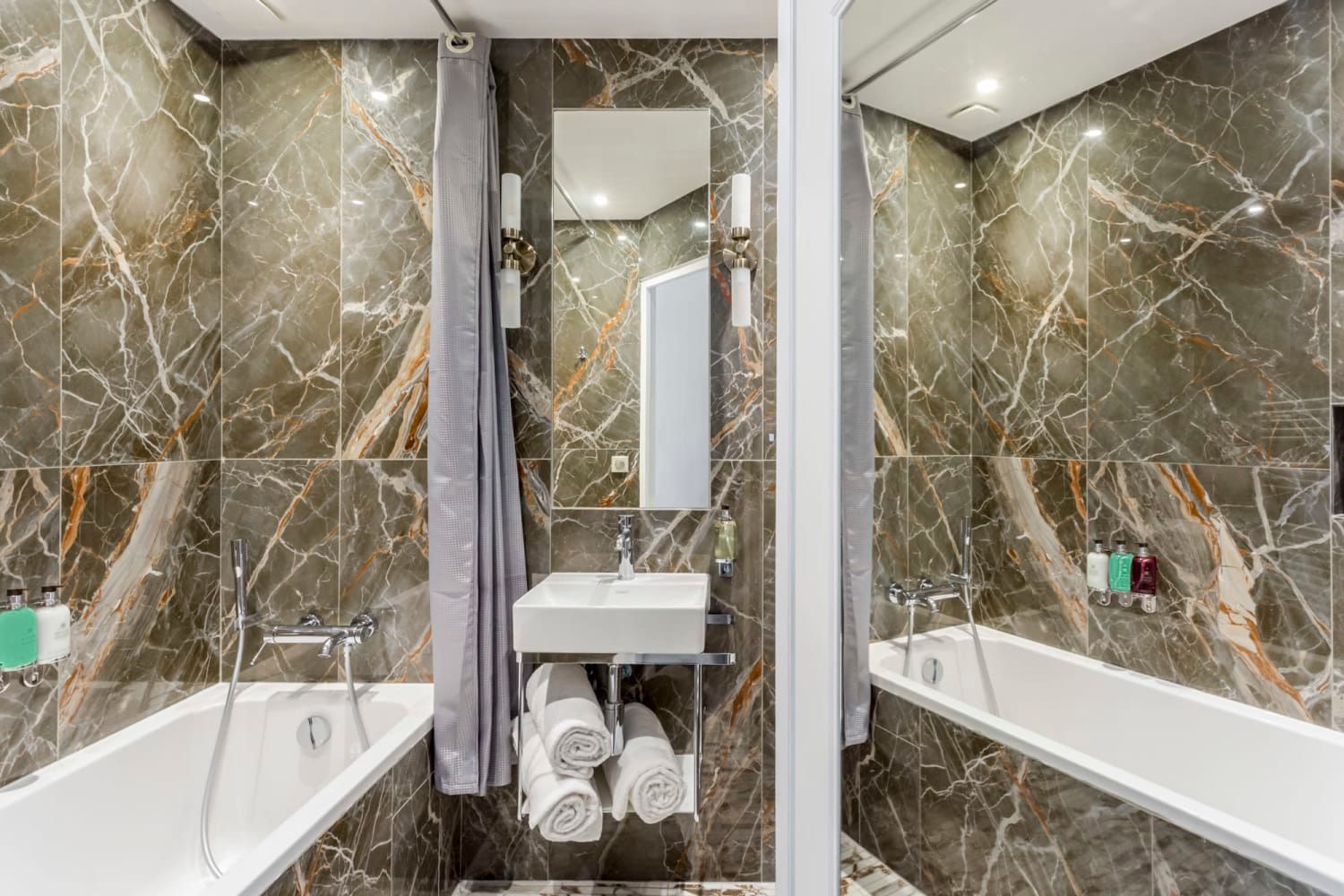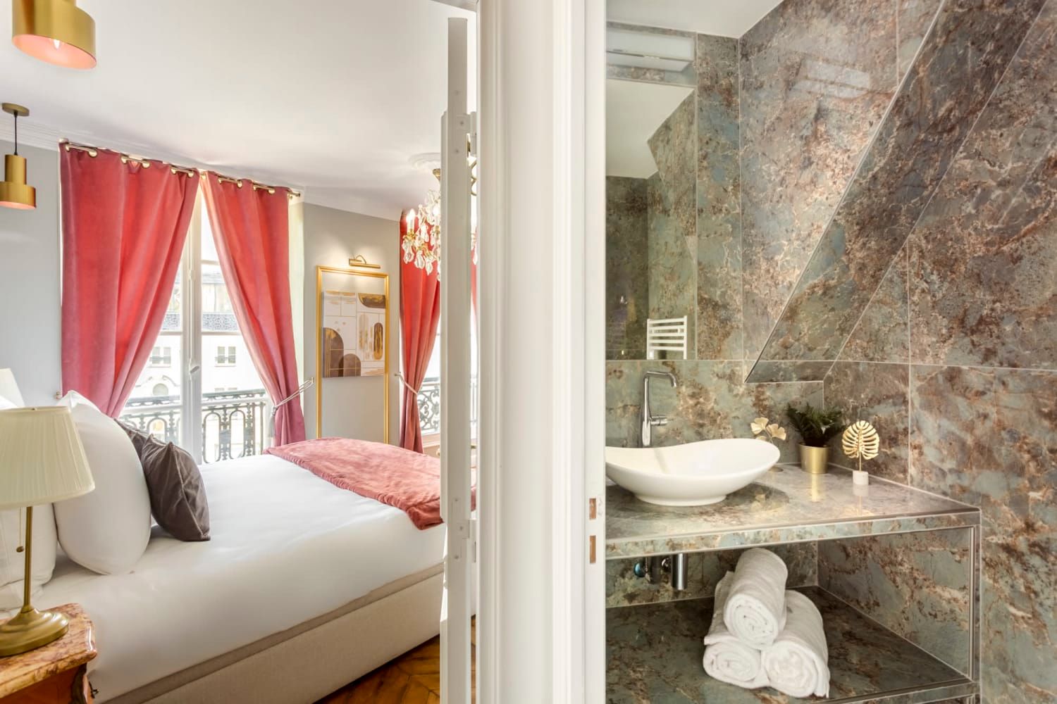 Back at this apartment, located in a beautiful period building, this colourful abode was designed by a renowned Parisian architect and mixes contemporary French design with character features. We love the old beams, luxurious marble finishes, crystal chandeliers and herringbone parquet floors. The sumptuous bedrooms are perfect for getting some rest after a busy day in the City of Light. We particularly adore the master bedroom with its gorgeous clawfoot bath. This place is ideal for a group of friends, family or business professionals.