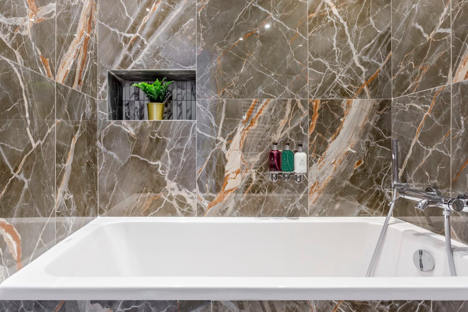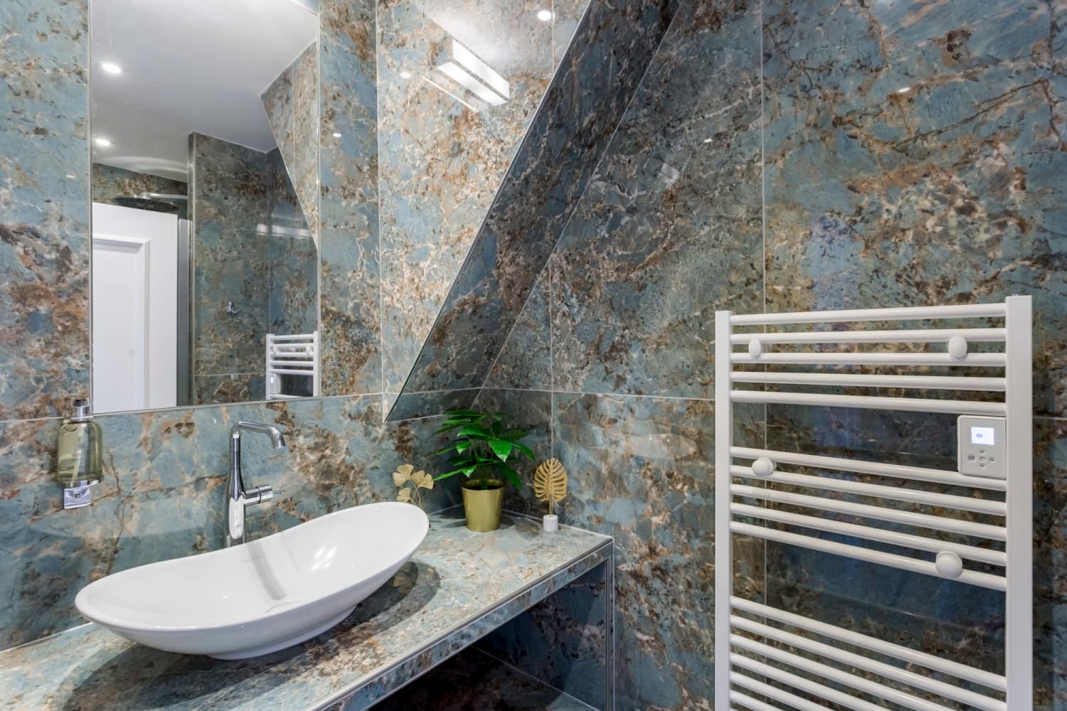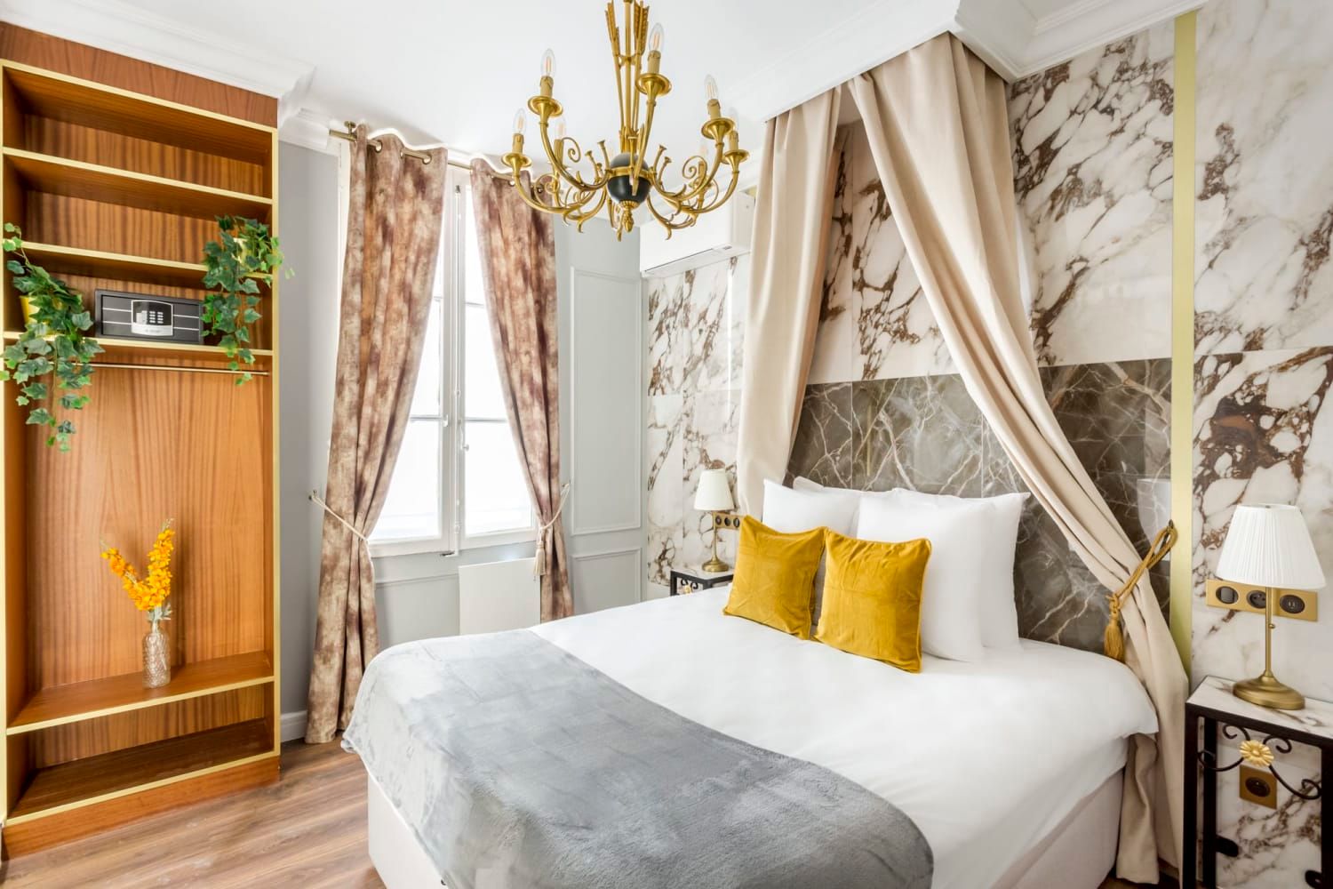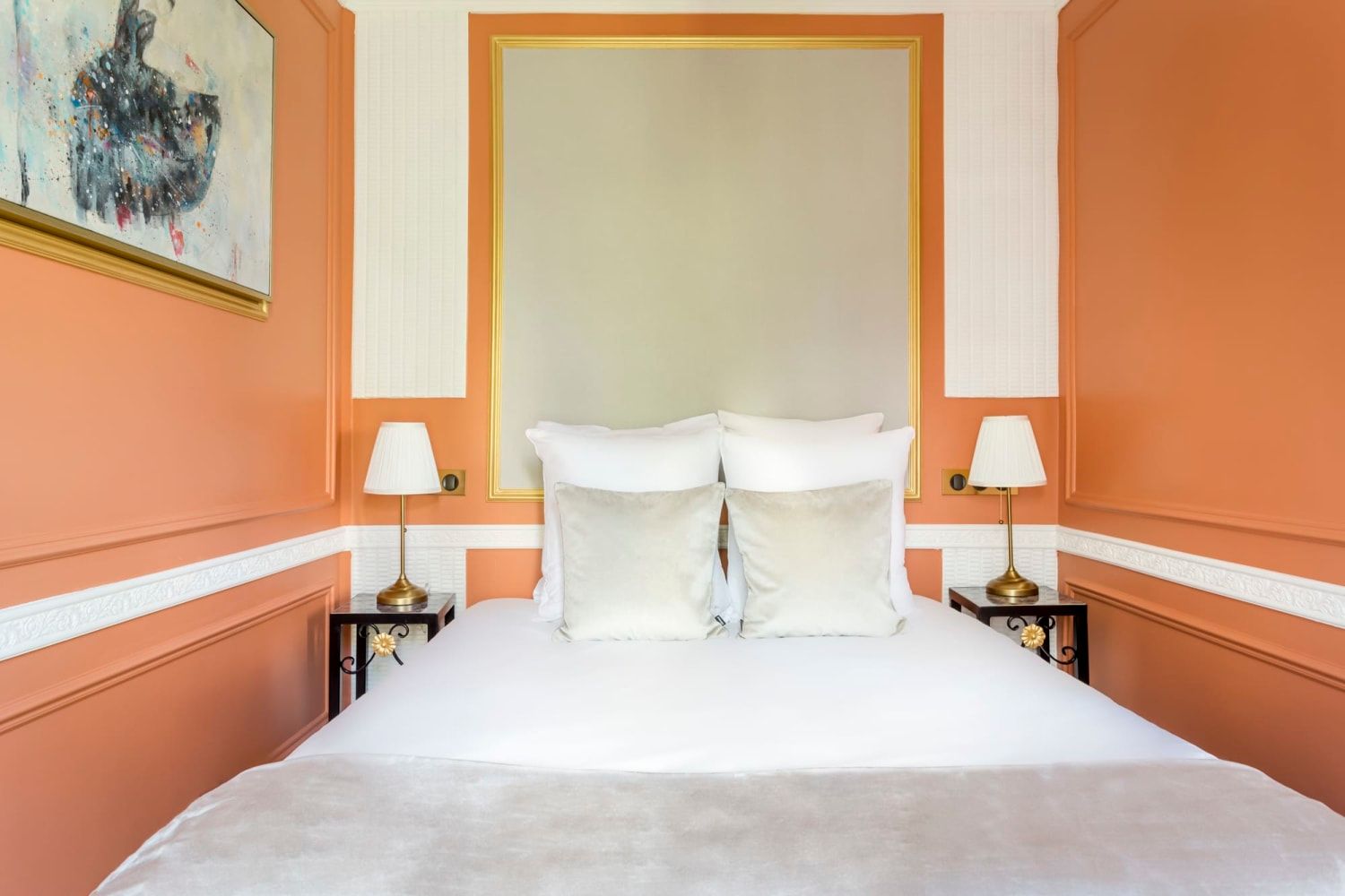 Back at this apartment, located in a beautiful period building, this colourful abode was designed by a renowned Parisian architect and mixes contemporary French design with character features. We love the old beams, luxurious marble finishes, crystal chandeliers and herringbone parquet floors. The sumptuous bedrooms are perfect for getting some rest after a busy day in the City of Light. We particularly adore the master bedroom with its gorgeous clawfoot bath. This place is ideal for a group of friends, family or business professionals.
