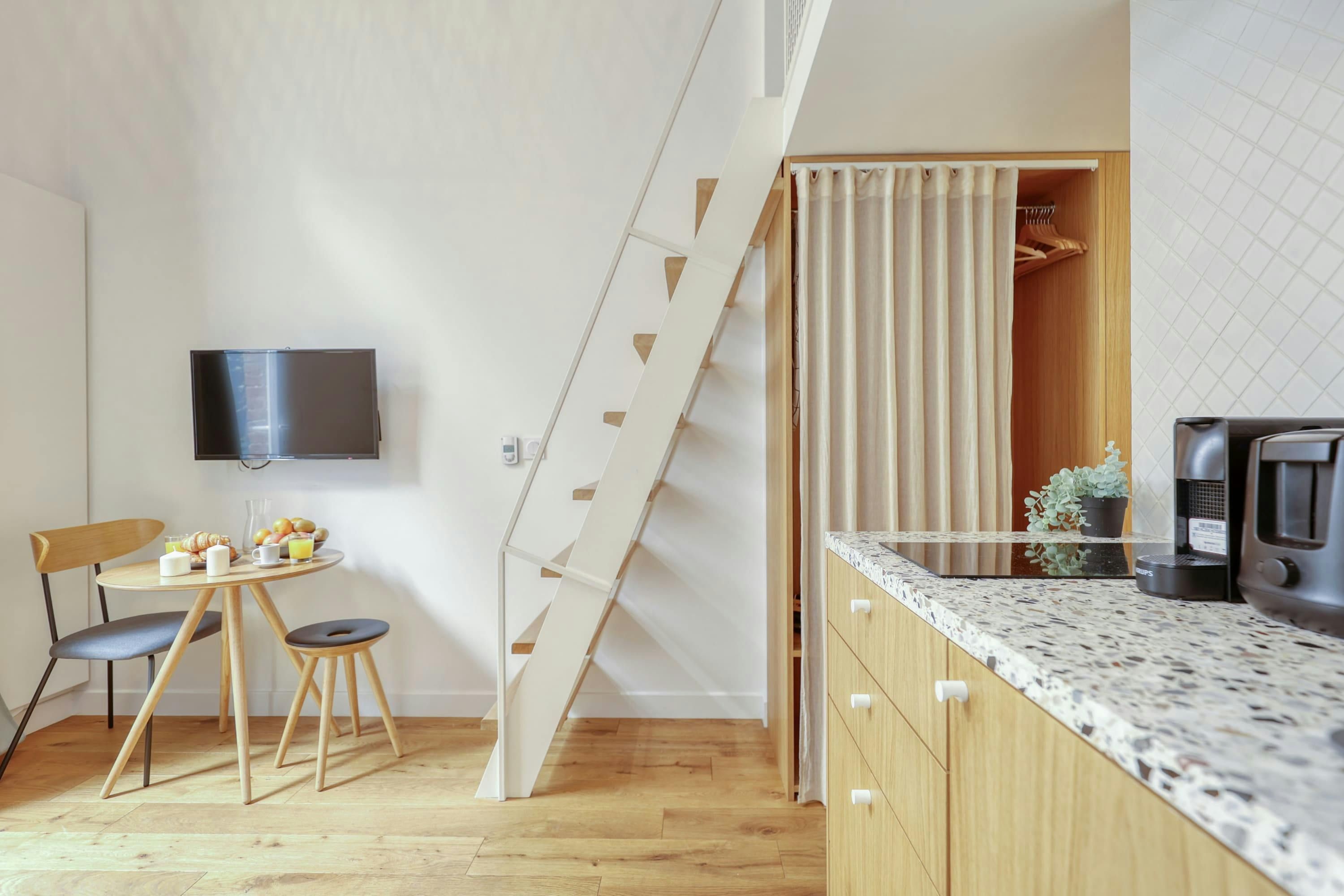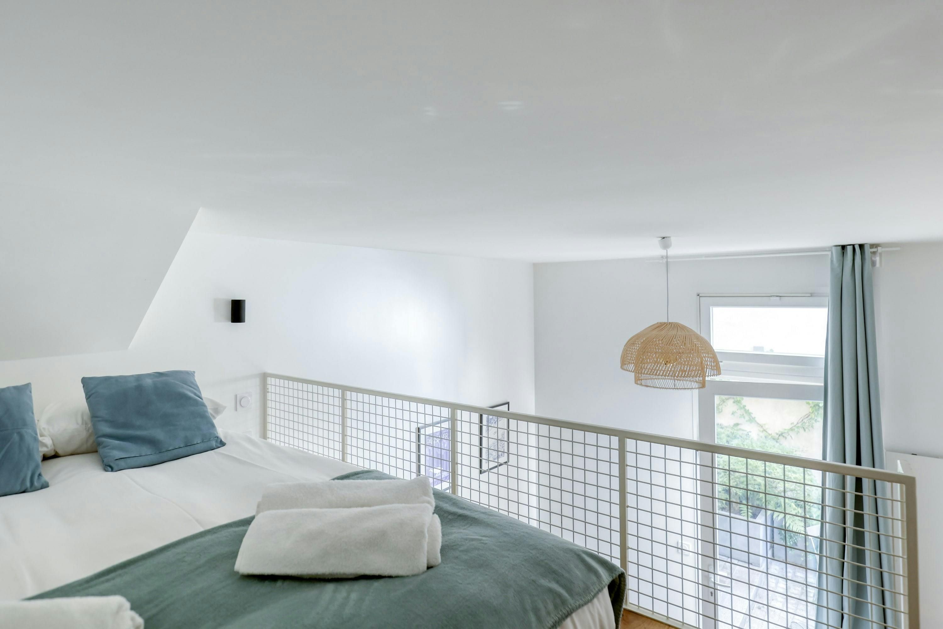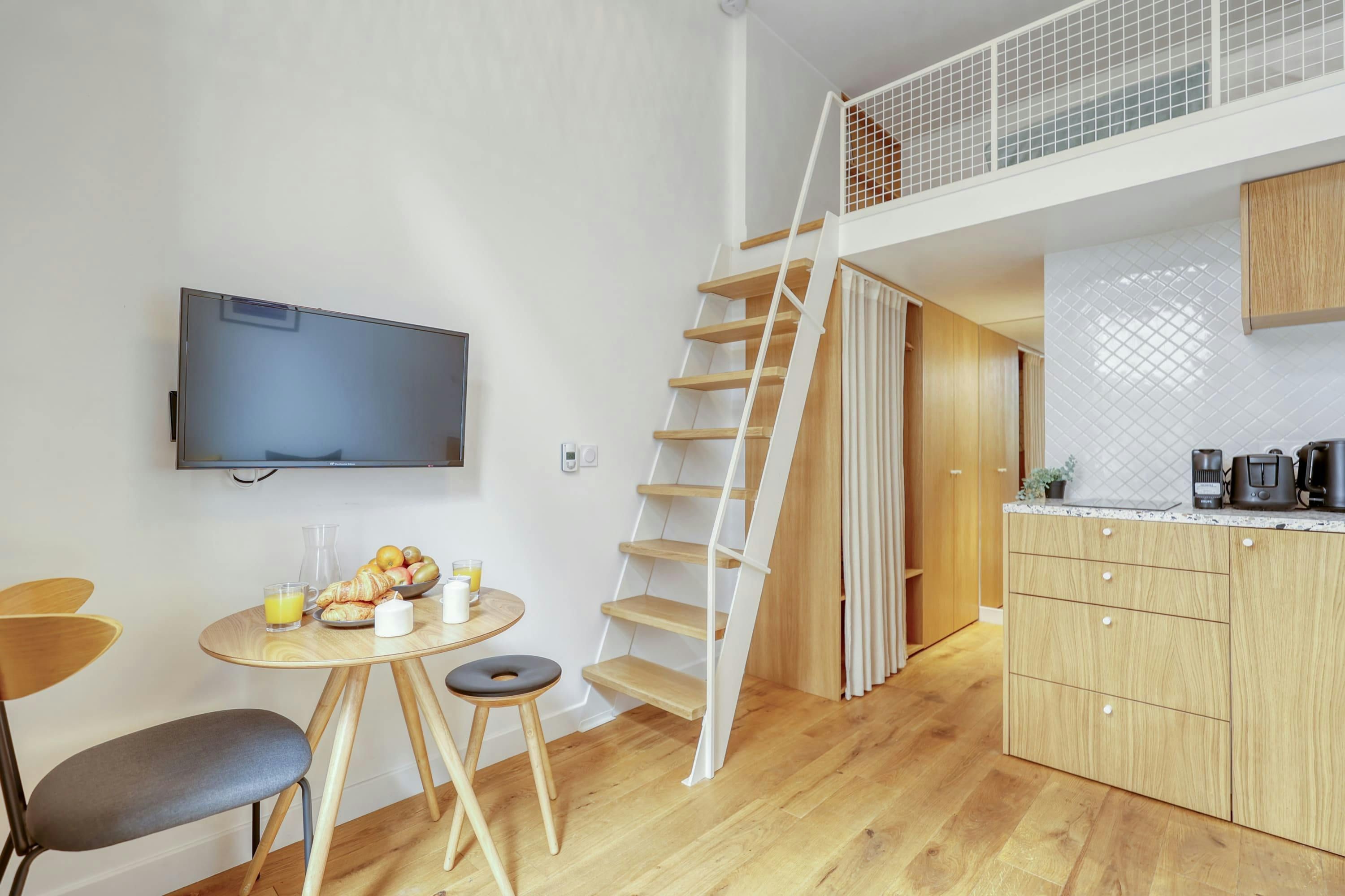 Home truths: *There are stairs to climb at this home, so it may not be suitable for those with reduced mobility. *Given the home's central spot, expect to hear some street noise throughout your stay. *If you're travelling for work, you won't find a dedicated desk here. However, the small dining table doubles up as a laptop-friendly workspace. *We think the kitchenette is better suited to preparing light bites, rather than full meals. You’ll have your pick of Montmartre’s eateries on your doorstep though. *The bedroom is at mezzanine level above the open-plan living, dining and kitchen space. Privacy is limited. *The courtyard here is shared with the residents of the other apartments.