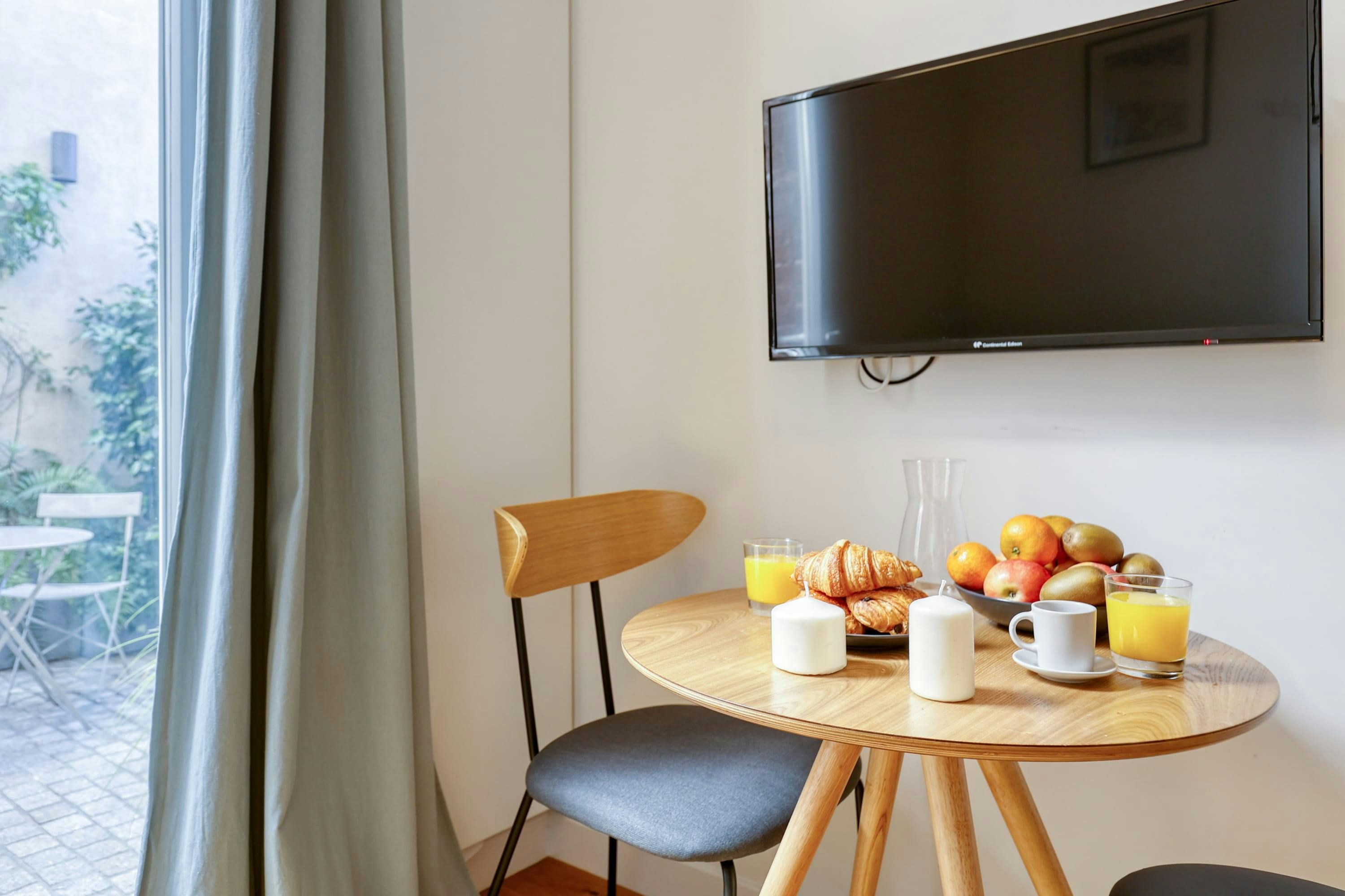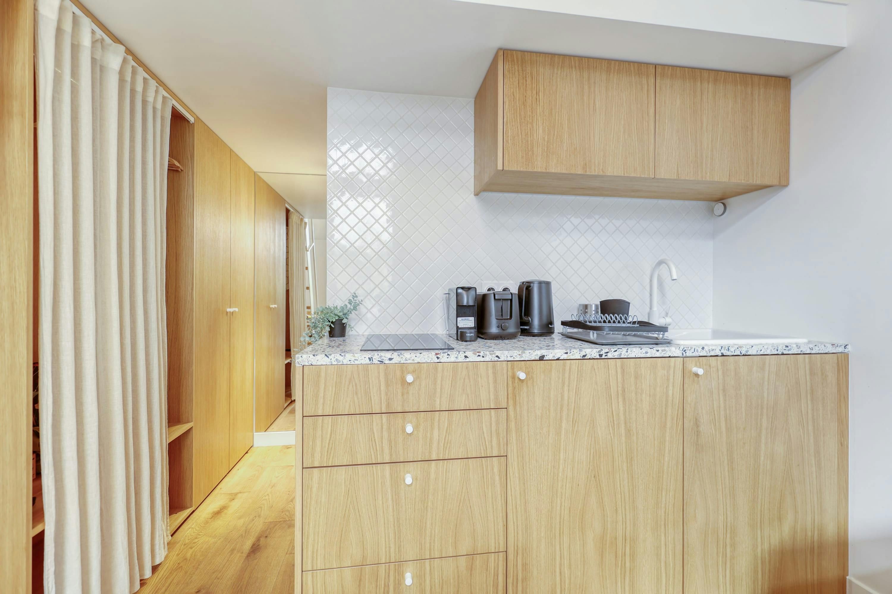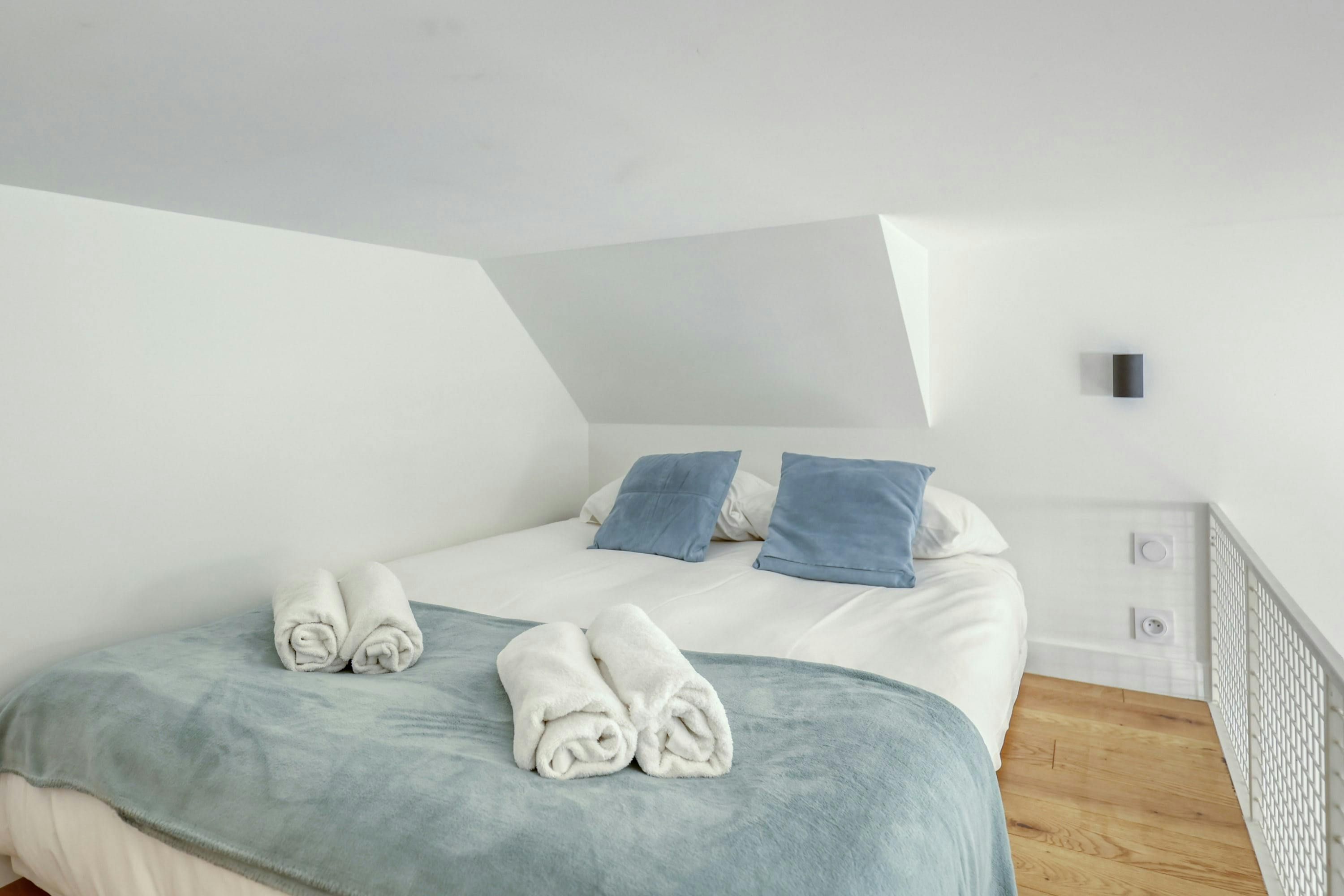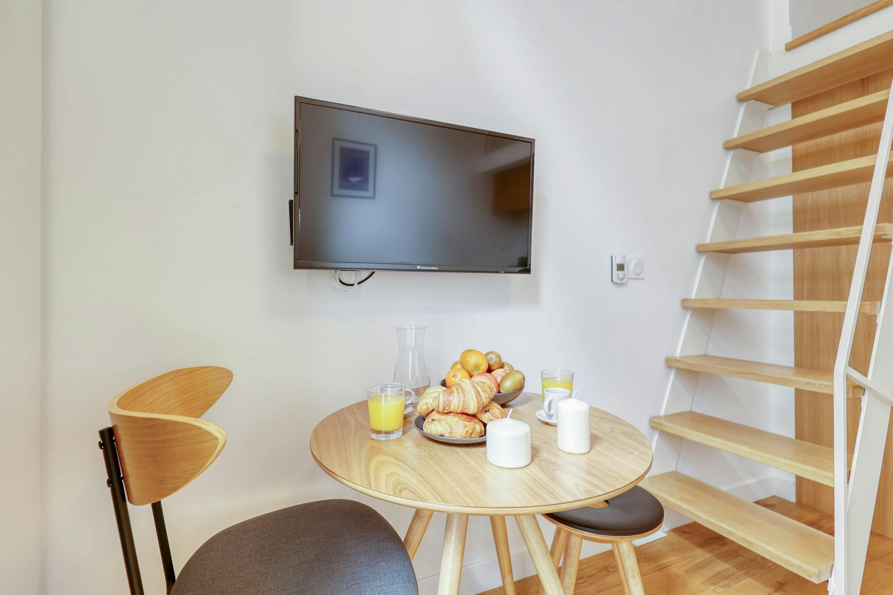 Home truths: *There are stairs to climb at this home, so it may not be suitable for those with reduced mobility. *Given the home's central spot, expect to hear some street noise throughout your stay. *If you're travelling for work, you won't find a dedicated desk here. However, the small dining table doubles up as a laptop-friendly workspace. *We think the kitchenette is better suited to preparing light bites, rather than full meals. You’ll have your pick of Montmartre’s eateries on your doorstep though. *The bedroom is at mezzanine level above the open-plan living, dining and kitchen space. Privacy is limited. *The courtyard here is shared with the residents of the other apartments.