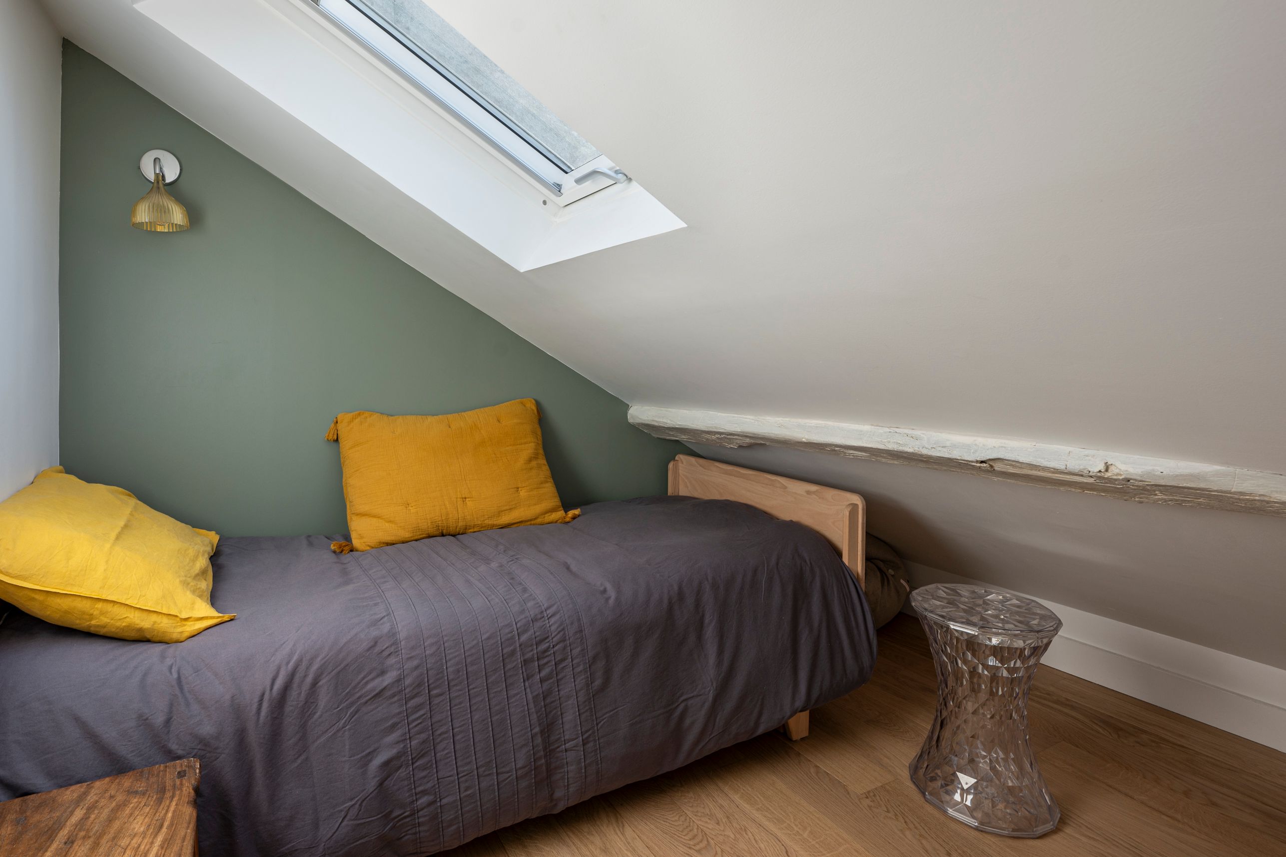 Located just by Boulevard Beaumarchais – home of iconic concept stores, trendy eateries, and popular delis – this Marais pad is also bright thanks to its south-facing orientation. Spacious for a couple, the loft's decor and features reflect the personality of its multifaceted and well-travelled host. We particularly enjoyed the rather nostalgic record player. It benefits from the perks of a lived-in home, with an equipped kitchen for enthusiastic home cooks and a balcony where you can have a coffee in the sun. Upon request, a third guest can sleep in the loft under the eaves – perfect for little ones.