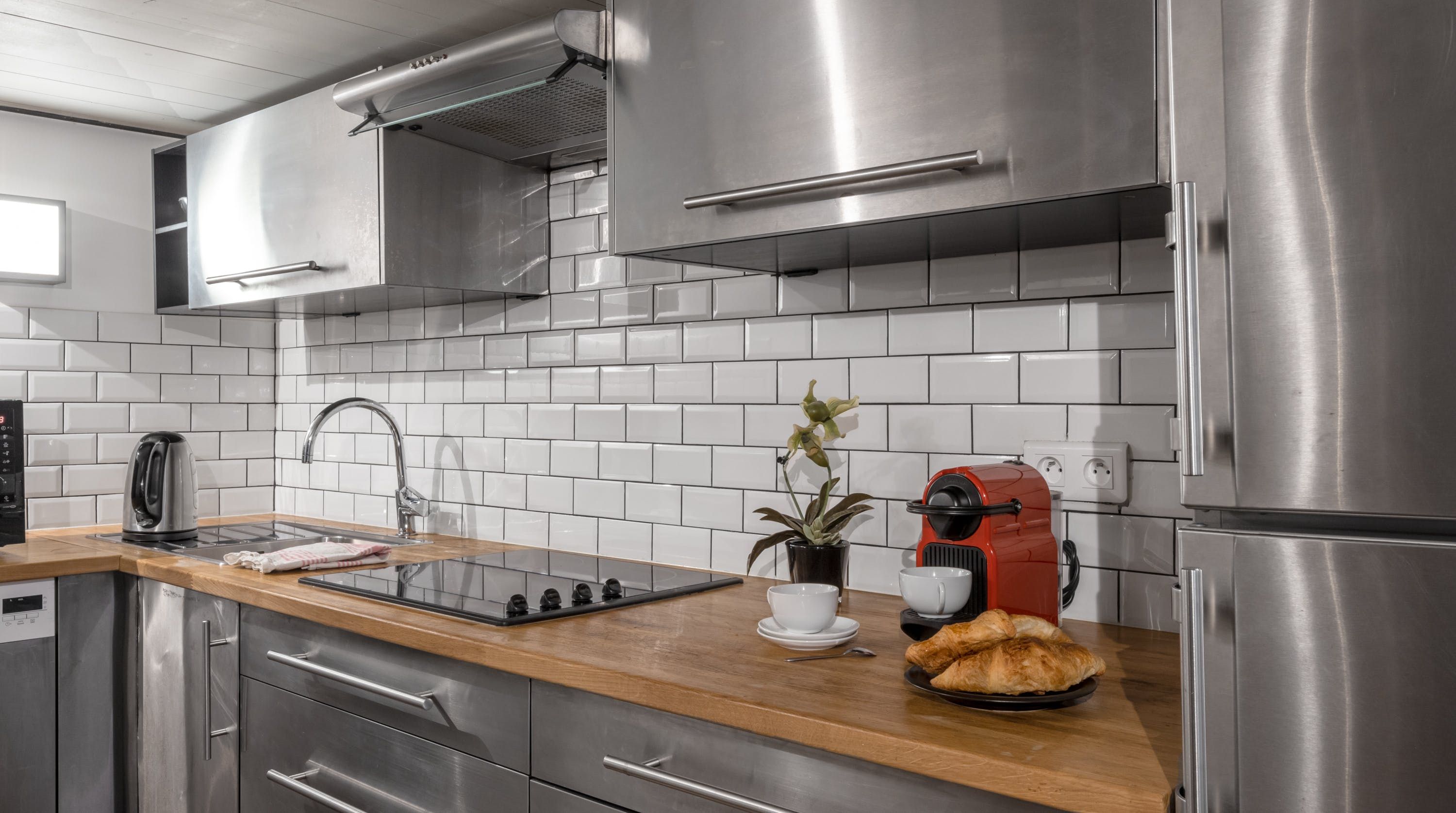 In the open space, you’ll find a dining table for the whole group, a hang-out corner with a sound system and foosball table, and a lounge lined with towering bookshelves. The kitchen is tucked beneath the mezzanine bedrooms and is super sleek in shining chrome. You’re in one of Paris’ artsy and most fashionable neighbourhoods here, packed with trendy bars, bistros and chichi cafés. It’s also only a fifteen-minute walk from the Gare du Nord if you’re arriving by Eurostar, while the Louvre and the Palais Garnier are both less than fifteen minutes away on the metro.