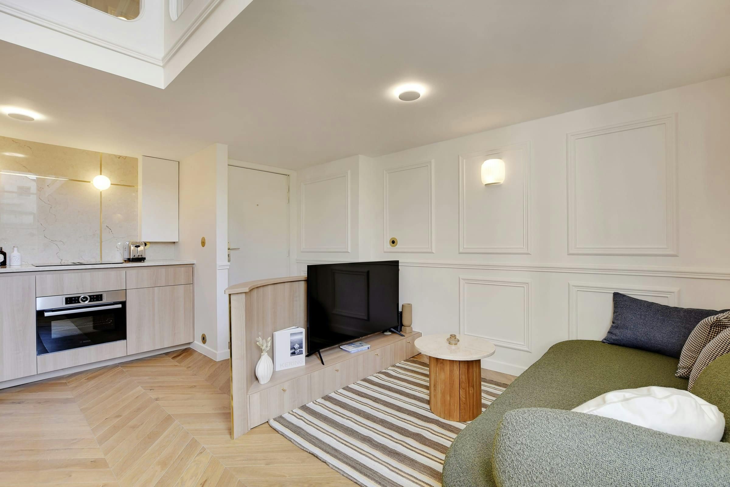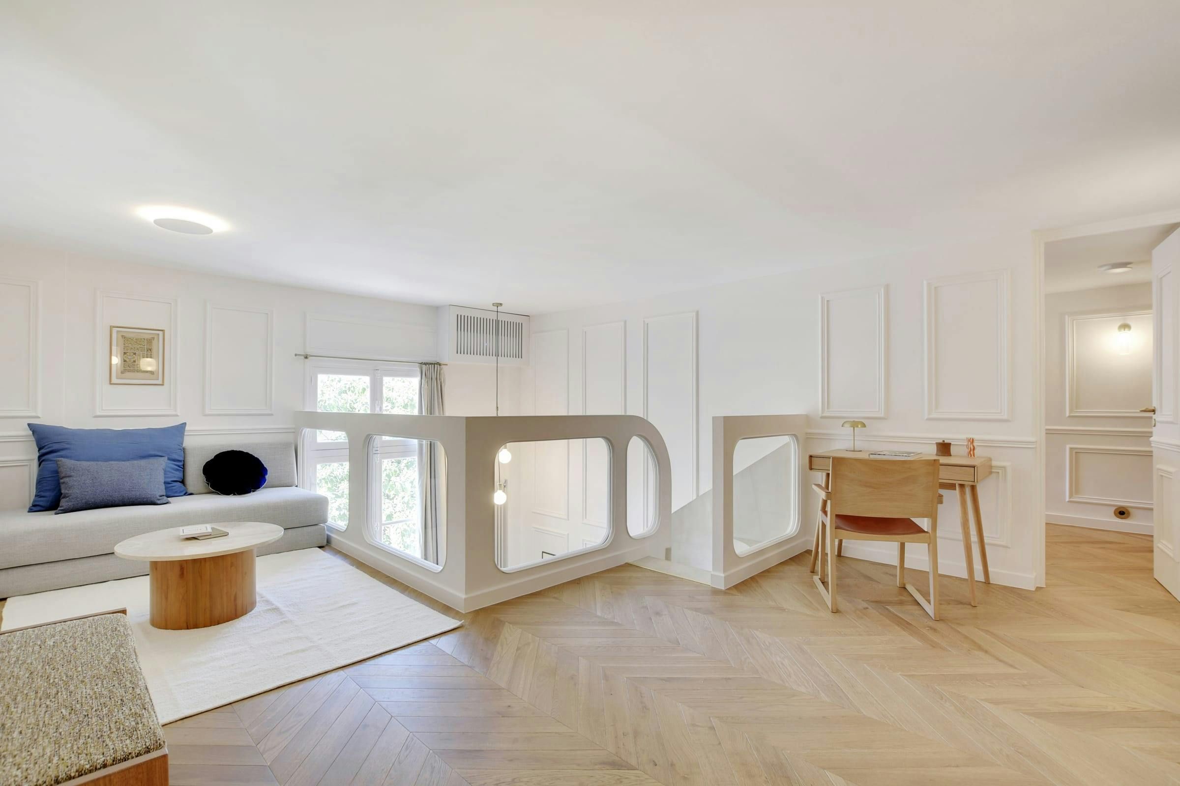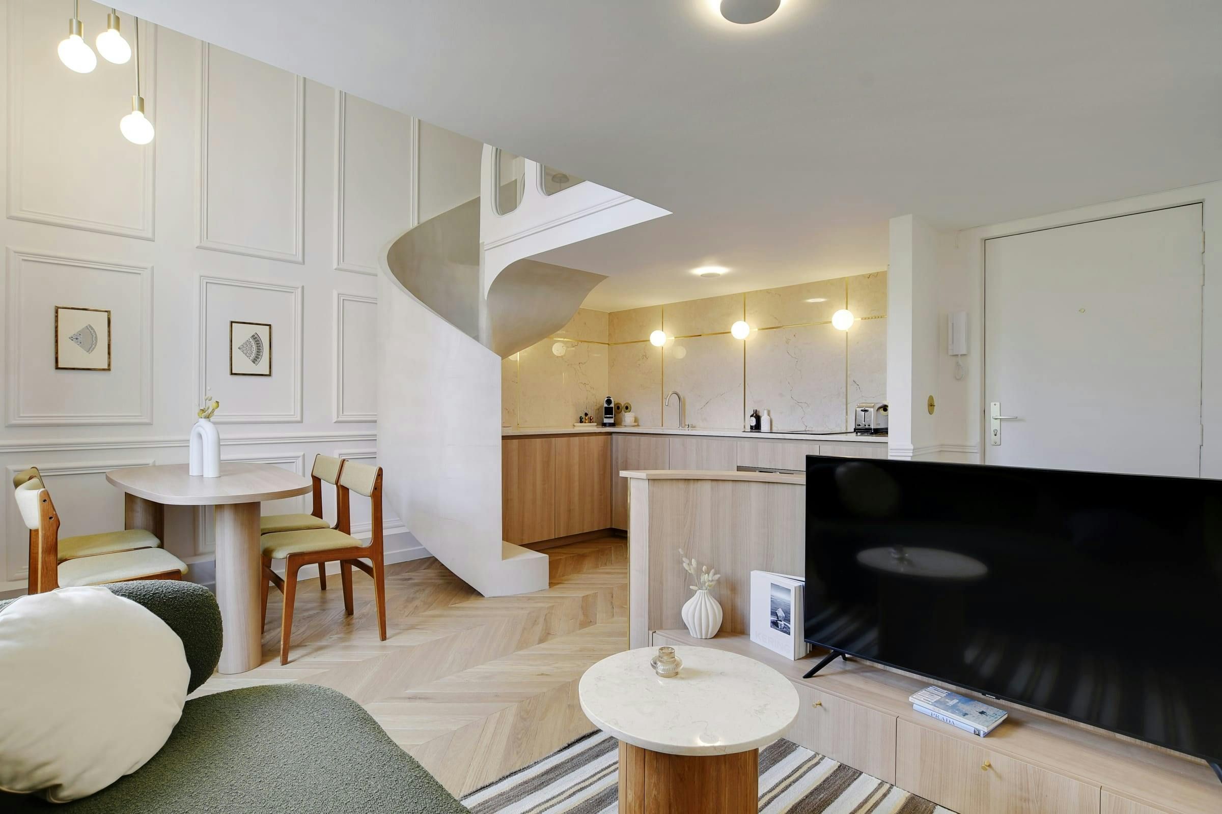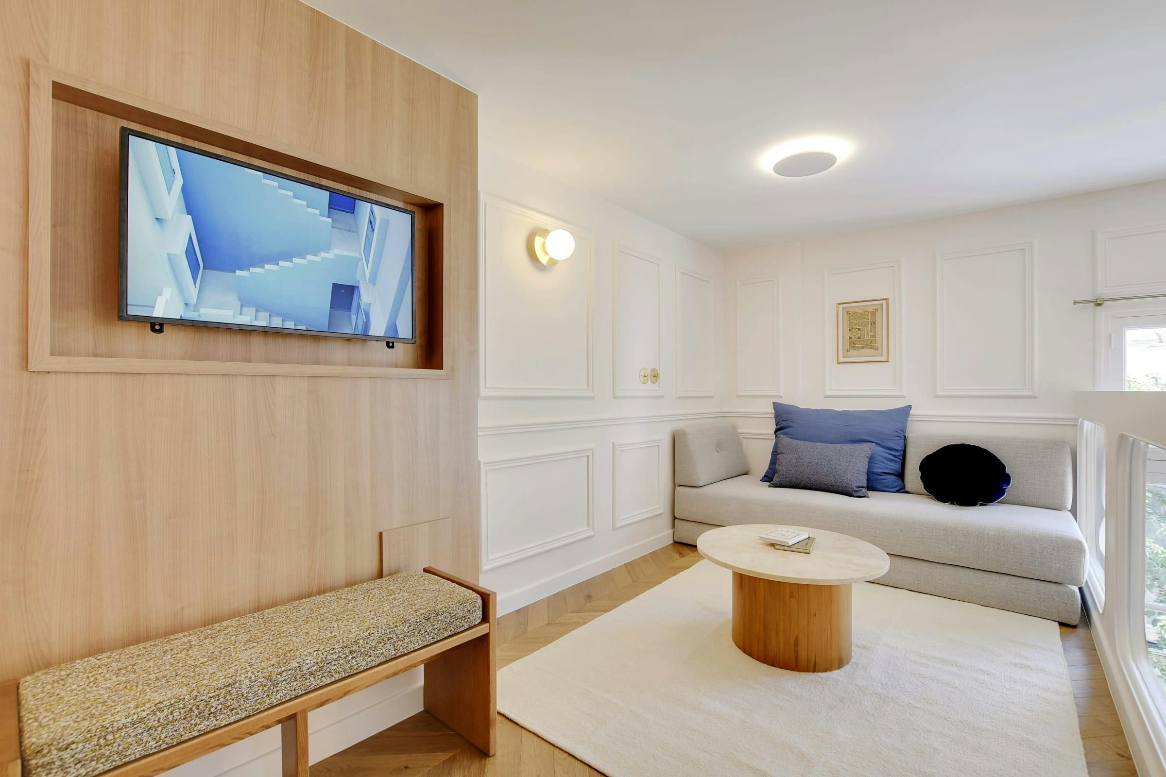 A perfect pad for a solo break or trip for two, this apartment brings comfort and convenience to a stay in Paris. The location is central, the style is elegant, and it has everything you need to feel right at home. A high ceiling and tall windows make the space feel bright and inviting, and the extra lounge on the mezzanine level means there’s more room to stretch out. Head outside to find cosy cafes and refined restaurants, a Metro station moments away, and landmarks within easy walking distance (we’re looking at you, Musée du Louvre).